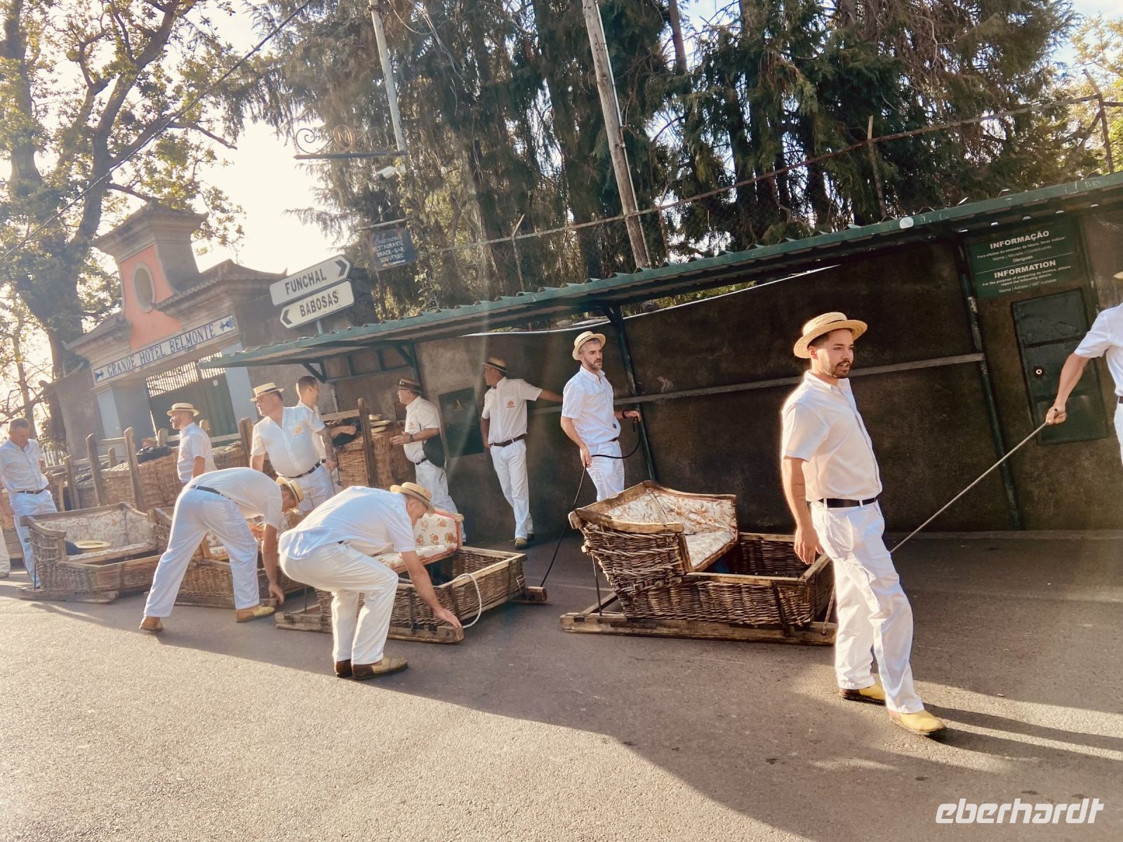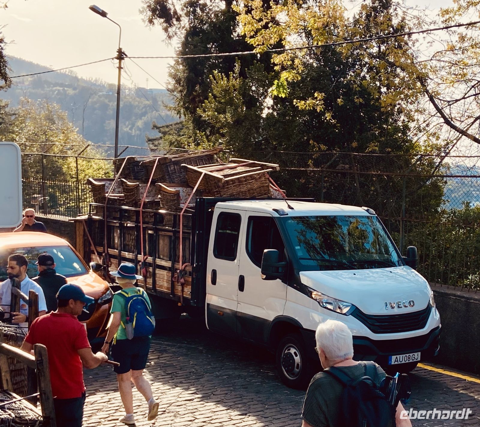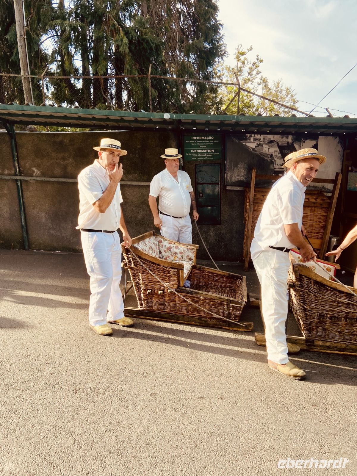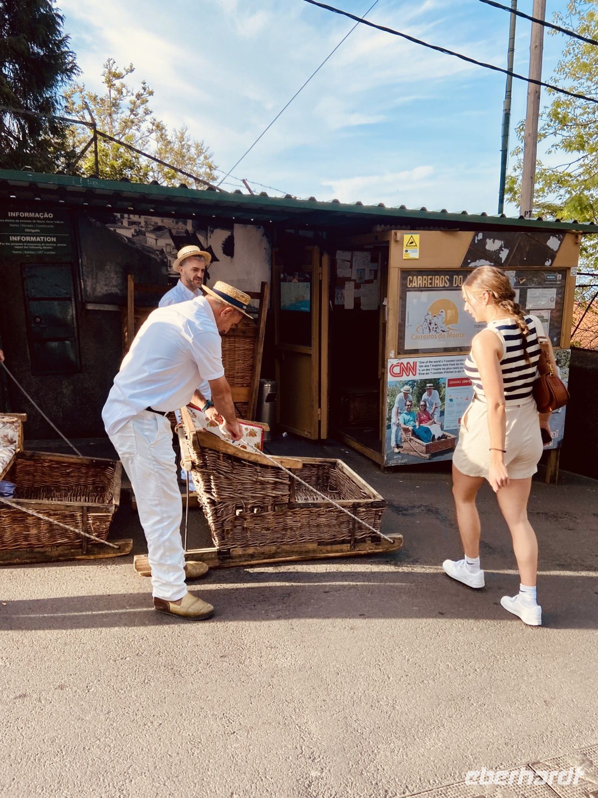 Der Höhepunkt unseres heutigen Halbtagesausflugs: Die 2 km lange Sause im Korbschlitten vom Wallfahrtsort Monte hinab in das Tal. Soweit der Plan…