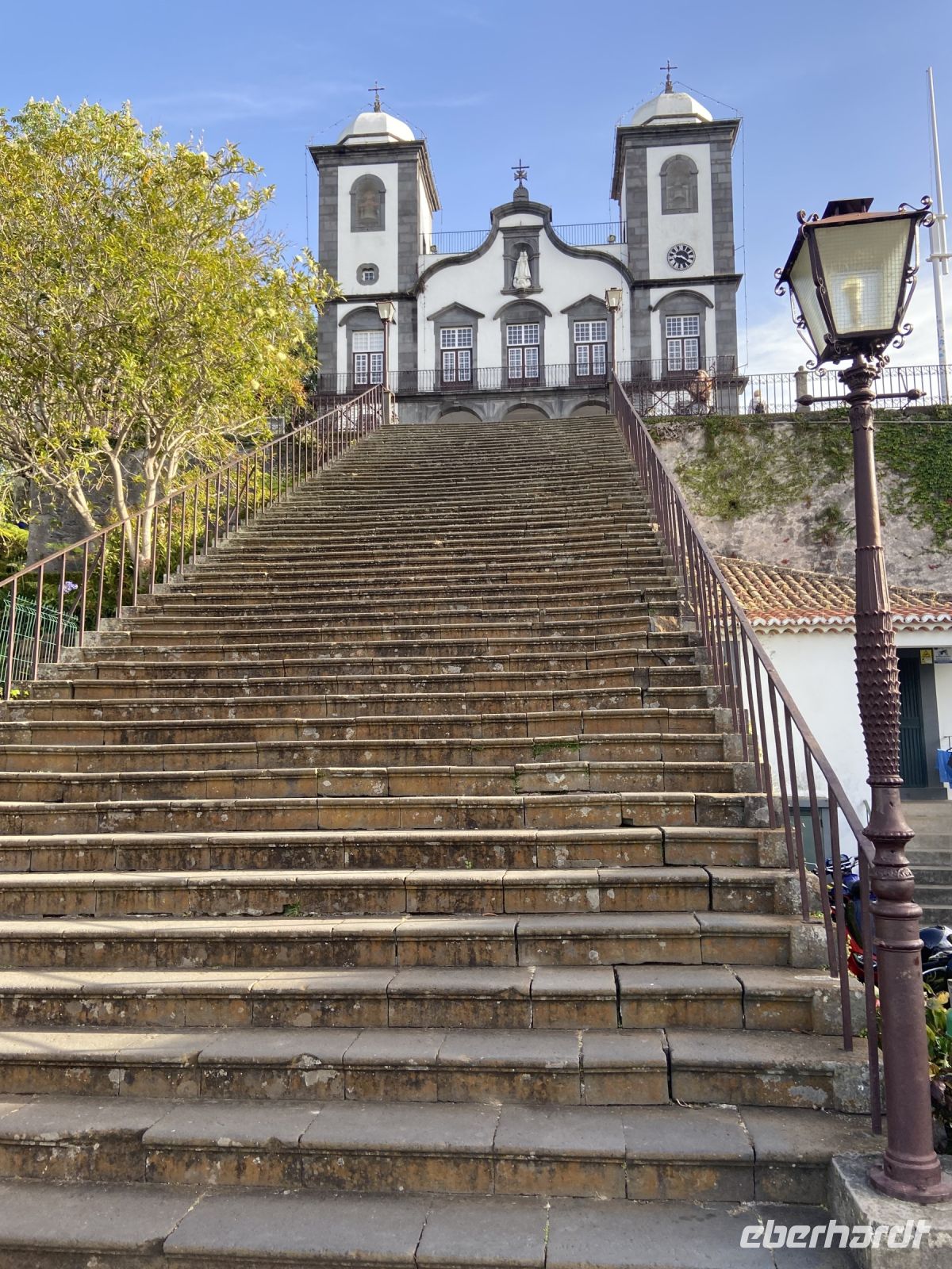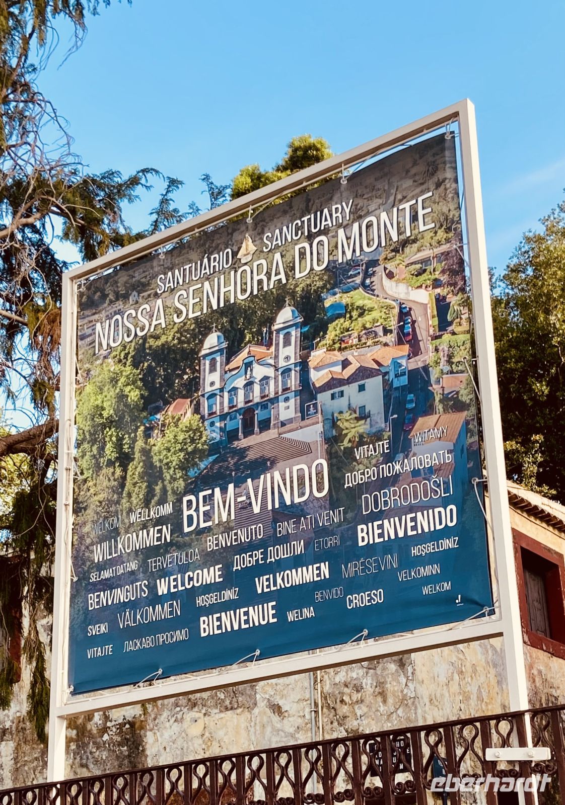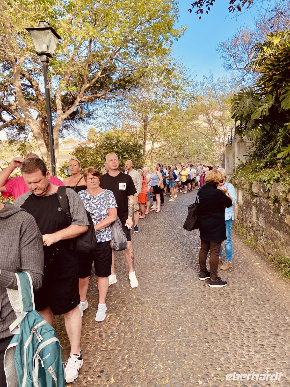 Da jedoch viele Kreuzfahrtgäste und andere Busgruppen diese Attraktion ebenfalls im Programm haben, herrschen häufig entsprechendes des Gedränge und lange Wartezeiten. Unsere Reiseleiterin Paula hatte Stunden damit verbracht, ein System zu entwickeln, einen Trick, um uns diesen Spaß ohne langes Schlangestehen zu ermöglichen. So fahren wir bereits um 8.30 Uhr am Hotel ab und hoffen, damit den anderen Urlaubern zuvorzukommen. Angela fährt rasant die Berge hinauf, wir wollen keine Zeit verlieren! Aber als wir an der Bergstation aussteigen, trauen wir unseren Augen nicht: es zeichnet sich bereits eine sehr, sehr lange Reihe von Menschen ab, die Wartezeit wird mit „circa zwei Stunden“ angegeben. Es tut uns sehr leid, aber wir sind nicht bereit, so lange Schlange zu stehen. So geben wir unseren Korbschlitten-Plan auf, besichtigen die barocke Wallfahrtskirche Nossa Senhora do Monte, die der Heiligen Mutter Gottes gewidmet ist, und setzen die Fahrt fort.