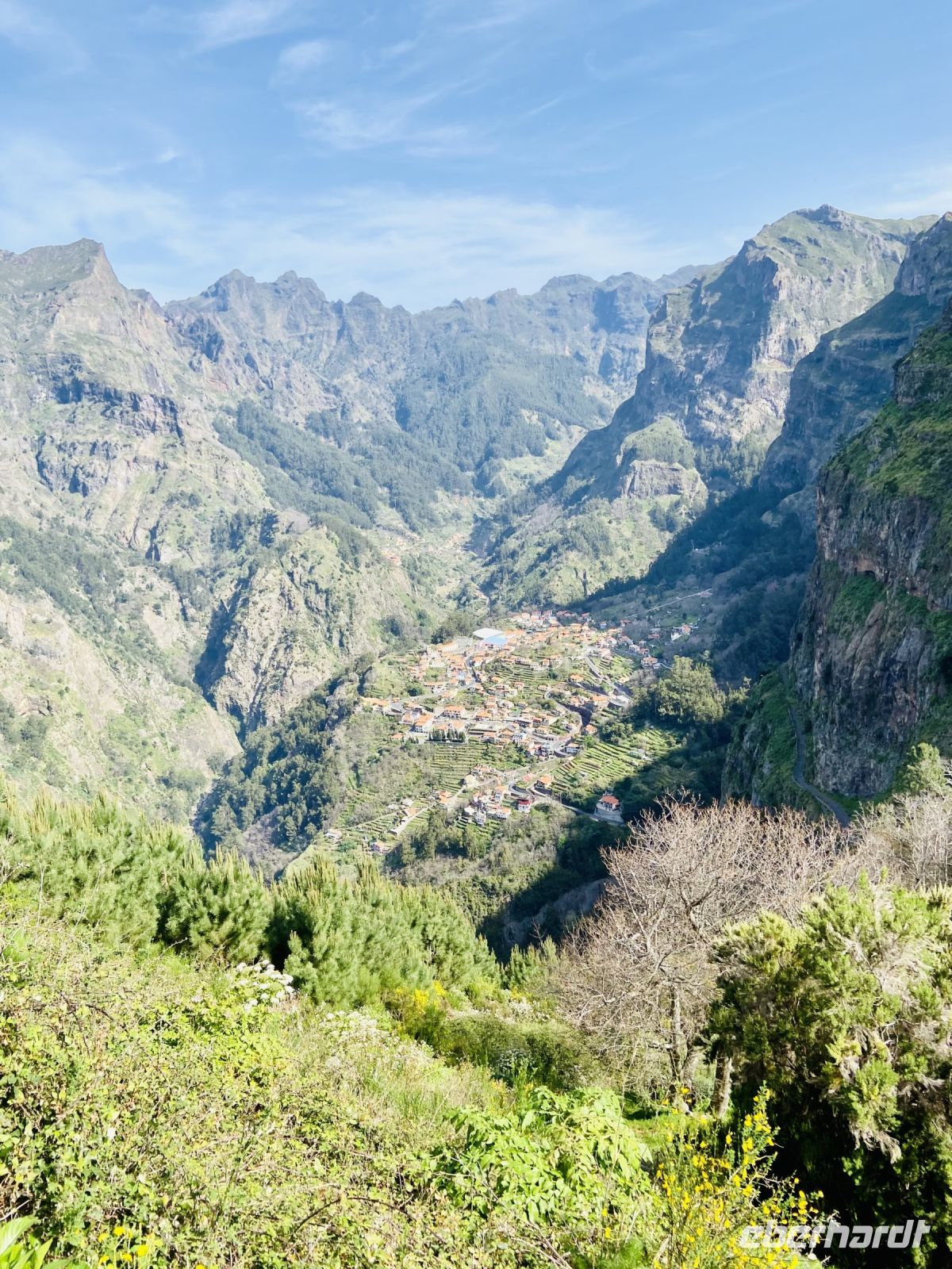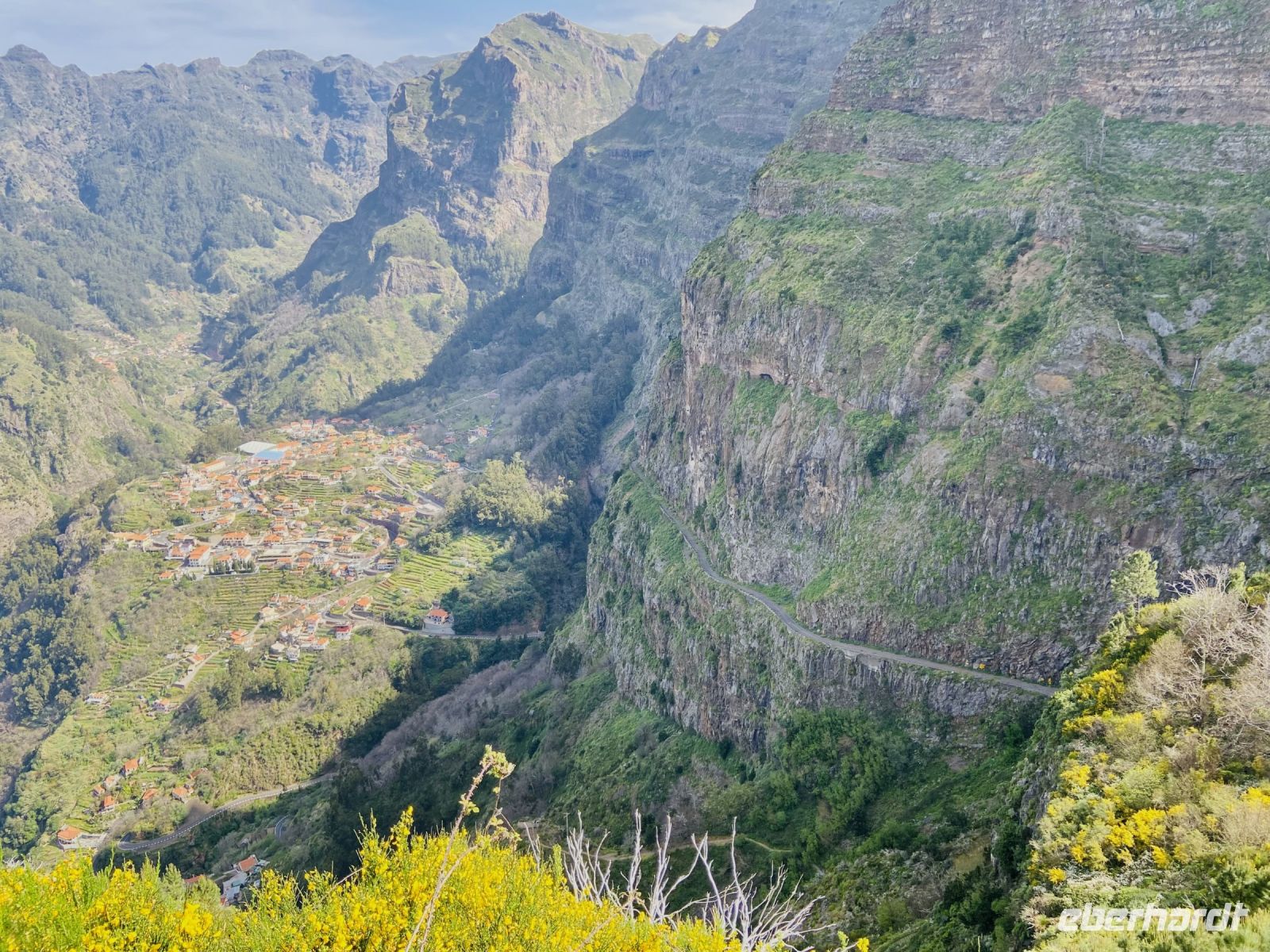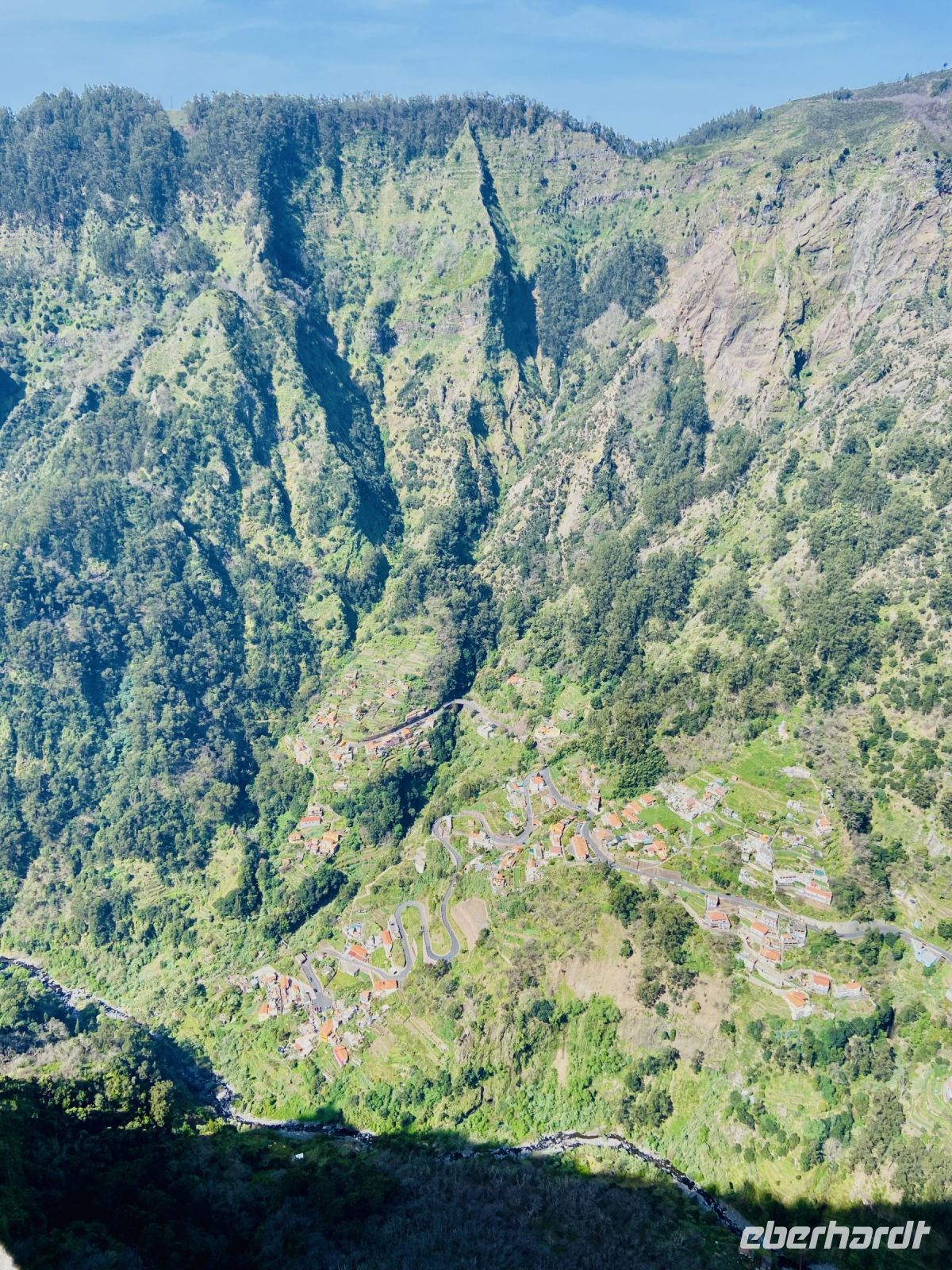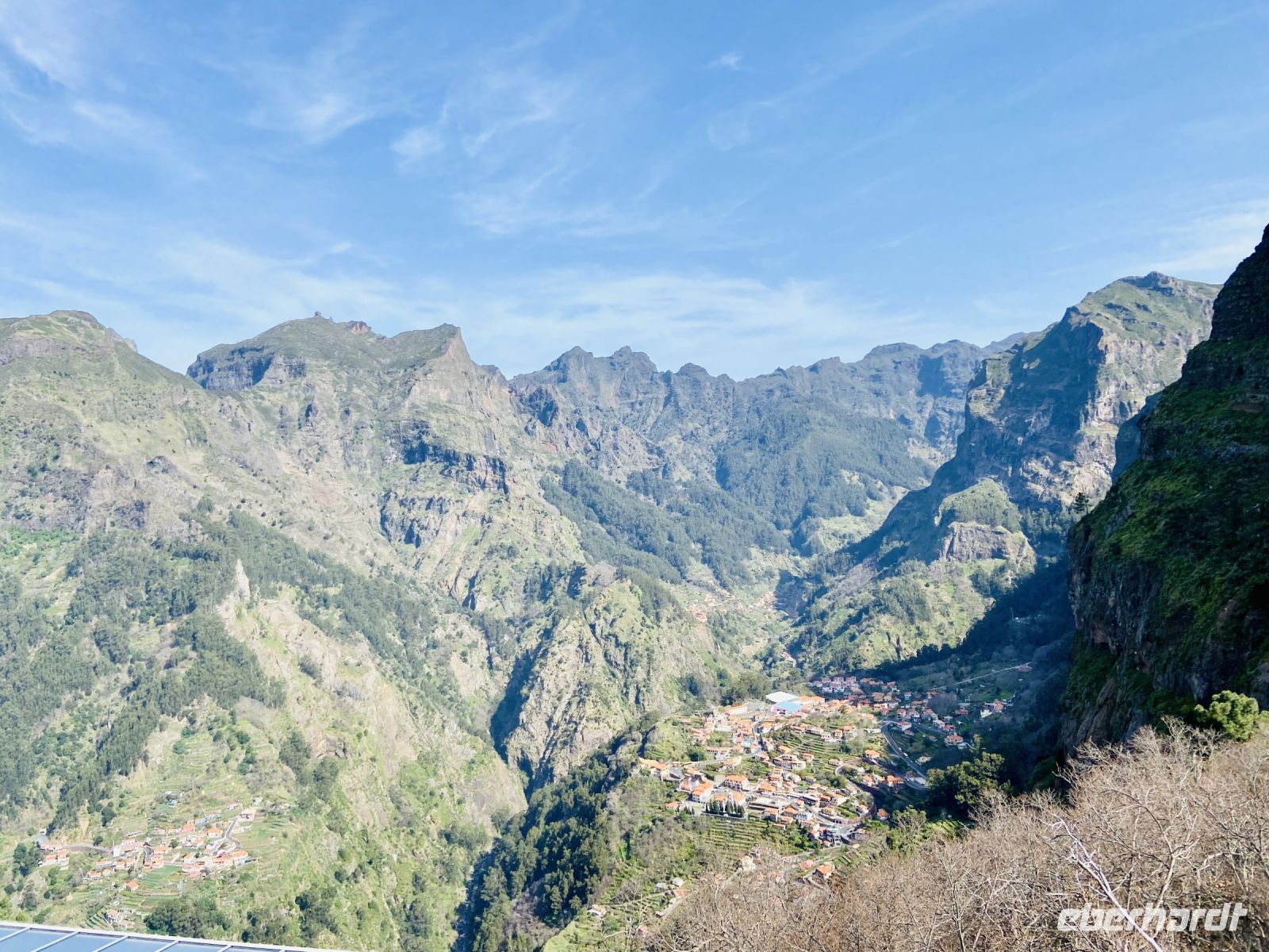 Aber 355 Meter sind uns noch lange nicht hoch genug. Über steile Serpentinen geht hinauf bis auf 1050 Meter Höhe zum Aussichtspunkt "Eira do Serrado", der den Blick freigibt auf das berühmte Nonnental. Der kleine Ort und die Straßen, die wir von oben erspähen, eingenistet in ein steil aufragendes Felsmassiv, wirken wie eine Spielzeuglandschaft.