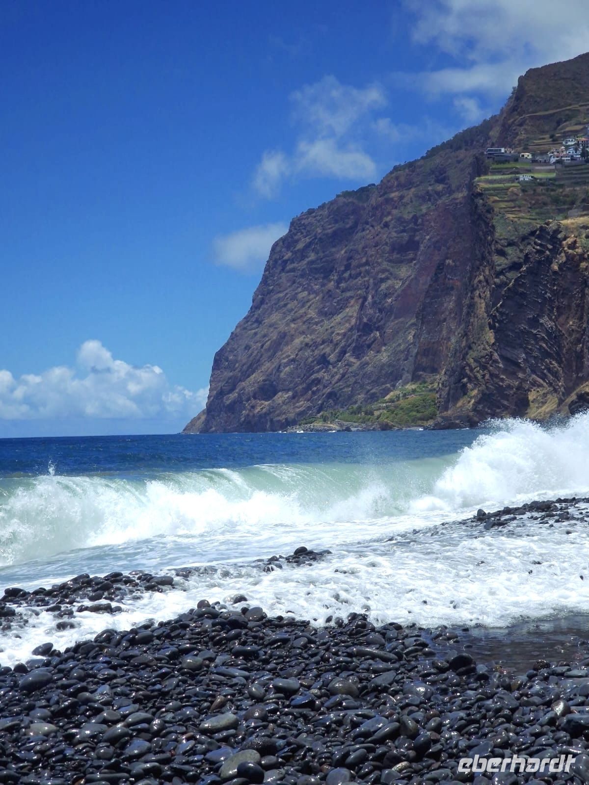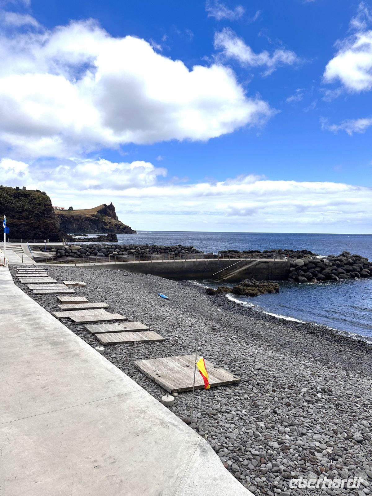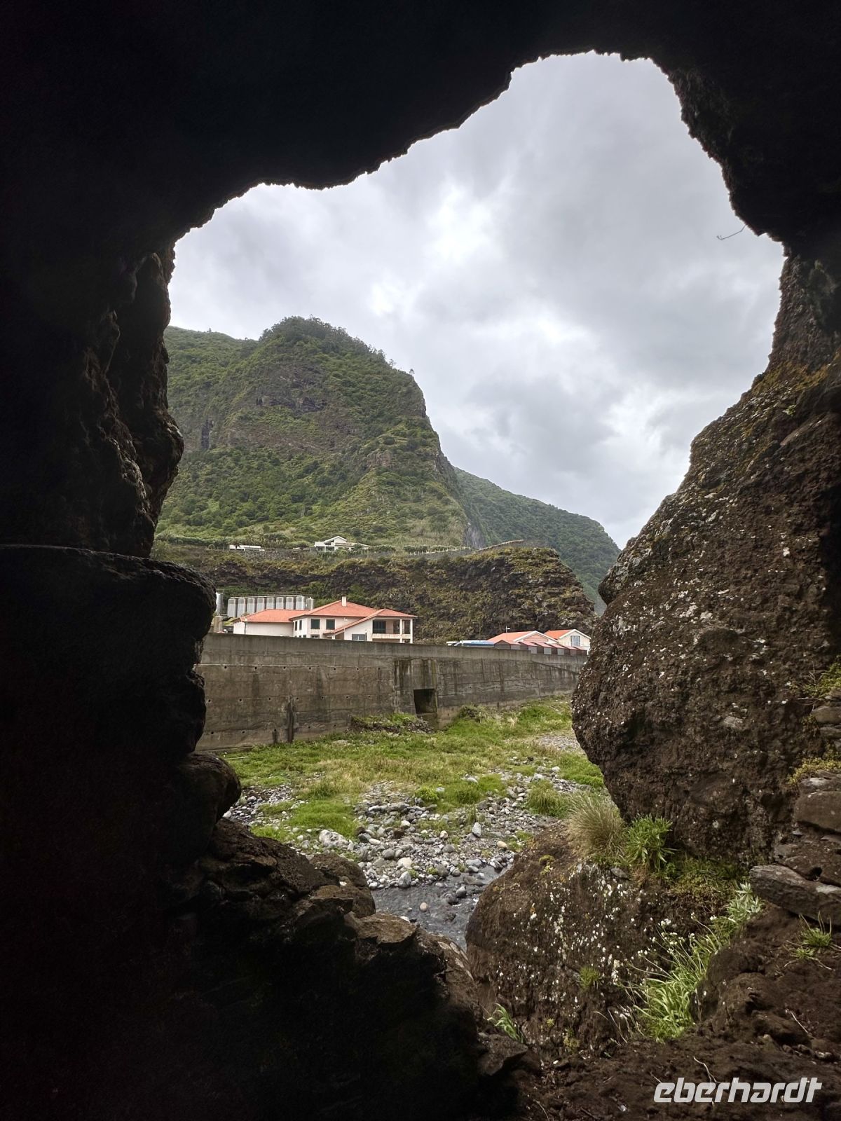 Heute schlagen wir mal eine andere Richtung ein. Es geht hoch in den Nord-Westen und wir packen sogar unsere Badesachen ein. Auf dem Weg dahin machen wir Halt in Ribeira Brava, einem verschlafenen Küstenort. Wir erkunden den Ort auf eigene Faust und stöbern etwas in den Souvenir-Geschäften bevor wir uns auf den Weg über den Encumeada-Pass in Richtung Porto Moniz machen. Auf dem Weg durchqueren wir die Hochebene Paúl da Serra. Dies ist die größte zusammenhängende flache Fläche der Insel. Aber mit 1.400 Meter Höhe auch sehr anfällig für schlechtes bis sehr schlechtes Wetter. Wir hatten an diesem Tag zum Glück nur ersteres, aber dies bedeutete dichter Nebel und keine Chance auf Weitblick. Deshalb halten wir auch erst gar nicht an und fahren wieder etwas tiefer unter die Wolken und genießen in Ribeira da Janela den tollen Ausblick.