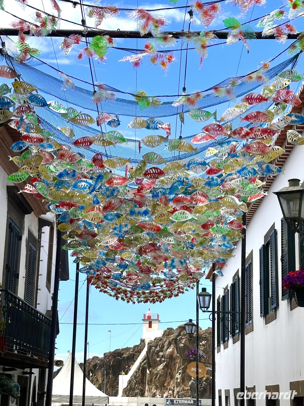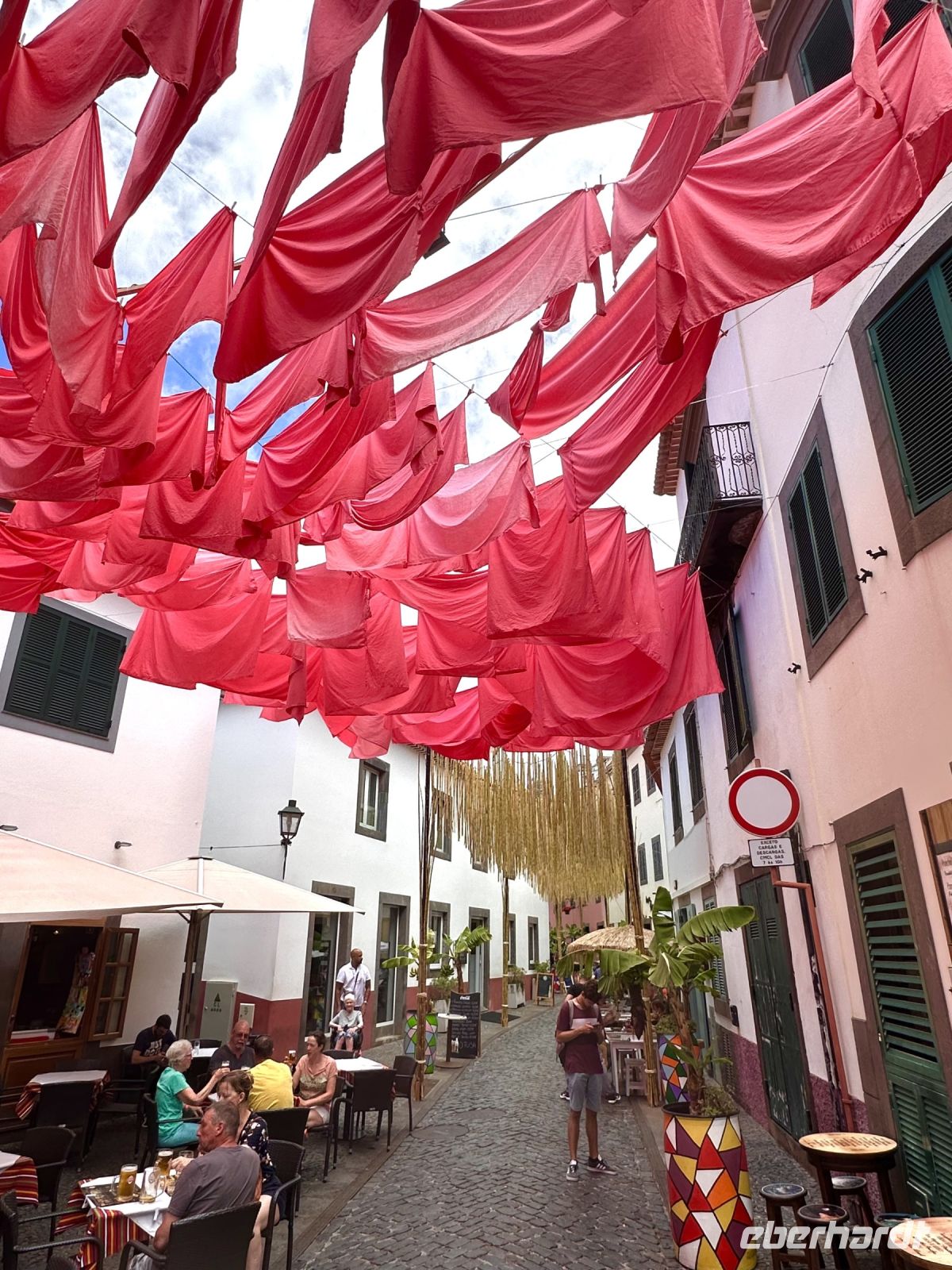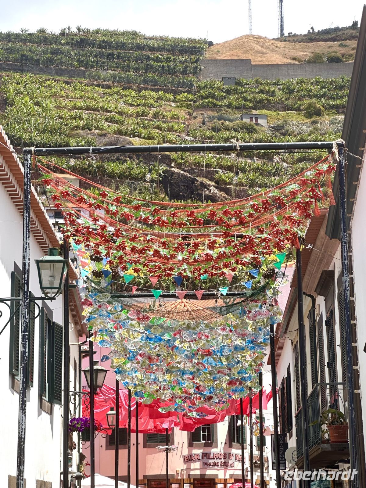 Auf unserem weiteren Weg durch die Stadt, sehen wir wie die Straßen kunstvoll geschmückt sind. Denn aktuell findet in Funchal noch das jährliche „Festas da Sé Festival“ statt. Bei diesem Fest gibt es viel Musik, Kunst, Unterhaltung und natürlich Essen und Trinken.