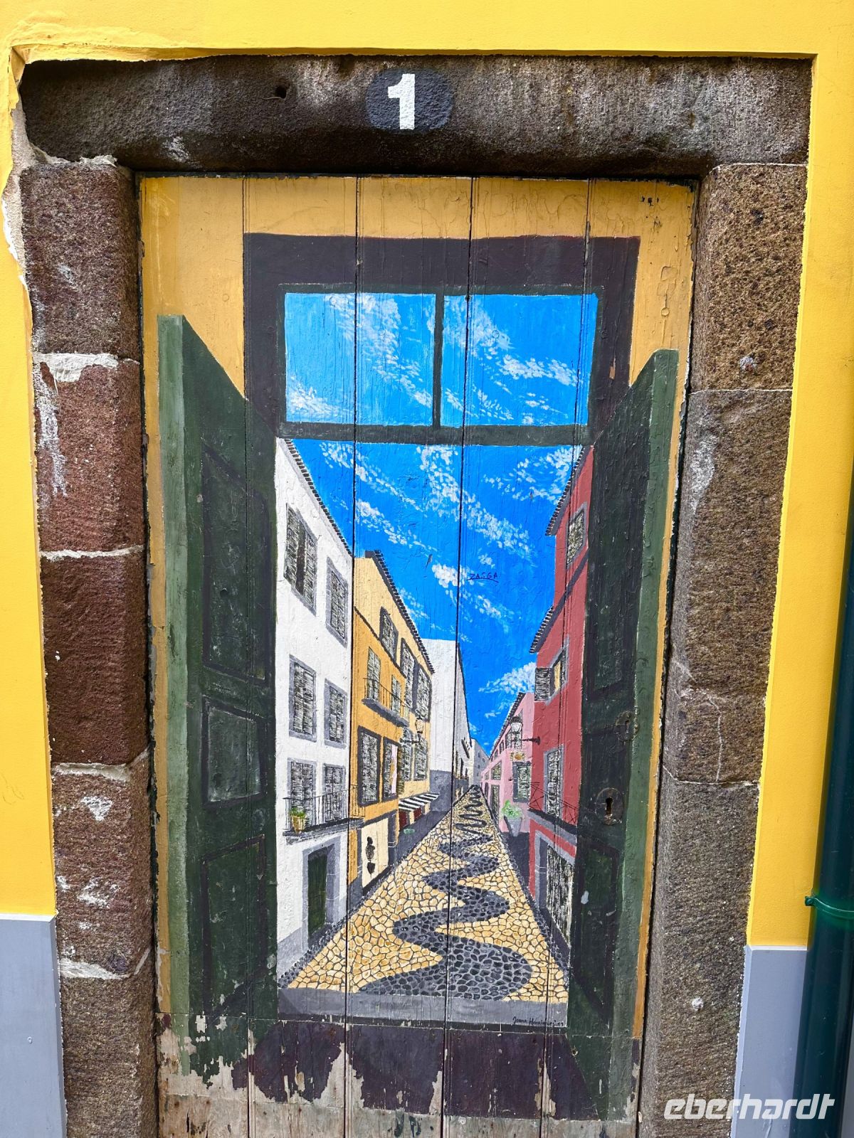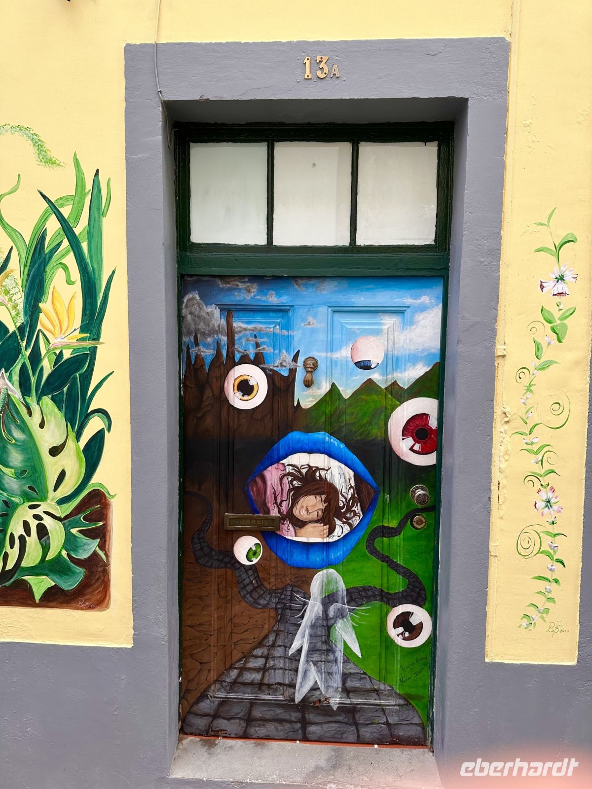 Anschließend führt uns unsere Reiseleiterin durch die Rua Santa Maria, diese Gasse mit seinen unzähligen kleinen Restaurants, Kneipen und interessanten kleinen Geschäften zeigt die Streetart von Funchal am besten. Die vielen Türen und Fensterläden sind alle liebevoll und thematisch völlig unterschiedlich bemalt und laden alle zum Bestaunen ein.
