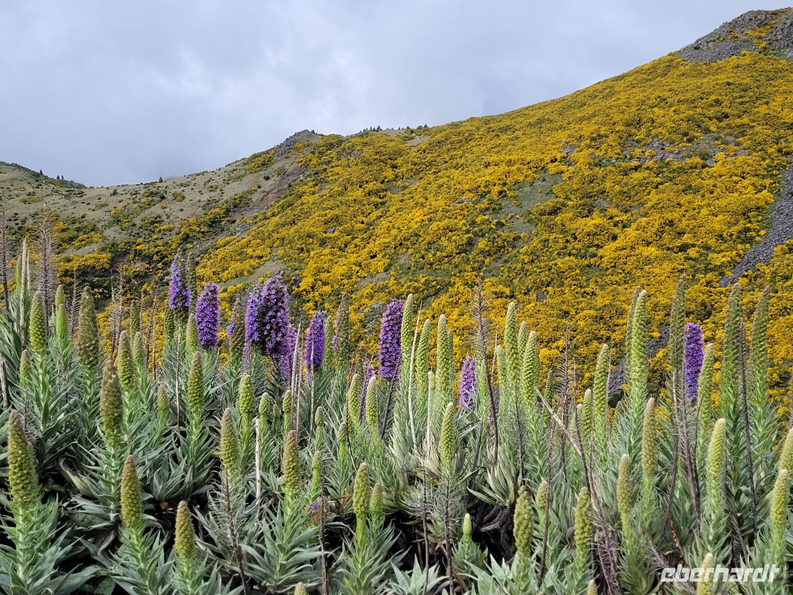 (1818m) mit der weißen Radarkugel. Die Fahrt gestaltete sich regnerisch und neblig. Doch wie ein Wunder zog sich kurz vor dem Gopfel der Vorhang auf und es wurden sehr schöne Fotomotive. Der Ginster zeigte sich im leuchtenden Gelb und die „Natternköpfe“ (Nationalblume) wikten als Kontrast in Blau. Oben hatten