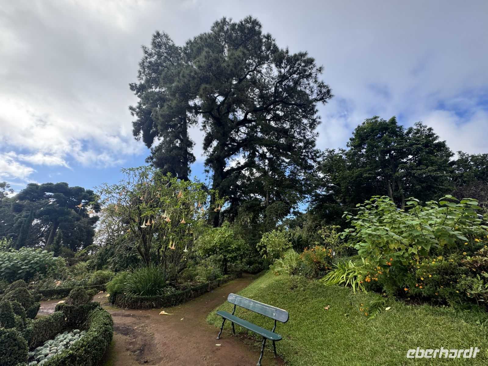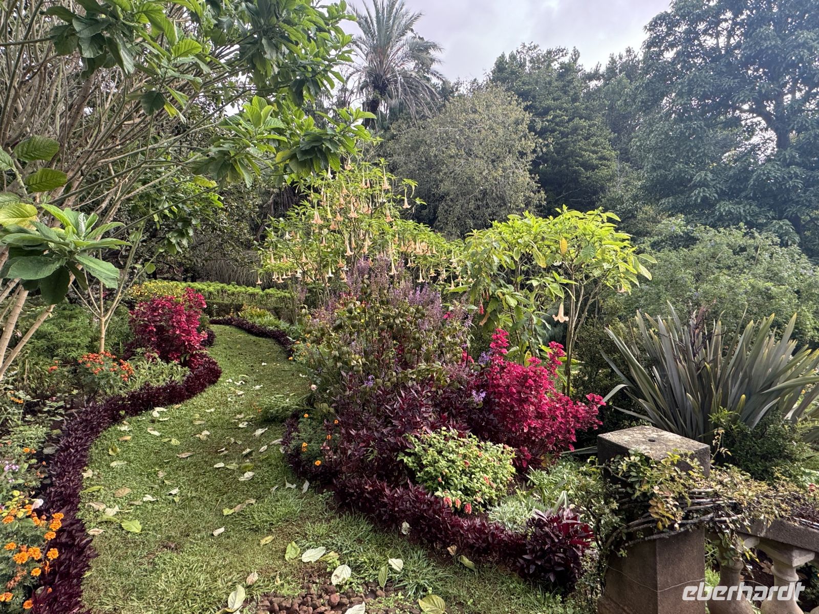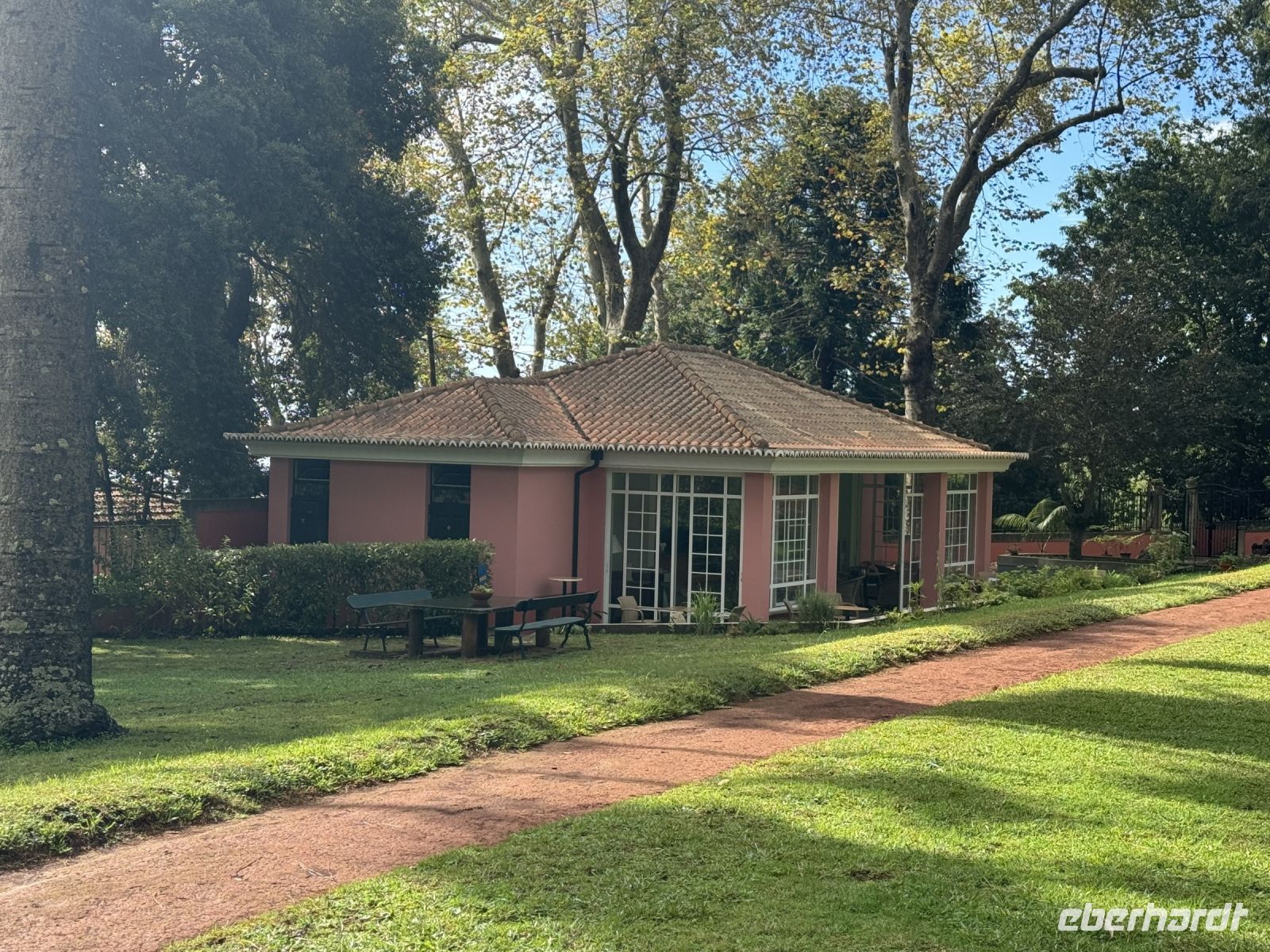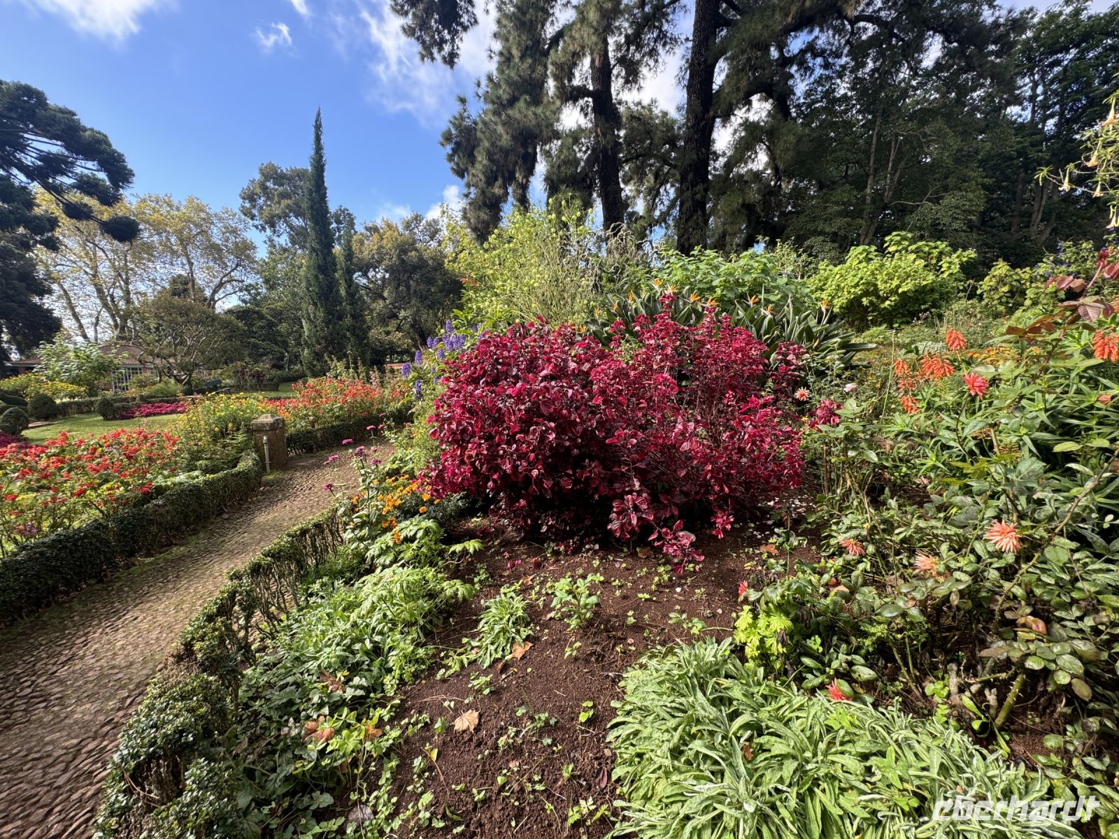 Jetzt besuchen wir die Quinta do Palheiro, einen privat geführten Botanischen Garten auf Madeira. Er wird nach der englischen Gründerfamilie auch Blandy's Gardens genannt. Wegen des alten Baumbestands und opulent arrangierten subtropischen Ziergewächsen gilt die Parklandschaft als eine der schönsten Gartenanlagen der Insel. Das zwölf Hektar große Gelände liegt 500 m über dem Meeresspiegel etwa 7 km östlich von der Hauptstadt Funchal, der Zugang erfolgt vom Caminho da Quinta do Palheiro. Der Landsitz wurde 1885 von der englischen Winzerfamilie Blandy von den ursprünglichen Besitzern, der Adelsfamilie Conde de Carvalhal, erworben, die auf dem Gelände ursprünglich ein Jagdhaus (heute ein Landhotel) unterhielten und um 1801 begannen exotische Gehölze aus aller Welt zu pflanzen. Unter der Regie der Blandys wurde generationsübergreifend der weitläufige Garten im englischen Gartenstil ausgebaut und mehrfach verändert. Einen maßgeblichen Einfluss übte Mildred Blandy aus. Die gebürtige Südafrikanerin machte viele Gewächse aus ihrer Heimat auf Madeira heimisch, darunter etliche Arten aus der Gattung Zuckerbüsche, diese werden heute in größerem Umfang auf Madeira kultiviert. Der besondere Reiz des Gartens liegt in der Kombination aus von Mitteleuropa vertrauten Bäumen, etwa Buche und Stieleiche, mit subtropischen Gehölzen aus aller Welt. Gleich hinter dem Kassenhäuschen am Eingang macht eine Kamelienallee auf sich aufmerksam, die ersten dieser in Ostasien beheimateten Baumsträucher wurden in dem Garten bereits im 19. Jahrhundert gepflanzt. Zu einem Wahrzeichen von Palheiro Gardens avancierten zwei Koniferen aus der Gattung der Araukarien, sie stehen westlich von der kleine Barockkapelle St. Johannes. Mit einer Höhe von 42 m und einem Stammumfang von 6 m gehört die Zimmertanne zu den mächtigsten Bäumen Madeiras. Monumentale Größe erreicht auch ein 30 m hoher amerikanischer Tulpenbaum.