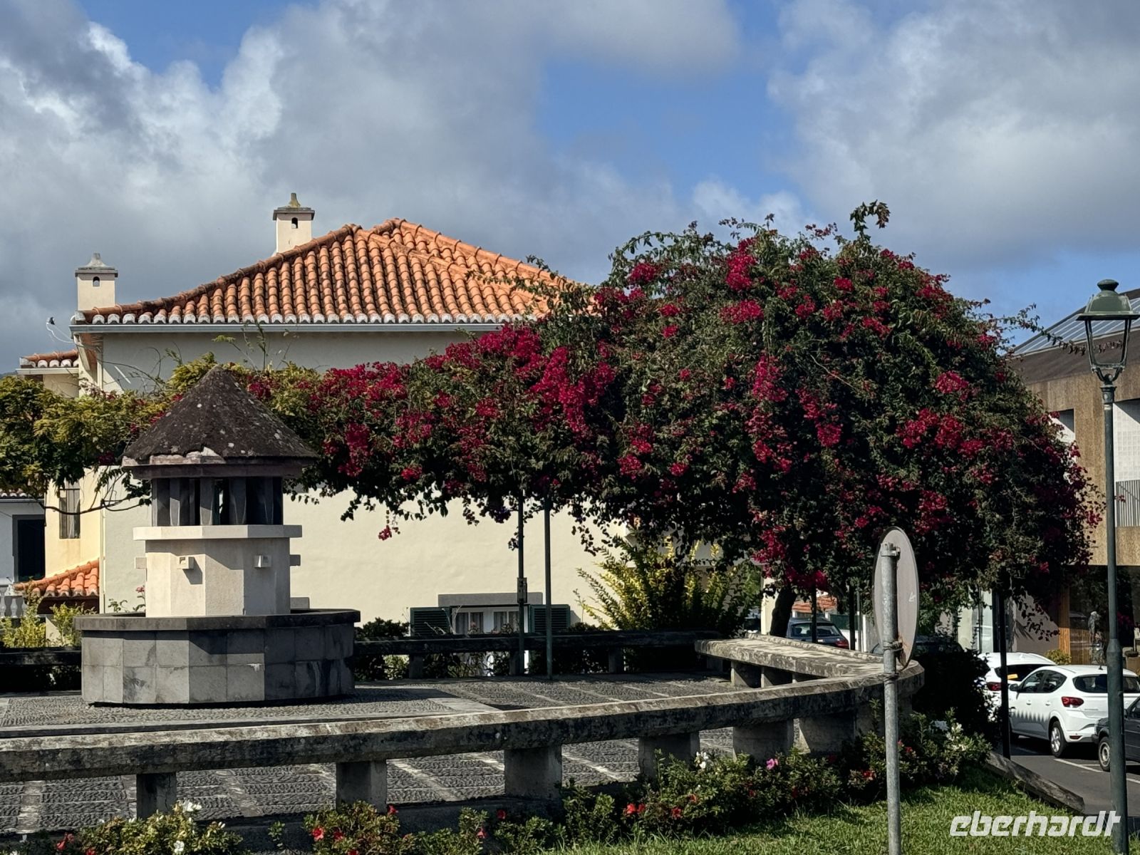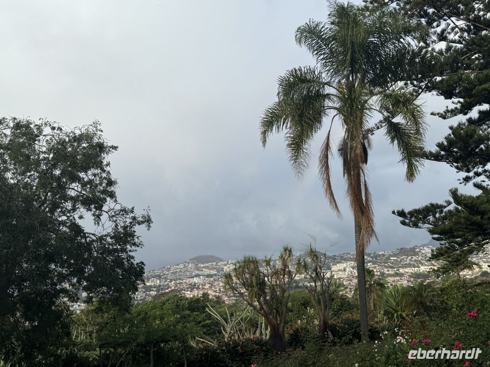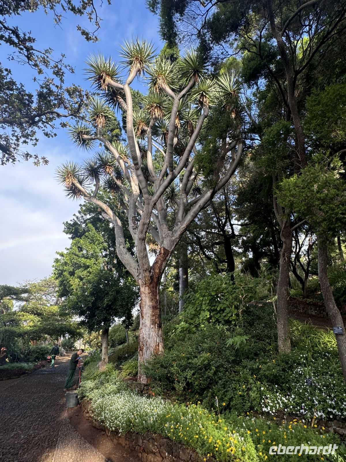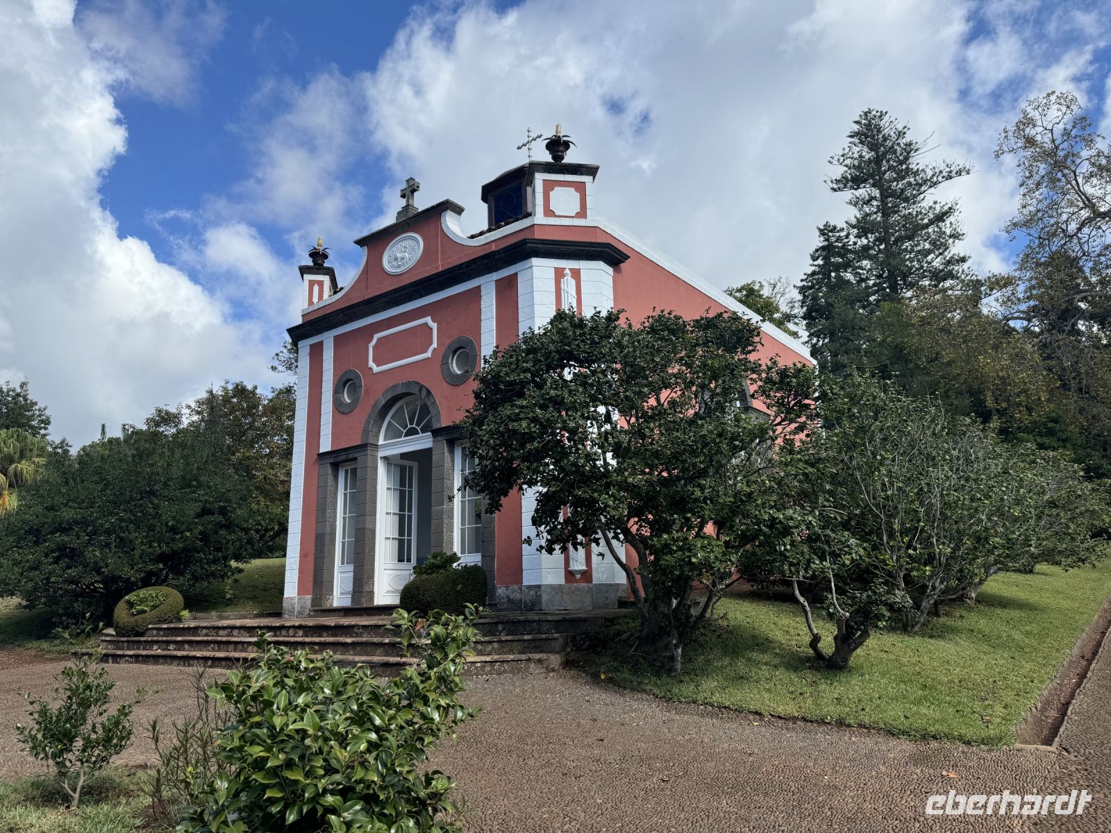 Jetzt besuchen wir die Quinta do Palheiro, einen privat geführten Botanischen Garten auf Madeira. Er wird nach der englischen Gründerfamilie auch Blandy's Gardens genannt. Wegen des alten Baumbestands und opulent arrangierten subtropischen Ziergewächsen gilt die Parklandschaft als eine der schönsten Gartenanlagen der Insel. Das zwölf Hektar große Gelände liegt 500 m über dem Meeresspiegel etwa 7 km östlich von der Hauptstadt Funchal, der Zugang erfolgt vom Caminho da Quinta do Palheiro. Der Landsitz wurde 1885 von der englischen Winzerfamilie Blandy von den ursprünglichen Besitzern, der Adelsfamilie Conde de Carvalhal, erworben, die auf dem Gelände ursprünglich ein Jagdhaus (heute ein Landhotel) unterhielten und um 1801 begannen exotische Gehölze aus aller Welt zu pflanzen. Unter der Regie der Blandys wurde generationsübergreifend der weitläufige Garten im englischen Gartenstil ausgebaut und mehrfach verändert. Einen maßgeblichen Einfluss übte Mildred Blandy aus. Die gebürtige Südafrikanerin machte viele Gewächse aus ihrer Heimat auf Madeira heimisch, darunter etliche Arten aus der Gattung Zuckerbüsche, diese werden heute in größerem Umfang auf Madeira kultiviert. Der besondere Reiz des Gartens liegt in der Kombination aus von Mitteleuropa vertrauten Bäumen, etwa Buche und Stieleiche, mit subtropischen Gehölzen aus aller Welt. Gleich hinter dem Kassenhäuschen am Eingang macht eine Kamelienallee auf sich aufmerksam, die ersten dieser in Ostasien beheimateten Baumsträucher wurden in dem Garten bereits im 19. Jahrhundert gepflanzt. Zu einem Wahrzeichen von Palheiro Gardens avancierten zwei Koniferen aus der Gattung der Araukarien, sie stehen westlich von der kleine Barockkapelle St. Johannes. Mit einer Höhe von 42 m und einem Stammumfang von 6 m gehört die Zimmertanne zu den mächtigsten Bäumen Madeiras. Monumentale Größe erreicht auch ein 30 m hoher amerikanischer Tulpenbaum.