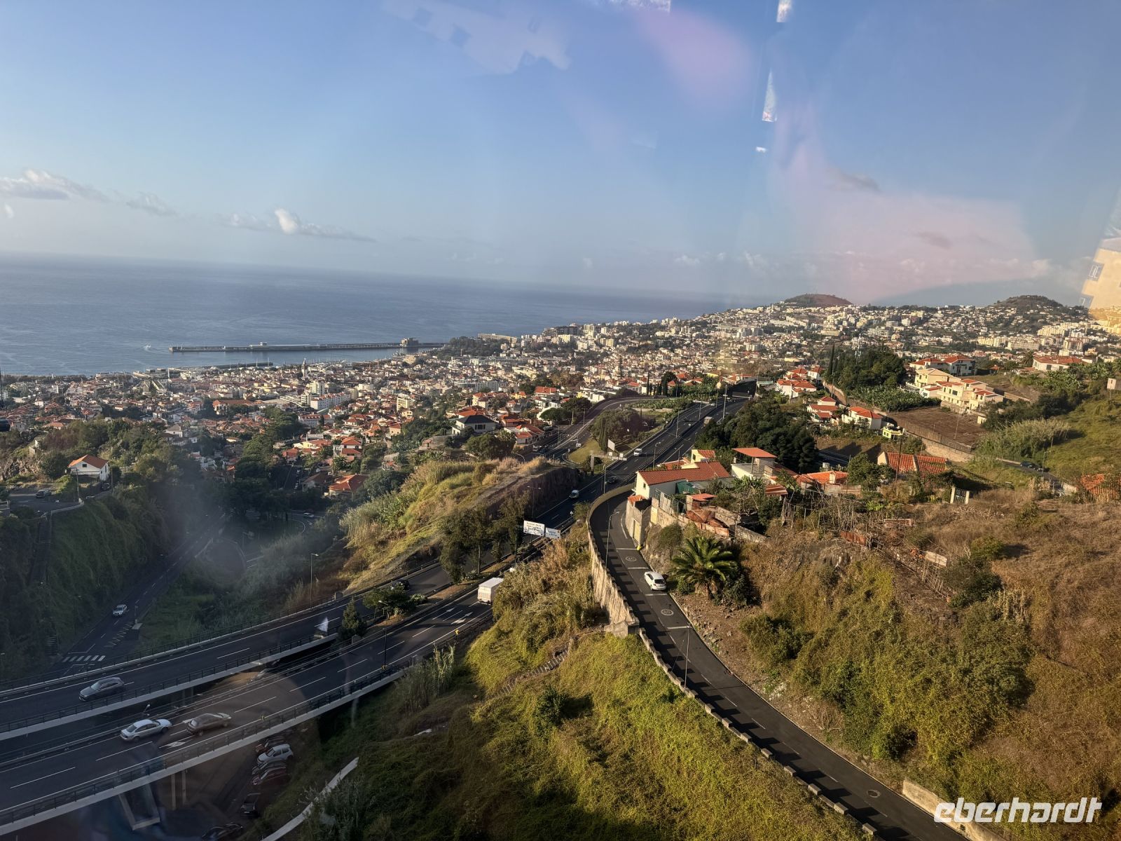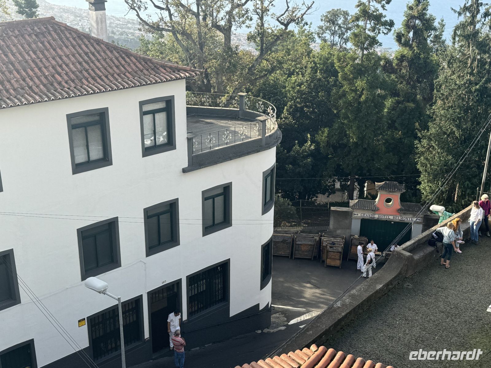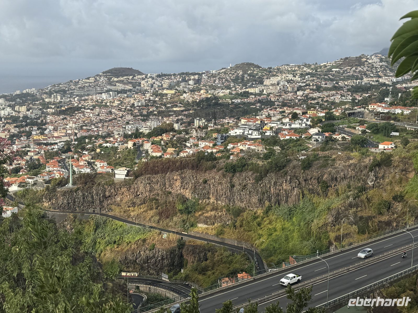 Weiter geht es mit einer abenteuerlichen Schlittenfahrt talabwärts. Aufgrund des steilen Geländes können wir auf dem Rückweg mit einem Korbschlitten, dem Carro de cesto genannten Kufenschlitten, den asphaltierten Weg Caminho do Monte bis an den oberen Stadtrand von Funchal herunterrutschen. Die ursprünglich vier Kilometer lange Strecke wurde auf zwei Kilometer verkürzt. Die Korbschlitten, die über keinerlei Lenkung oder Bremsen verfügen, werden von zwei in der traditionellen weißen Tracht gekleideten Schlittenlenkern gesteuert und durch Zurückhalten oder Querstellen gebremst. Die Anschieber, die die Korbschlitten begleiten, tragen Schuhe mit Gummisohlen, die sie als Bremsen auf den steilen Straßen benutzen. Auf der Straße herrscht auch Autoverkehr, heute sind aber kaum Autos unterwegs und die Autofahrer respektieren die Korbschlitten. Die Geschichte dieser Monte-Korbschlittenfahrten geht auf das Jahr 1890 zurück. Damals war es die einzige Möglichkeit, den Berg hinunterzukommen, außer man ging zu Fuß. Seitdem ist dieses Verkehrsmittel zu einer unverzichtbaren Touristenattraktion auf der Insel Madeira geworden. Die Korbschlittenfahrt endet etwa auf halbem Weg nach Funchal, in Livramento, von wo uns Paolo wieder mit dem Bus abholt und wir unsere Exkursion zum Nonnental über den Pico dos Barcelos fortsetzen. Er befindet sich in der Gemeinde Santo António, der Heimat des Fußballvereins „Andorinha“, der die Karriere von Cristiano Ronaldo begründete. Mit seinen 355 Metern über dem Meeresspiegel bietet uns dieser Aussichtspunkt die Möglichkeit, in aller Ruhe auf die Stadt Funchal zu blicken, insbesondere auf ihre Bucht. Bei klarer Sicht können wir von hier aus sogar die Ilhas Desertas sehen, eine Gruppe von drei kleinen Vulkaninseln: Ilhéu Chão, Deserta Grande und Bugio. Wir erleben hierbei einen herrlichen und unvergesslichen Panoramablick.
