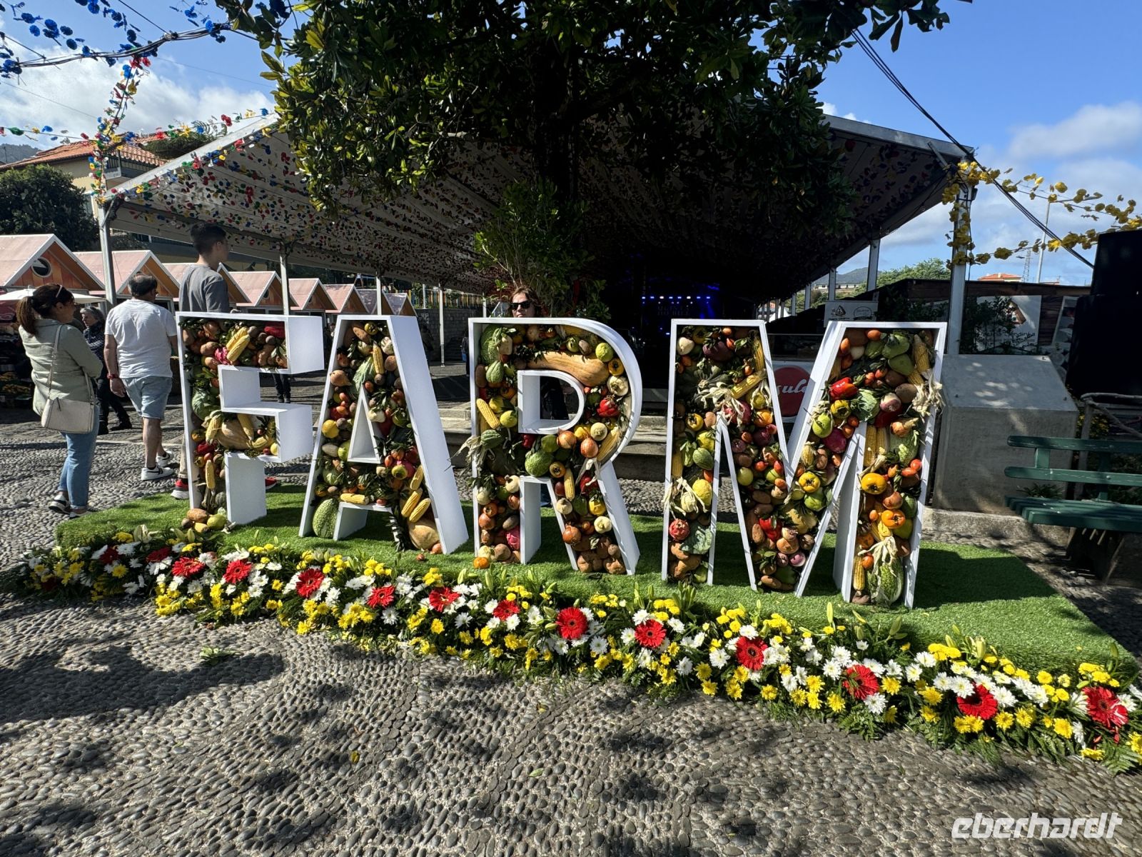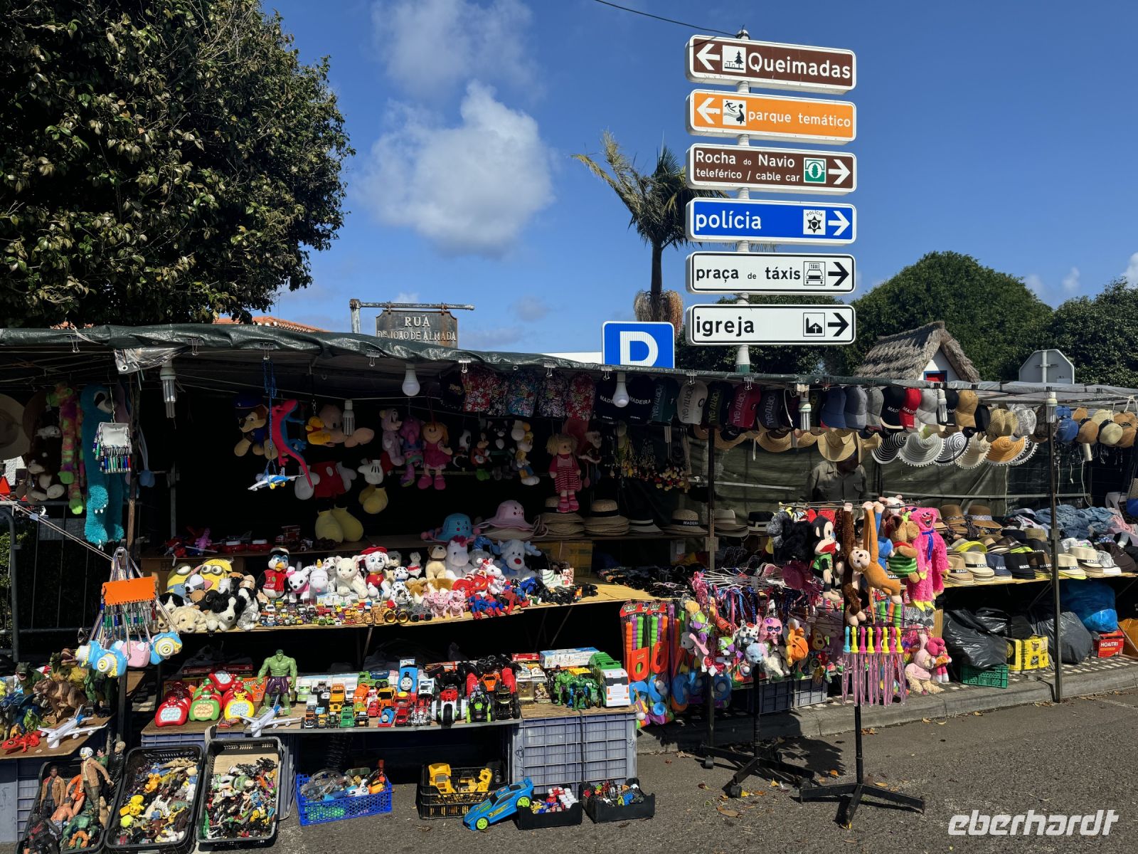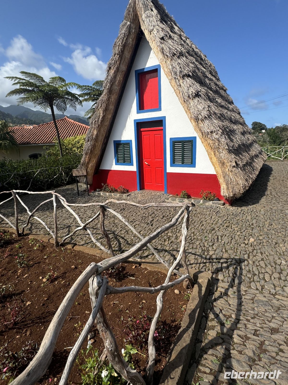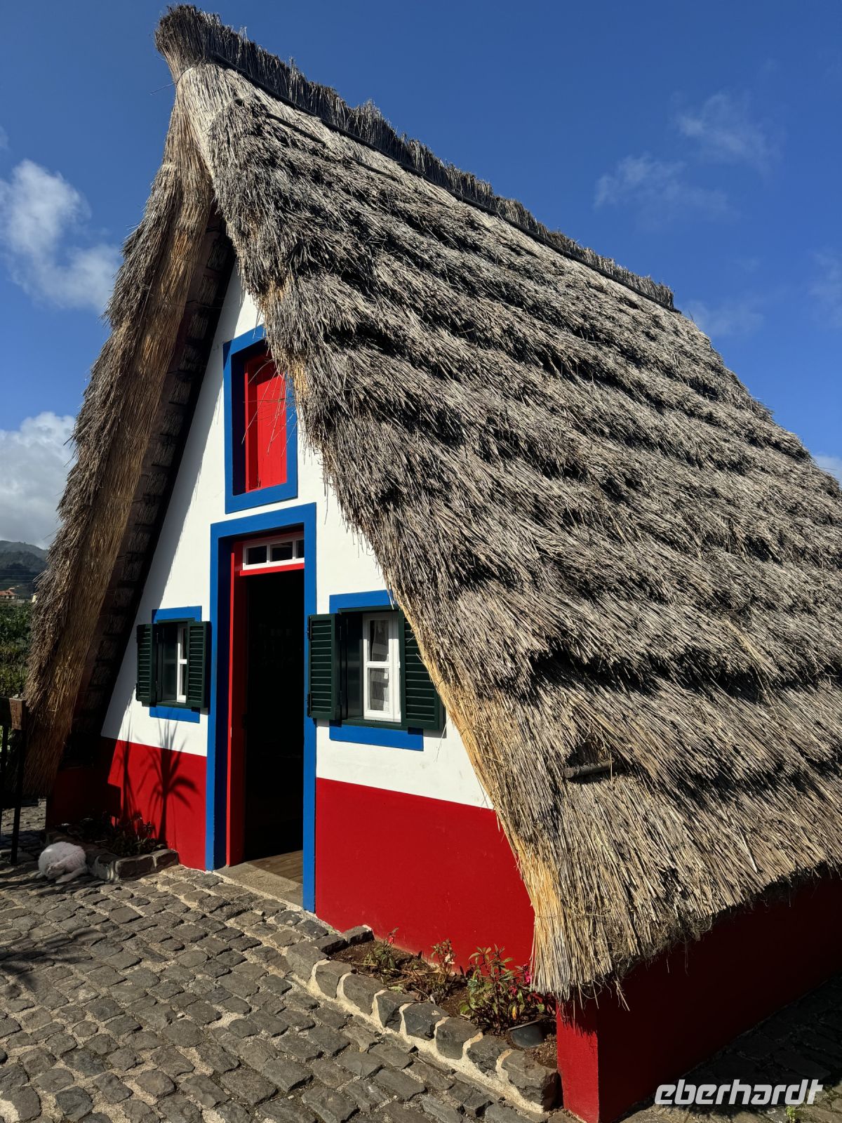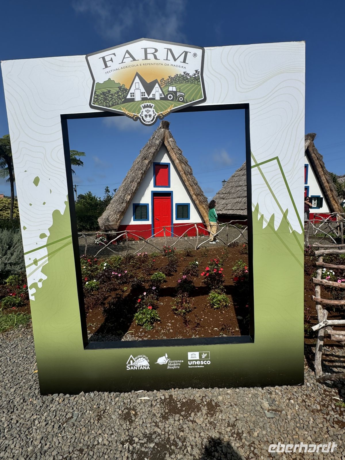 Nun besuchen wir den wunderschönen Ort Santana, gelegen an der Nordküste Madeiras. Auf einer Fläche von 19,0 km² leben ca. 29008 Einwohner was einer Bevölkerungsdichte von 149,3 Einwohnern/km² entspricht. Santana ist berühmt für seine traditionellen strohbedeckten Bauernhäuschen, die Wahrzeichen der Insel Madeira. Früher wohnten die Bauern in diesen einfach eingerichteten, oft rot angestrichenen Häuschen. Heute stehen die meisten leer und werden nur noch als Touristenattraktion instandgehalten. Die Strohdächer müssen alle vier bis fünf Jahre ausgewechselt werden. Im Ort findet gerade ein Bauernmarkt statt und wir können an den viele Ständen lokale Agrarprodukte sehen.