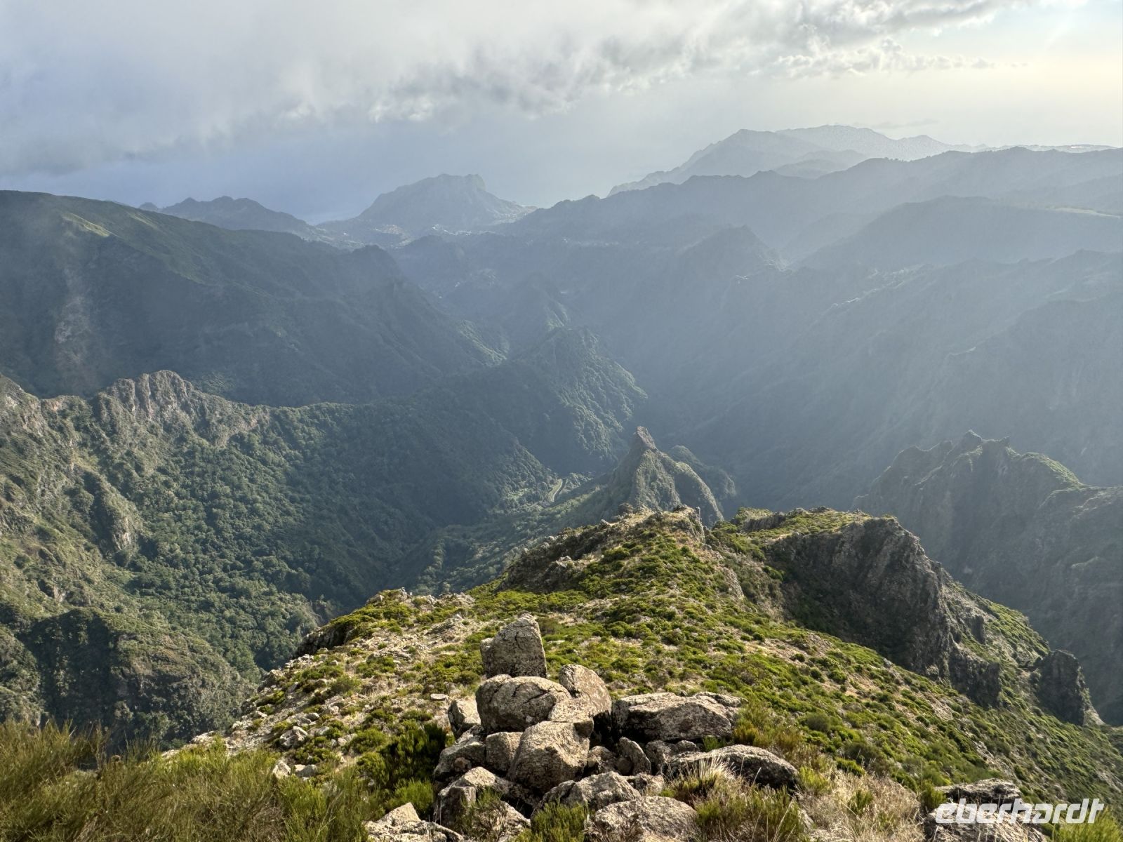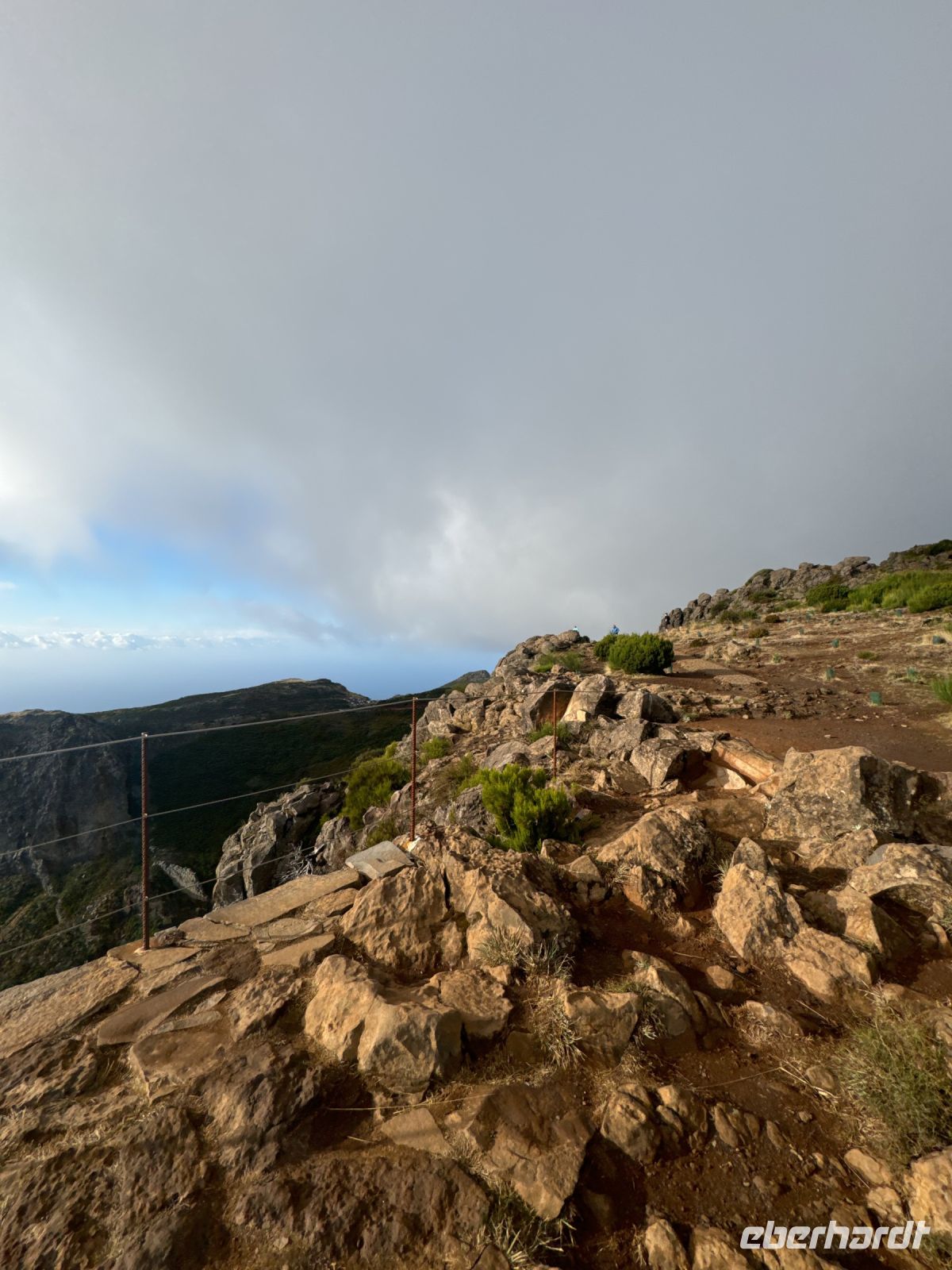 Unmittelbar neben dem Gipfel steht die weithin sichtbare Radarstation der Portugiesischen Luftstreitkräfte. Bei einem kurzen Rundgang auf dem Gipfel haben wir einen wundervollen Ausblick auf die Umgebung bevor der eiskalkte Nordwind der in kürzester Zeit viele Wolken herbeischiebt und die Sicht verdeckt.