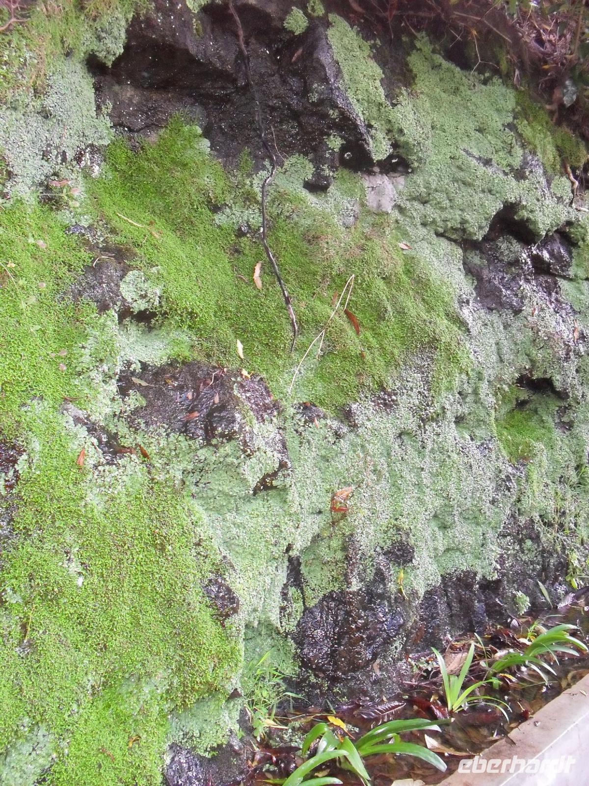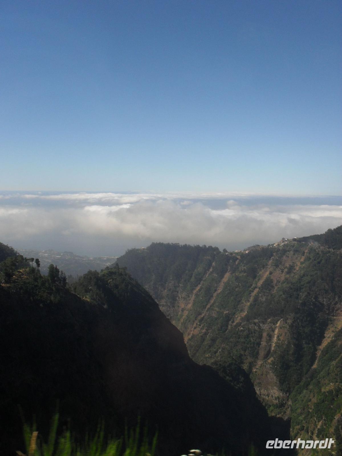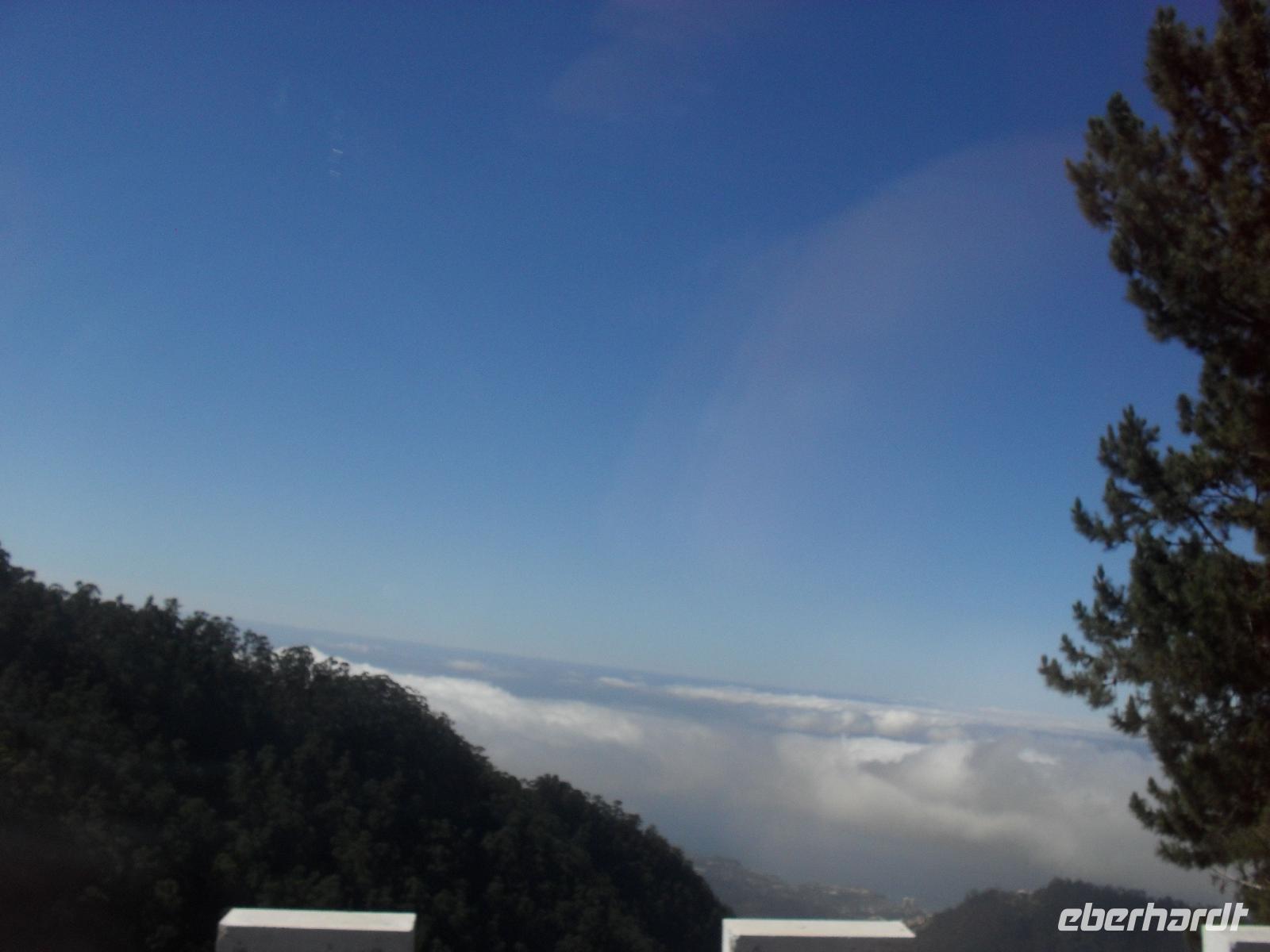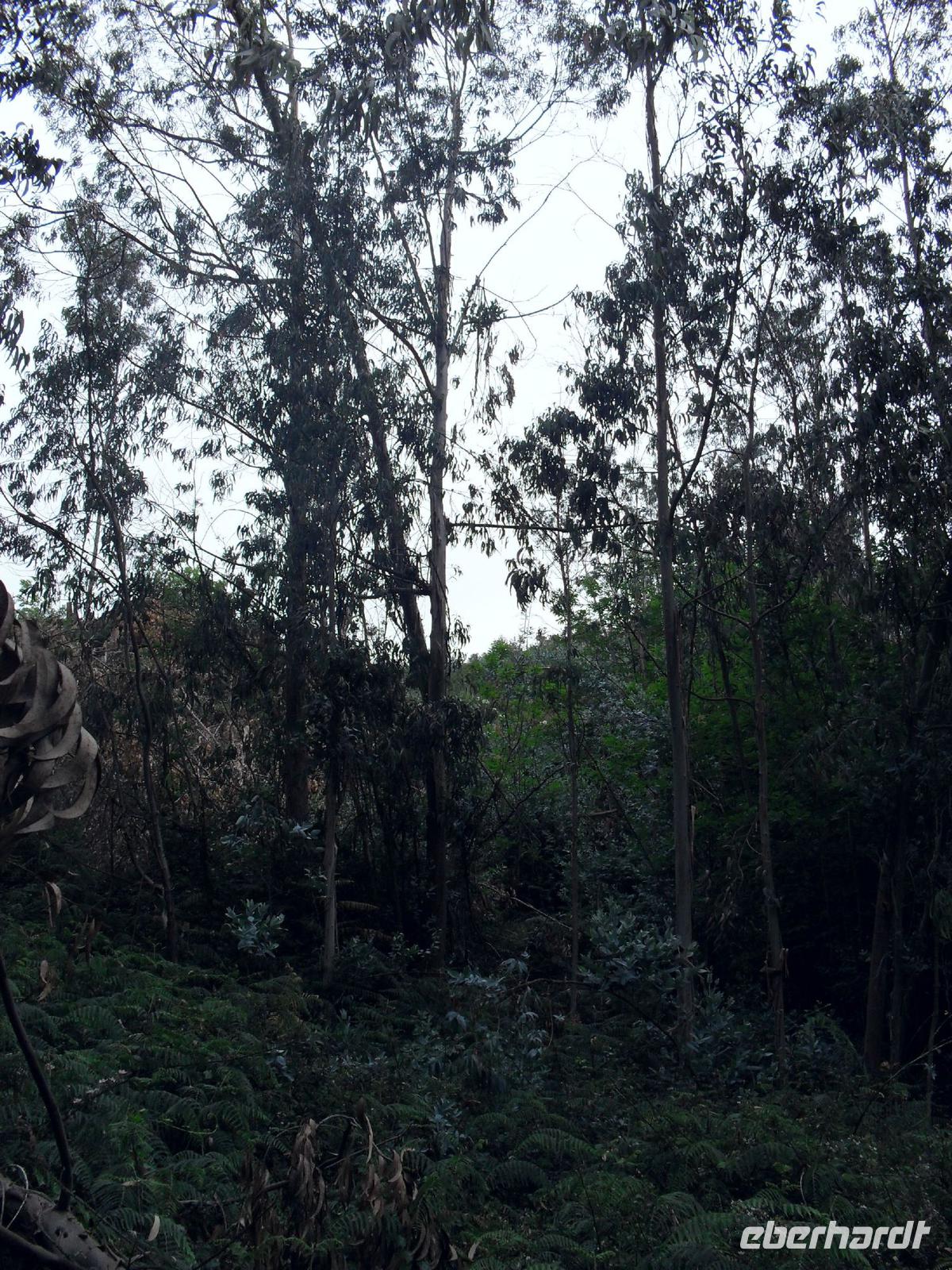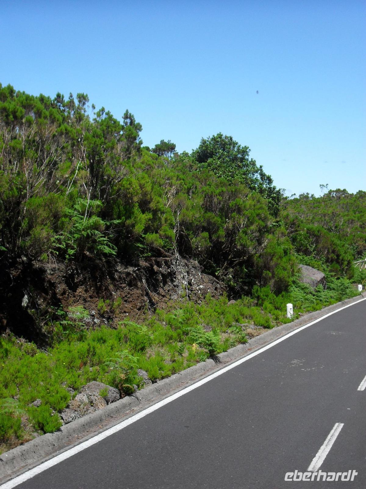 Mit der Fahrt entlang des „Eucumeada-Passes“ erreichten wir dann in 1007 m Höhe den Aussichtspunkt über die Nord- und Südküste Madeiras. Leider konnten wir die Küsten nur erahnen, da der starke Nebel die Sicht einschränkte. Jedoch ist auch bei diesem Wetter der Weg von knapp 11 km entlang der Serpentinen nicht umsonst gewesen. Nach einer kurzen Fotopause und den ersten Souvenirs setzten wir unsere Reise gen Norden fort. Mit „einer an Schottland erinnernde Landschaftsstimmung auf der Blumeninsel“ 1 erreichten wir die größte Ebene „Paul da Serra“. Die größte Ebene liegt auf etwa 1300 m Höhe und erreicht eine Fläche von gut 100 km². Die Fahrt führe uns durch dichtbewaldete und zerklüftete Berglandschaften bis wir in der Moos- und Farnlandschaft ankamen. Die unendliche Weite über den