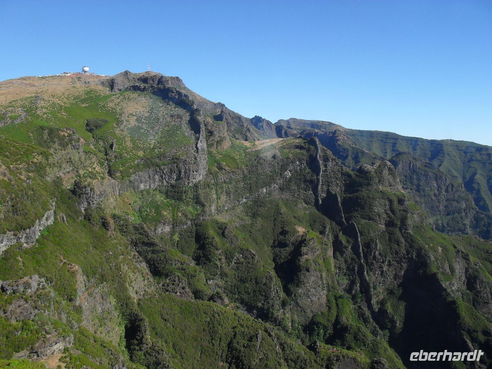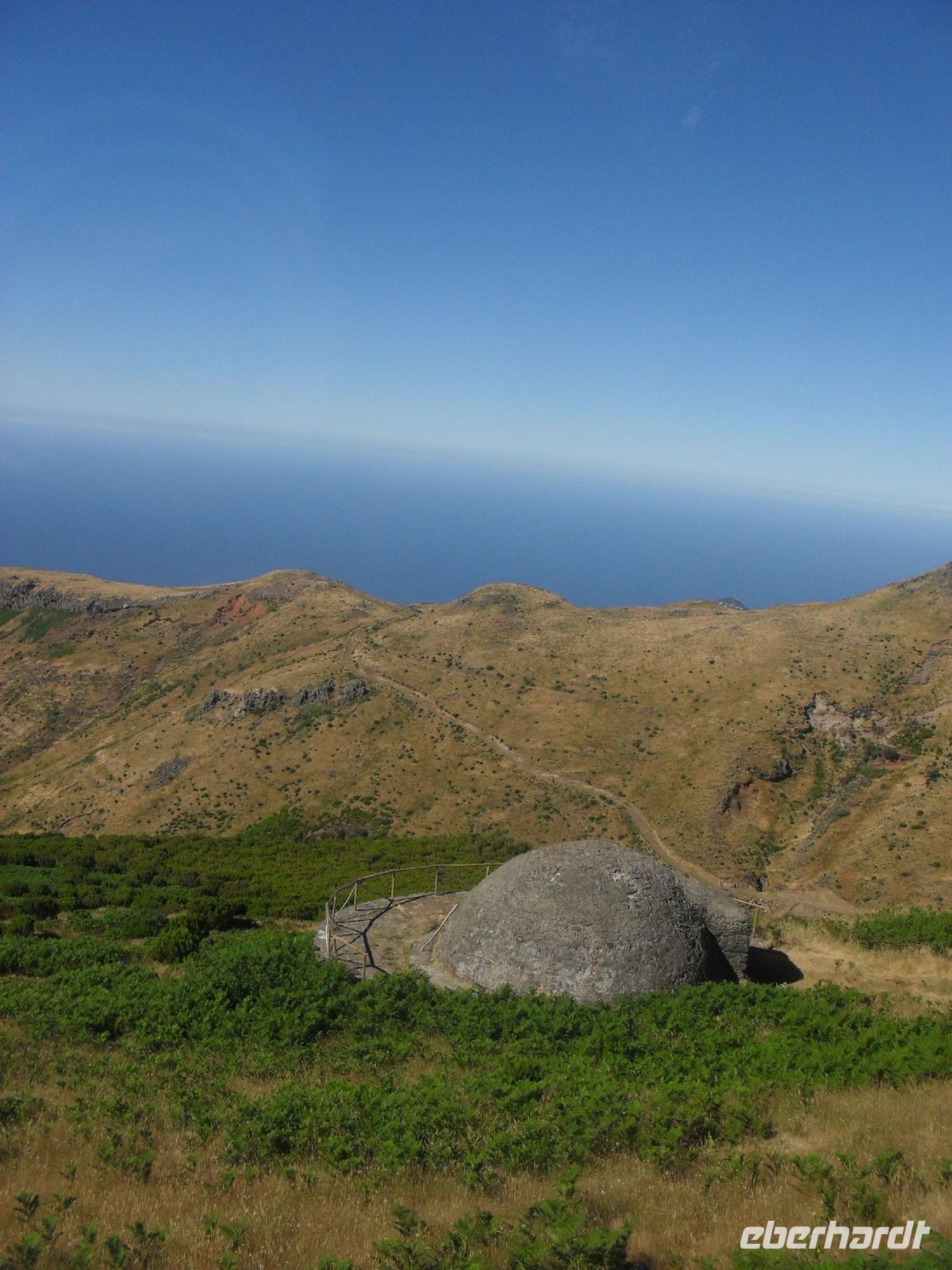Weiter ging es zu einem mächtigen „Naturbauwerk“ der dritthöchste Berg der Blumeninsel der „Pico do Areeiro“. Die Asphaltstraße mit ihren zahlreichen Kurven führte uns bis auf eine Höhe von 1818 m. Durch bewaldetet Gebirgslagen und der oberen Heidekraut und Erikaschicht bis zu nackten Felsformatierungen führte uns die Fahrt. Einen kleinen Fotostopp legten wir bei dem bekannten „Eishaus“ ein. Dies ist ein Erdloch, welches durch ein kugelförmiges Steindach isoliert ist. Hier konnten die Bewohner von Funchal das Eis bis in die Sommermonate hinein aufbewahren und Speisen und Getränke kühlen. Mit einem kleinen Aufstieg verbunden ist der Aussichtspunkt auf dem „Pico do Areeiro“. Jedoch entschädigt der Blick ins Nonnental und auf die östliche Landzunge „Ponta de Sao Lorenzo“ und auf die Ebene. Gehen Sie in Stück auf dem Wanderweg Richtung Nonnental, welche Sie Bergab und Bergauf zu den schönsten Stellen der Insel bringt.