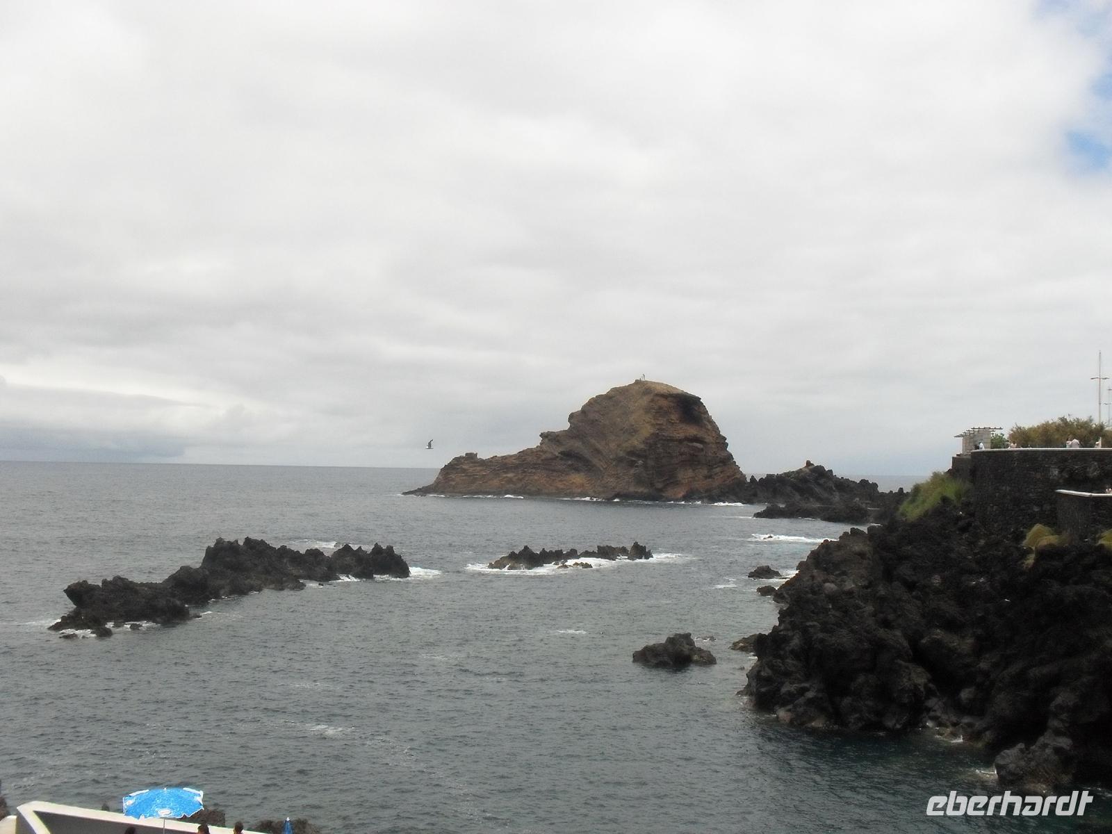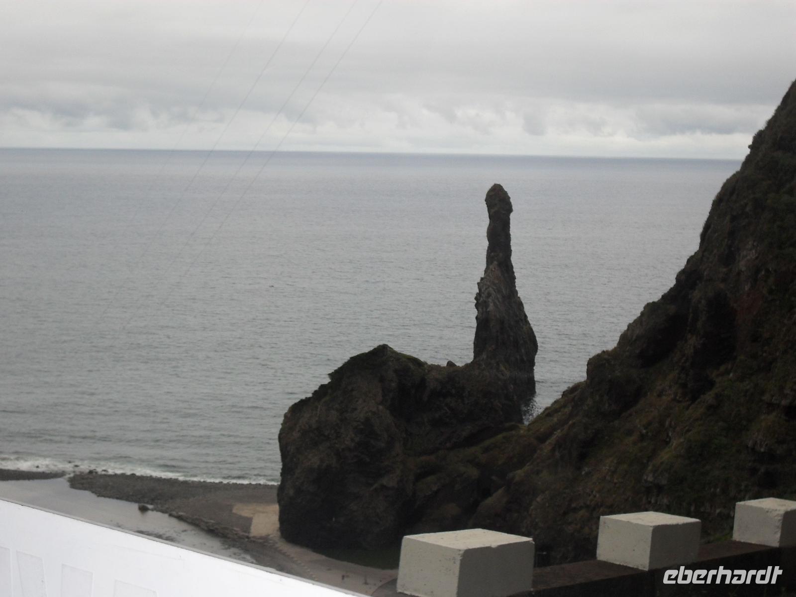 Wolken beeindruckte mich sehr. Ich kann es Ihnen schwer beschreiben wie man sich hier oben fühlte, aber vielleicht ist es vergleichbar mit einem Flug über diese Region der Insel, obwohl man im Bus unterwegs ist. Da unsere Fahrt heute noch weiter Ziele vor dem Auge hatte setzten wir unsere Fahrt fort und kamen zum Lorbeerwald und Richtung Nordküste. Das Wetter änderte sich und plötzlich fuhren wir durch dicken Nebel entlang des Lorbeerwaldes nach Porto Moniz. Mit seiner einzigartigen Lage im Nordwesten der Insel besitzt dieser Ort einen besonderen Charme. Bekannt für den früheren Walfang hat es auch heute noch einiges zu bieten. Die Meeresschwimmbecken im Lavagestein ziehen Touristen und Einheimische zum Schwimmen an die Bucht. Hier stärkten wir uns für die nächste Etappe unsere heutigen Reise. Wir fuhren entlang der Küste nach „Ribeira da Janela“, wo wir die ungewöhnliche Felsformation des Felsenfenstern bestaunen konnten.