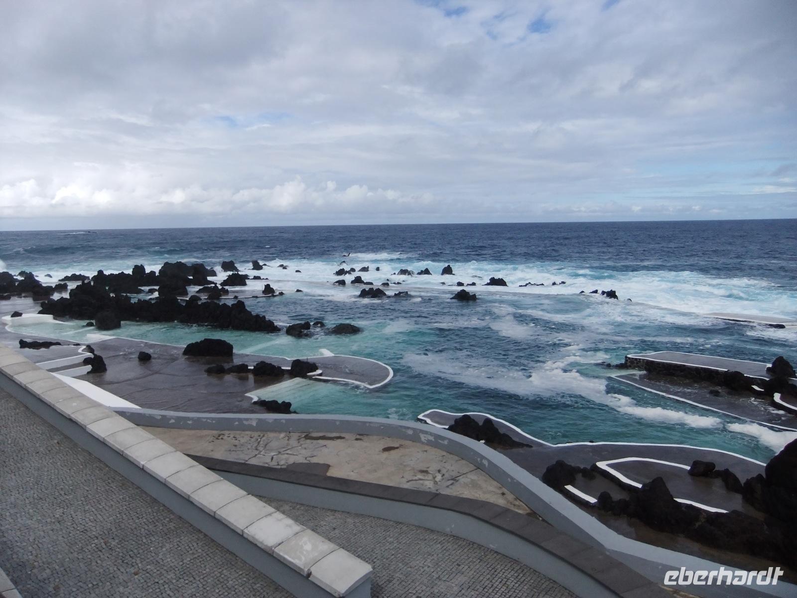 Auf unseren ersten Ausflug auf der Blumeninsel, führte uns Teresa, unsere örtliche Reiseleiterin und waschechte Madeirenserin über die Hochebene nach Porto Monize. Die Tour begann, nahc dem Frühstück, um 8:30 Uhr am Hotel. Schon nach den ersten Kilometern eröffnete sich uns ein Atemberaubender blick über Funchal. Doch für heute ist hier kein Halt vorgesehen und somit fuhren wir zu unserem ersten Fotostopp in Camera de Lobos. Von hier hatten wir ebenfalls einen tollen Ausblick. Weiter ging es über die Nebelverhangene Hochebende nach Porto Moniz, wo wir zu Mittag aßen. Nach dem wir uns gestärkt hatten fuhren wir entlang der Küste in den beschaulichen Ort Sao Vicente, wo wir von einem mächtigen Wolkenbruch überrascht wurden und dadurch mehrere Gäste unter Vordächern gefangen waren. Doch meine Kollegin Aline Kaiser und ich unternahmen, bewaffnet mit Regenschirmen, eine waghalsige Rettungsaktion und konnten damit die Verluste gering halten. Mit allen Gästen an Bord unseres Busses ging es zurück zum Hotel.