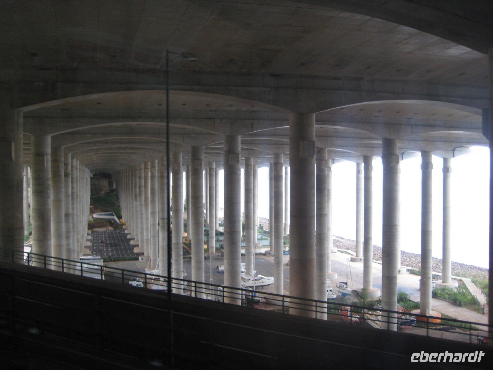 Um den Osten Madeiras zu erreichen fuhren wir mitten durch die Insel und besuchten eine Forellenzucht, eine kleine Levada-Wanderung zum Ribeiro Frio und genossen die Aussicht in die Täler der portugiesischen Insel. Als wir Santana erreichten genossen wir ein leckeres Mittagessen und besichtigten die Casas de Colmo (Häuser mit Reetdächern). Anschließend fuhren wir entlang der Ostküste in Richtung Machico und machten einen Stopp auf dem Pico de Facho, wo wir einen guten Blick auf die einmalige Landebahnkonstruktion des Flughafens Funchal hatten. Diese Landebahn hat es in sich, den etwa ein Drittel der Landebahn steht auf 70 Meter hohen Pfeilern.