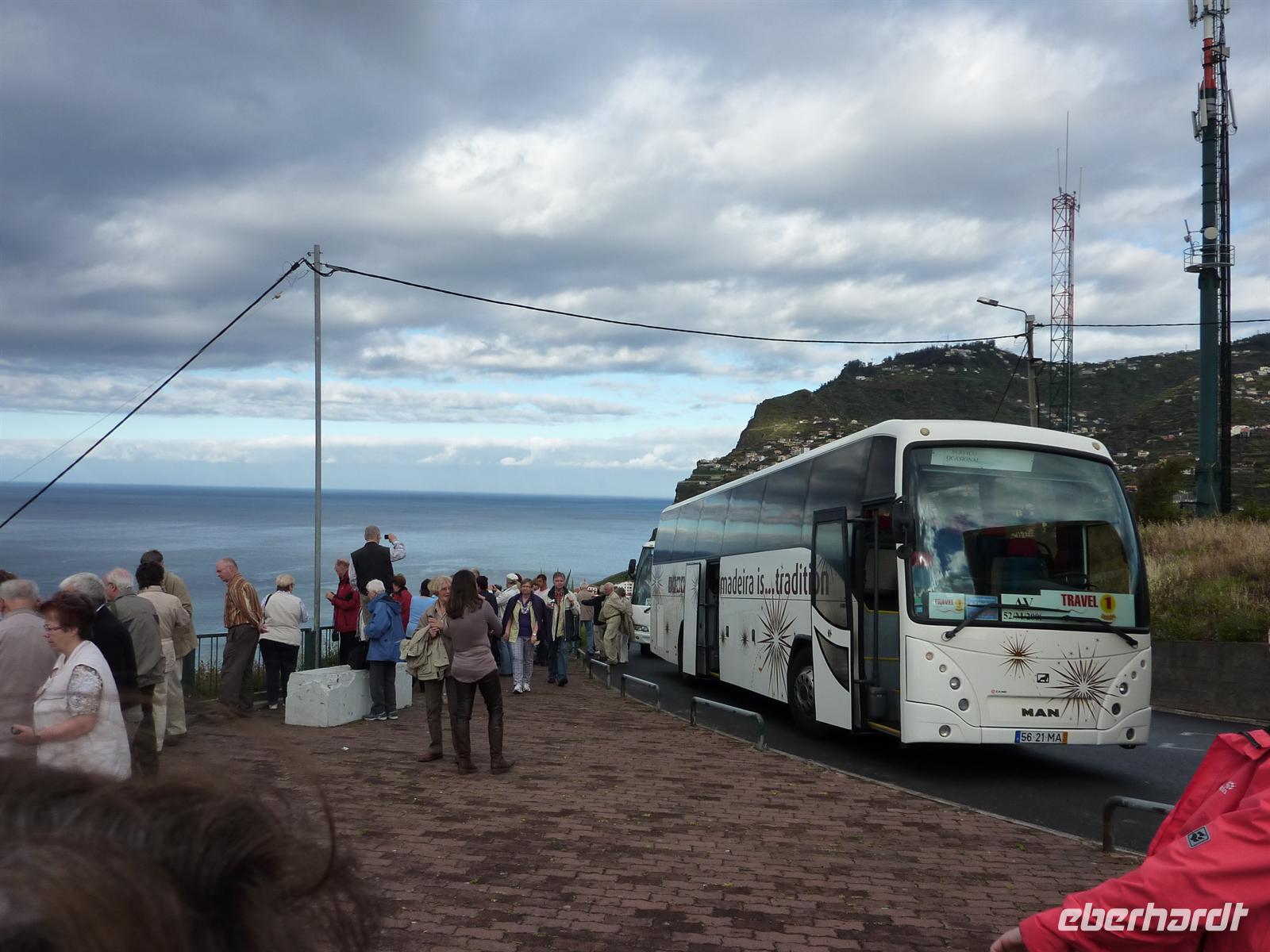 Zu Beginn unserer Tour hat das Wetter nicht mitgespielt, doch um so näher wir uns dem wunderschönen Aussichtsbalkon näherten, um so schöner wurde das Wetter. Die Wolken machten Platz und die Sonne ließ die Schönheit der größten Berge und des Tales in seinem Licht erstrahlen. Nach zahlreichen Fotos von der Kulisse liefen wir durch den „Urwald“ zurück zum Bus. Der nächste Höhepunkt ließ schon auf sich warten! Santana die Ortschaft mit den Stroh gedeckten Häusern. Es bot sich die Gelegenheit ein ursprünglich eingerichtetes Haus zu besichtigen. Beeindruckt von der Schönheit dieses Ortes genossen wir einen Kaffee in der Sonne und fuhren weiter über den Portela Pass nach Machico. Auf dem Portela Pass genossen wir einen Blick auf diese schöne Insel. Vor unserer Abfahrt wurden wir noch mit einem Glas und einem in Empfang genommen. Das größte Highlight wartete noch auf uns - der Blick auf den der Insel ~ die Ostspitze Madeiras.