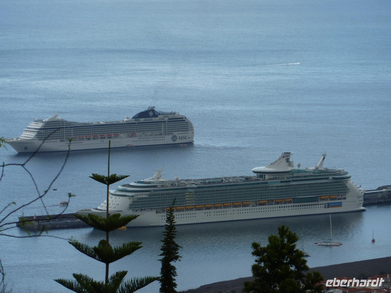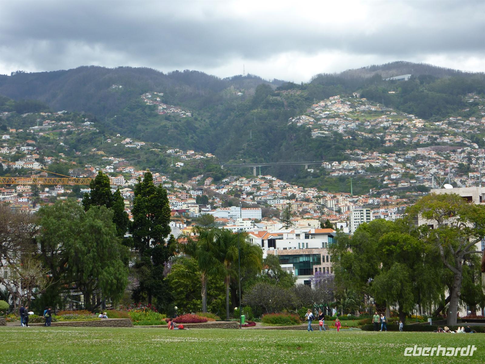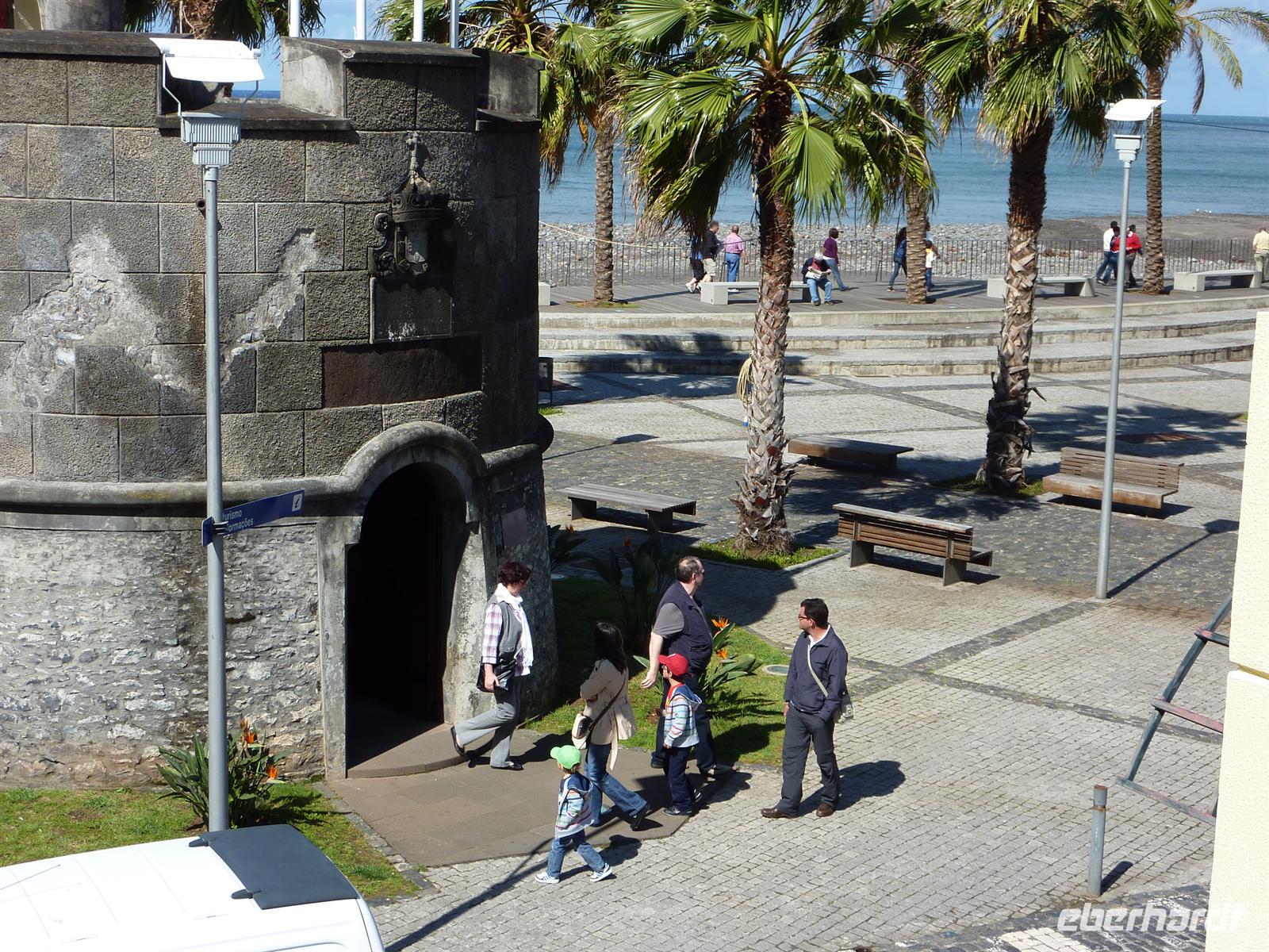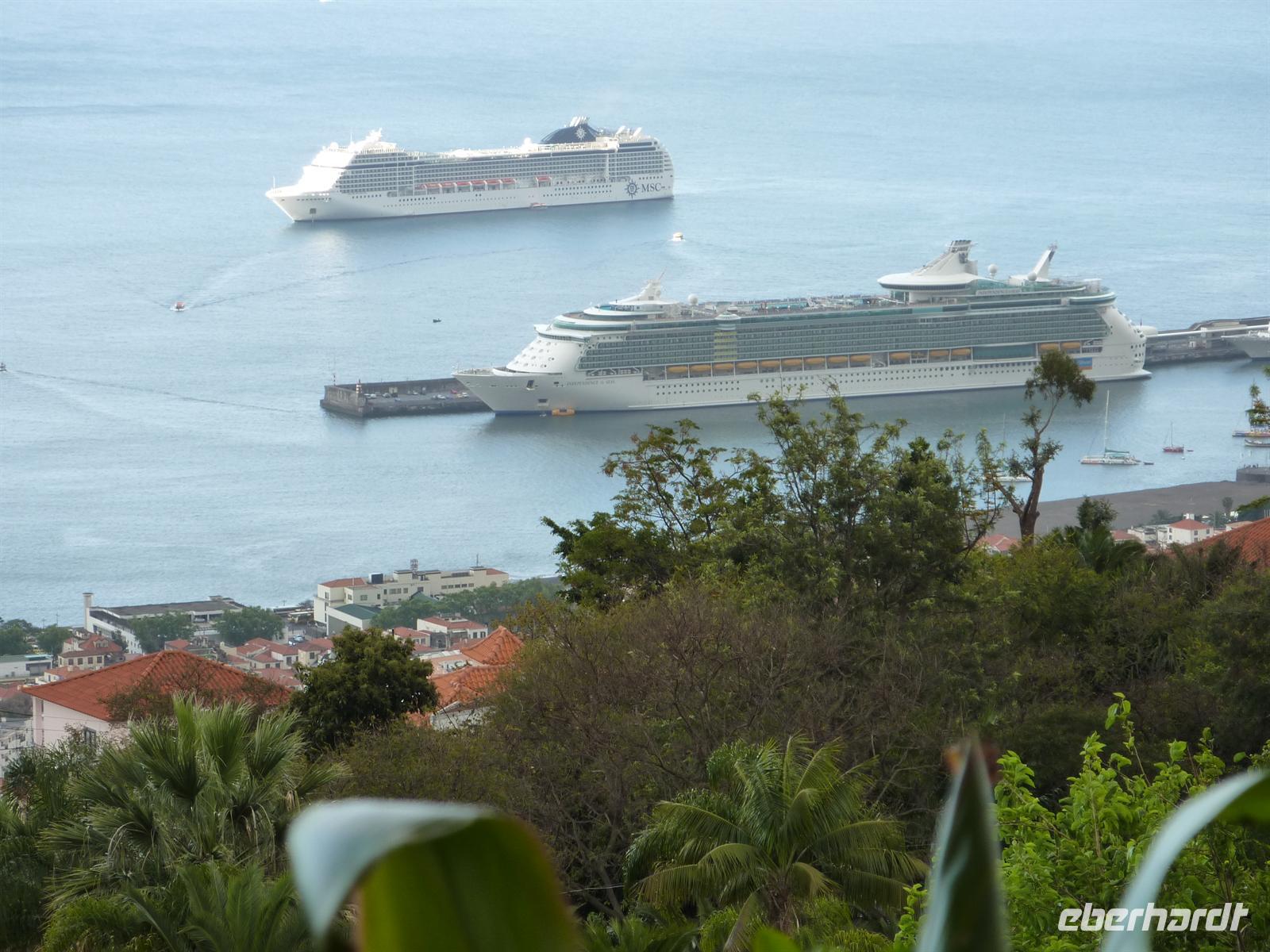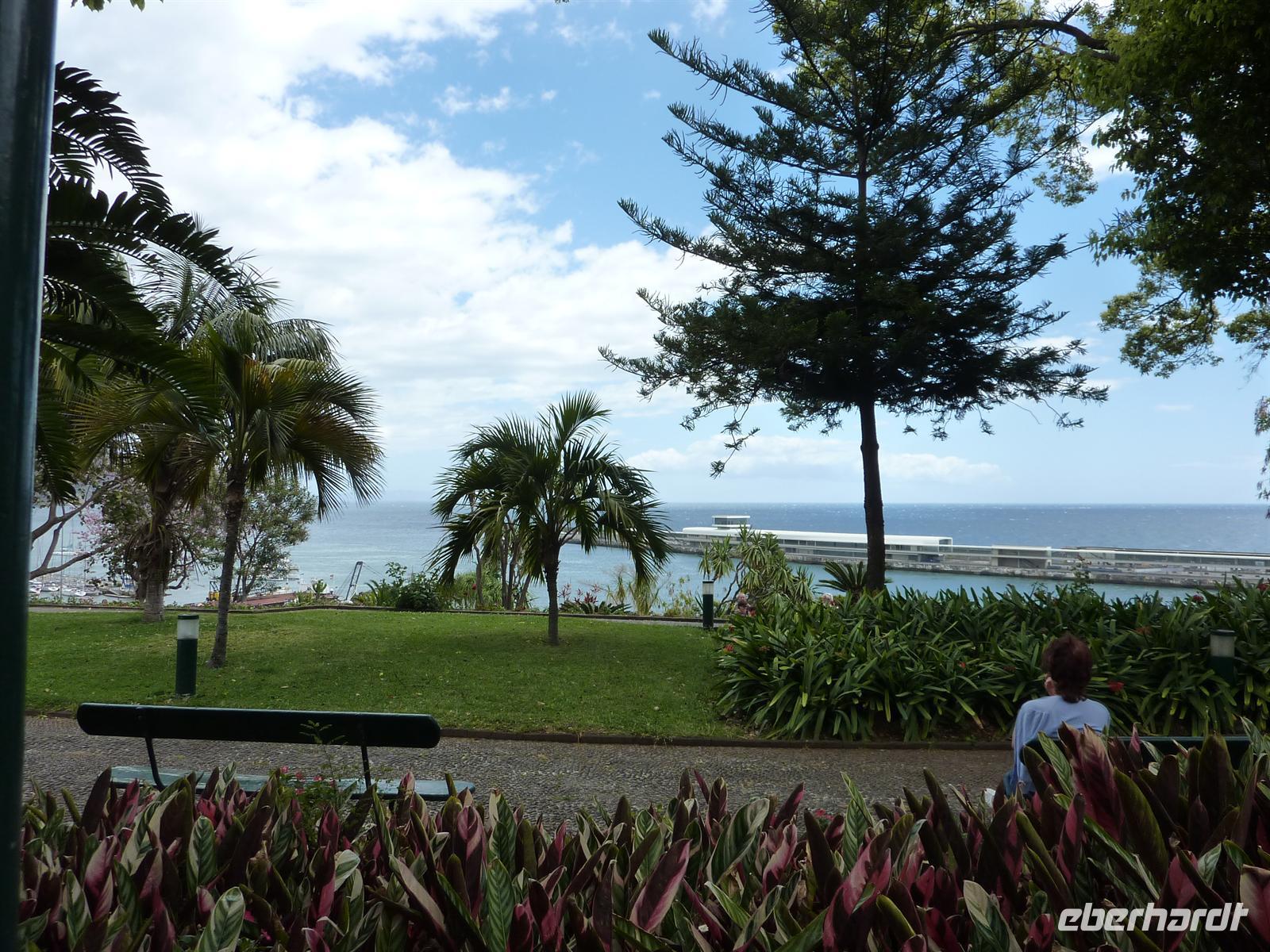 Heute heißt es: „Herzlich Willkommen in der Hauptstadt Madeiras - Funchal. Auch heute wurden wir nach unserem Frühstück von Helena und Joao abgeholt. Unser Fahrer chauffierte uns zu dem jardim botaniquo - Botanischen Garten. Leider spielte Petrus heute nicht ganz mit. Wir bestaunten die zahlreichen Pflanzen und die tolle Aussicht auf Funchal bei vereinzelten Regenschauern. Helena führte uns durch diesen prächtigen Garten, hoch oben über den Dächern Funchals. Von hier konnten wir auch gut den Hafen mit den drei großen Kreuzfahrtschiffen sehen. Im Anschluss wartete auch schon ein besonderes Spektakel auf uns - die Markthalle. Aufgrund der zahlreichen Schiffe und der vor uns liegenden Osterfeiertage, war die Markthalle sehr gut besucht. Helena zeigte uns Ihre einheimischen Früchte. Neben dem überwältigendem Obst und Gemüsesortiment, wartete auch noch die Fischhalle auf uns. Neben dem Geruch ist es ein überwältigendes Ereignis, das Treiben der Schlachter zu beobachten. Hier haben wir ihn nun endlich auch gesehen. Gegessen haben wir ihn schon des Öfteren, doch jetzt liegt er vor uns, der Schwarze Degenfisch. Er ist nicht schön anzusehen, aber dennoch lecker! ;o) Von der Markthalle wurden wir von Joao abgeholt und zu unserem Weingut gefahren. Hier wartete eine Verkostung des landestypischen Madeira-Wein auf uns. Wir probierten 3 Sorten, von trocken bis süß und genossen zuerst salzige Häppchen und zum Schluss den legendären Bolo de mel. Ein süßer Honigkuchen, welcher wie ein Pfefferkuchen schmeckt. Nach der Verkostung nutzten wir die Gelegenheit für den Kauf des leckeren, nationalen Getränkes und folgten Helena durch diese schöne Stadt. Sie zeigte uns den Marktplatz mit Rathaus und Parlament. Wie spazierten über die Promenade zum Hafen, über die auch der Entdecker Zarco Funchal entdeckte.