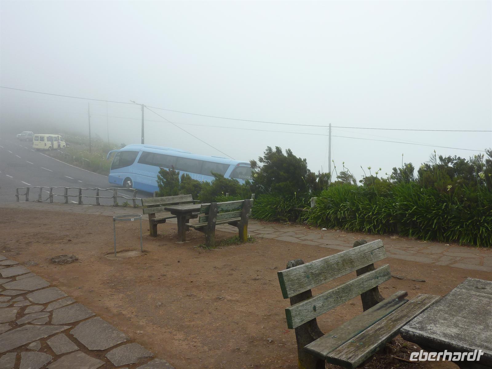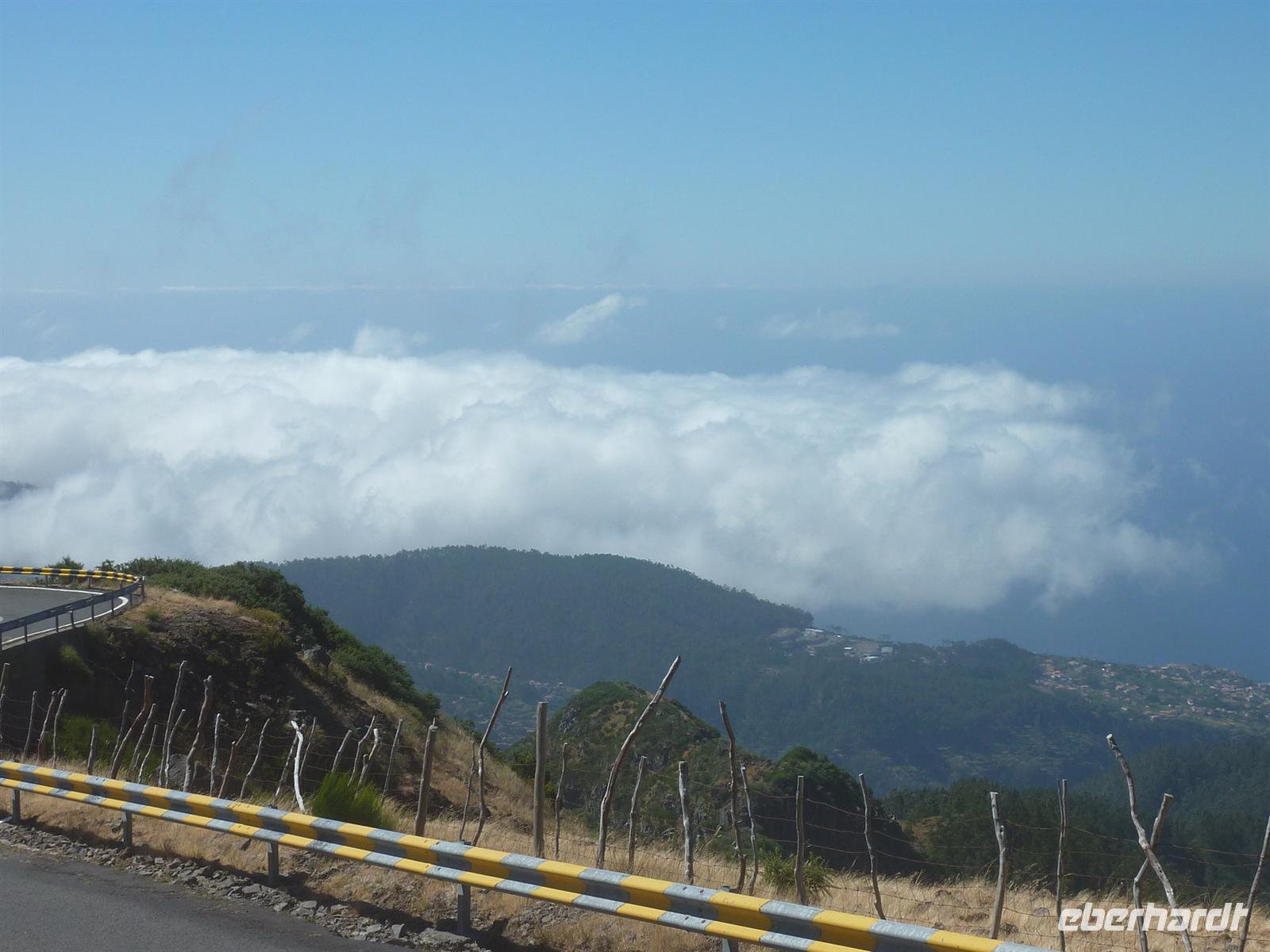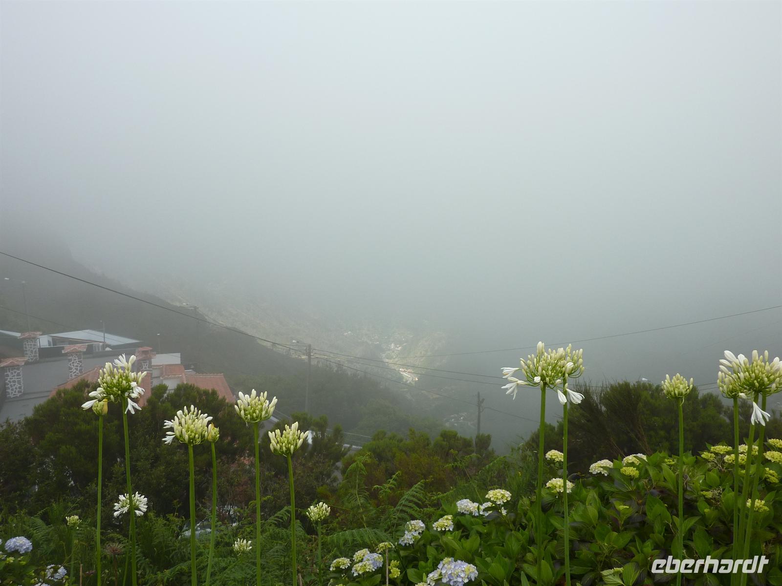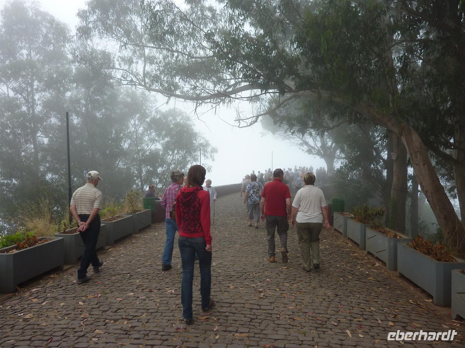 Anschließend verlassen wir Camacha und „nehmen Kurs“ auf die bergigen Höhen von Madeira. Unser Ziel ist der Pico do Arieiro, mit seinen 1818 Metern der dritthöchste Gipfel der Insel. Nach kurvenreicher Auffahrt durch wolkenverhangene Landschaften, werden wir am Gipfel von strahlendem Sonnenschein, blauem Himmel und einem Wolkenmeer wie aus Watte empfangen. Hier und da strecken die Gipfel ihre Köpfe aus den Wolken. Wir sind beeindruckt von diesem Naturschauspiel und genießen die wohltuende Stille, die uns umgibt. Nachdem wir unsere Eindrücke auch im Bild festgehalten haben, bringt uns unser Bus wieder talwärts. Nach nur wenigen Minuten erreichen wir die kleine Ortschaft Ribeiro Frio, die für ihre Forellenzucht bekannt ist. Nach einem Spaziergang durch die Forellenzuchtanlage lädt uns Paula zu einer kleinen Levada-Wanderung ein. Levadas sind Madeiras Bewässerungskanäle, die sich mit einer Gesamtlänge von über 2000 km wie ein Netz über die Insel ziehen und neben ihrer landwirtschaftlichen Nutzung zugleich interessante Wanderwege sind. Leider ist das Wetter recht trübe und vom Aussichtspunkt Balcoes (860 m), bleibt uns durch den herrschenden Nebel jeglicher Blick in die Ferne bzw. Tiefe versagt.