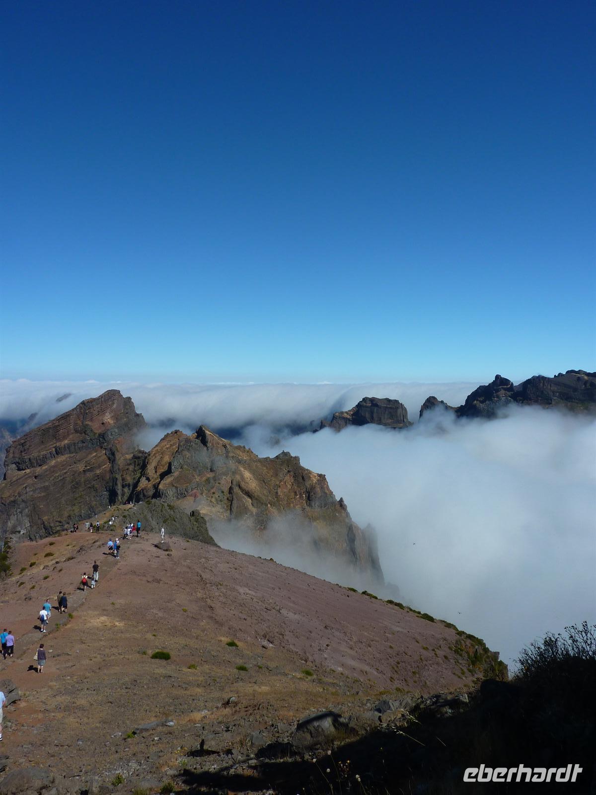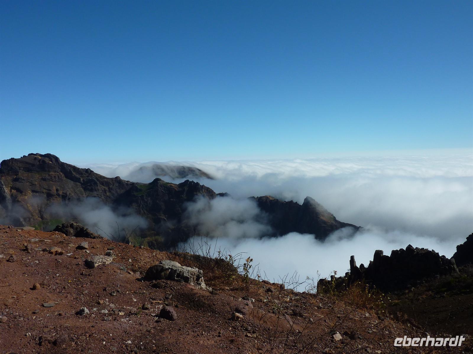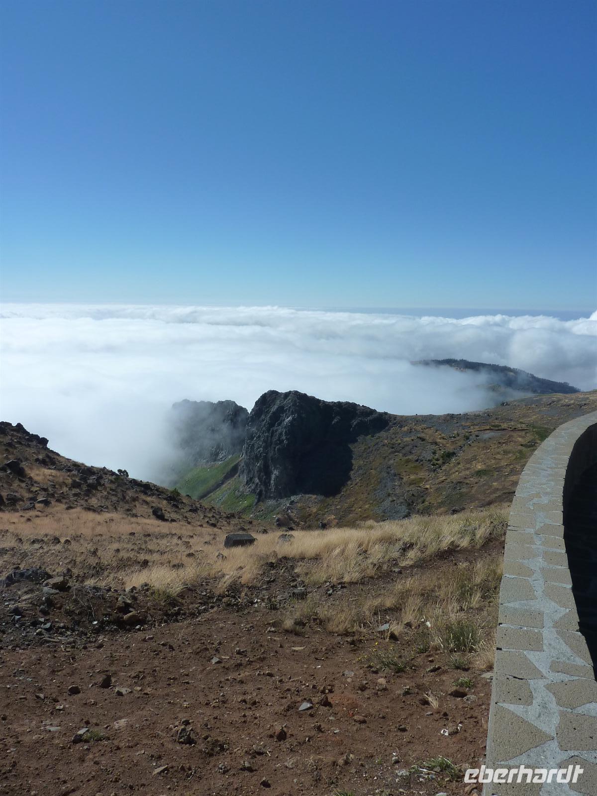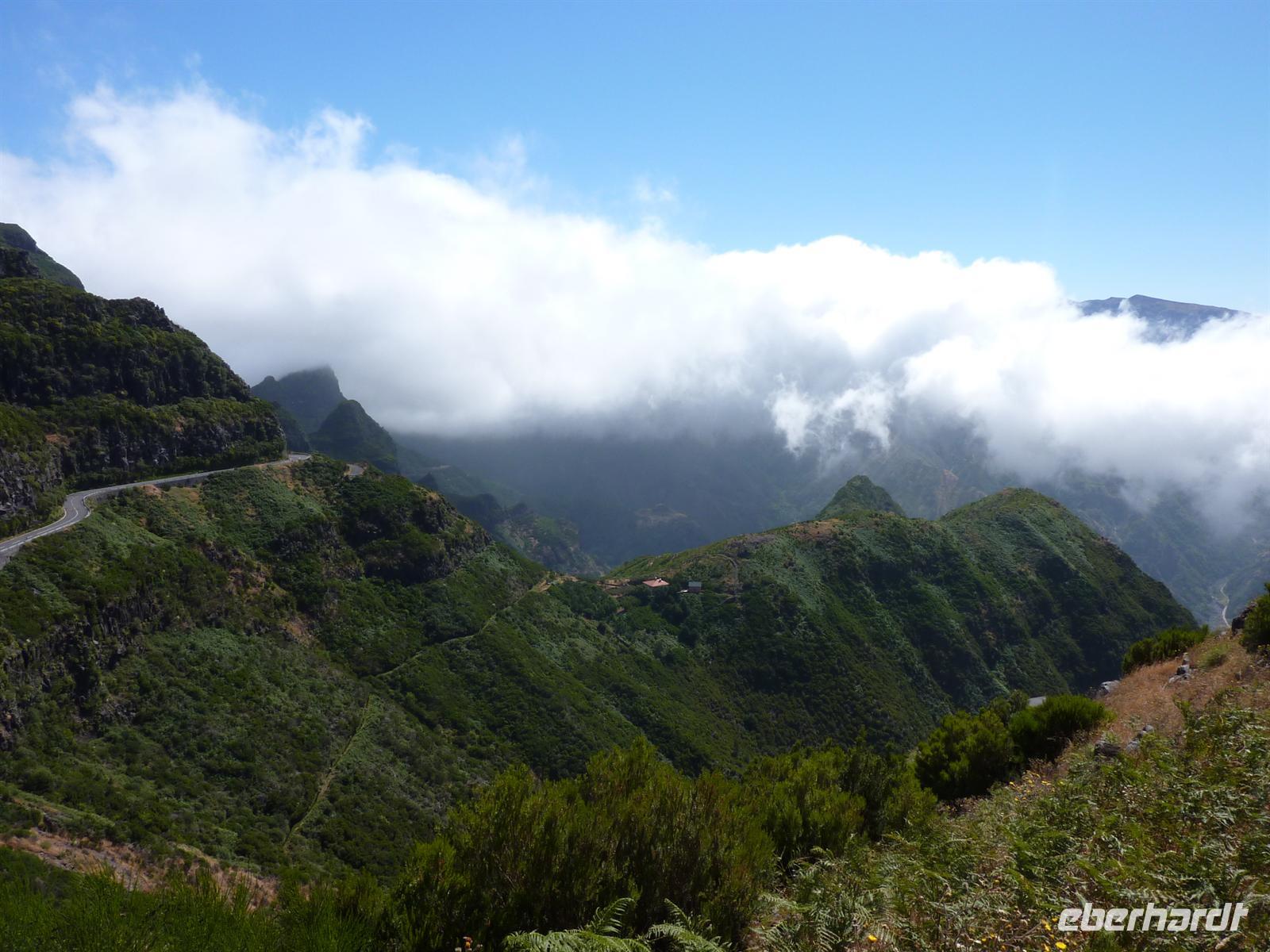 Anschließend verlassen wir Camacha und „nehmen Kurs“ auf die bergigen Höhen von Madeira. Unser Ziel ist der Pico do Arieiro, mit seinen 1818 Metern der dritthöchste Gipfel der Insel. Nach kurvenreicher Auffahrt durch wolkenverhangene Landschaften, werden wir am Gipfel von strahlendem Sonnenschein, blauem Himmel und einem Wolkenmeer wie aus Watte empfangen. Hier und da strecken die Gipfel ihre Köpfe aus den Wolken. Wir sind beeindruckt von diesem Naturschauspiel und genießen die wohltuende Stille, die uns umgibt. Nachdem wir unsere Eindrücke auch im Bild festgehalten haben, bringt uns unser Bus wieder talwärts. Nach nur wenigen Minuten erreichen wir die kleine Ortschaft Ribeiro Frio, die für ihre Forellenzucht bekannt ist. Nach einem Spaziergang durch die Forellenzuchtanlage lädt uns Paula zu einer kleinen Levada-Wanderung ein. Levadas sind Madeiras Bewässerungskanäle, die sich mit einer Gesamtlänge von über 2000 km wie ein Netz über die Insel ziehen und neben ihrer landwirtschaftlichen Nutzung zugleich interessante Wanderwege sind. Leider ist das Wetter recht trübe und vom Aussichtspunkt Balcoes (860 m), bleibt uns durch den herrschenden Nebel jeglicher Blick in die Ferne bzw. Tiefe versagt.