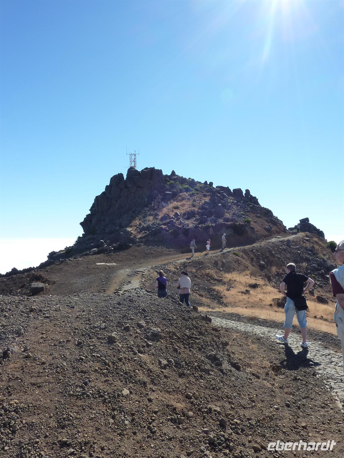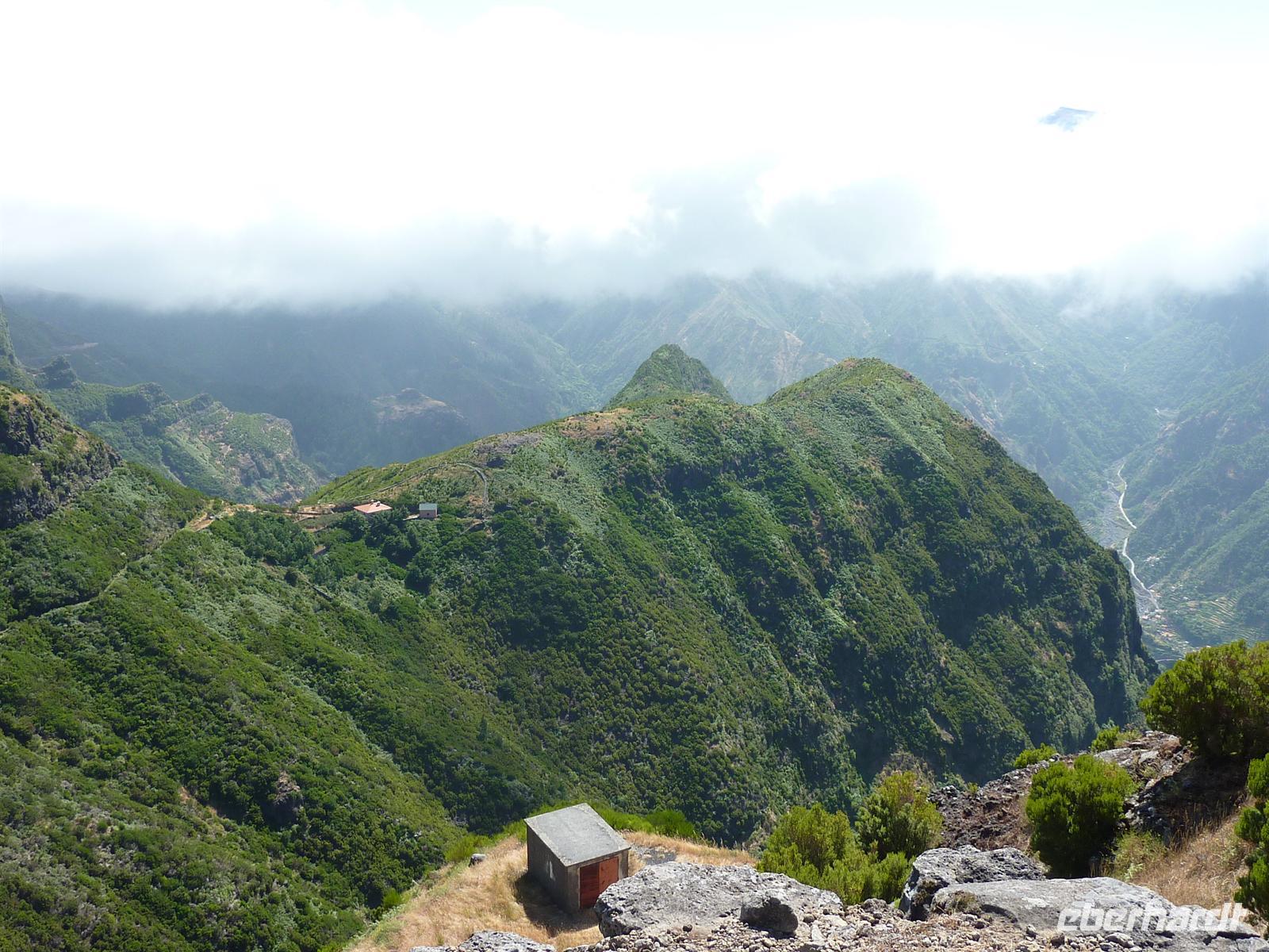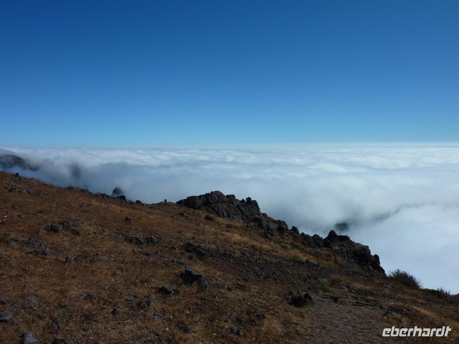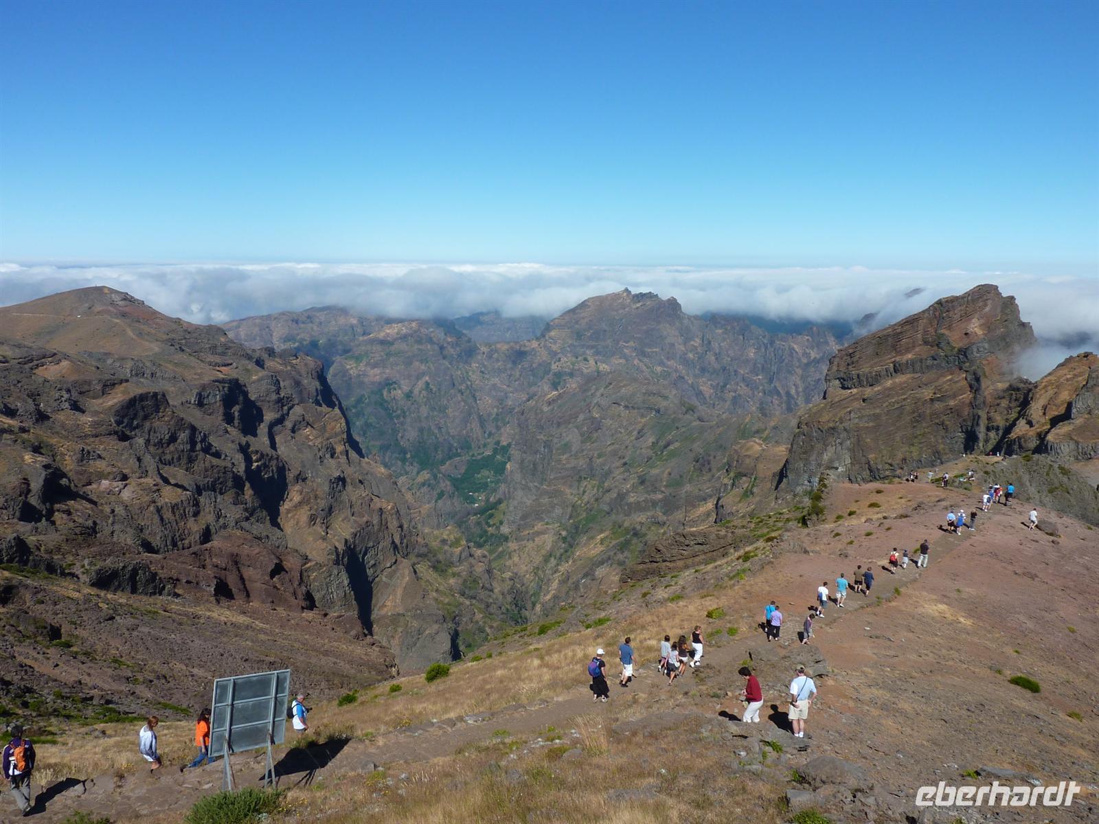 Anschließend verlassen wir Camacha und „nehmen Kurs“ auf die bergigen Höhen von Madeira. Unser Ziel ist der Pico do Arieiro, mit seinen 1818 Metern der dritthöchste Gipfel der Insel. Nach kurvenreicher Auffahrt durch wolkenverhangene Landschaften, werden wir am Gipfel von strahlendem Sonnenschein, blauem Himmel und einem Wolkenmeer wie aus Watte empfangen. Hier und da strecken die Gipfel ihre Köpfe aus den Wolken. Wir sind beeindruckt von diesem Naturschauspiel und genießen die wohltuende Stille, die uns umgibt. Nachdem wir unsere Eindrücke auch im Bild festgehalten haben, bringt uns unser Bus wieder talwärts. Nach nur wenigen Minuten erreichen wir die kleine Ortschaft Ribeiro Frio, die für ihre Forellenzucht bekannt ist. Nach einem Spaziergang durch die Forellenzuchtanlage lädt uns Paula zu einer kleinen Levada-Wanderung ein. Levadas sind Madeiras Bewässerungskanäle, die sich mit einer Gesamtlänge von über 2000 km wie ein Netz über die Insel ziehen und neben ihrer landwirtschaftlichen Nutzung zugleich interessante Wanderwege sind. Leider ist das Wetter recht trübe und vom Aussichtspunkt Balcoes (860 m), bleibt uns durch den herrschenden Nebel jeglicher Blick in die Ferne bzw. Tiefe versagt.