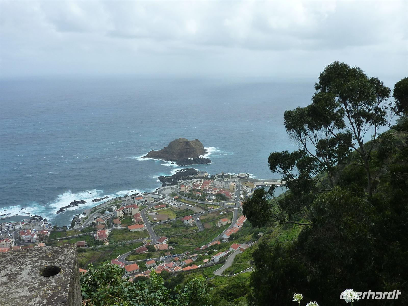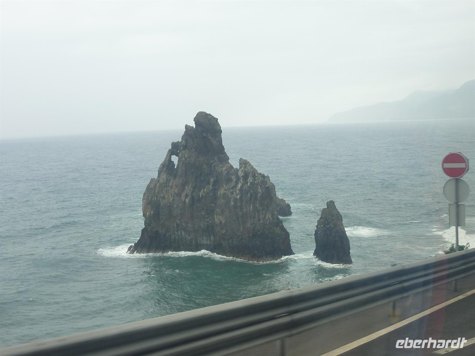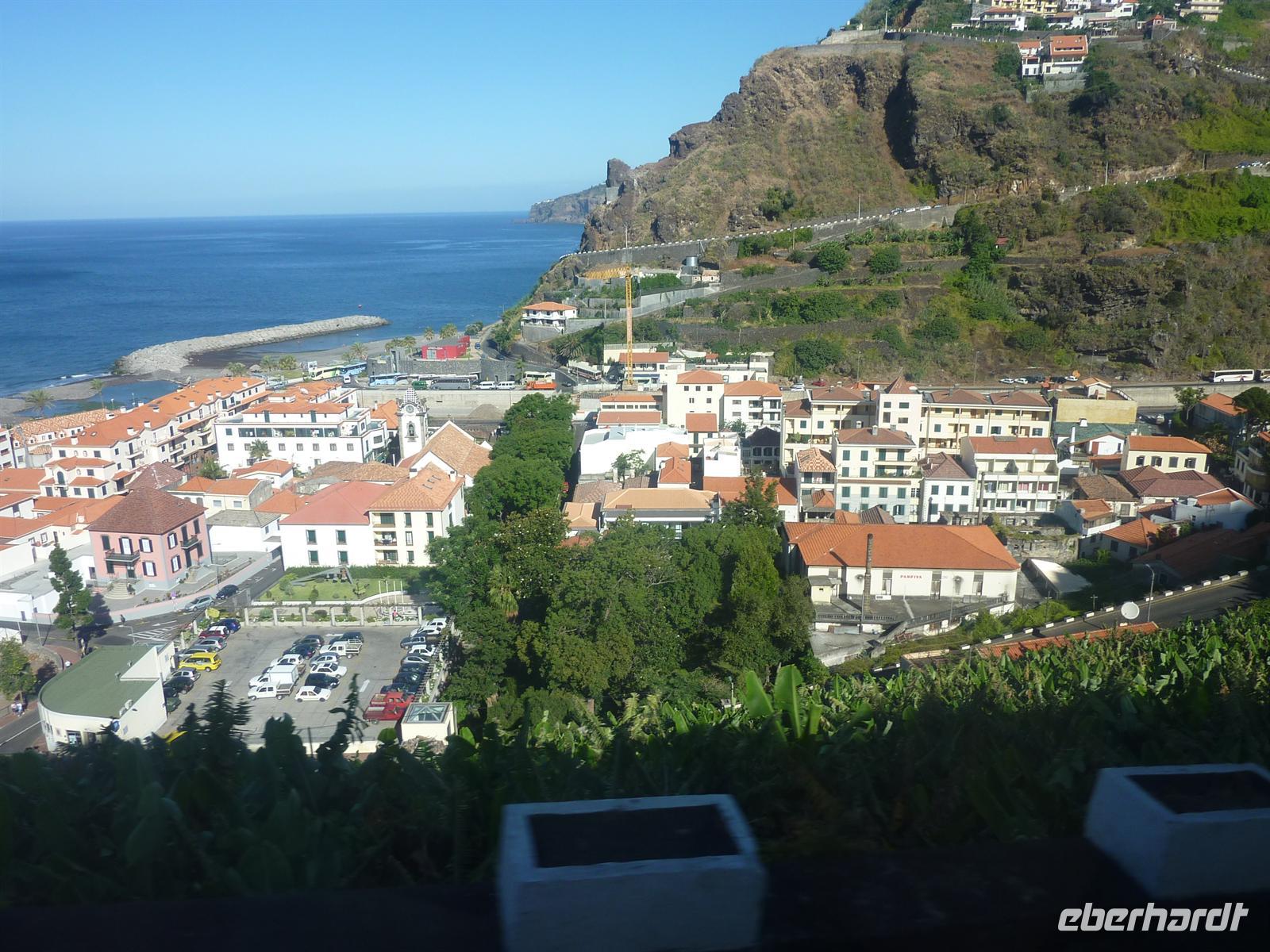 Wir lassen die Nebel hinter uns und setzen unsere Fahrt in Richtung Westen fort. In nur wenigen Minuten erreichen wir den Küstenort Ribeira Brava, an der Mündung des „Wilden Flusses“ gelegen. Die Sonne meint es wieder gut mit uns und wir haben Zeit zum Bummeln, Schauen, Kaffeetrinken und so mancher genießt mit verträumtem Blick die Weite des Meeres. Nach diesem Stop bringt uns unser Bus auf kurvenreicher Straße nun ins Landesinnere - Ziel ist der Pass Boca da Encumeada (1007 m hoch gelegen). Das Wetter hat mittlerweile wieder eine Änderung erfahren und am Pass werden wir stürmisch empfangen - Nebel, empfindlich kühle Temperaturen und ein kräftiger Wind begrüßen uns. Unbeeindruckt dieser Wetterkapriolen verlassen wir den Bus und versuchen wenigstens ein Stückchen des angekündigten grandiosen Ausblicks auf die Nord- und Südküste Madeiras einzufangen. Aber vergebens ! Ein wenig enttäuscht steigen wir wieder in den Bus und es geht über die Hochebene Paul da Serra (1500 m) weiter nach Nordwesten, nach Porto Moniz. Der charmante Küstenort hält für seine Besucher einige Attraktionen bereit, so dass wir hier eine größere Pause einlegen. Die meisten Gäste haben sich zunächst für ein gemeinsames Mittagessen im Restaurant „O Butio“ entschieden, welches Paula den Gästen fakultativ angeboten hat. Nach dem sehr leckeren Essen haben wir noch genügend Zeit für einen Bummel durch den Ort, ein Bad in der Meeresbeckenanlage oder einen Besuch im Aquarium in der Festung Sao Joao.