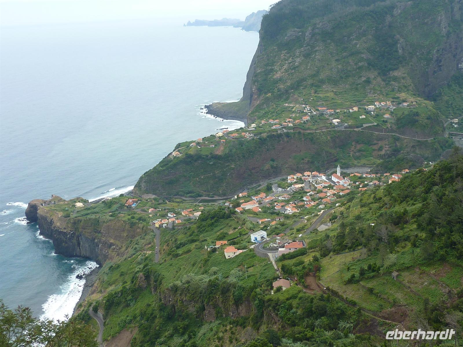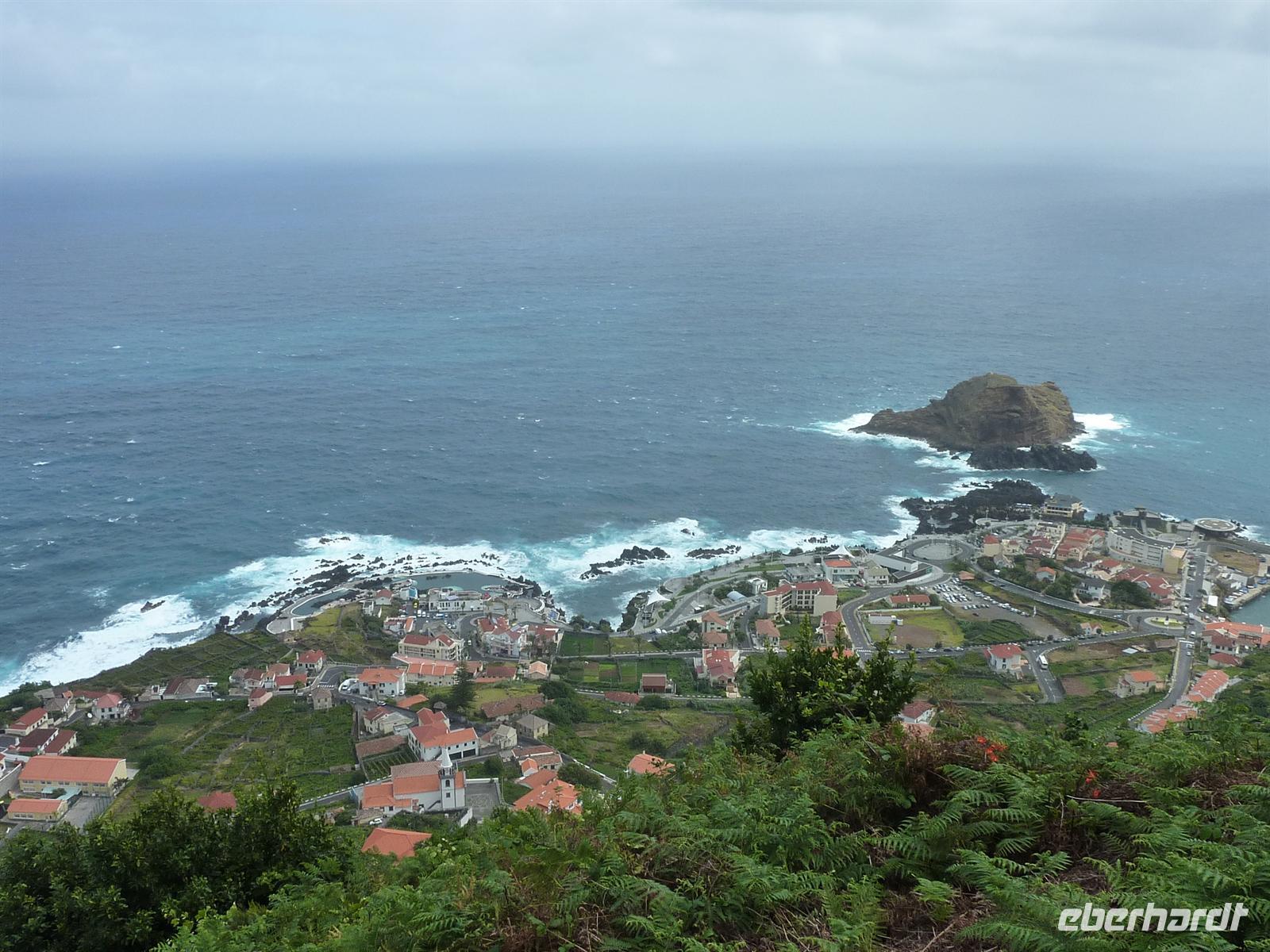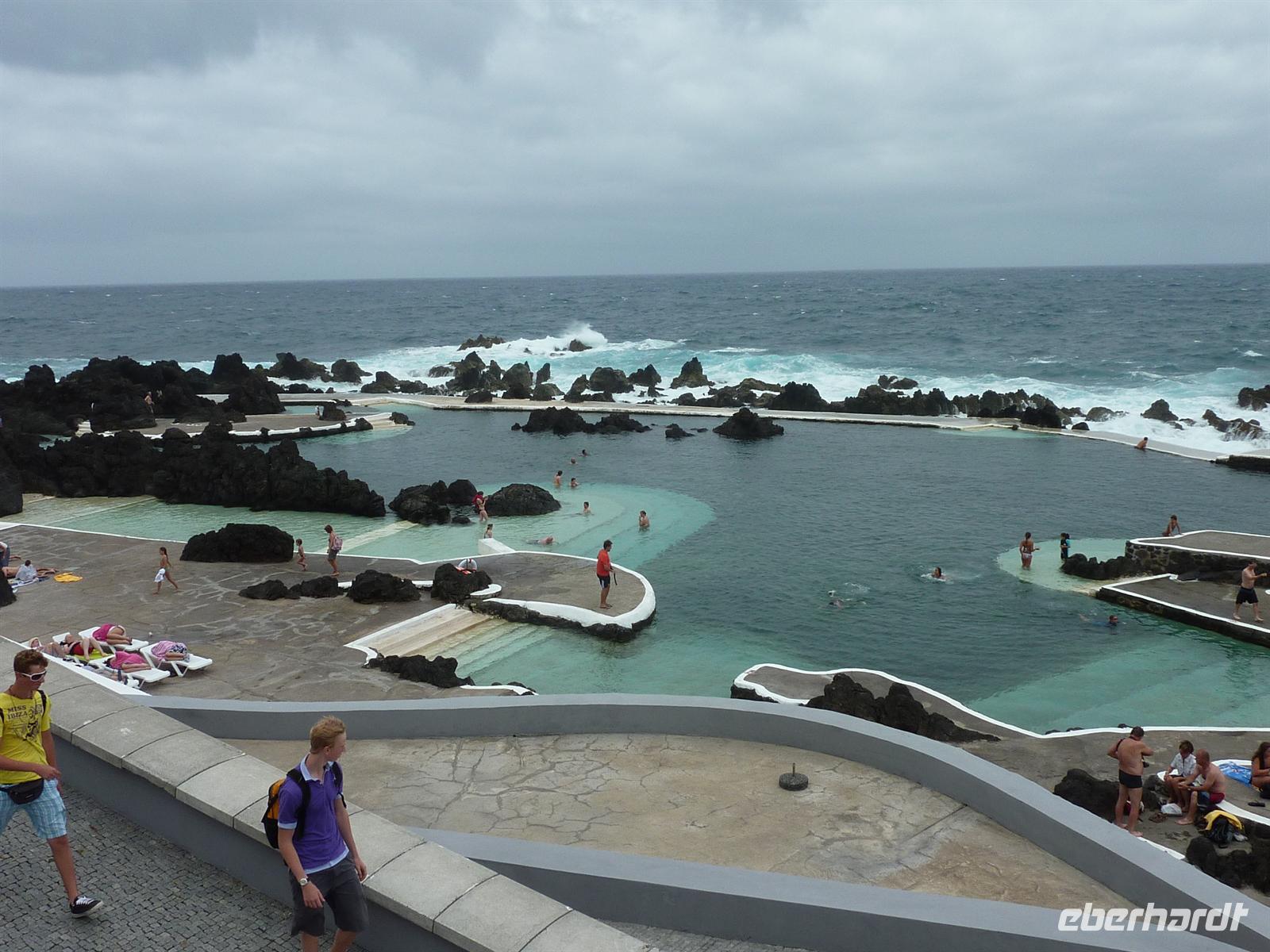 Wir lassen die Nebel hinter uns und setzen unsere Fahrt in Richtung Westen fort. In nur wenigen Minuten erreichen wir den Küstenort Ribeira Brava, an der Mündung des „Wilden Flusses“ gelegen. Die Sonne meint es wieder gut mit uns und wir haben Zeit zum Bummeln, Schauen, Kaffeetrinken und so mancher genießt mit verträumtem Blick die Weite des Meeres. Nach diesem Stop bringt uns unser Bus auf kurvenreicher Straße nun ins Landesinnere - Ziel ist der Pass Boca da Encumeada (1007 m hoch gelegen). Das Wetter hat mittlerweile wieder eine Änderung erfahren und am Pass werden wir stürmisch empfangen - Nebel, empfindlich kühle Temperaturen und ein kräftiger Wind begrüßen uns. Unbeeindruckt dieser Wetterkapriolen verlassen wir den Bus und versuchen wenigstens ein Stückchen des angekündigten grandiosen Ausblicks auf die Nord- und Südküste Madeiras einzufangen. Aber vergebens ! Ein wenig enttäuscht steigen wir wieder in den Bus und es geht über die Hochebene Paul da Serra (1500 m) weiter nach Nordwesten, nach Porto Moniz. Der charmante Küstenort hält für seine Besucher einige Attraktionen bereit, so dass wir hier eine größere Pause einlegen. Die meisten Gäste haben sich zunächst für ein gemeinsames Mittagessen im Restaurant „O Butio“ entschieden, welches Paula den Gästen fakultativ angeboten hat. Nach dem sehr leckeren Essen haben wir noch genügend Zeit für einen Bummel durch den Ort, ein Bad in der Meeresbeckenanlage oder einen Besuch im Aquarium in der Festung Sao Joao.
