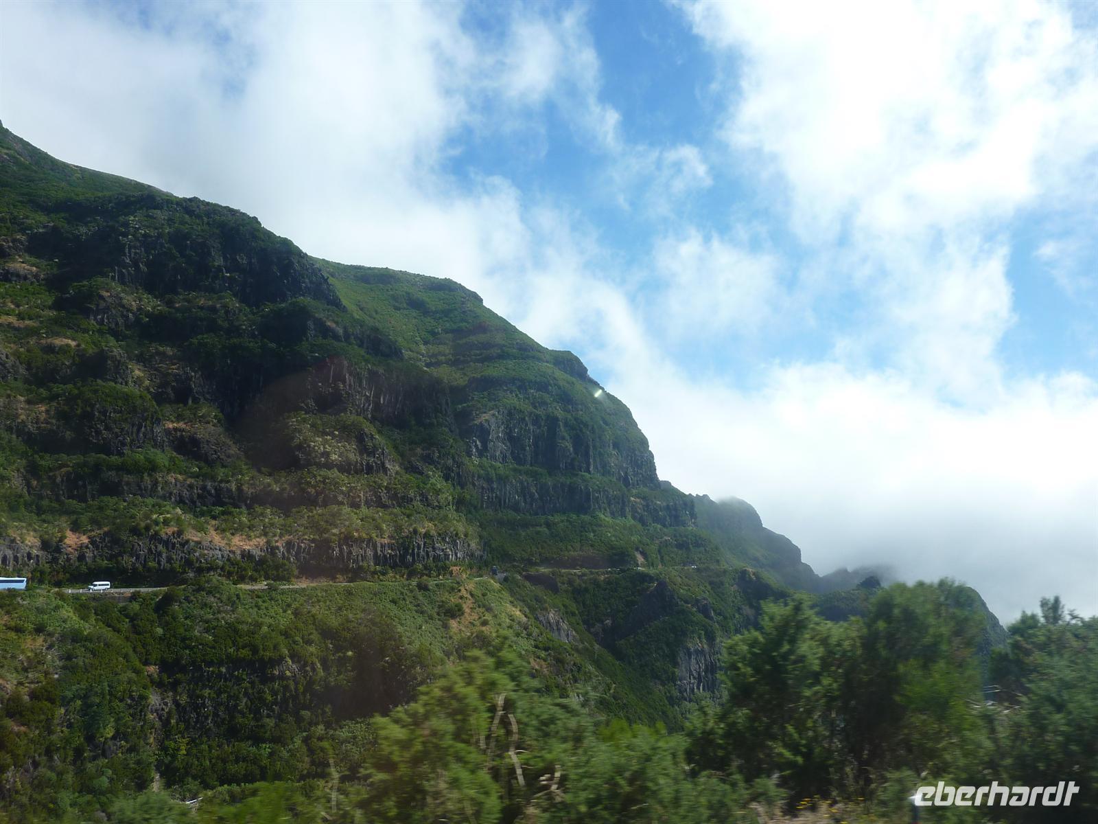 Nach einer geruhsamen Nacht erwartet uns ab 07.30 Uhr das Hotelrestaurant zum Frühstück. Ob herzhaft oder süß, für jeden Geschmack ist etwas dabei und der erste Ausflugstag kann gut gestärkt beginnen. Bei schönstem Sonnenschein erwarten uns Reiseleiterin Paula und unser Busfahrer Samuel am Hotel mit einem fröhlichen „Bom dia !“ -immer mit „alegria“ - das portugiesischen Wort für Freude - und wir starten zu unserem Ausflug in den Nordwesten der Insel. Unsere Fahrt führt uns zunächst entlang der Südküste zur zweithöchsten Steilklippe der Welt (580 m) - zum Cabo Girao. Leider bleibt uns durch den plötzlich aufgezogenen Nebel der atemberaubende Blick in die Tiefe versagt und wir können nur vereinzelt einen Blick hinunter ins Meer erhaschen.