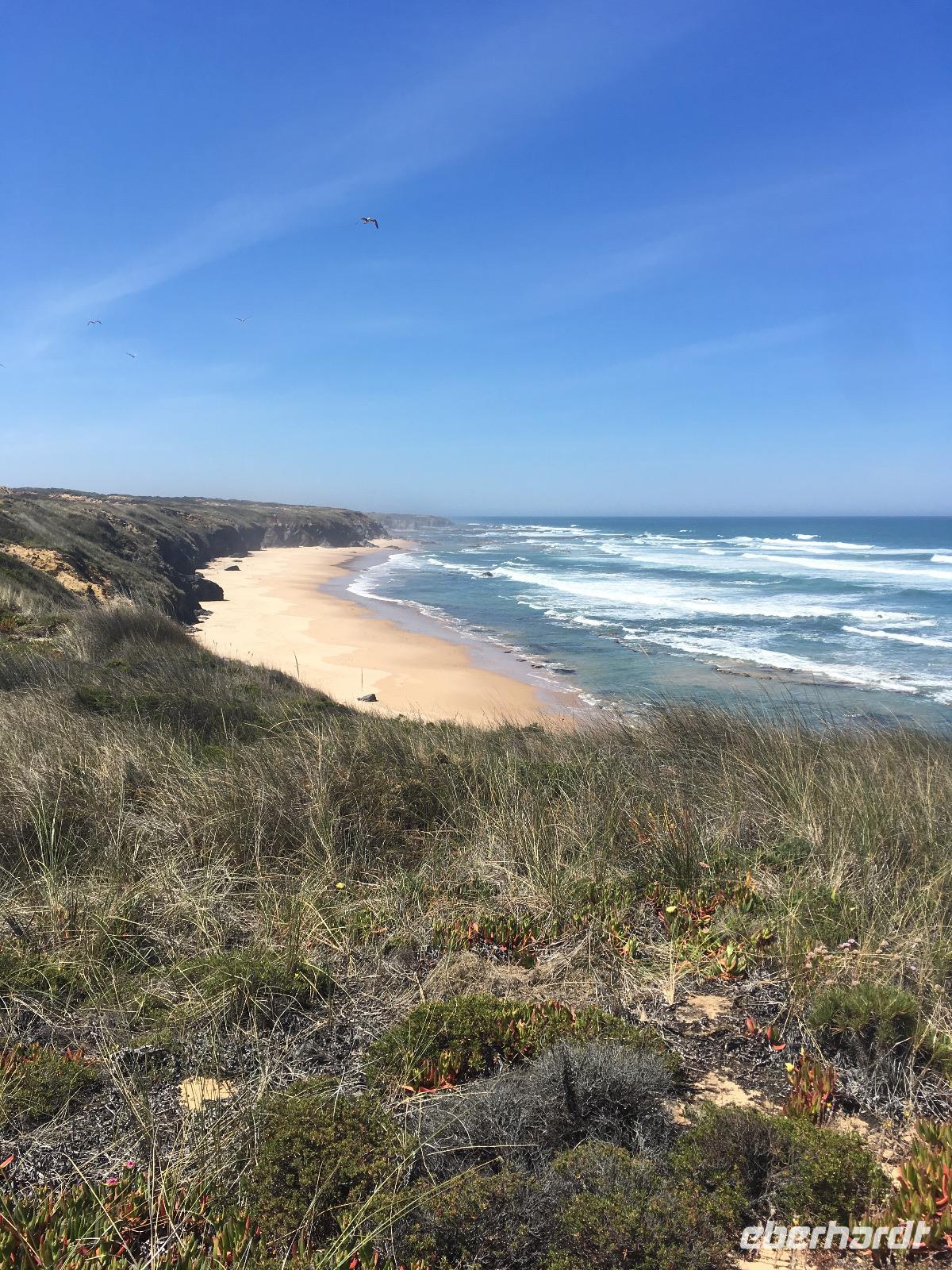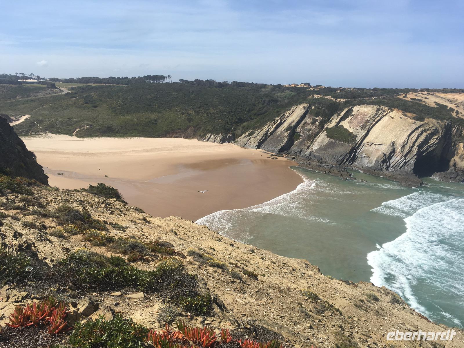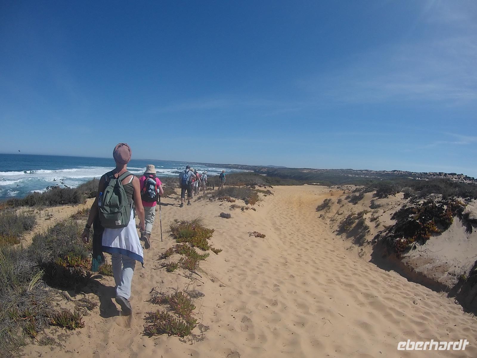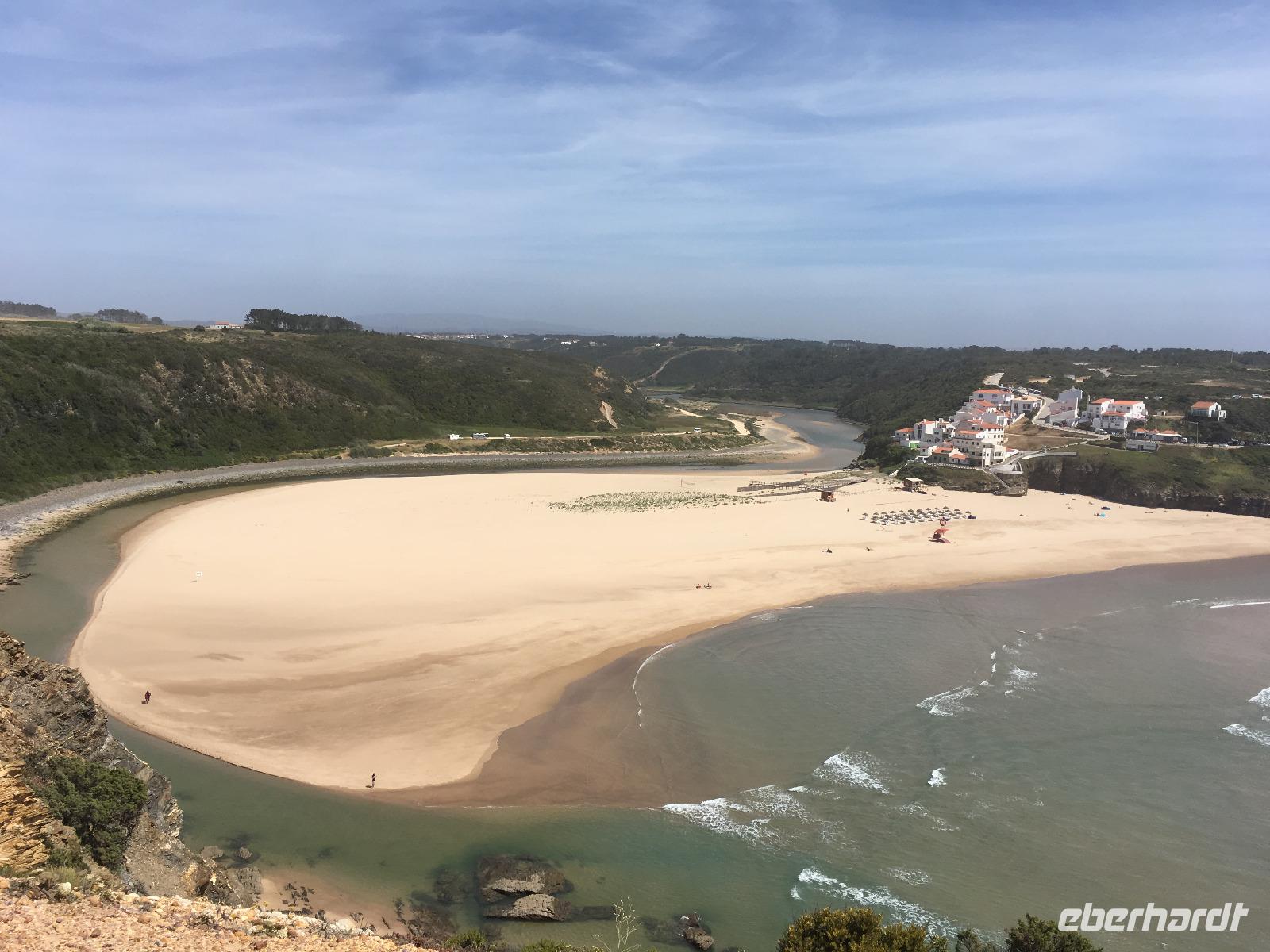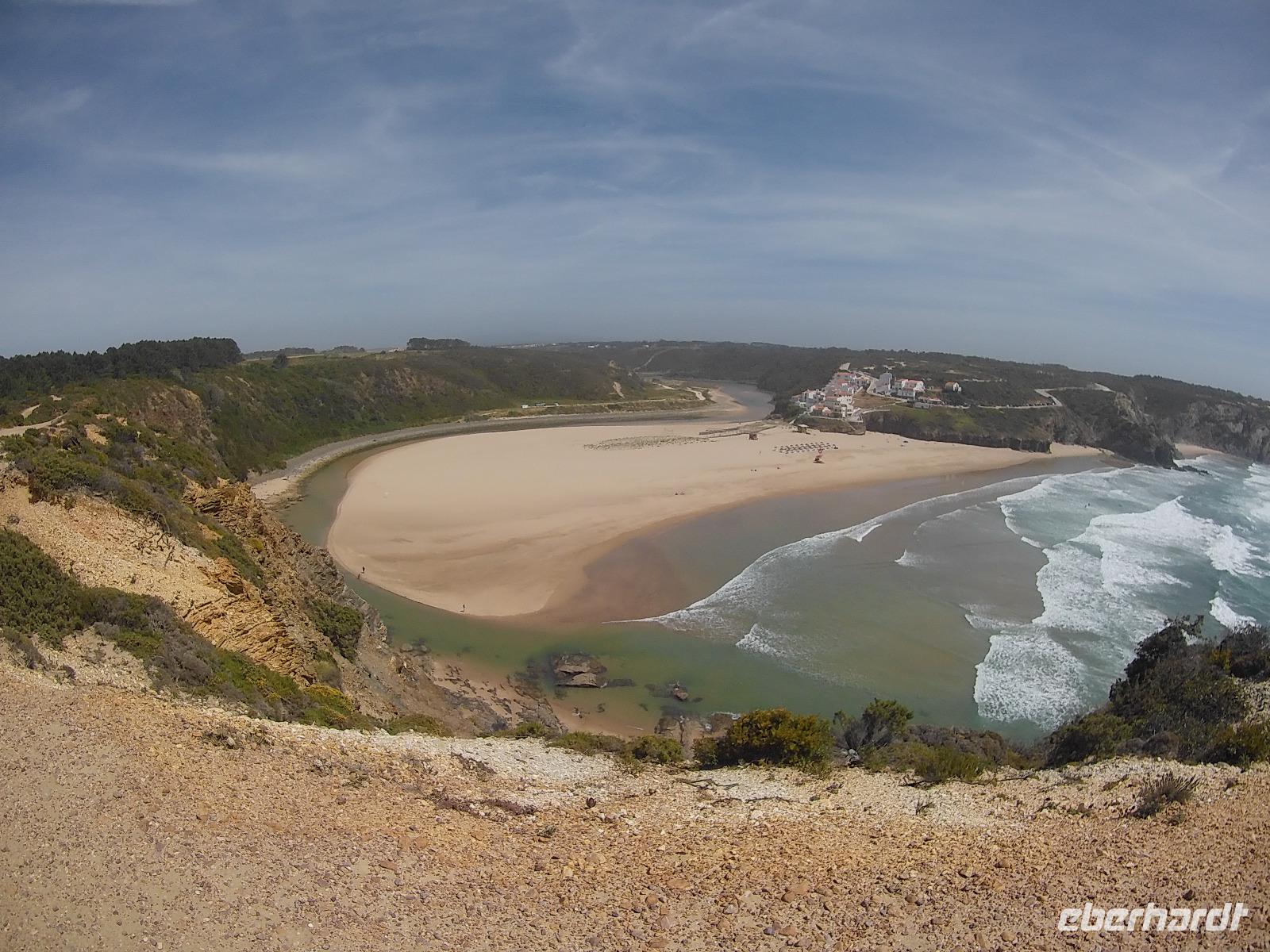 Die letzten zwölf Kilometer wollen heute von uns bezwungen werden. Wir starten von Almograve, hier waren wir bereits am Montag, jedoch geht es heute in die nördliche Richtung. Die sandigen Wege machten uns diese Wanderung gar nicht so einfach. Die Sonne vom wolkenlosen Himmel, tat auch ihr Bestes. Früher als gedacht, war unser Ziel in Sicht. Der Praia Furnas und der Rio Mira. Im kleinen Restaurant suchten wir schnell den Schatten und ließen uns kühle Getränke schmecken. Wer wollte, konnte auch die Erfrischung im Fluss suchen. Er ist einer der Flüsse mit der besten Wasserqualität in Europa. So finden hier auch viele Vögel und auch Fische ein neues Zuhause.