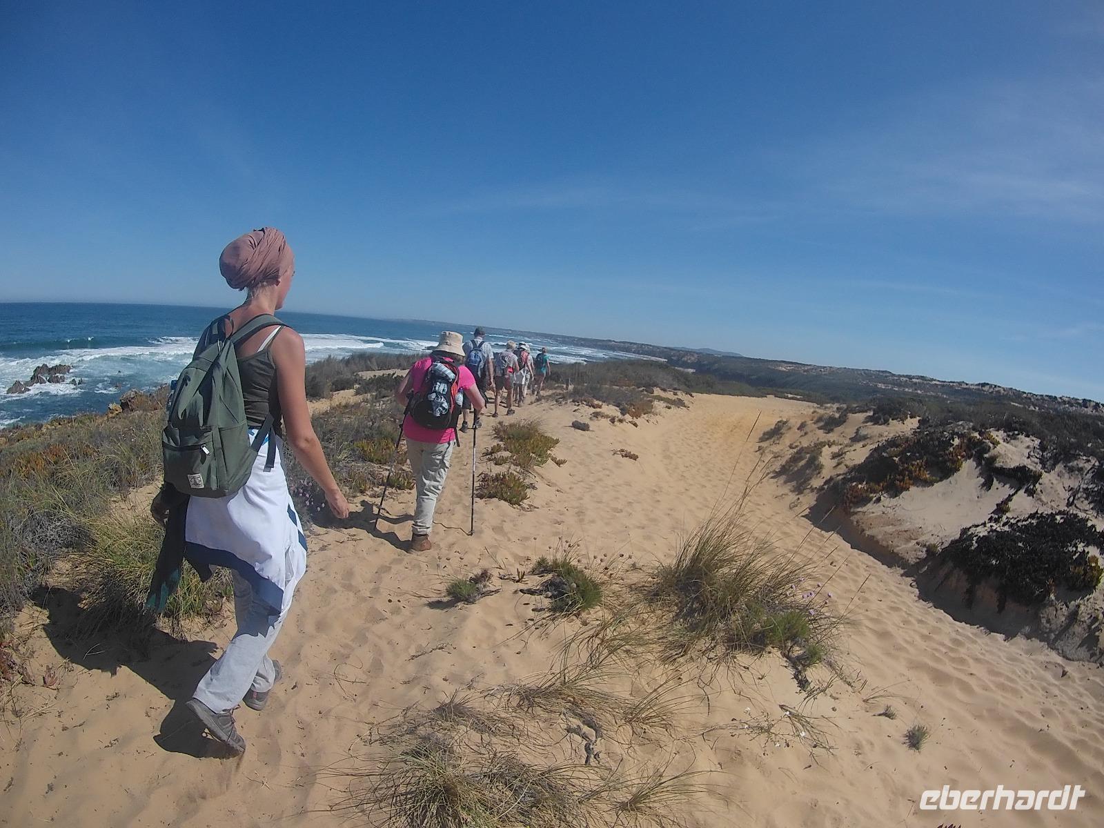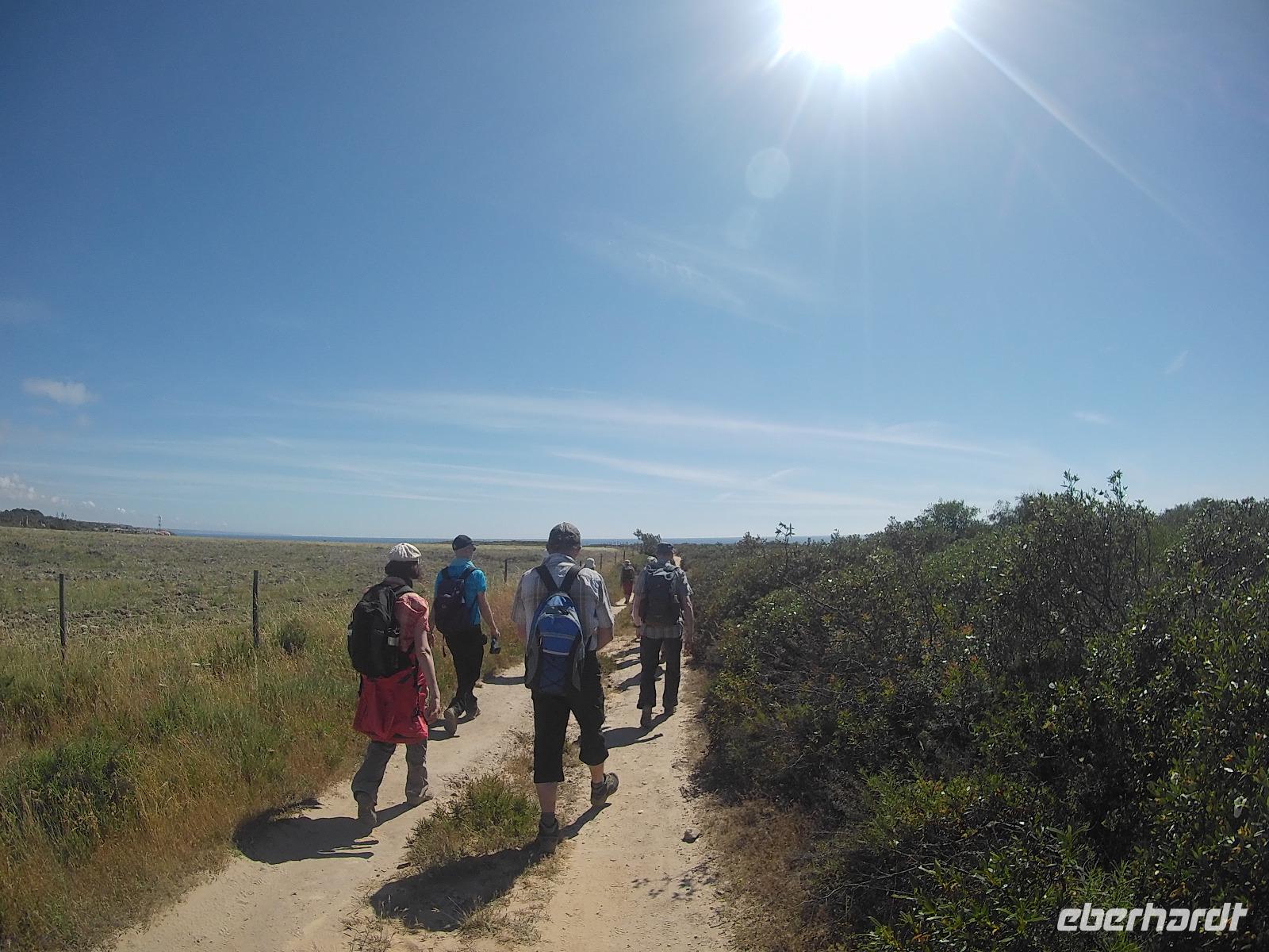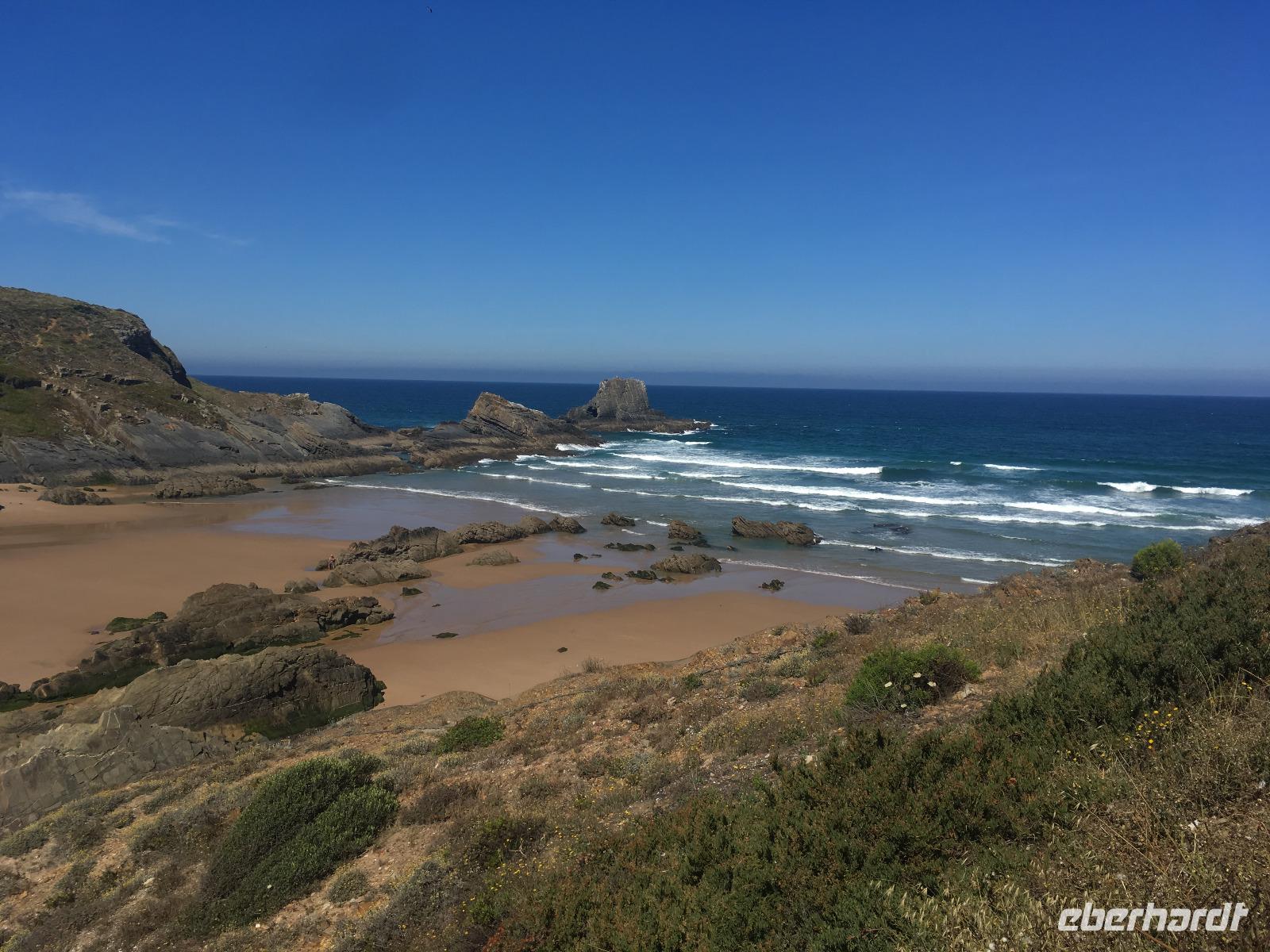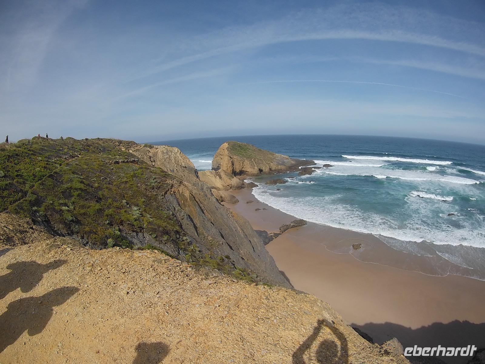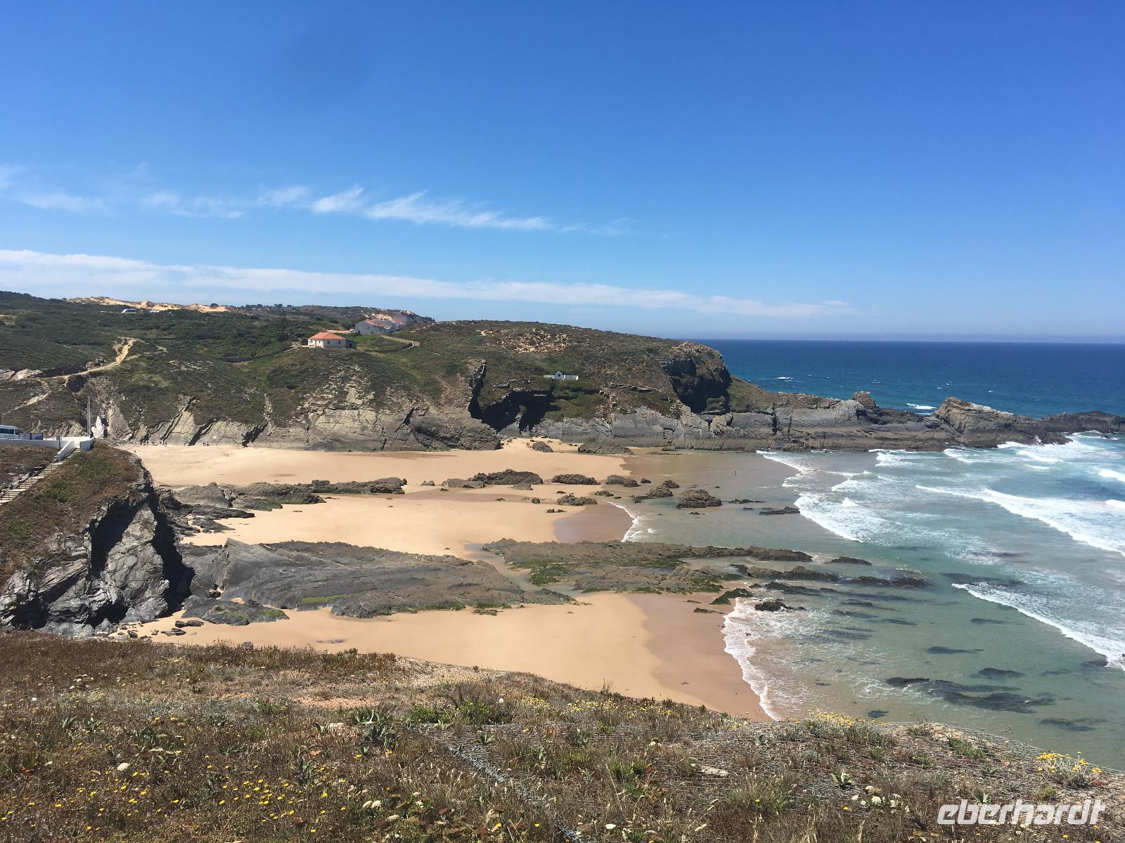Die letzten zwölf Kilometer wollen heute von uns bezwungen werden. Wir starten von Almograve, hier waren wir bereits am Montag, jedoch geht es heute in die nördliche Richtung. Die sandigen Wege machten uns diese Wanderung gar nicht so einfach. Die Sonne vom wolkenlosen Himmel, tat auch ihr Bestes. Früher als gedacht, war unser Ziel in Sicht. Der Praia Furnas und der Rio Mira. Im kleinen Restaurant suchten wir schnell den Schatten und ließen uns kühle Getränke schmecken. Wer wollte, konnte auch die Erfrischung im Fluss suchen. Er ist einer der Flüsse mit der besten Wasserqualität in Europa. So finden hier auch viele Vögel und auch Fische ein neues Zuhause.
