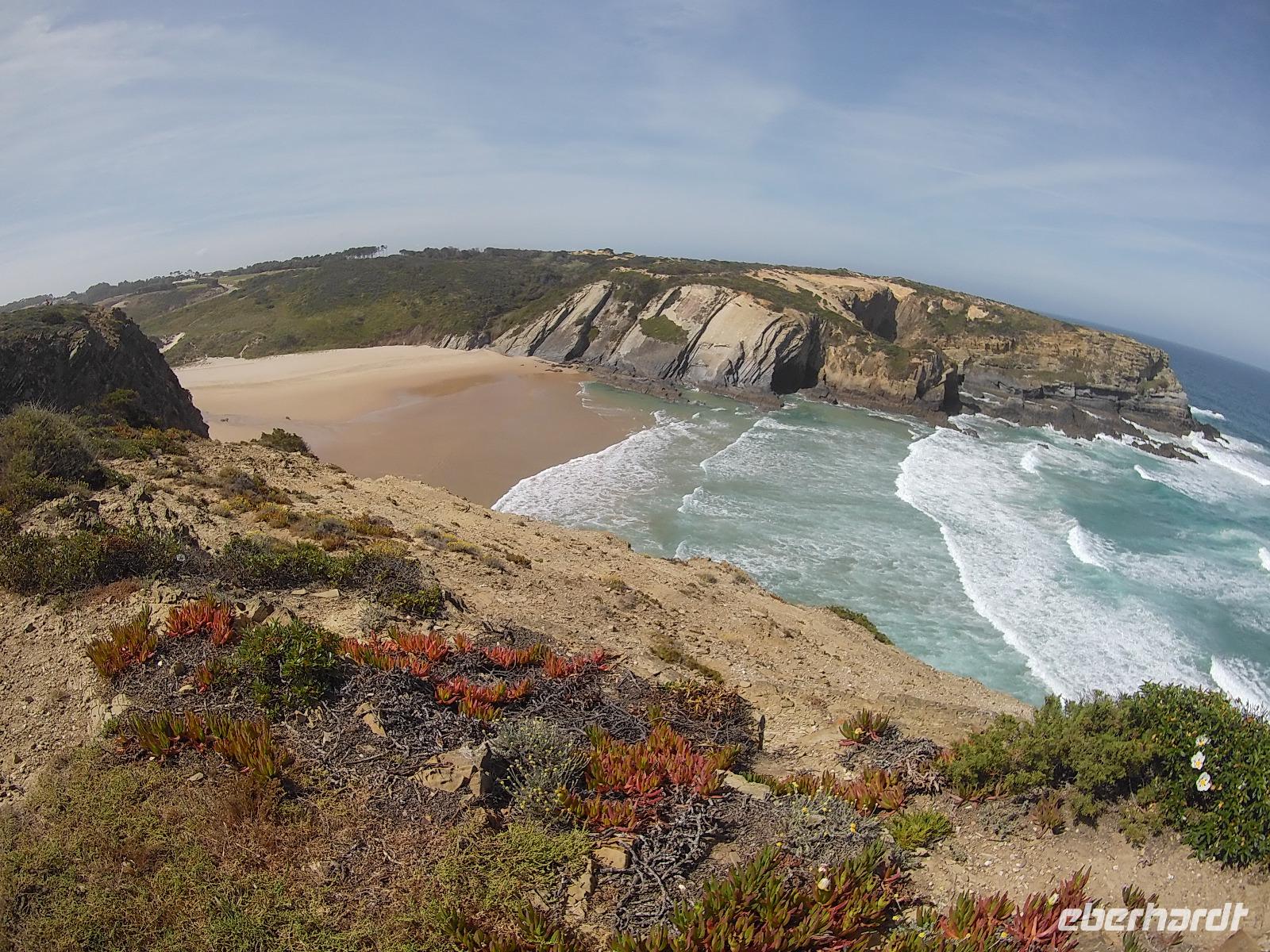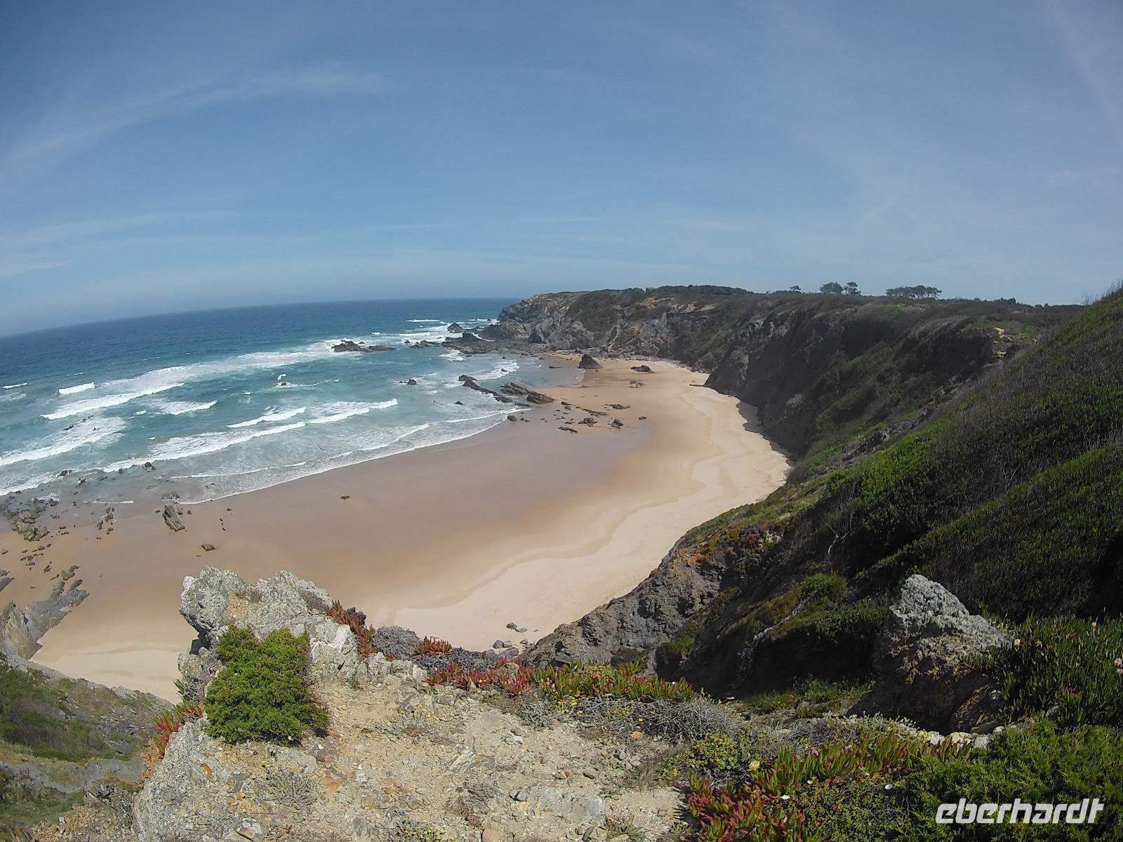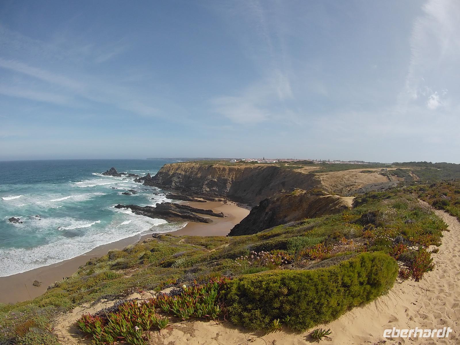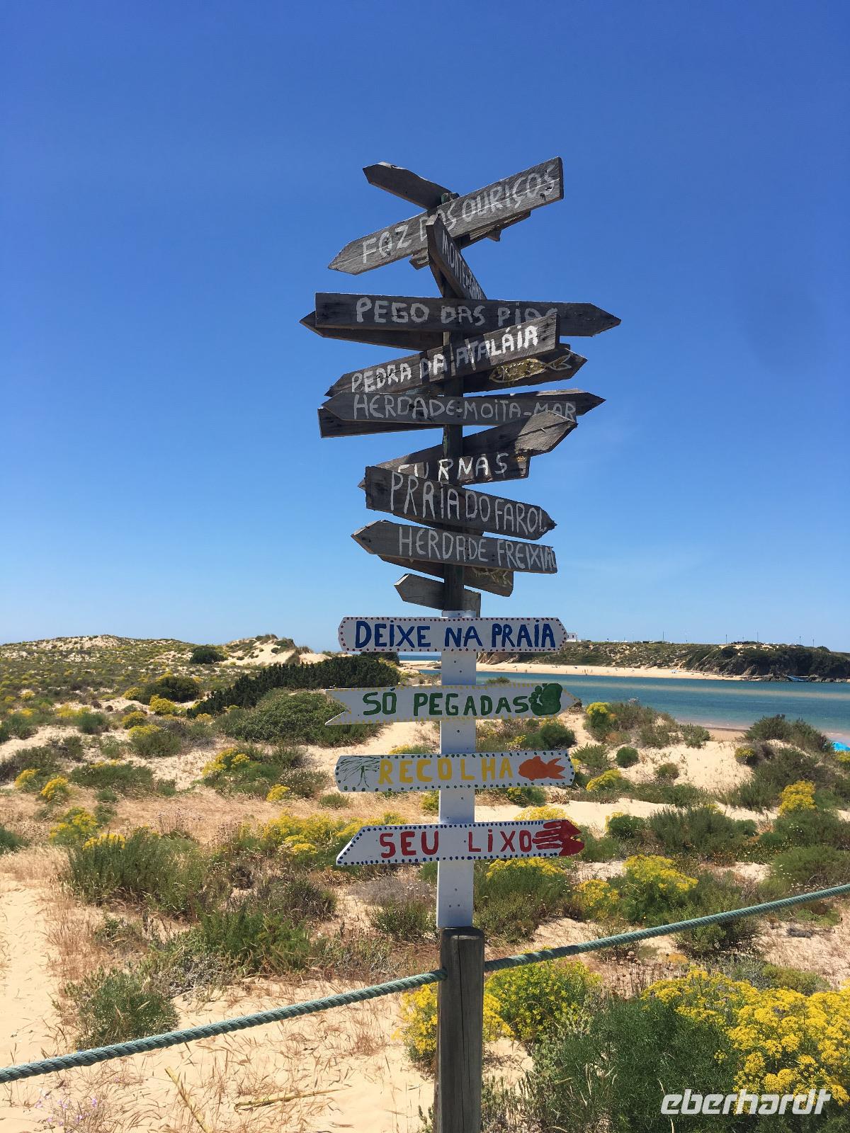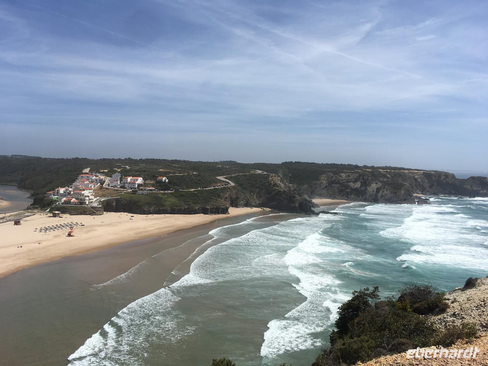 Die letzten zwölf Kilometer wollen heute von uns bezwungen werden. Wir starten von Almograve, hier waren wir bereits am Montag, jedoch geht es heute in die nördliche Richtung. Die sandigen Wege machten uns diese Wanderung gar nicht so einfach. Die Sonne vom wolkenlosen Himmel, tat auch ihr Bestes. Früher als gedacht, war unser Ziel in Sicht. Der Praia Furnas und der Rio Mira. Im kleinen Restaurant suchten wir schnell den Schatten und ließen uns kühle Getränke schmecken. Wer wollte, konnte auch die Erfrischung im Fluss suchen. Er ist einer der Flüsse mit der besten Wasserqualität in Europa. So finden hier auch viele Vögel und auch Fische ein neues Zuhause.
