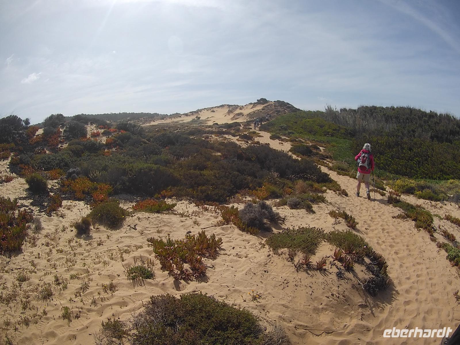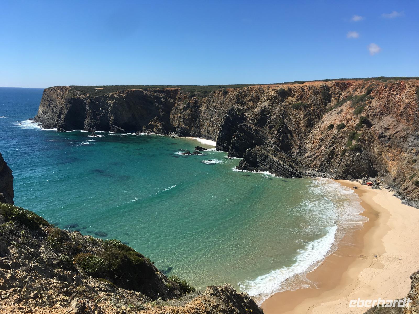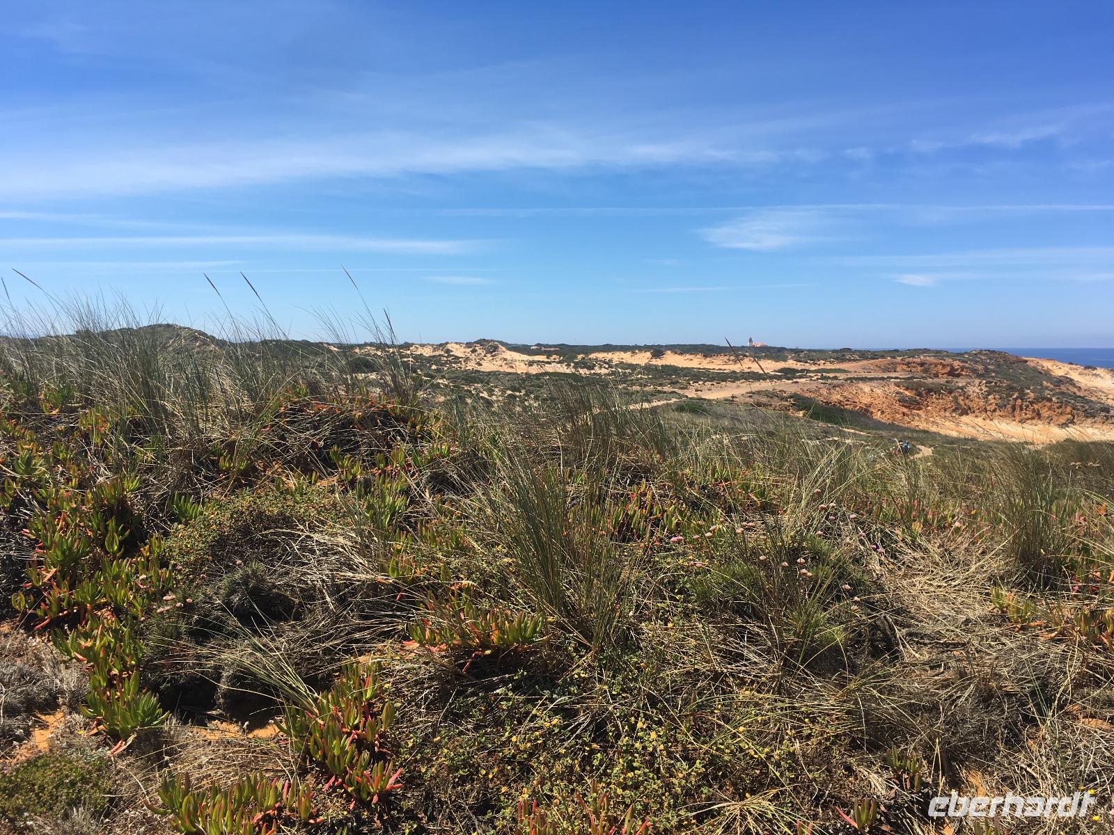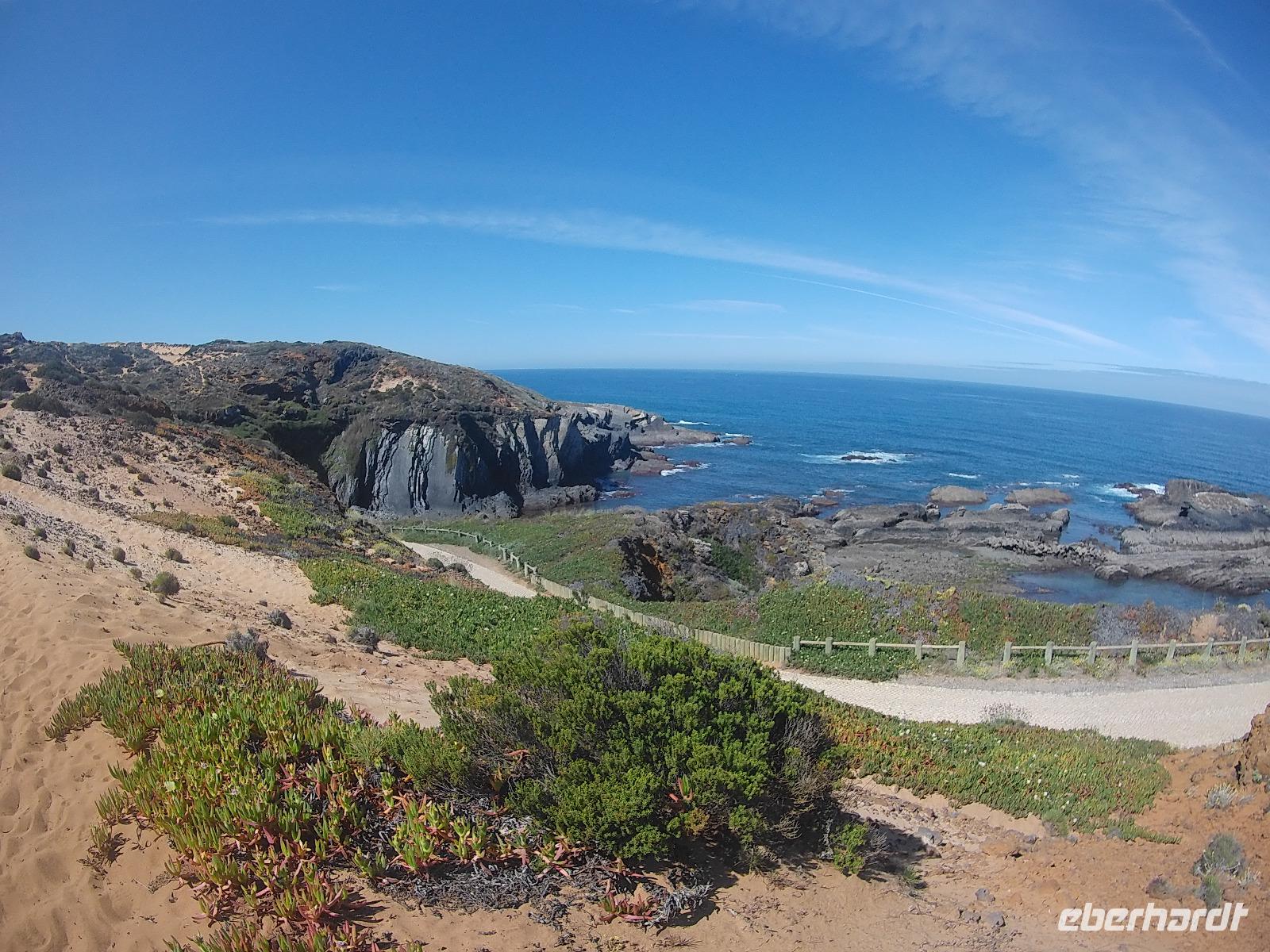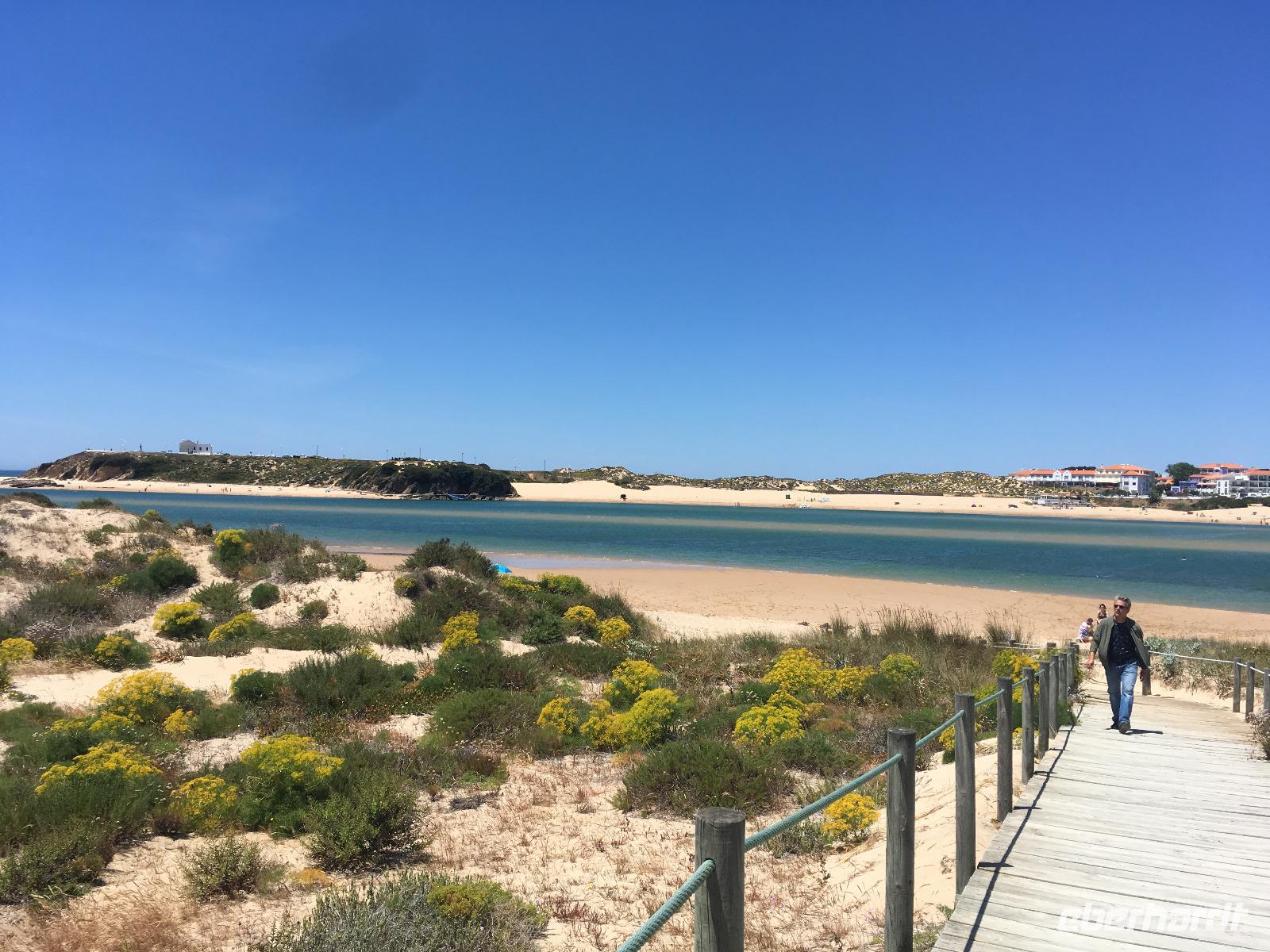 Die letzten zwölf Kilometer wollen heute von uns bezwungen werden. Wir starten von Almograve, hier waren wir bereits am Montag, jedoch geht es heute in die nördliche Richtung. Die sandigen Wege machten uns diese Wanderung gar nicht so einfach. Die Sonne vom wolkenlosen Himmel, tat auch ihr Bestes. Früher als gedacht, war unser Ziel in Sicht. Der Praia Furnas und der Rio Mira. Im kleinen Restaurant suchten wir schnell den Schatten und ließen uns kühle Getränke schmecken. Wer wollte, konnte auch die Erfrischung im Fluss suchen. Er ist einer der Flüsse mit der besten Wasserqualität in Europa. So finden hier auch viele Vögel und auch Fische ein neues Zuhause.