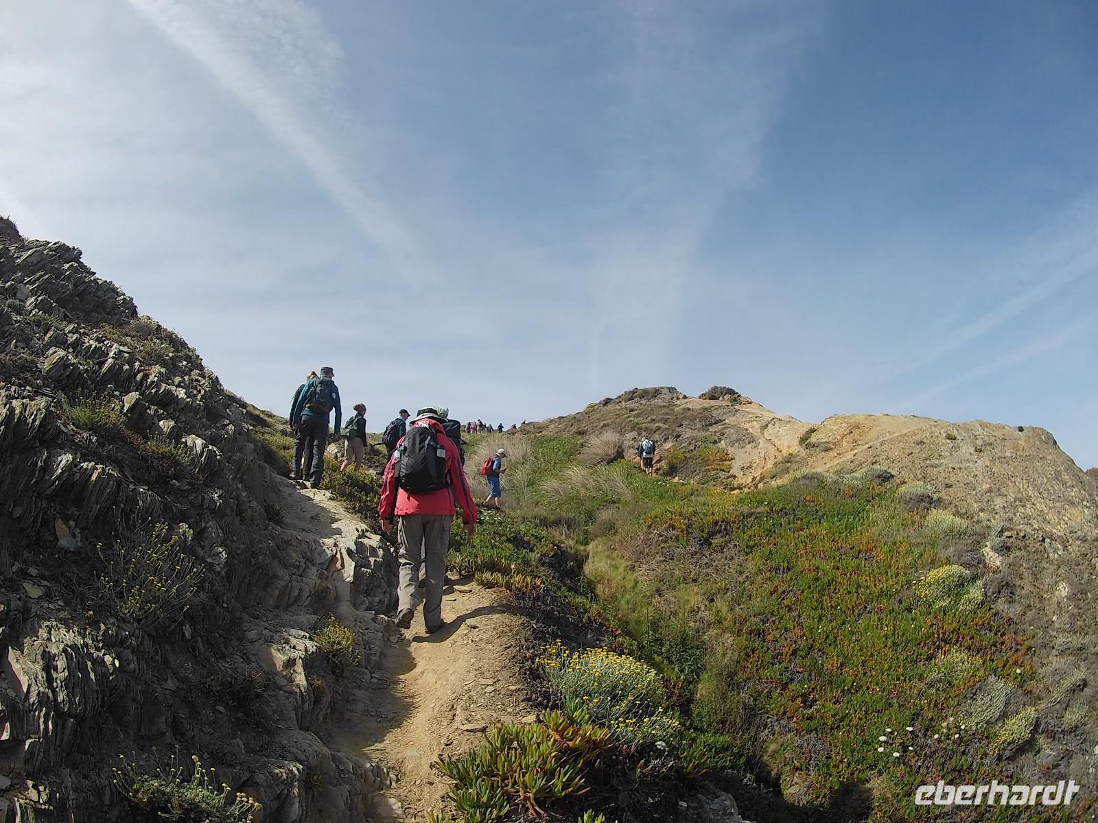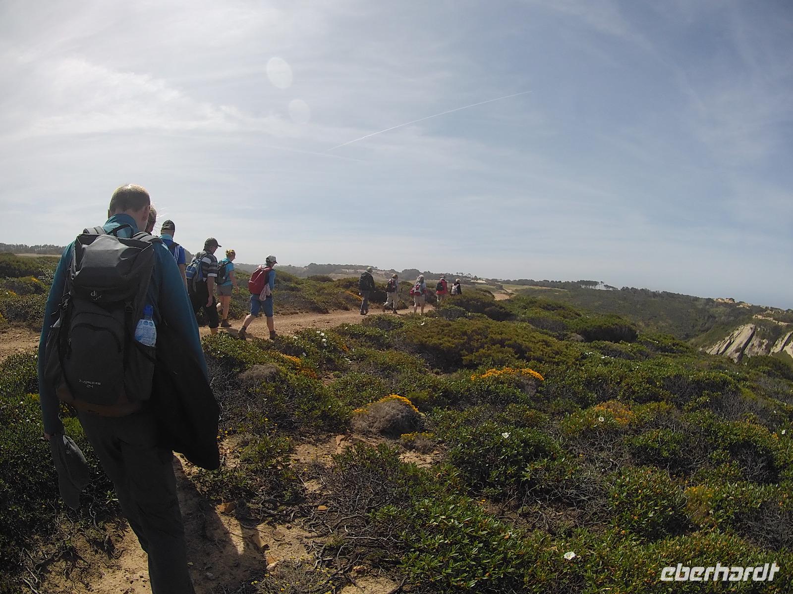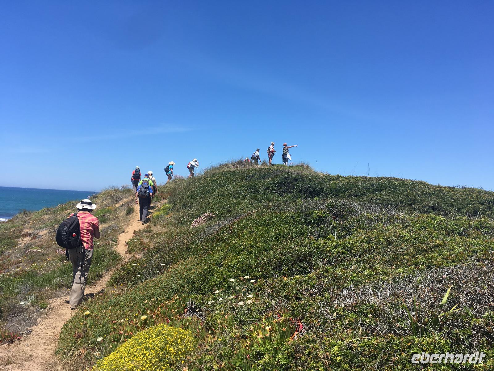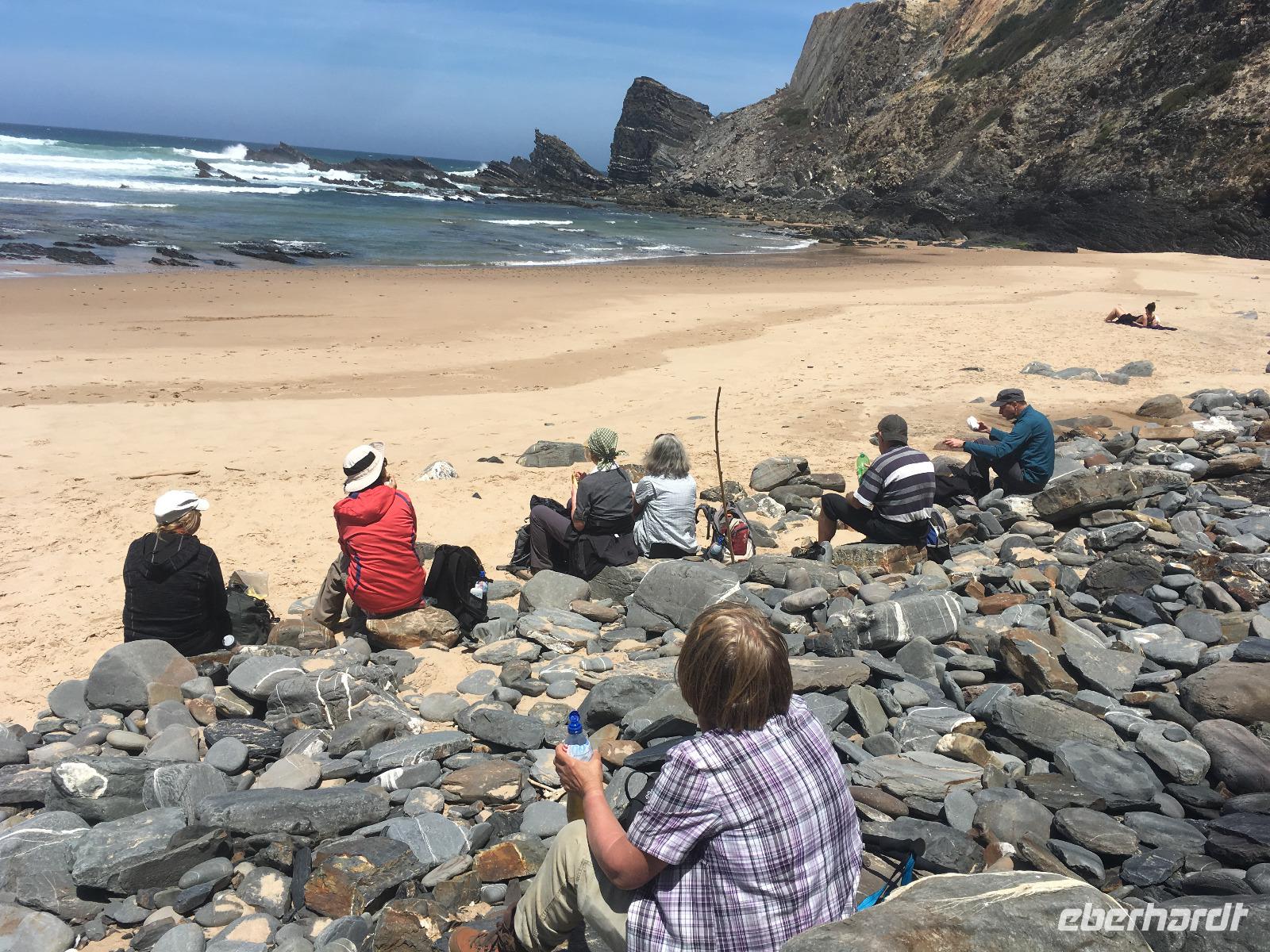 Gut gestärkt und mit einem Lunchpaket ausgestattet, holten uns Larissa und Holger zu unserer ersten Wanderung ab. Vom Hafen in Almograve führte uns der Weg entlang steiler Klippen und durch Eukalyptus-Wäldern zum Ort Cavaleiro. Hier legten wir eine Kaffee- und Bierpause ein. Die Hälfte der Strecke hatten wir geschafft. Nach sehr sandigen Wegen, war der Weg nun etwas befestigter und wir konnten auf die vielen blühenden Pflanzen achten. Besonders die hier weit verbreitete Zistrose hat es uns angetan. Holger sagte uns, dass die sechs-blättrigen Glück bringen sollen, so wie bei uns das vierblättrige Kleeblatt. Wir sahen gleich sieben von diesen Blüten, vier davon sogar am gleichen Strauch. Also viel Glück für uns heute. Aber das hatten wir ja bereits. Viel Sonnenschein und ein leichter Wind verwöhnten uns!