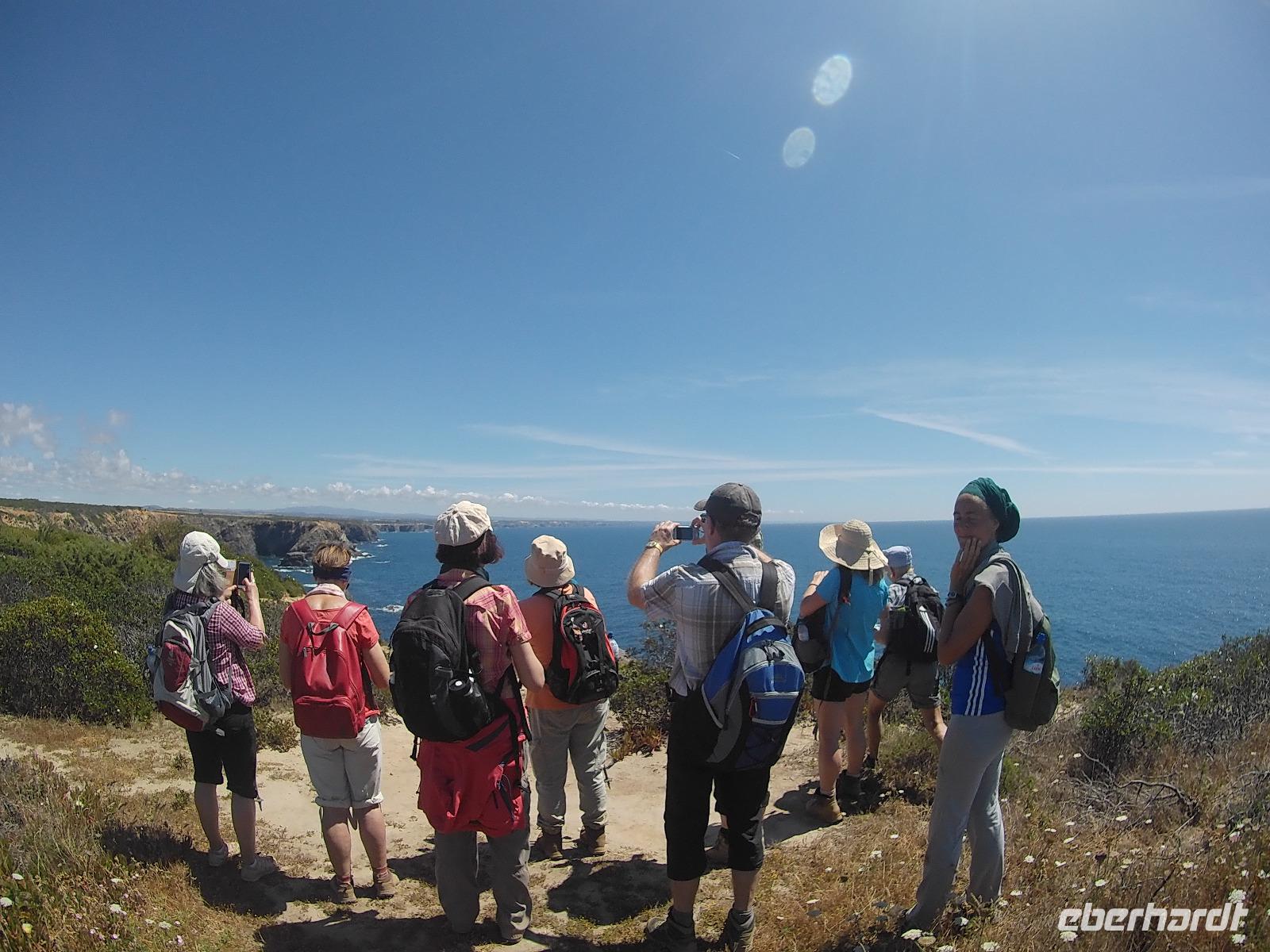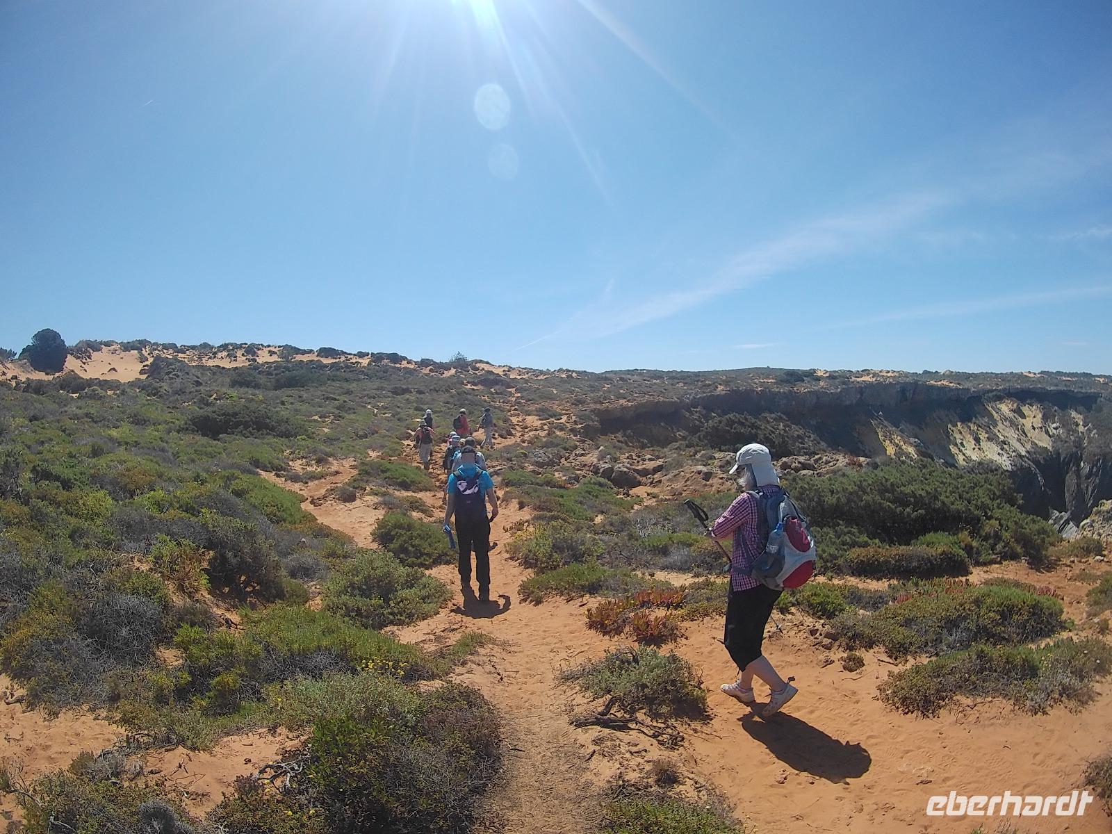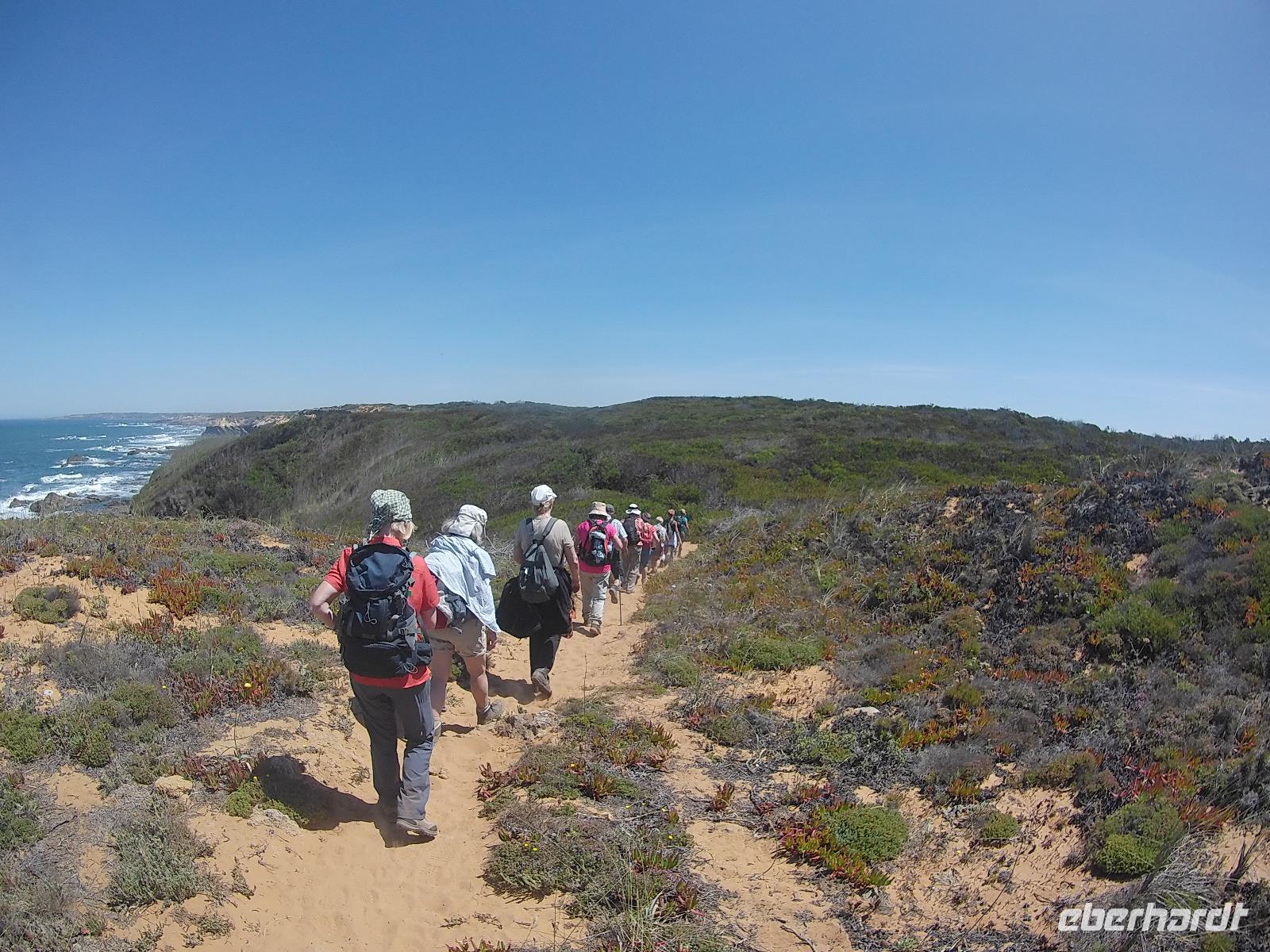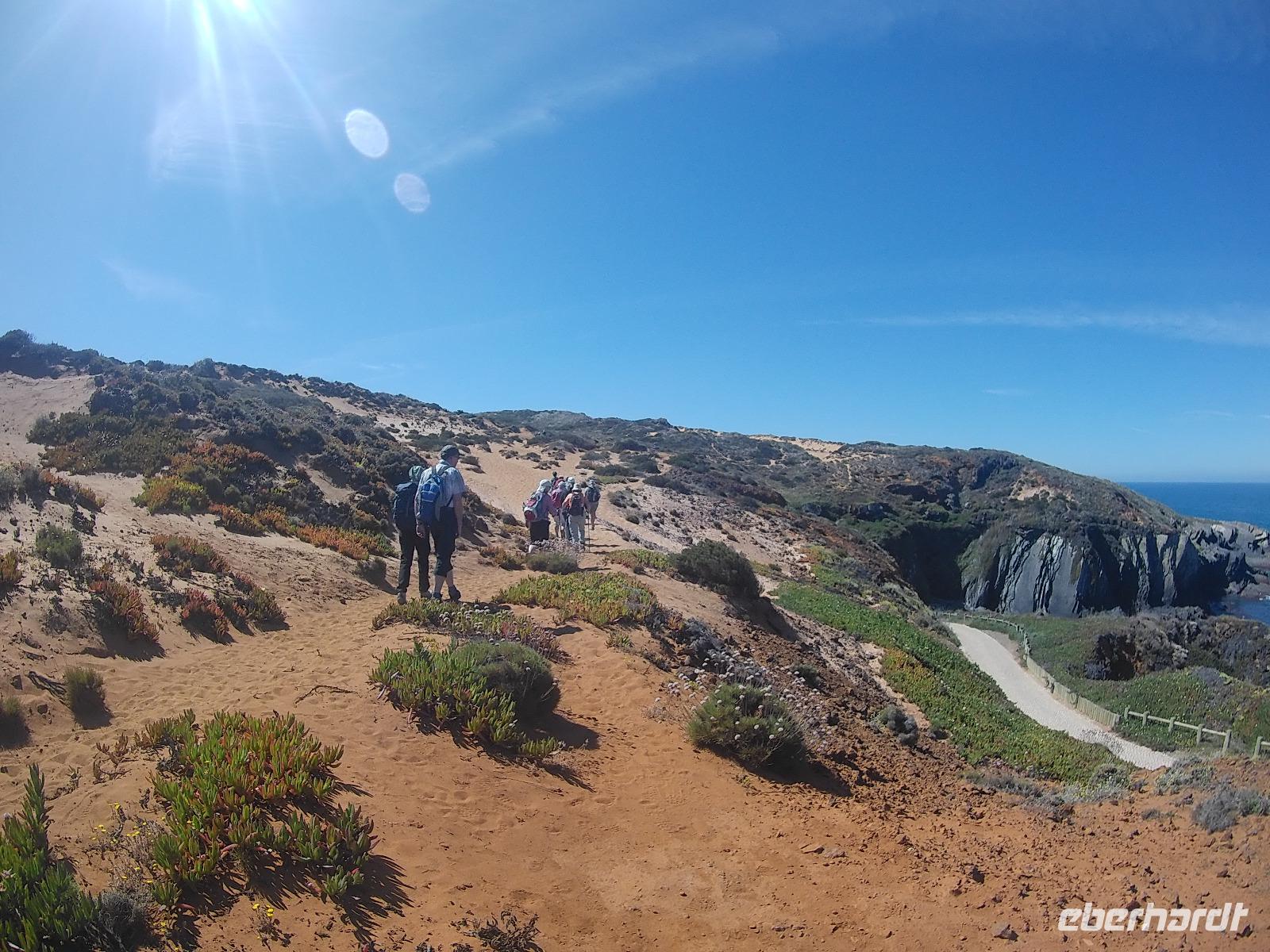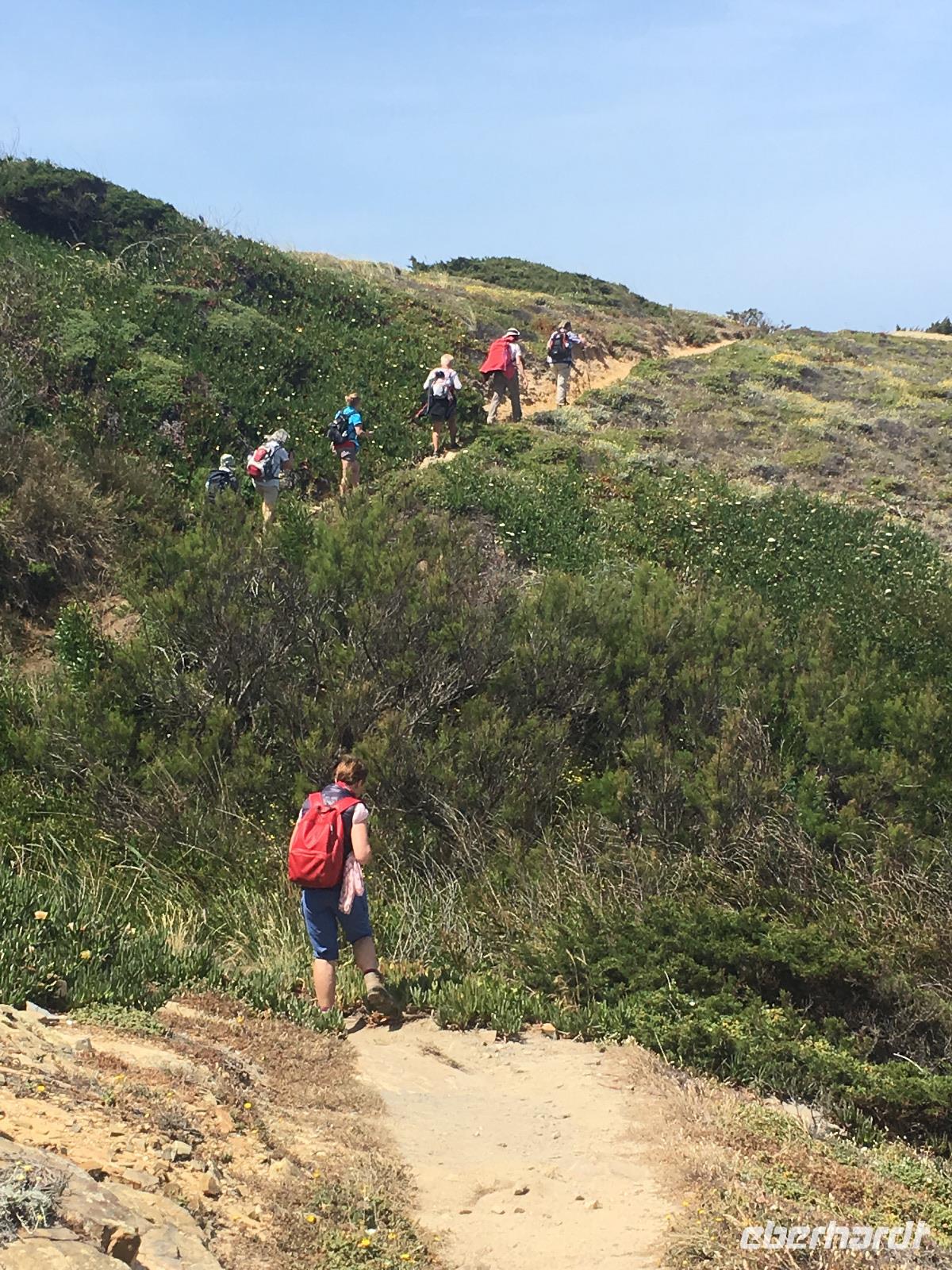 Gut gestärkt und mit einem Lunchpaket ausgestattet, holten uns Larissa und Holger zu unserer ersten Wanderung ab. Vom Hafen in Almograve führte uns der Weg entlang steiler Klippen und durch Eukalyptus-Wäldern zum Ort Cavaleiro. Hier legten wir eine Kaffee- und Bierpause ein. Die Hälfte der Strecke hatten wir geschafft. Nach sehr sandigen Wegen, war der Weg nun etwas befestigter und wir konnten auf die vielen blühenden Pflanzen achten. Besonders die hier weit verbreitete Zistrose hat es uns angetan. Holger sagte uns, dass die sechs-blättrigen Glück bringen sollen, so wie bei uns das vierblättrige Kleeblatt. Wir sahen gleich sieben von diesen Blüten, vier davon sogar am gleichen Strauch. Also viel Glück für uns heute. Aber das hatten wir ja bereits. Viel Sonnenschein und ein leichter Wind verwöhnten uns!