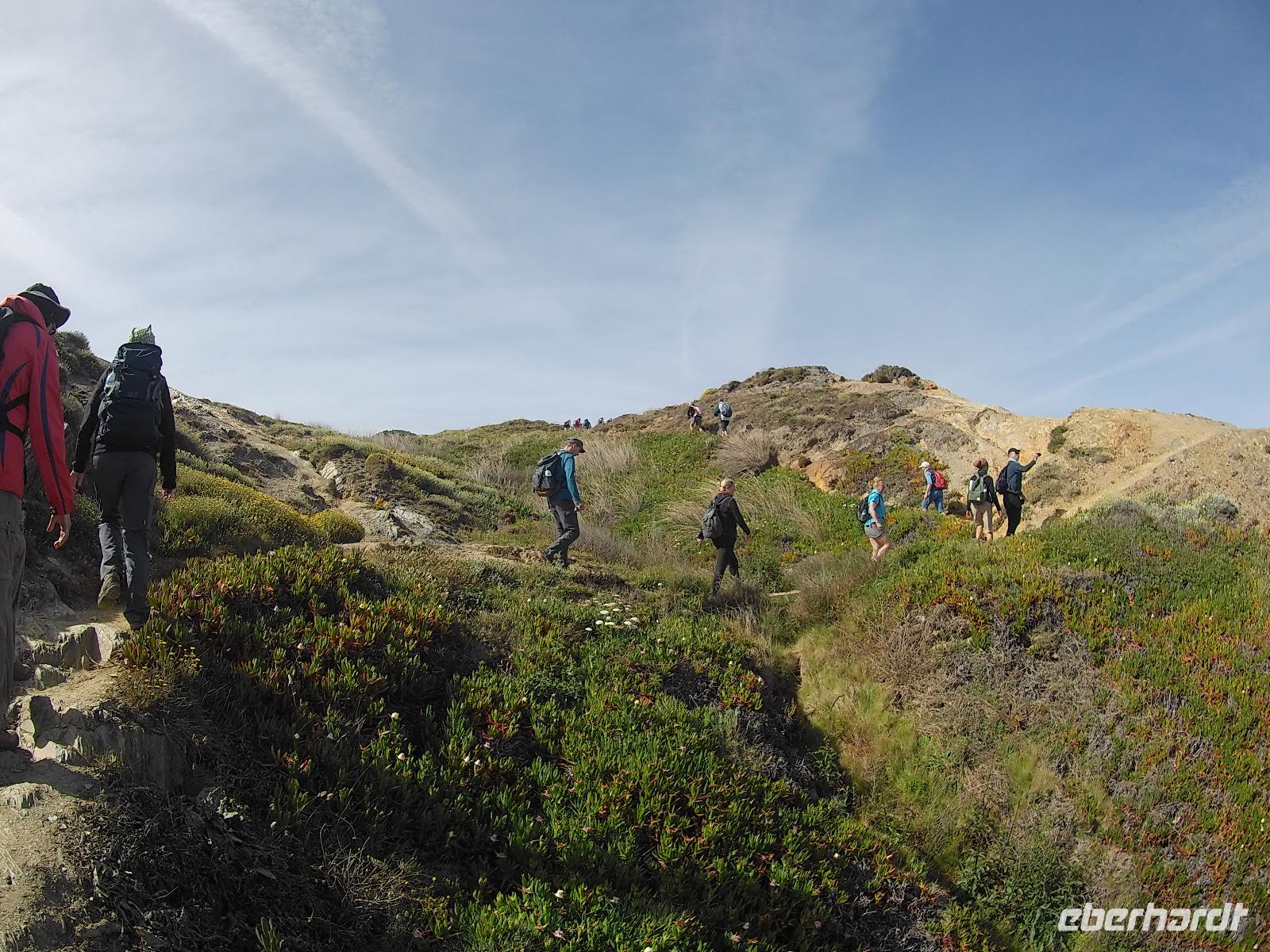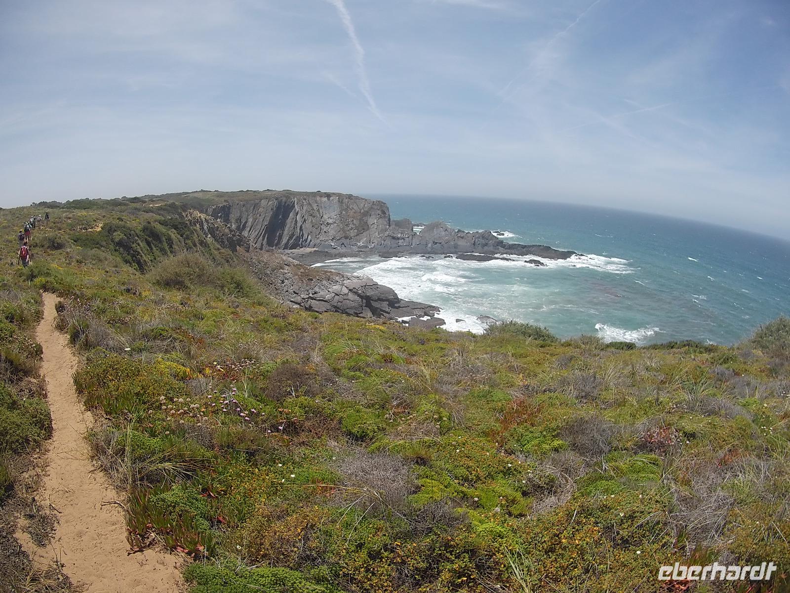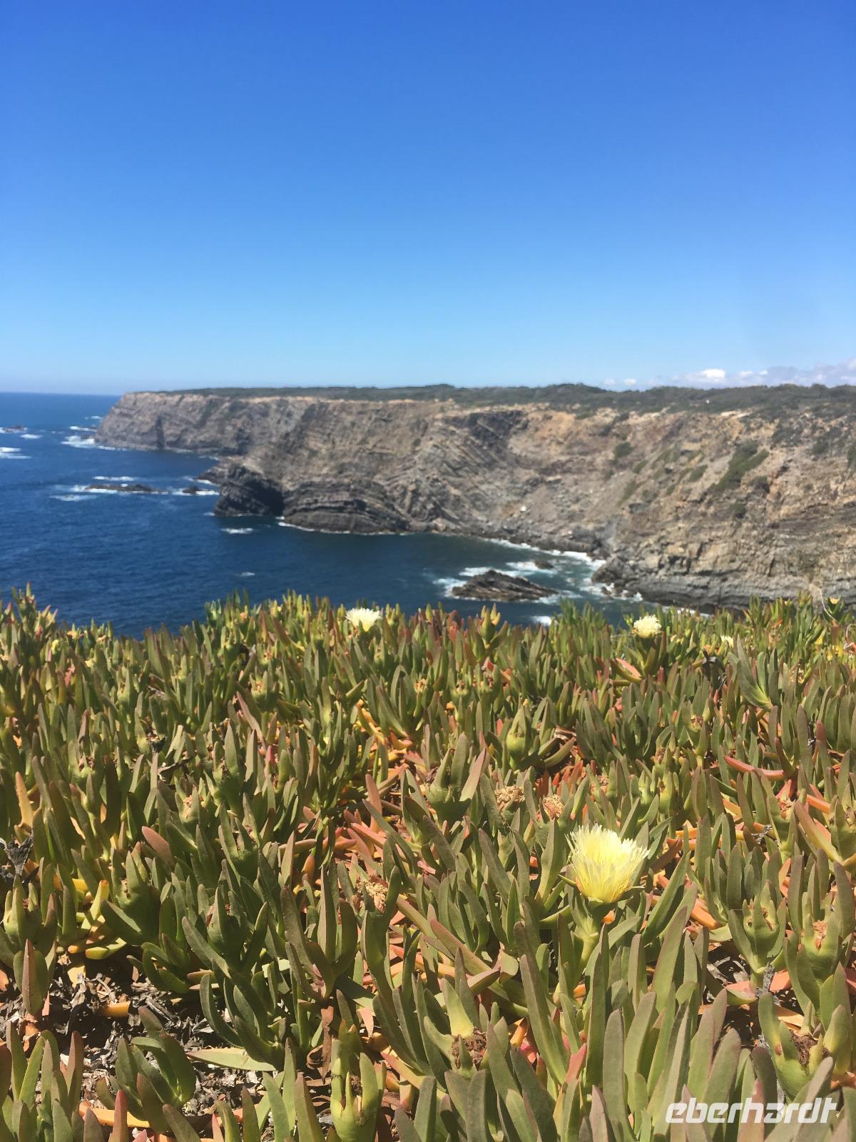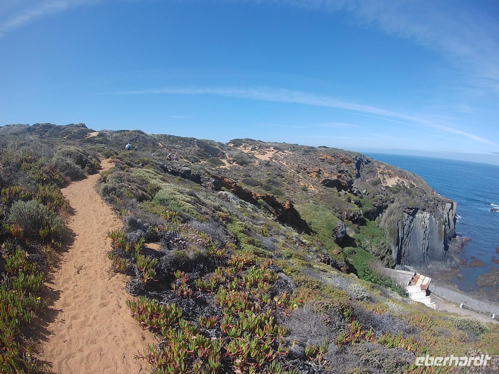 Gut gestärkt und mit einem Lunchpaket ausgestattet, holten uns Larissa und Holger zu unserer ersten Wanderung ab. Vom Hafen in Almograve führte uns der Weg entlang steiler Klippen und durch Eukalyptus-Wäldern zum Ort Cavaleiro. Hier legten wir eine Kaffee- und Bierpause ein. Die Hälfte der Strecke hatten wir geschafft. Nach sehr sandigen Wegen, war der Weg nun etwas befestigter und wir konnten auf die vielen blühenden Pflanzen achten. Besonders die hier weit verbreitete Zistrose hat es uns angetan. Holger sagte uns, dass die sechs-blättrigen Glück bringen sollen, so wie bei uns das vierblättrige Kleeblatt. Wir sahen gleich sieben von diesen Blüten, vier davon sogar am gleichen Strauch. Also viel Glück für uns heute. Aber das hatten wir ja bereits. Viel Sonnenschein und ein leichter Wind verwöhnten uns!