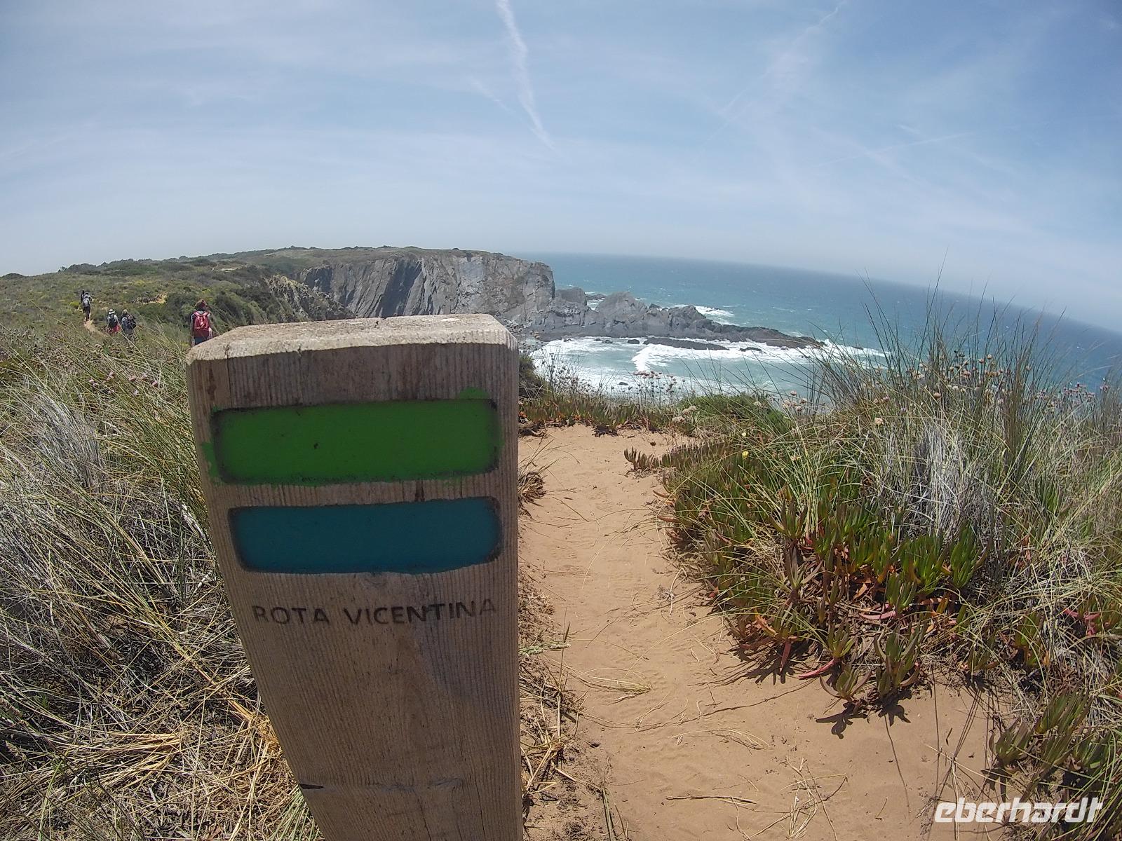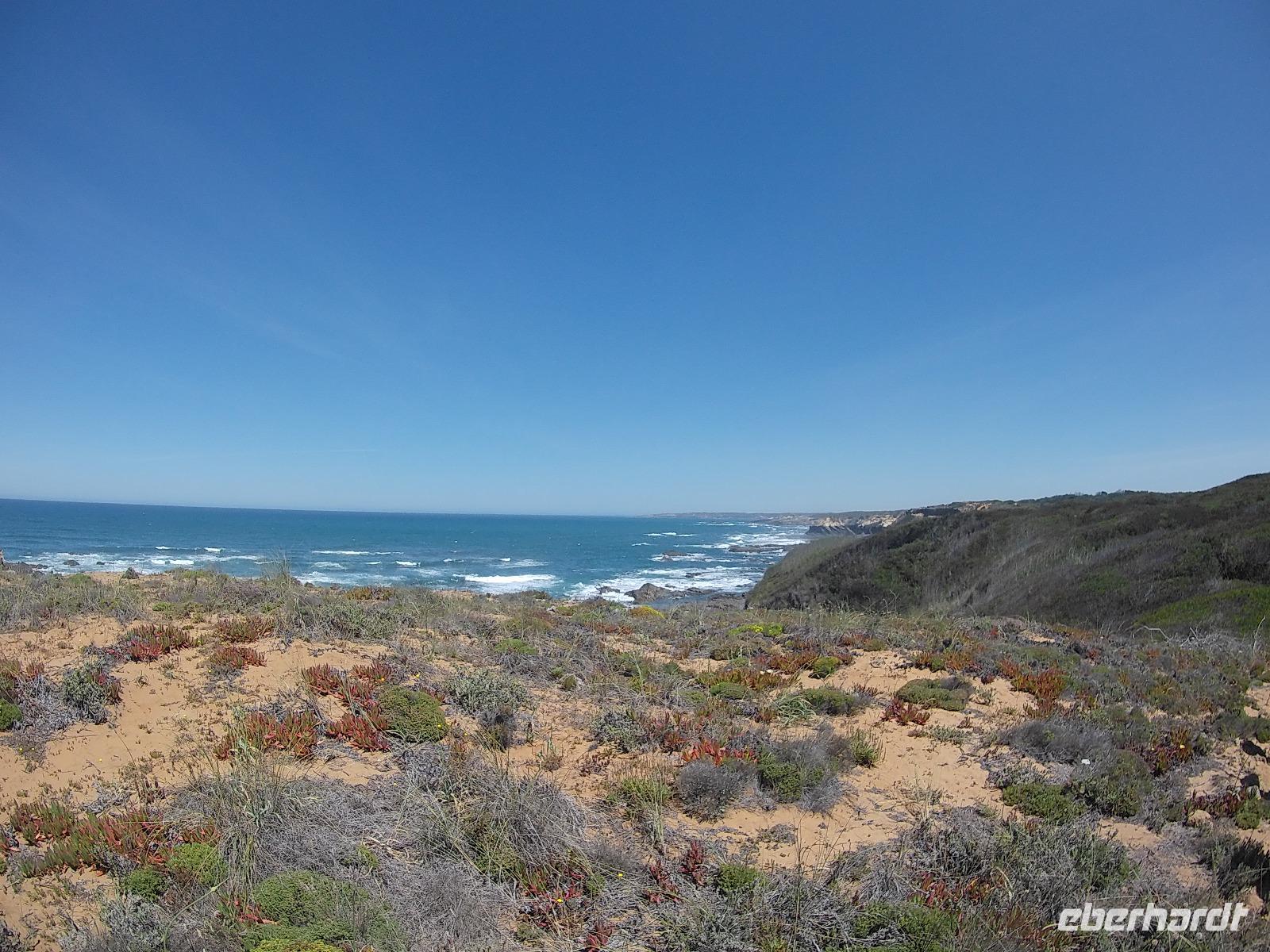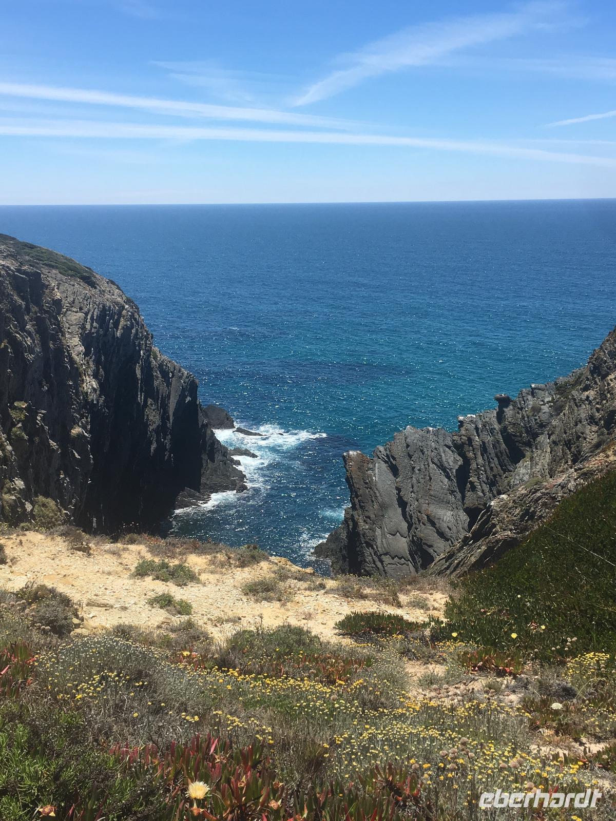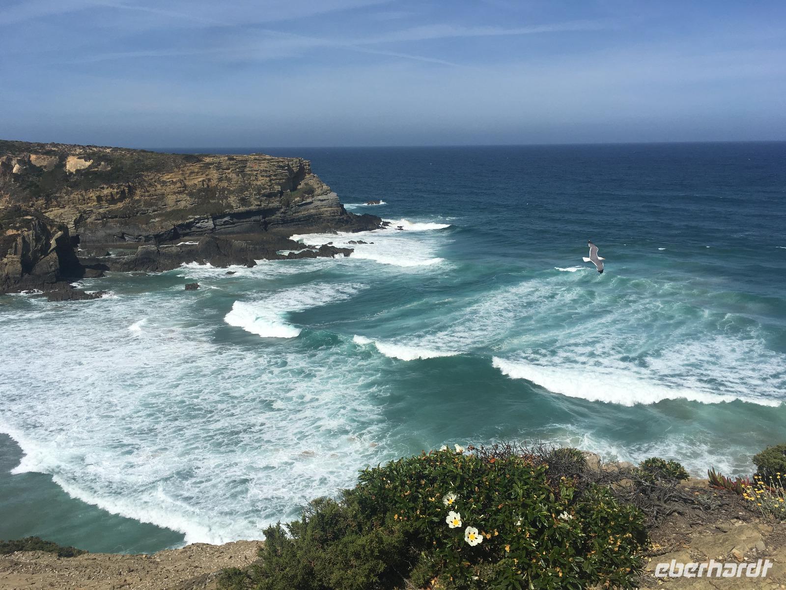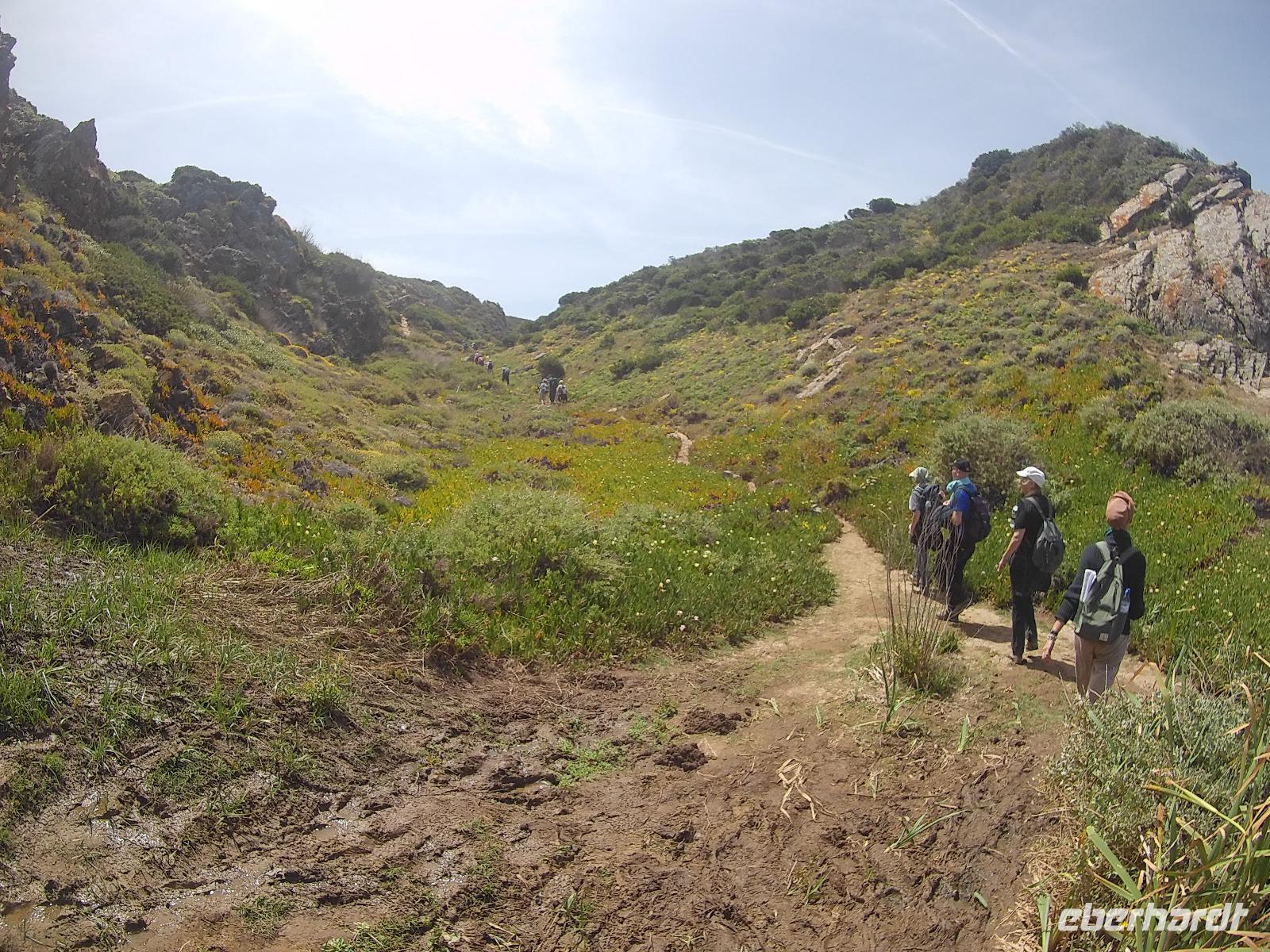 Gut gestärkt und mit einem Lunchpaket ausgestattet, holten uns Larissa und Holger zu unserer ersten Wanderung ab. Vom Hafen in Almograve führte uns der Weg entlang steiler Klippen und durch Eukalyptus-Wäldern zum Ort Cavaleiro. Hier legten wir eine Kaffee- und Bierpause ein. Die Hälfte der Strecke hatten wir geschafft. Nach sehr sandigen Wegen, war der Weg nun etwas befestigter und wir konnten auf die vielen blühenden Pflanzen achten. Besonders die hier weit verbreitete Zistrose hat es uns angetan. Holger sagte uns, dass die sechs-blättrigen Glück bringen sollen, so wie bei uns das vierblättrige Kleeblatt. Wir sahen gleich sieben von diesen Blüten, vier davon sogar am gleichen Strauch. Also viel Glück für uns heute. Aber das hatten wir ja bereits. Viel Sonnenschein und ein leichter Wind verwöhnten uns!