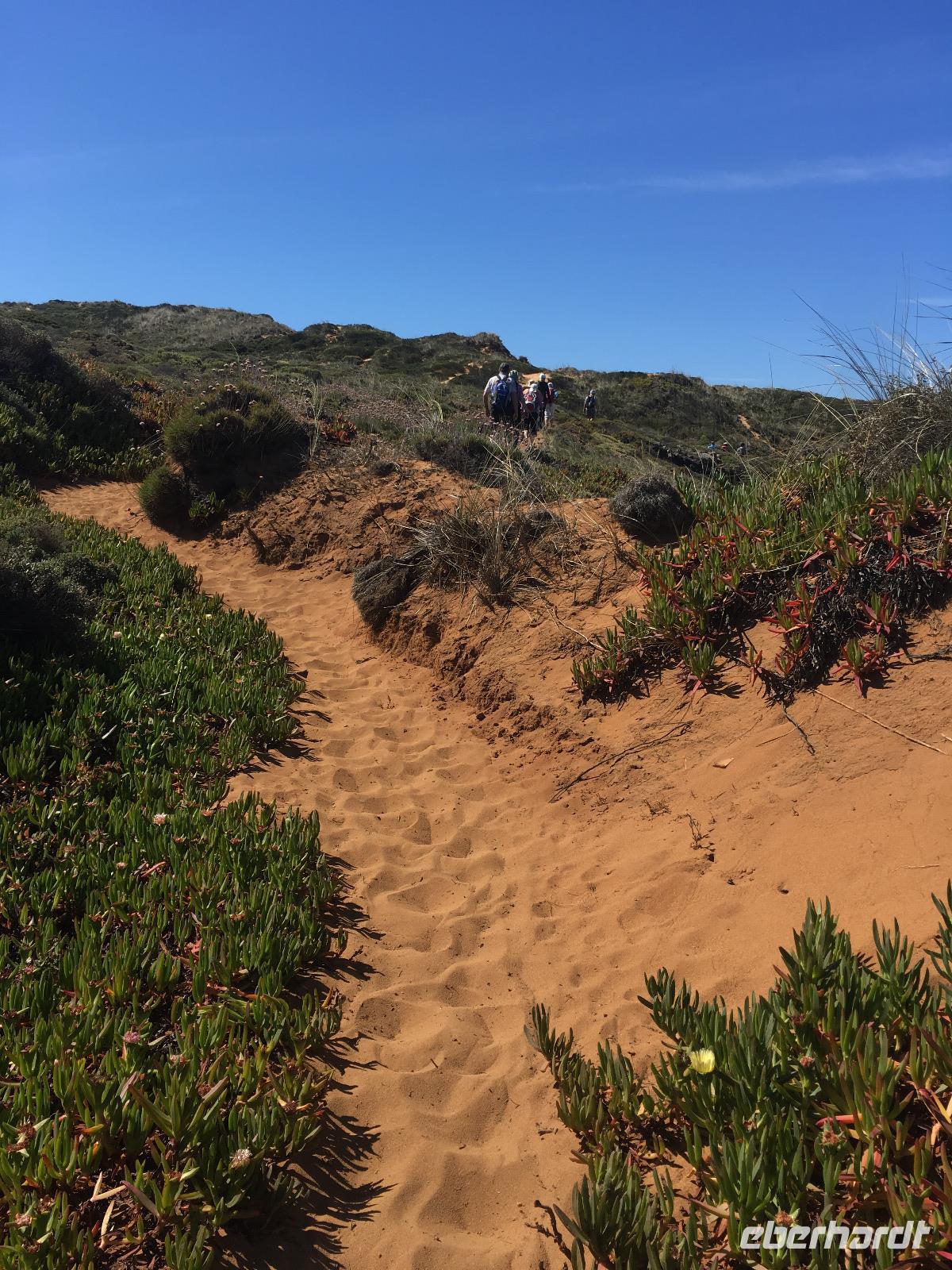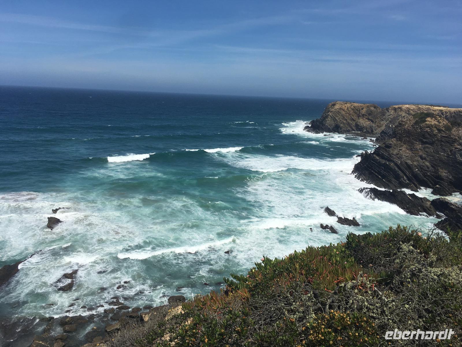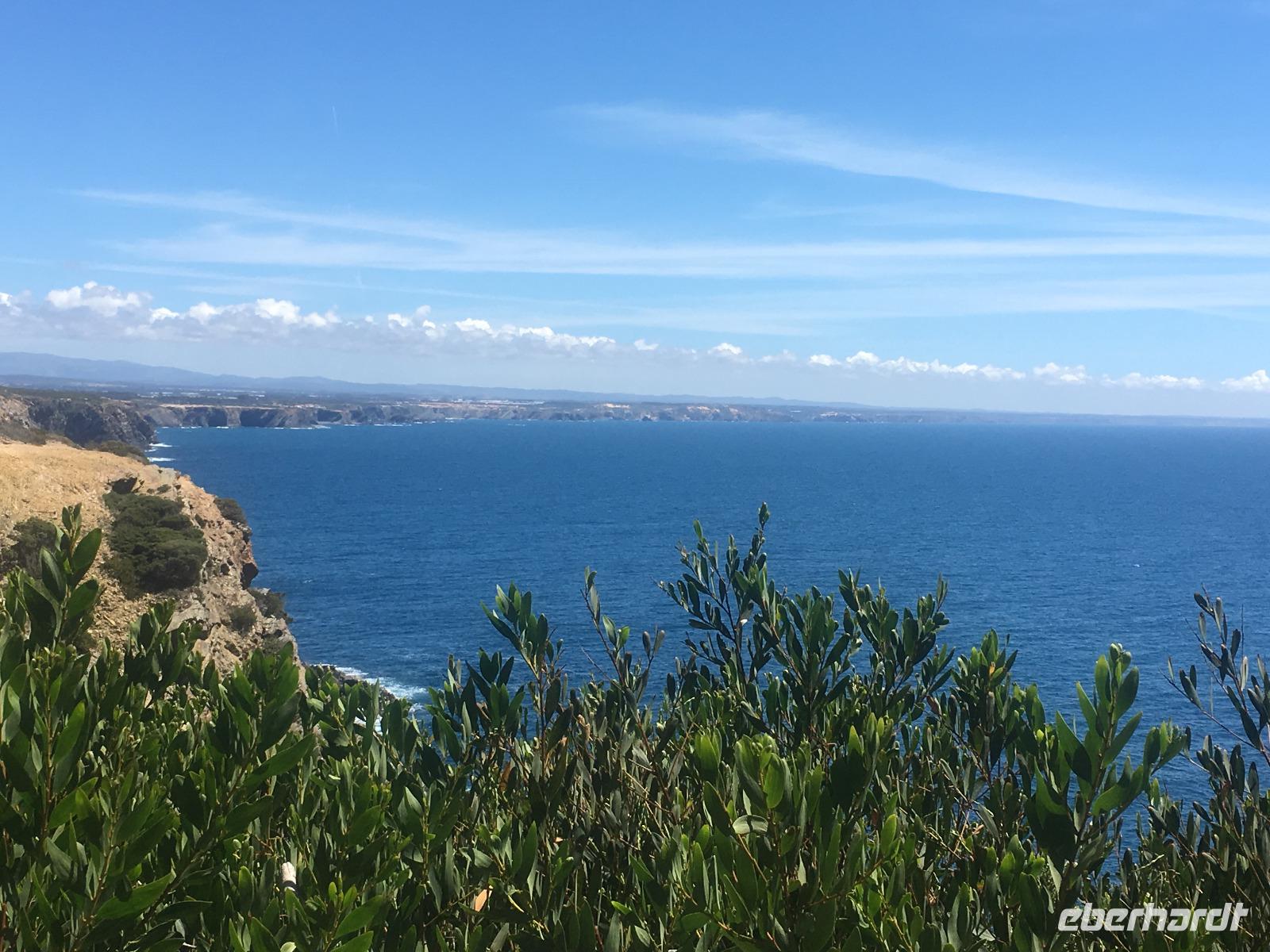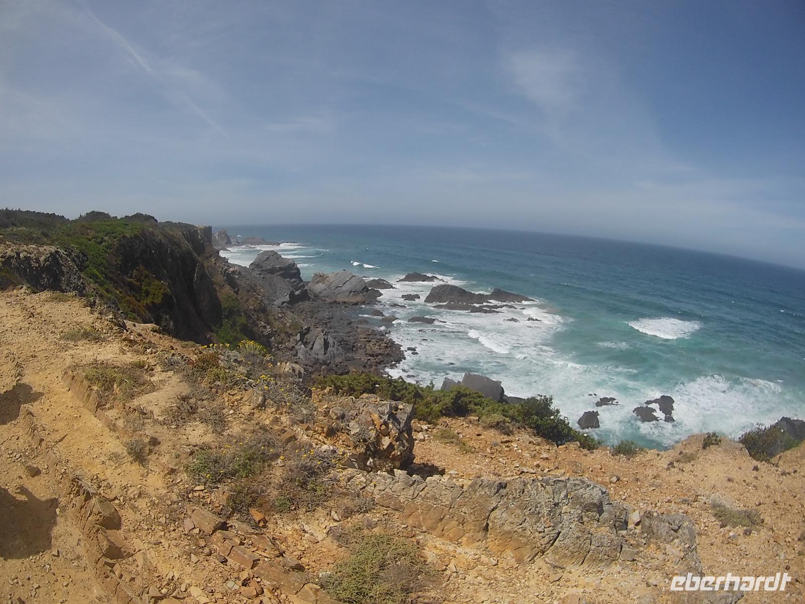 Gut gestärkt und mit einem Lunchpaket ausgestattet, holten uns Larissa und Holger zu unserer ersten Wanderung ab. Vom Hafen in Almograve führte uns der Weg entlang steiler Klippen und durch Eukalyptus-Wäldern zum Ort Cavaleiro. Hier legten wir eine Kaffee- und Bierpause ein. Die Hälfte der Strecke hatten wir geschafft. Nach sehr sandigen Wegen, war der Weg nun etwas befestigter und wir konnten auf die vielen blühenden Pflanzen achten. Besonders die hier weit verbreitete Zistrose hat es uns angetan. Holger sagte uns, dass die sechs-blättrigen Glück bringen sollen, so wie bei uns das vierblättrige Kleeblatt. Wir sahen gleich sieben von diesen Blüten, vier davon sogar am gleichen Strauch. Also viel Glück für uns heute. Aber das hatten wir ja bereits. Viel Sonnenschein und ein leichter Wind verwöhnten uns!