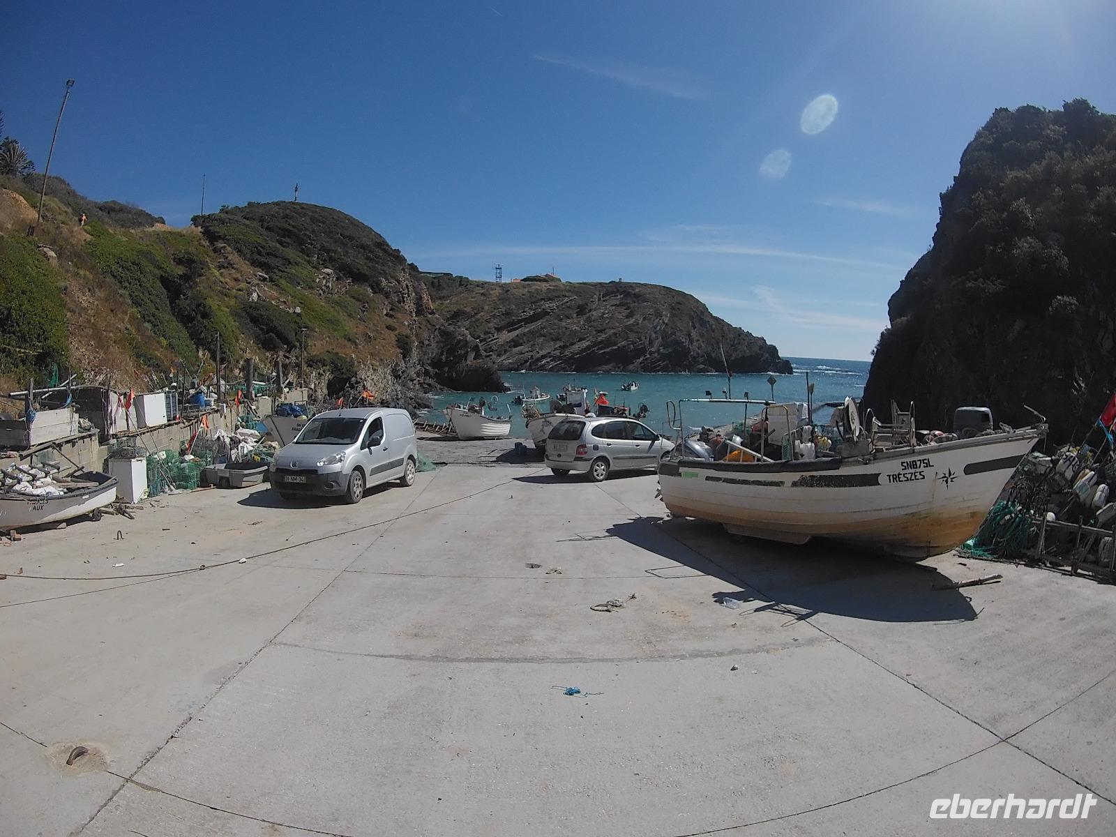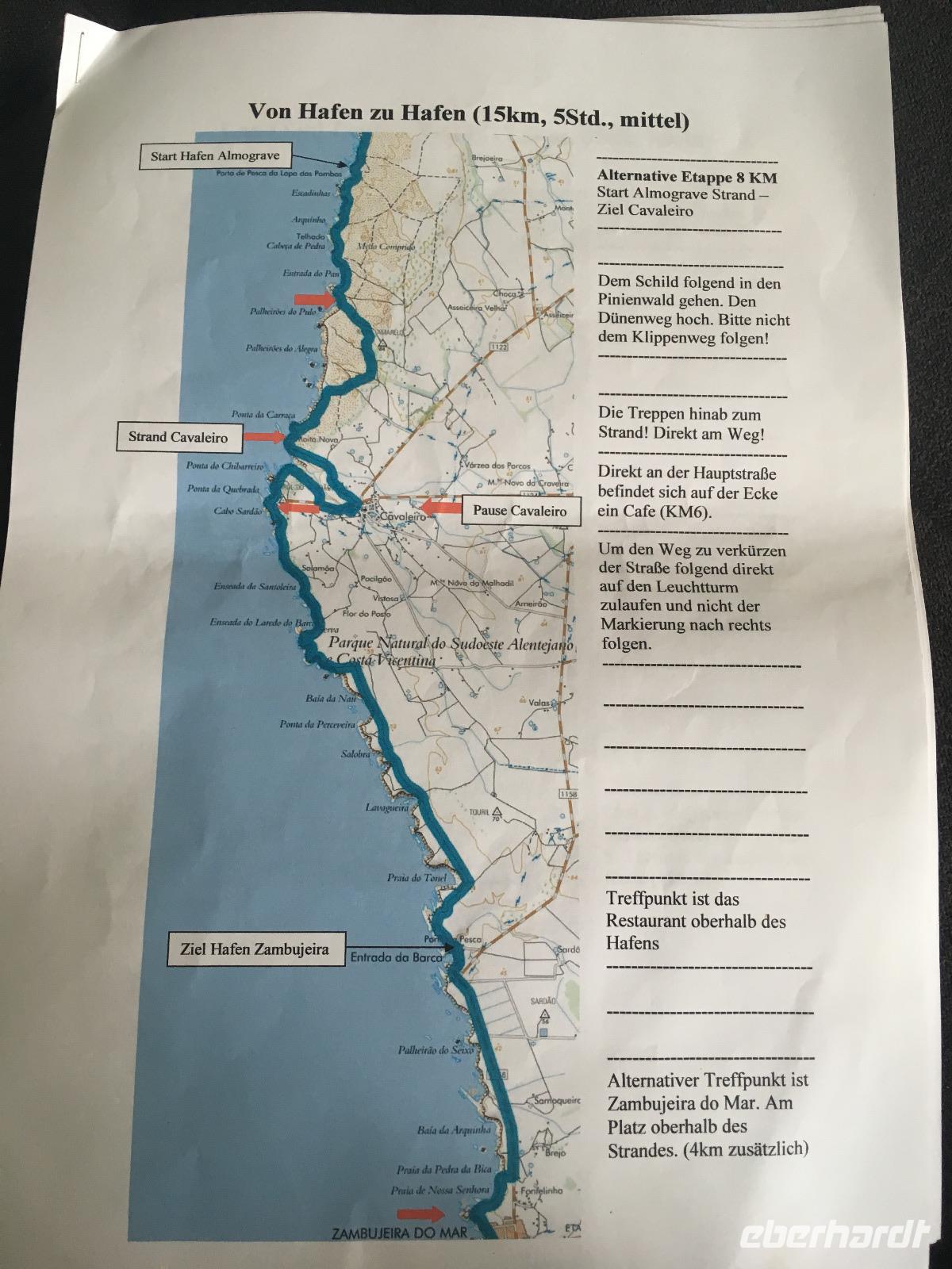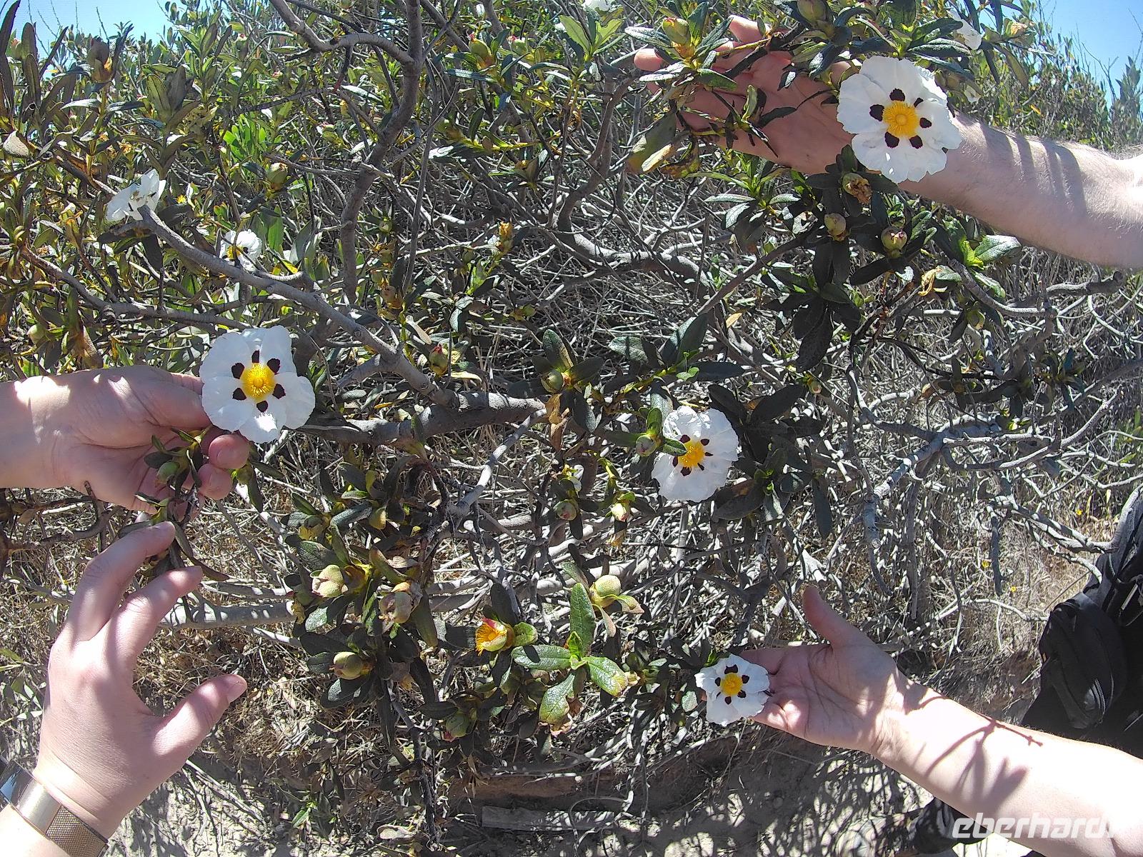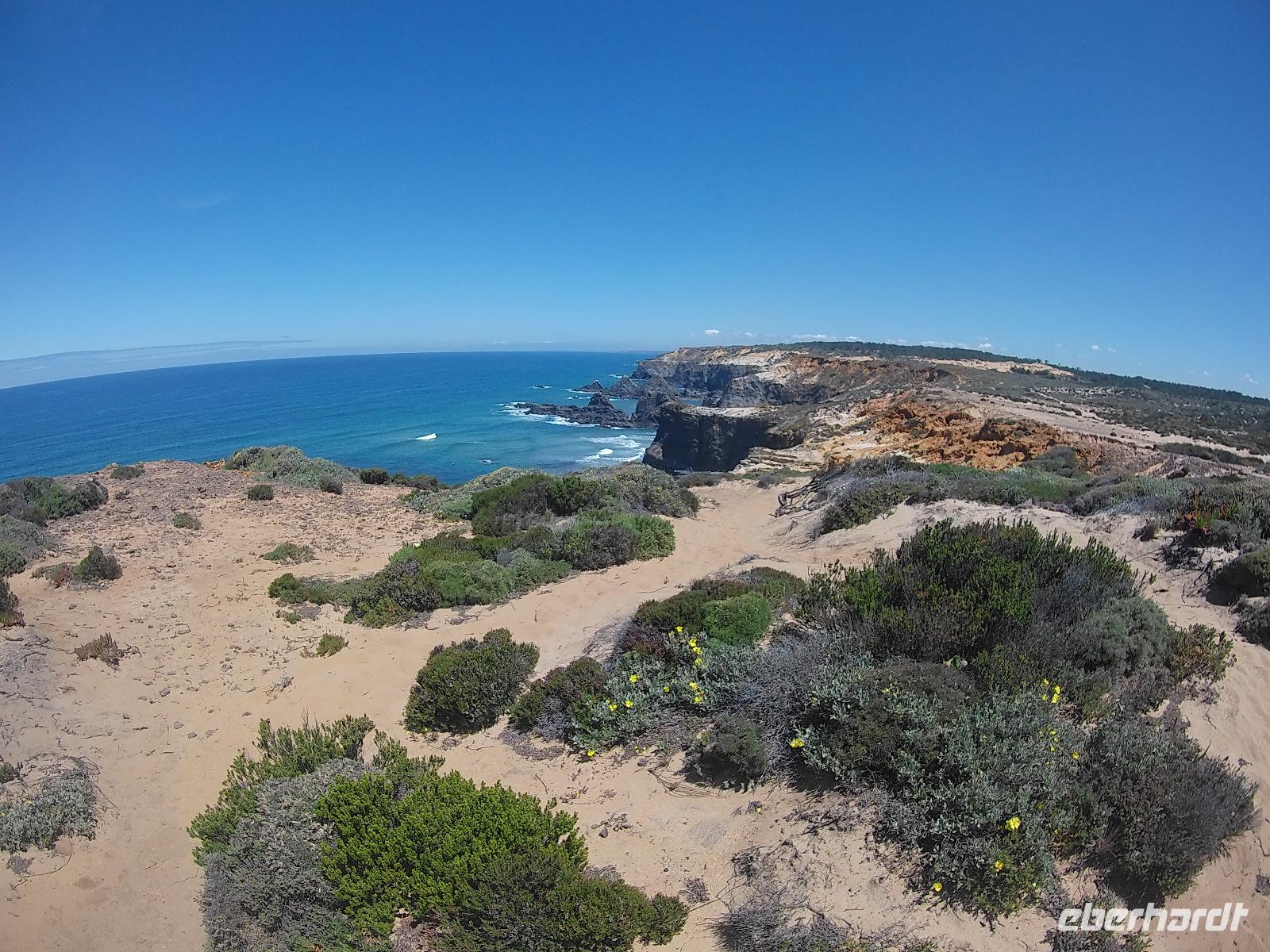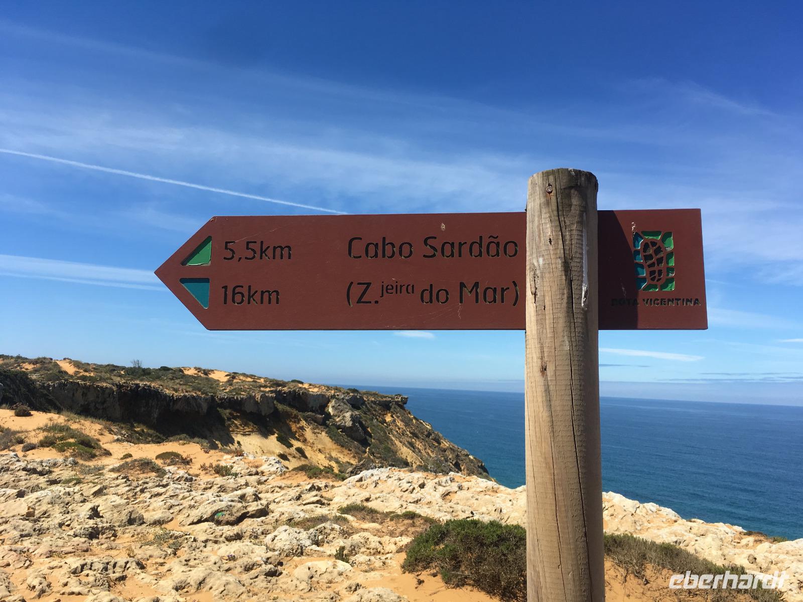 Gut gestärkt und mit einem Lunchpaket ausgestattet, holten uns Larissa und Holger zu unserer ersten Wanderung ab. Vom Hafen in Almograve führte uns der Weg entlang steiler Klippen und durch Eukalyptus-Wäldern zum Ort Cavaleiro. Hier legten wir eine Kaffee- und Bierpause ein. Die Hälfte der Strecke hatten wir geschafft. Nach sehr sandigen Wegen, war der Weg nun etwas befestigter und wir konnten auf die vielen blühenden Pflanzen achten. Besonders die hier weit verbreitete Zistrose hat es uns angetan. Holger sagte uns, dass die sechs-blättrigen Glück bringen sollen, so wie bei uns das vierblättrige Kleeblatt. Wir sahen gleich sieben von diesen Blüten, vier davon sogar am gleichen Strauch. Also viel Glück für uns heute. Aber das hatten wir ja bereits. Viel Sonnenschein und ein leichter Wind verwöhnten uns!