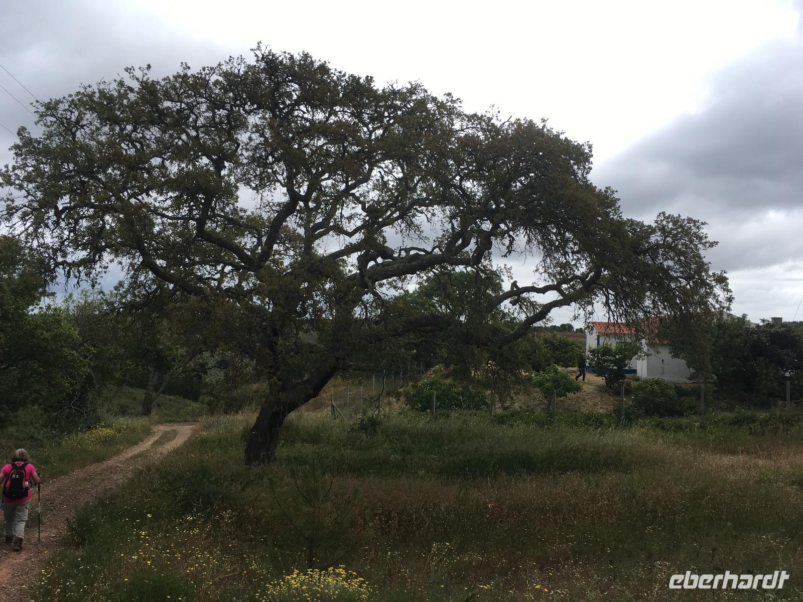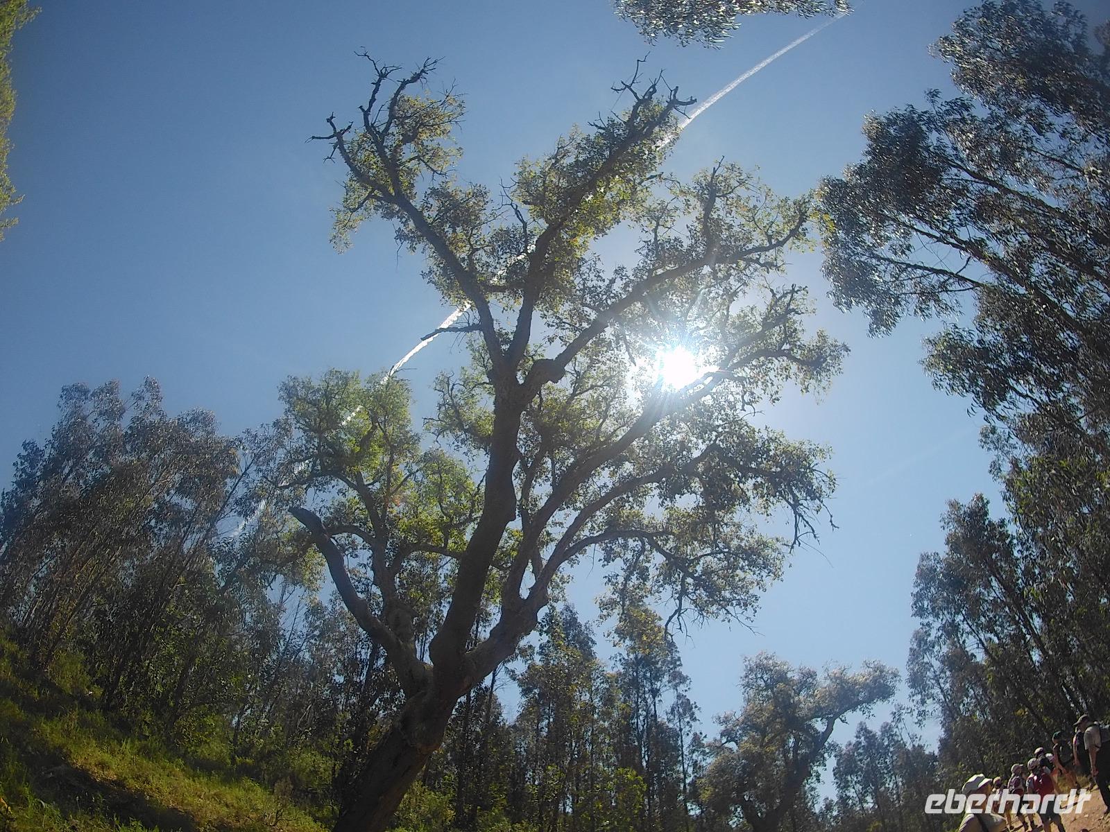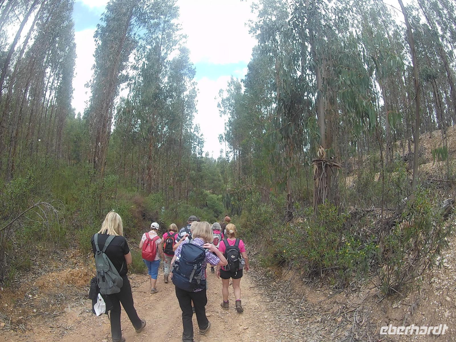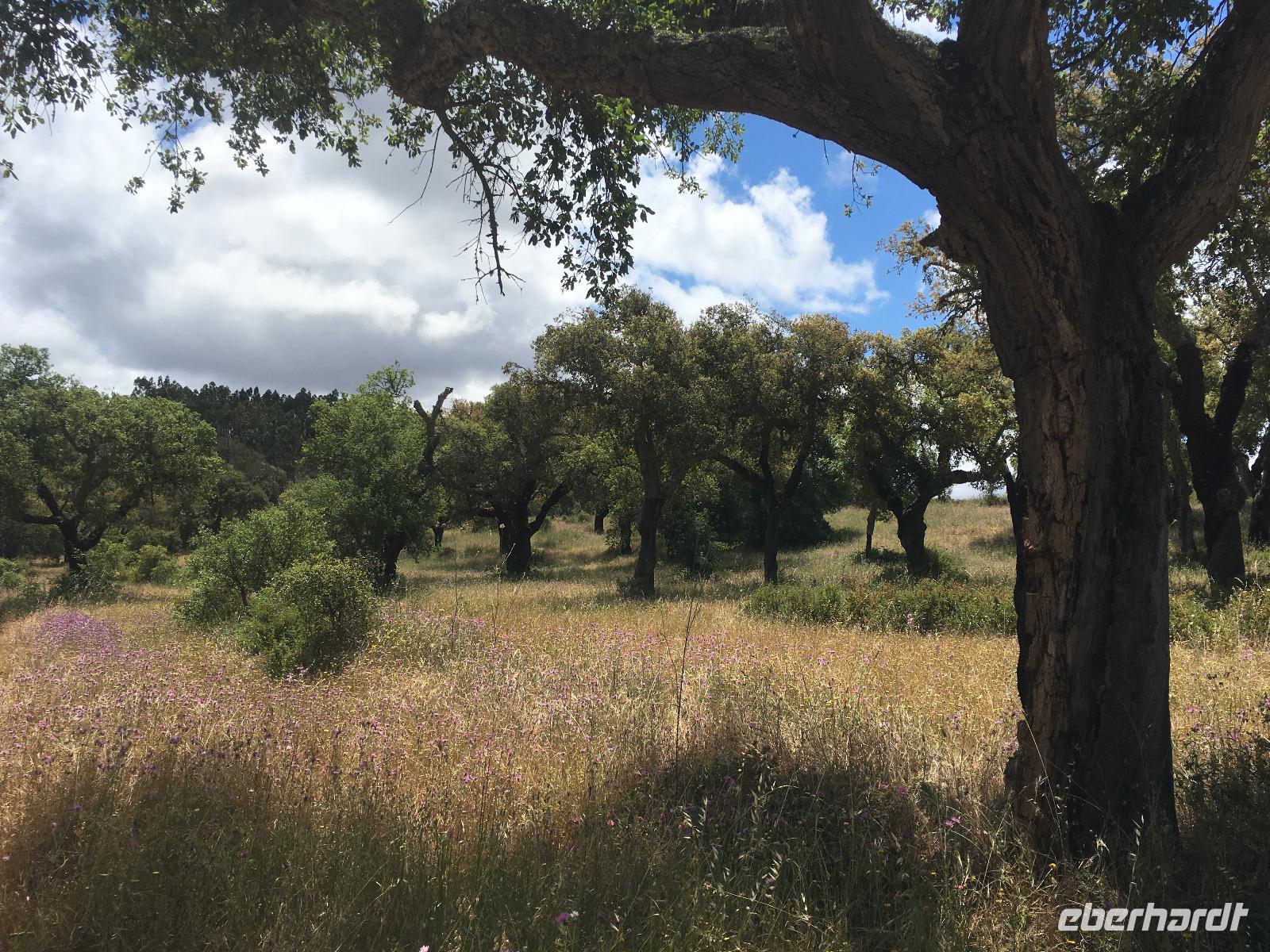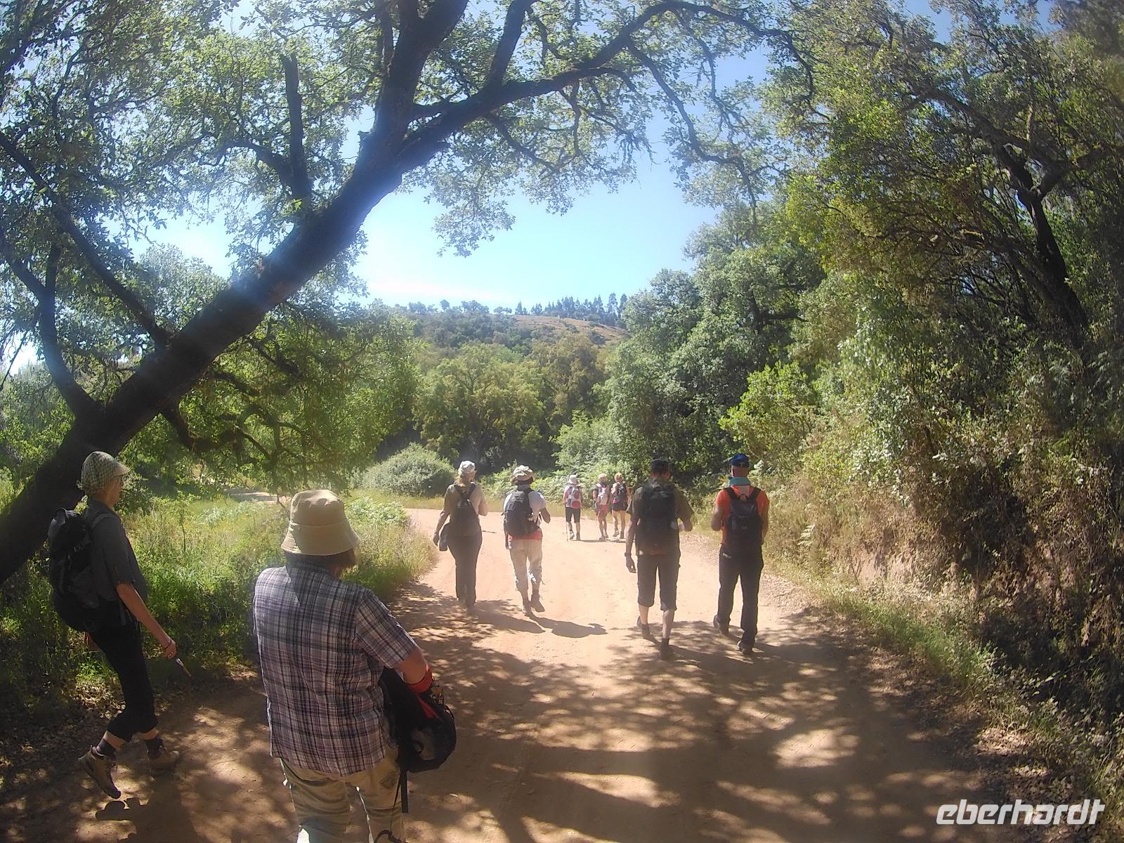 Die 15 Kilometer von gestern wurden von allen gut verkraftet und so konnten wir frisch und munter in diesen Tag starten. Holger hat uns ein tolles Picknick versprochen, welches uns antrieb. Nach einem kurzen Transfer erreichen wir Sao Teotonio, einen kleinen Ort im Inland von Alentejo. Von hier aus wanderten wir gemeinsam mit Larissa entlang von Eukalyptus-Plantagen und vielen Korkeichen. Beides wichtige Nutzpflanzen hier in Portugal. Der Eukalyptus wird zur Papierherstellung genutzt. Er wächst sehr schnell und kann daher aller acht bis zwölf Jahre abgeholzt werden. Jedoch brauch er auch viel Wasser, die Wurzeln reichen tief ins Erdreich und verdrängt daher einheimische Baumarten.