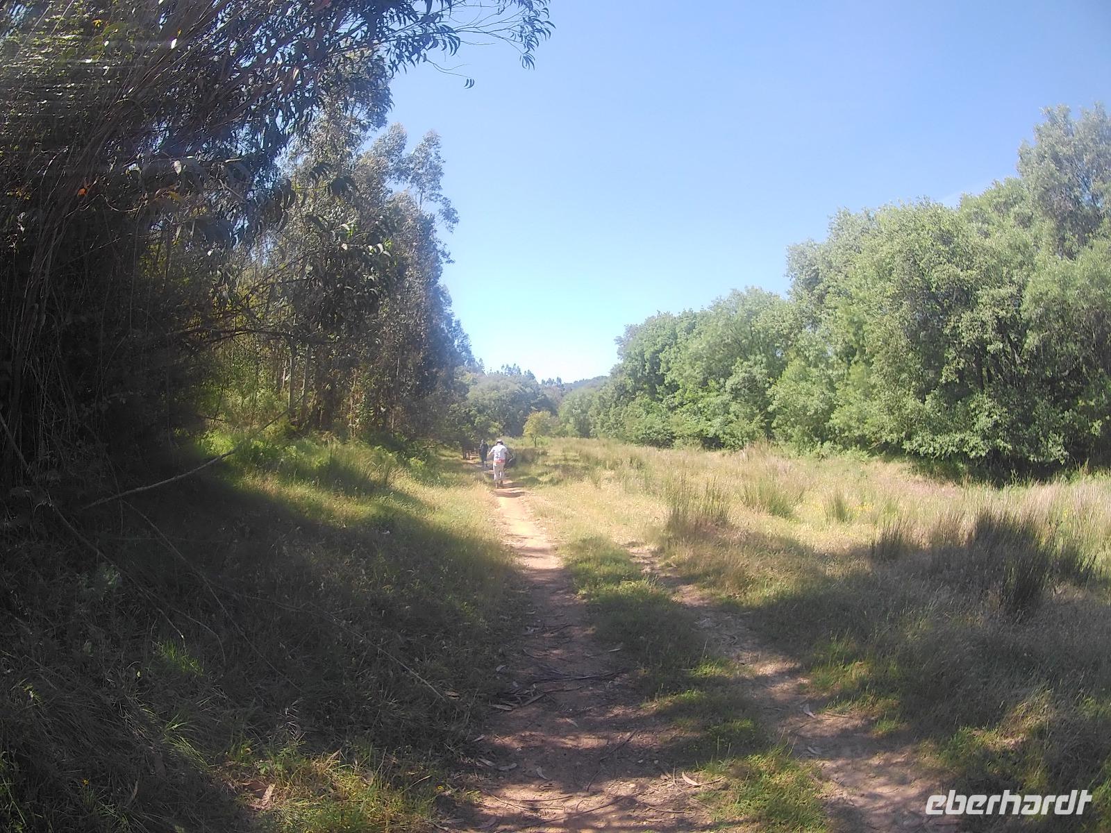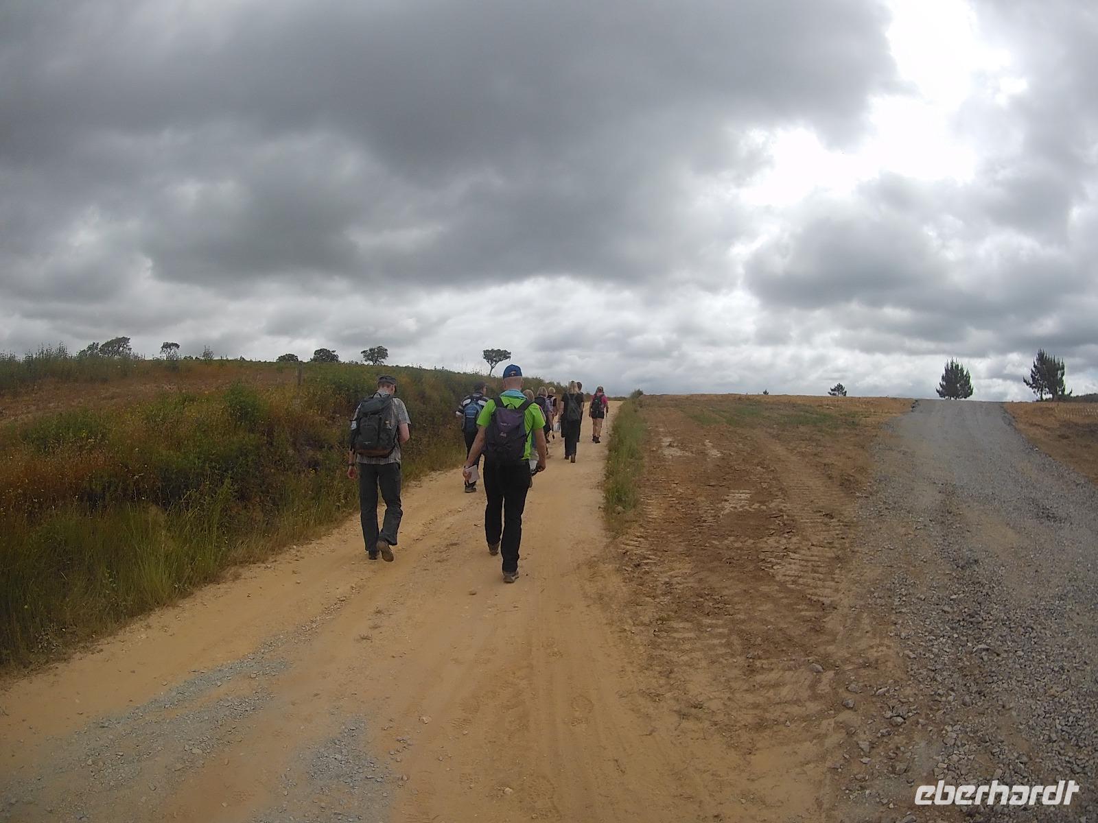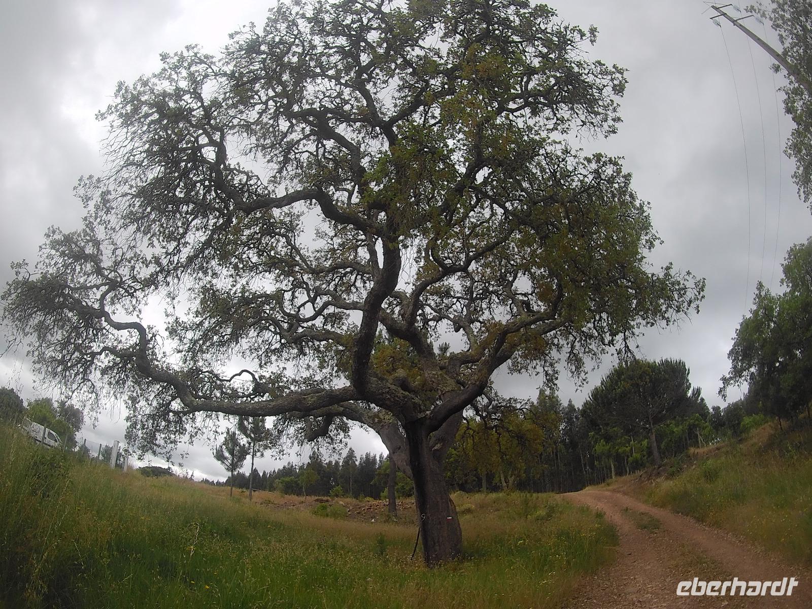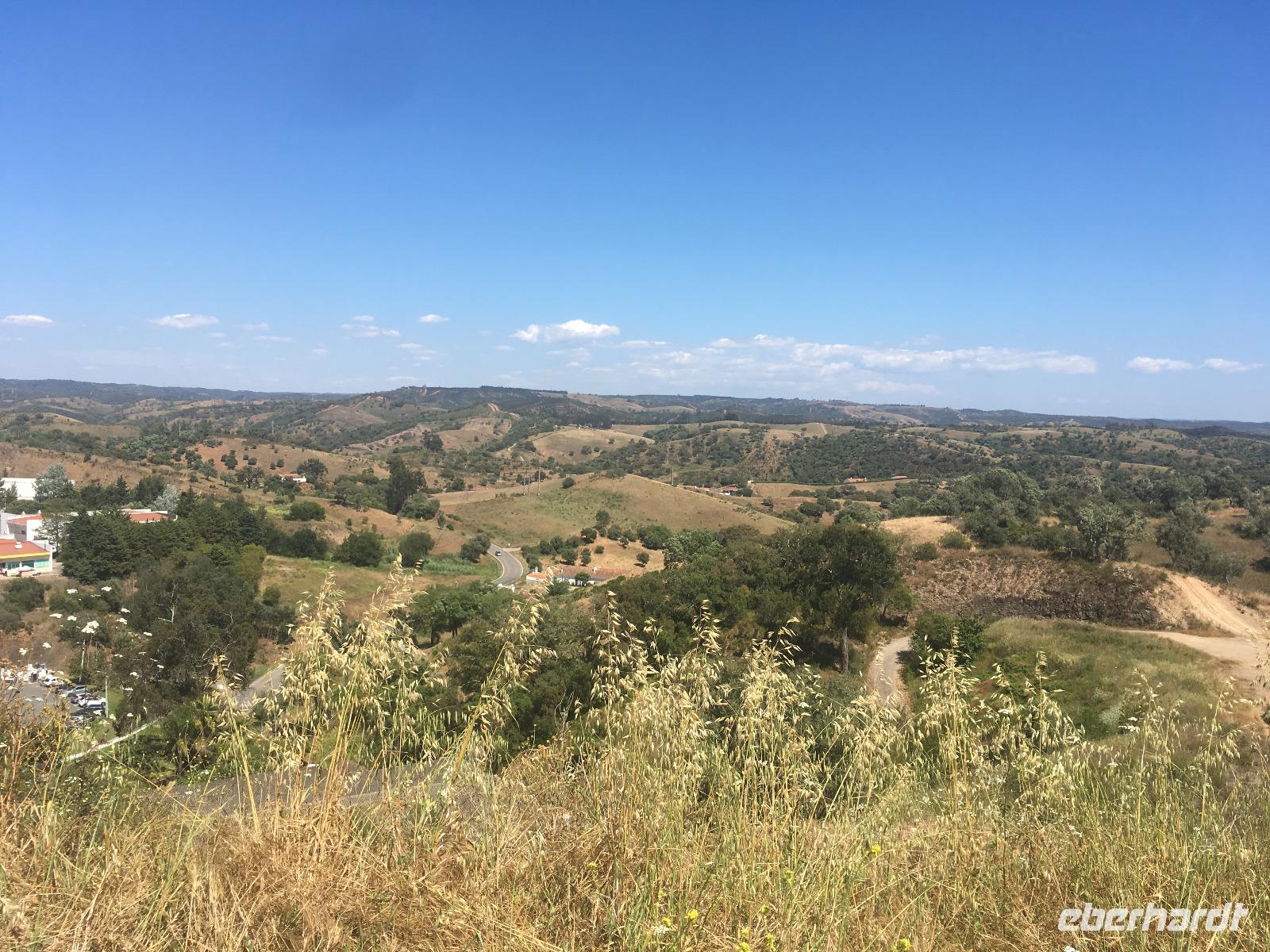 Die 15 Kilometer von gestern wurden von allen gut verkraftet und so konnten wir frisch und munter in diesen Tag starten. Holger hat uns ein tolles Picknick versprochen, welches uns antrieb. Nach einem kurzen Transfer erreichen wir Sao Teotonio, einen kleinen Ort im Inland von Alentejo. Von hier aus wanderten wir gemeinsam mit Larissa entlang von Eukalyptus-Plantagen und vielen Korkeichen. Beides wichtige Nutzpflanzen hier in Portugal. Der Eukalyptus wird zur Papierherstellung genutzt. Er wächst sehr schnell und kann daher aller acht bis zwölf Jahre abgeholzt werden. Jedoch brauch er auch viel Wasser, die Wurzeln reichen tief ins Erdreich und verdrängt daher einheimische Baumarten.