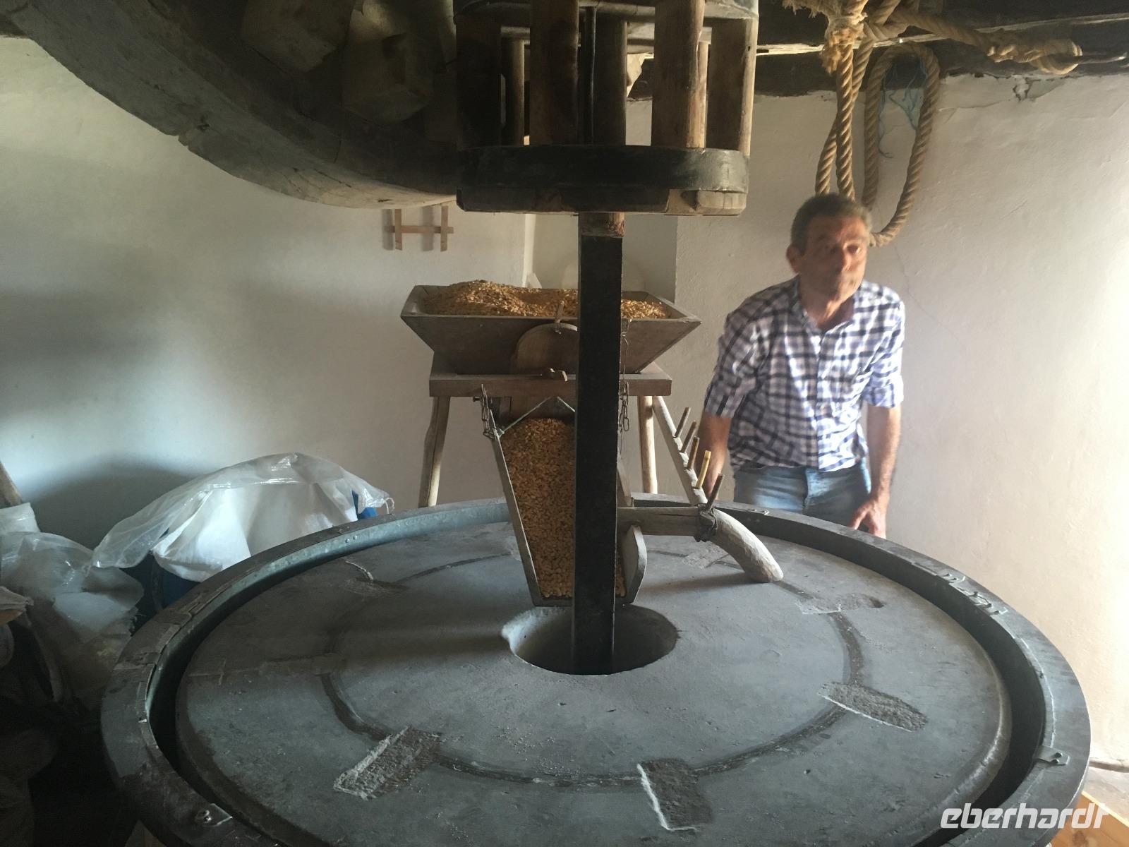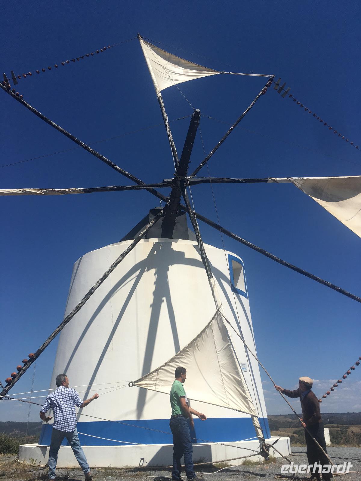 Im Ort Odemira erwartet uns bereits der ortsansässige Müller an der kleinen Mühle auf dem Berg. Dank des kräftiges Windes können wir hier sehen, wie frisches Mehl gemahlen wird. Die Mühle ist schon lange im Familienbesitz und wird hauptsächlich für die Versorgung der Dorfbewohner genutzt. Viele Bauern bringen ihr Getreide hier her,um es mahlen zu lassen.