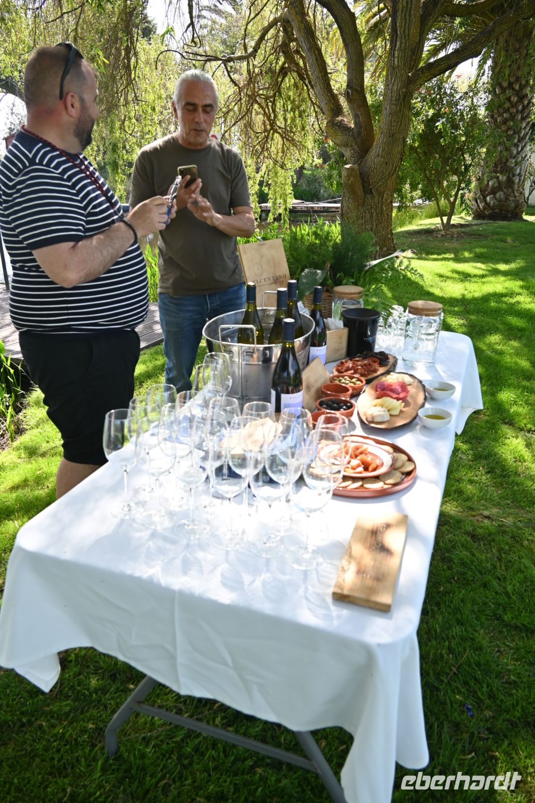 Gegen 16 Uhr haben wir noch eine Verabredung mit Holger. Gar nicht weit weg erstrecken sich 30 Hektar Weinanbaugebiet mit den unterschiedlichsten Weinsorten. Fünf davon dürfen wir probieren und jeder findet seinen eigenen Favoriten. Die Probe wurde für uns unter einer Weide im Garten direkt am See aufgebaut. Kleine landestypische Snacks werden ebenfalls gereicht. So kann man es sich gut gehen lassen!