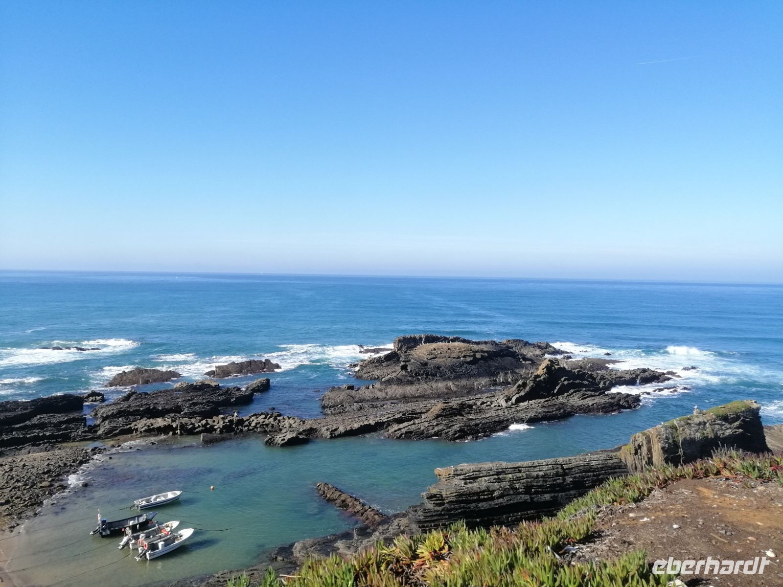Erfrischt setzten wir unsere Wanderung durch die unberührte Steilküste fort und ließen uns von der rauen Schönheit der Landschaft verzaubern. Am Ziel in dem kleinen Fischerdorf Azenha do Mar wartete Holger bereits auf uns. Nach einer entspannten Kaffeepause im charmanten Café Palhinhas brachte er uns zurück zum Landhaus.