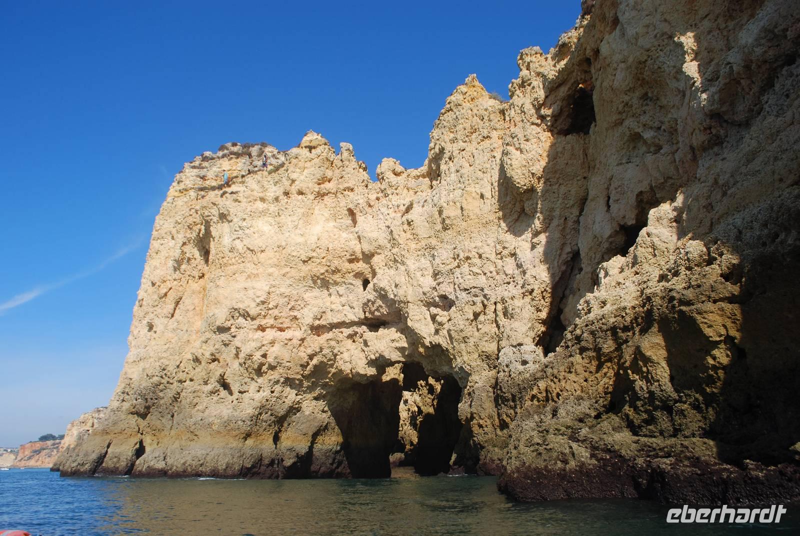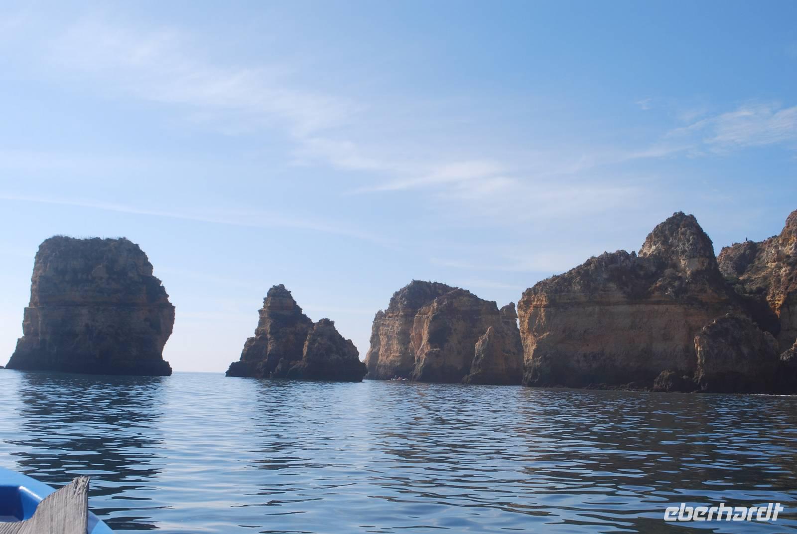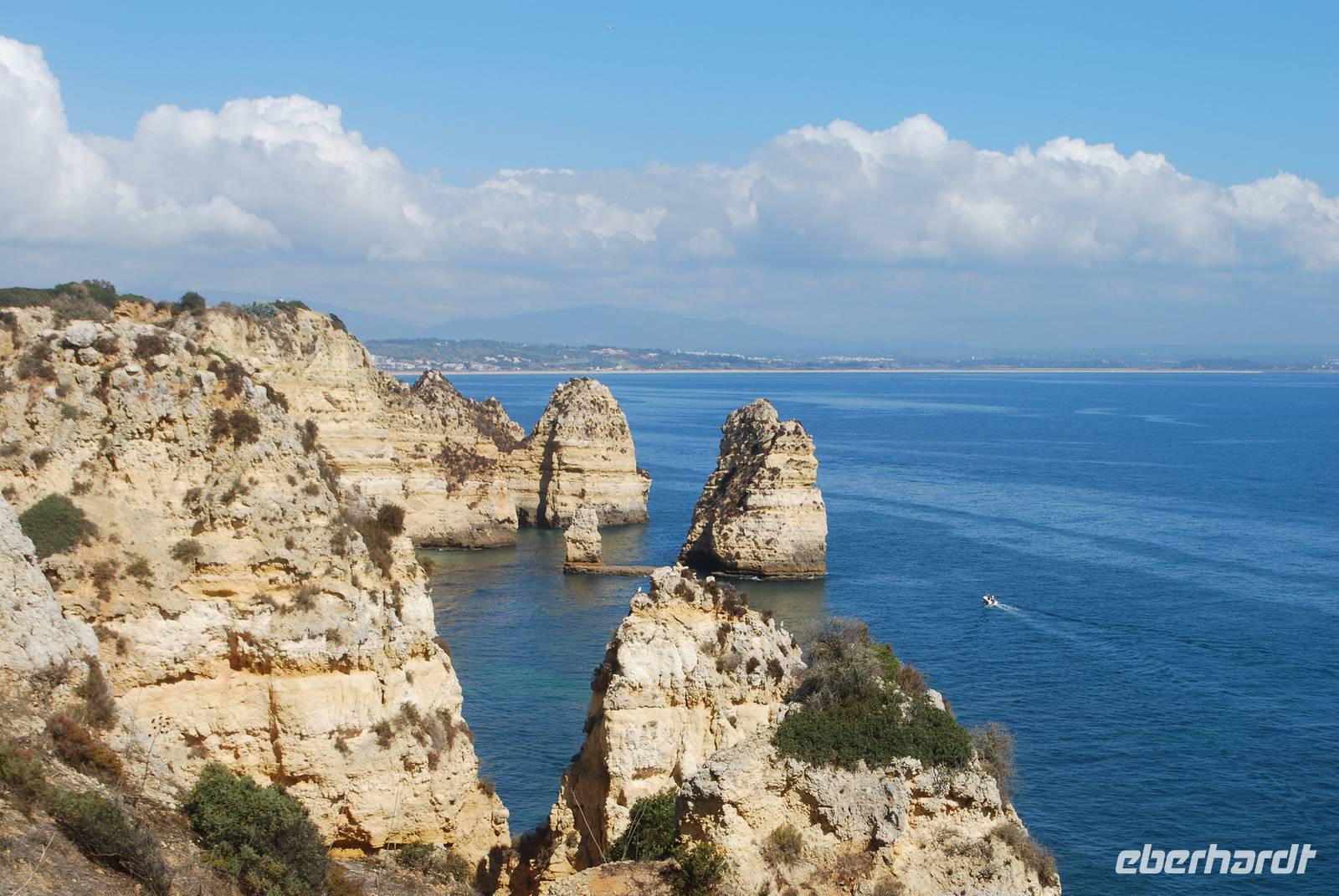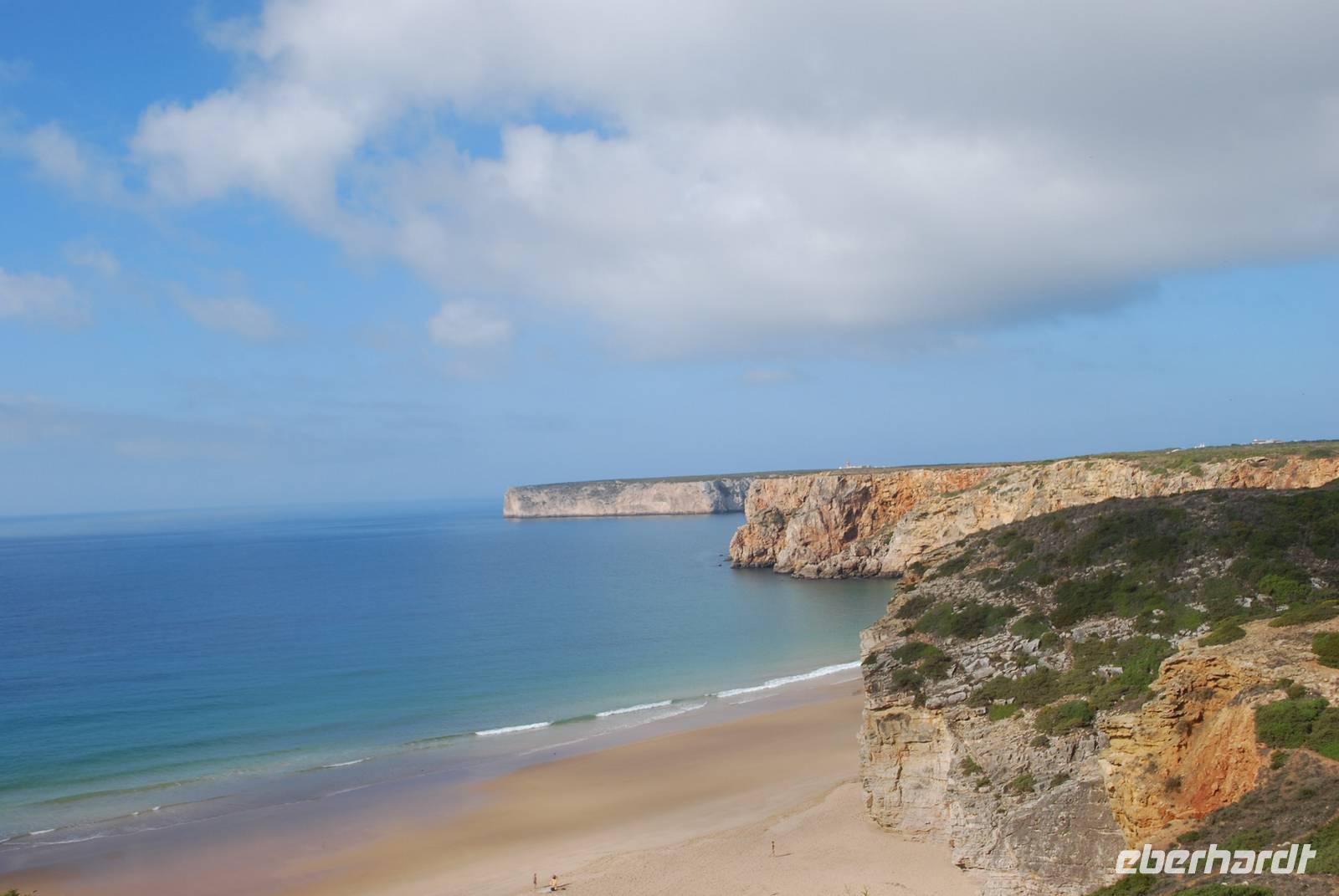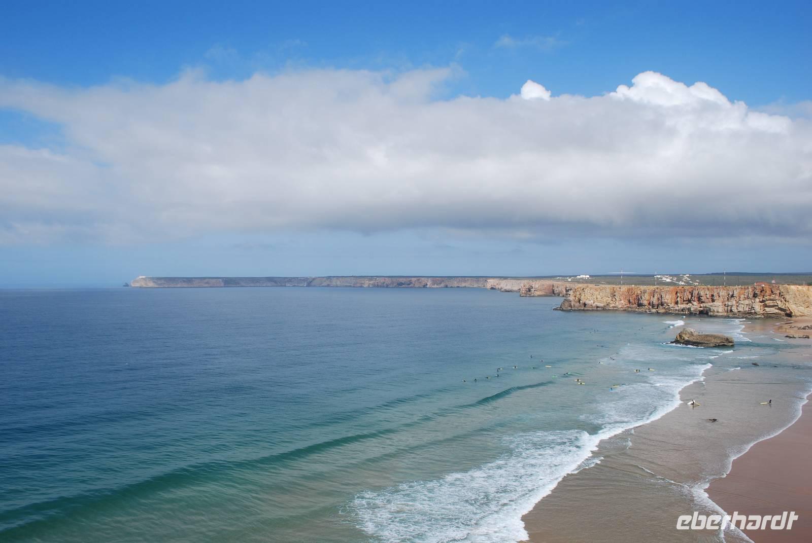 Das Ende der Welt - das Promotorium Sacrum, wie die Römer es nannten - ist der südwestlichste Punkt Europas. Das nächste Stück Erde kommt erst in ca. 5.000 Kilometer: Amerika. Sehr lange trau-ten sich die Europäer nicht westlicher. Und eins muss man sagen: das flache, karge Plateau, das schroff ins Meer stürzt vermittelt tatsächlich den Eindruck, dass die Welt hier aufhört. Heute wissen wir natürlich, dass es ganz anders ist - Christopher Columbus hat Amerika schon seit mehreren Jahrhunderten entdeckt. Die Landschaft und der Blick auf die Felsen und das Meer sind atemberaubend. Der große Leuchtturm, der ganz am Ende vom Kap zu sehen ist, dient immer noch als Orientierungspunkt für die Schifffahrt. Kleiner Tipp - schon lange nicht mehr ein Geheimnis aber trotzdem immer noch lustig - hier können Sie die letzte Bratwurst vor Amerika genießen, serviert von jungen, blonden Frauen, damit man wirklich den Eindruck hat, in Deutschland zu sein. Und natürlich gehört auch zu der Bratwurst ein Zertifikat. Man muss es ja beweisen können, dass es tatsächlich eine richtige Bratwurst war! In Sagres, einem hübschen Örtchen, besuchten wir die Festung vom Infant Henrique. Hier ließ er, vor sehr langer Zeit, eine Seefahrtsschule gründen. Auf dem Rückweg nach Lagos machten wir noch ein Abstecher zu den Felsen der Frömmigkeit - der bekanntesten Felsformation der Algarve, eine durchs Meer zerklüftete Küste mit zahlreichen Grotten und Felsen - bevor wir wieder in unserem schönen Städtchen ankamen. Nach einer wohl verdienten Mittagspause war es nun Zeit auch Lagos kennen zu lernen. Durch interessante Erklärungen von Vitor, der nun für den Rest der Reise unser örtlicher Reiseleiter war, wurde uns die Geschichte der 20.000 Seelen großen Stadt näher gebracht. Da es am Tag zuvor wegen dem Nebel leider nicht viel zu sehen gab, versuchten wir heute erneut unser Glück und fuhren am Nachmittag, allerdings nur mit einem Teil der Gruppe, zur Serra de Monchique, mit 900 Metern das höchste Gebirge der Algarve. Und das Wunder geschah - also teilweise würde ich sagen - denn es gab zwar keinen blauen Himmel und es war an der Küste ein wenig dösig aber man hatte trotzdem einen hervorragenden Blick auf die Region!