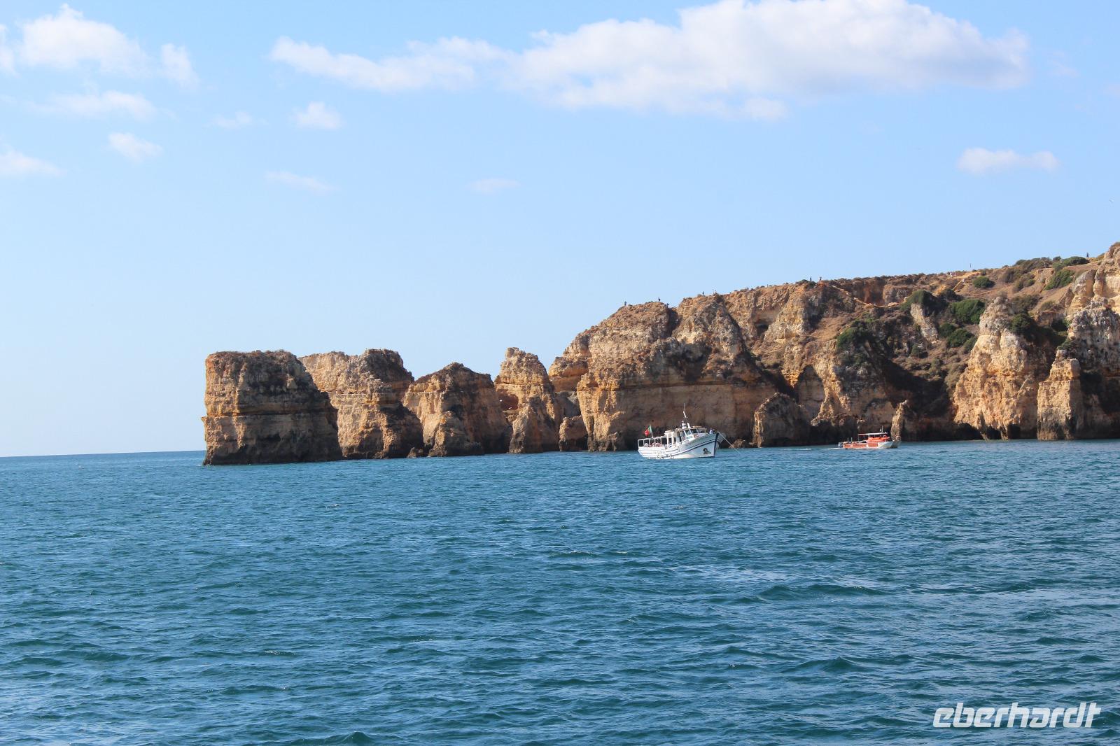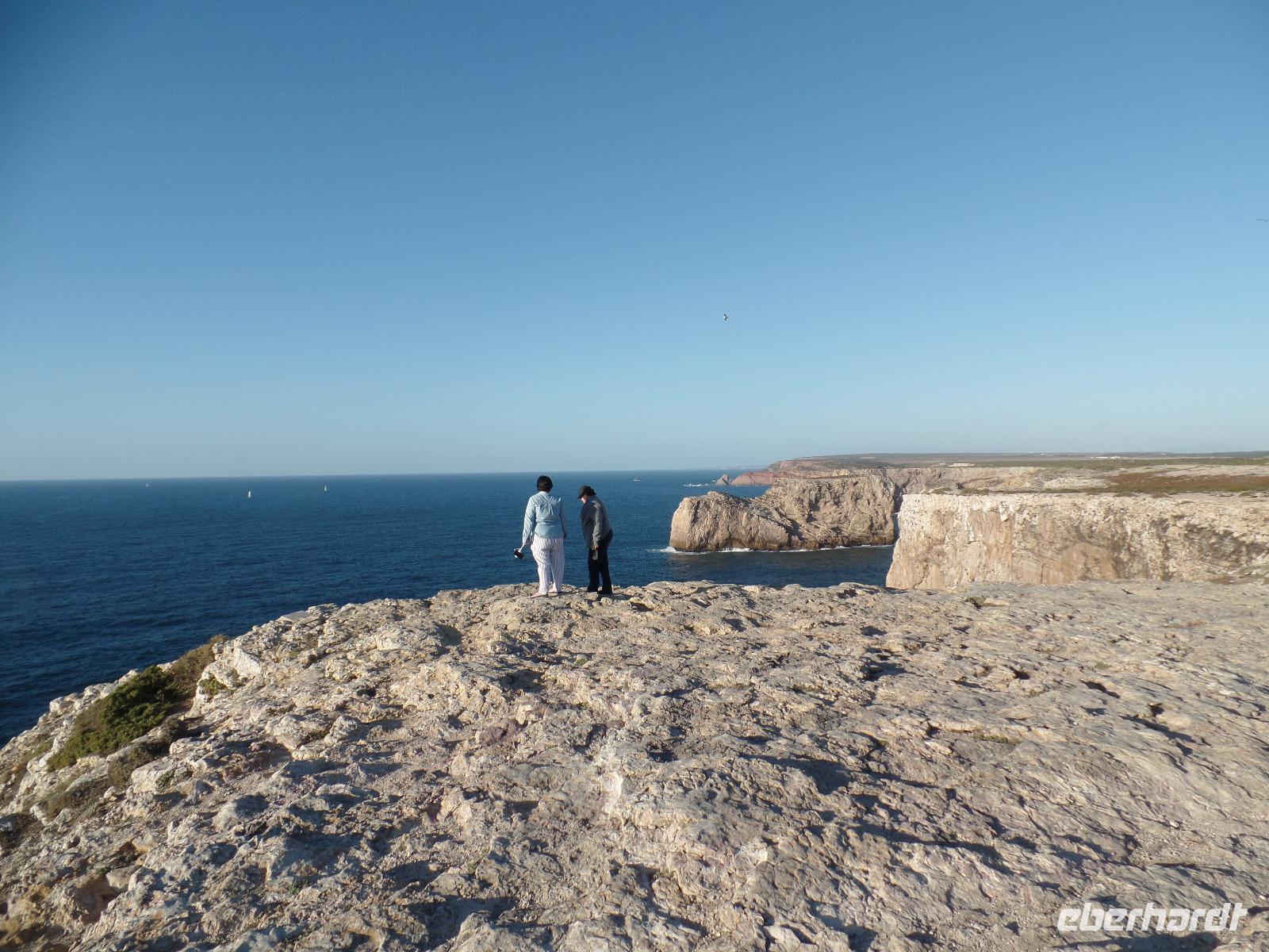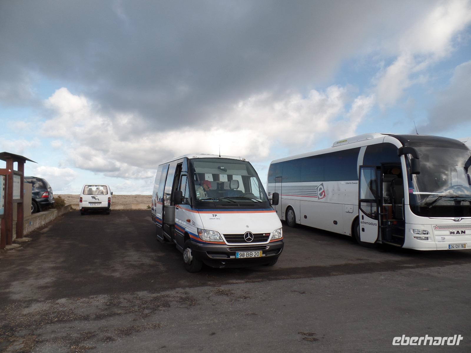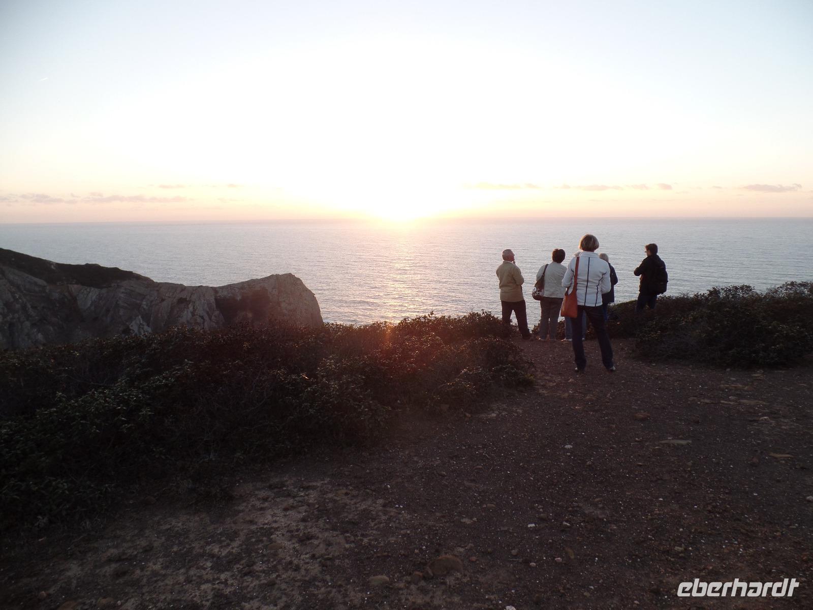 Nachdem wir in den sonnigen Tag mit einem guten Frühstück gestartet sind, spazierten wir zum Hafen von Lagos. Die Bootsleute empfingen uns mit einem lockeren Spruch und schon befanden wir uns auf dem Weg Richtung Meer. Während der Kanalausfahrt zog an uns das Ufer des historischen Lagos mit der Festungsanlage vorbei und wir beschlossen, auf jeden Fall die Markthalle am nächsten Tag besuchen zu wollen. Das Wetter war perfekt für diesen Ausflug. Die sanften Wellen des Meeres, Sonne satt und gute Musik luden uns ein die Seele baumeln zu lassen, während wir an der wunderschönen zerklüfteten Küste der Algarve vorbeifuhren. Die vielen Grotten und bizarren Buchten versetzten uns immer wieder in Staunen. Zur Mittagszeit legten wir den Anker, auch um den kühlen Atlantik zu testen ... wer wollte. Eine über Bord gegangene Mütze wurde auch noch gerettet und dann machte unser Katamaran kehrt und fuhr wieder langsam zurück zum Ausgangspunkt Lagos. Da wo es uns auf Grund der Bootsgröße gestattet war, fuhren wir an die Klippen heran, damit wir sie von Nahem bestaunen konnten. Wieder erholt in Lagos angekommen nutzten einige die Zeit bis zu unserem nächsten Programmpunkt des Tages, um am Hafen Kaffee zu trinken oder bummeln zu gehen. Zwei Stunden später warteten vier Jeeps vor dem Hotel auf uns. Die sahen recht abenteuerlich aus, das Einsteigen war noch abenteuerlicher. ? Die rasante Jeeptour führte uns wieder zum Cabo de Sao Vicente, welches im Licht der untergehenden Sonne ganz anders als am Vortag aussah. Ein weiterer Stopp war an einem einsamen Strand - die tosenden Wellen des Atlantiks mischten sich mit der Gischt, die Sonne tauchte die ganze Gegend in wunderschöne warme Orange- und Gelbtöne - einfach traumhaft. Der Höhepunkt der Tour war die Beobachtung des Sonnenunterganges an einer hohen Klippe, wo man eine atemberaubende Sicht auf die umliegenden Küstenabschnitte hatte. Wir genossen das Naturschauspiel bei Wein und Snack und ein Honigmedronho durfte auch verkostet werden. Der Tag konnte nicht besser ausklingen. Oder doch? Wir vergnügten uns am Abend an der Hotelbar und einige tanzten. Denn Elvis was in the house!
