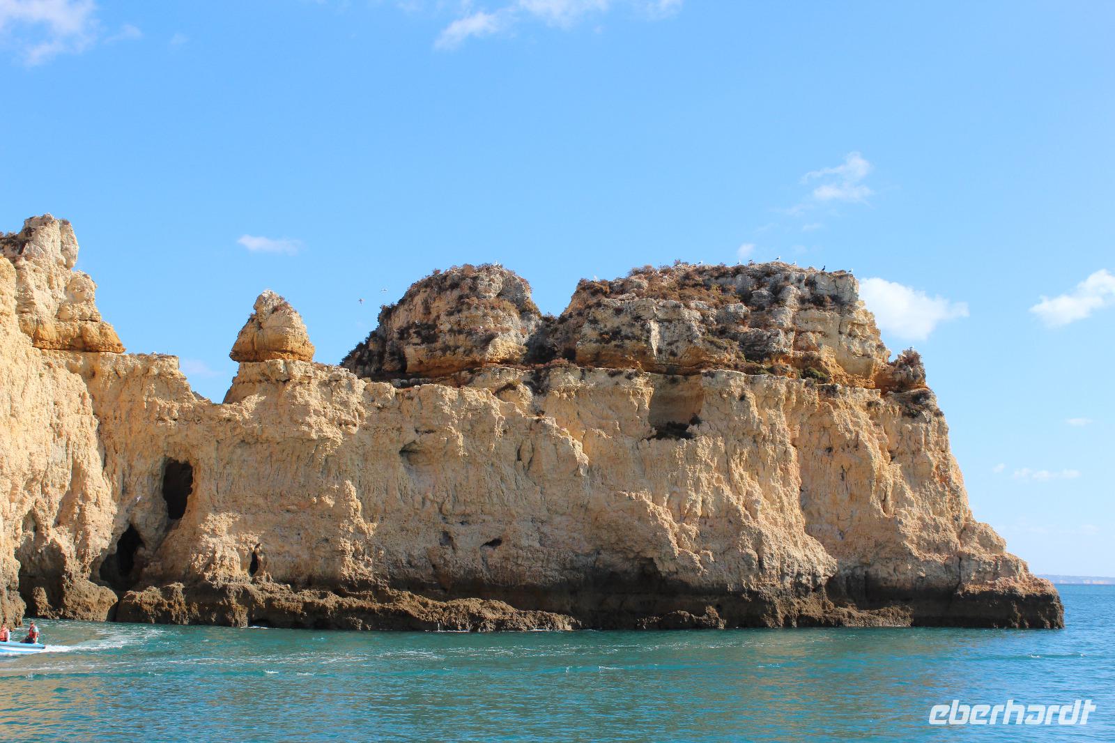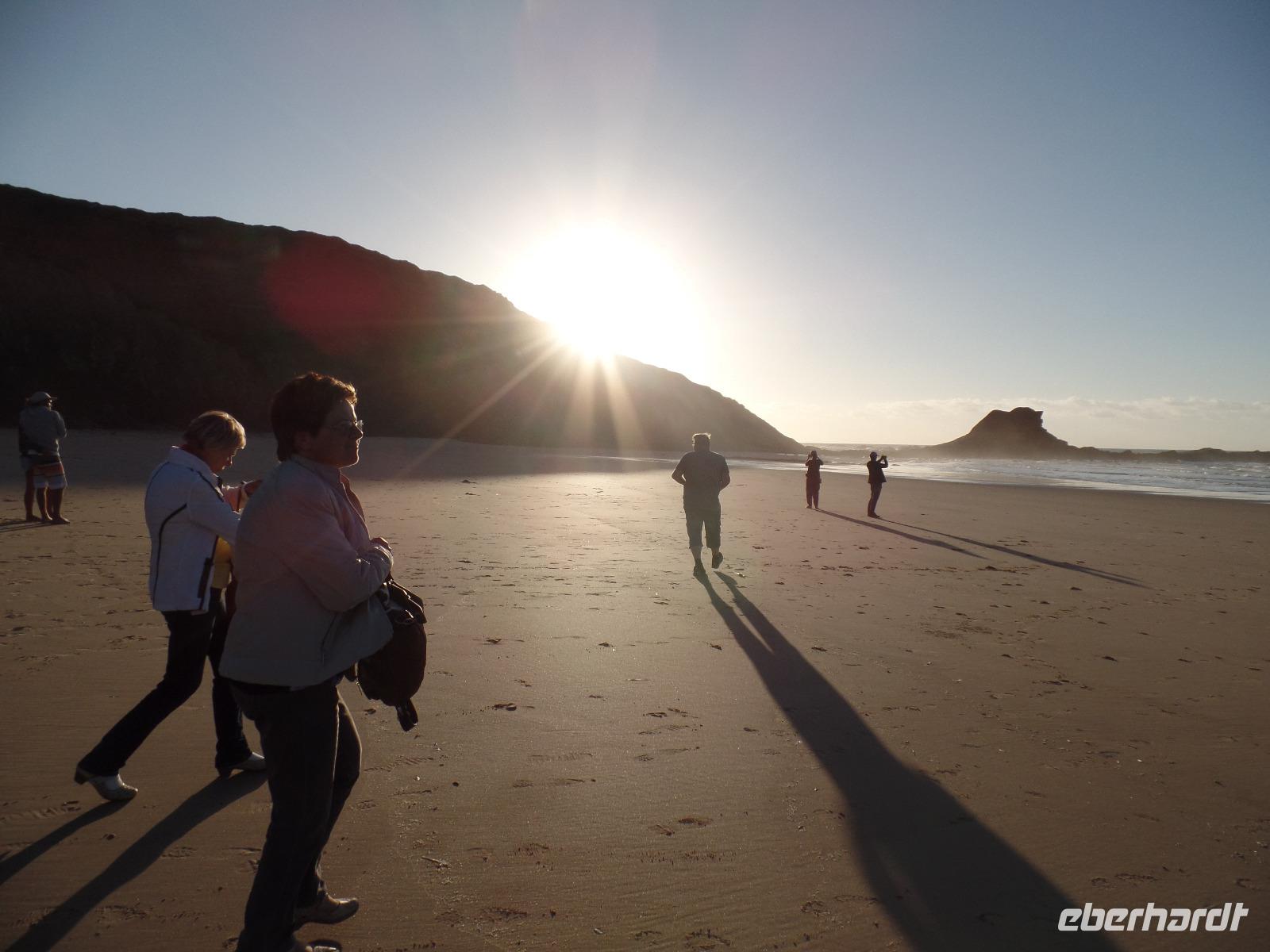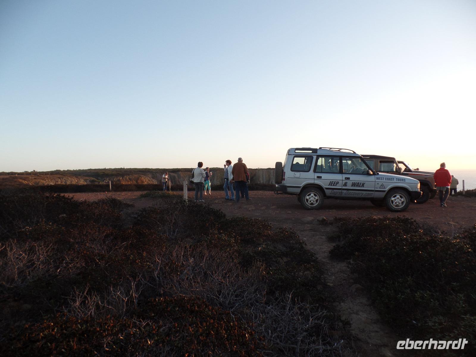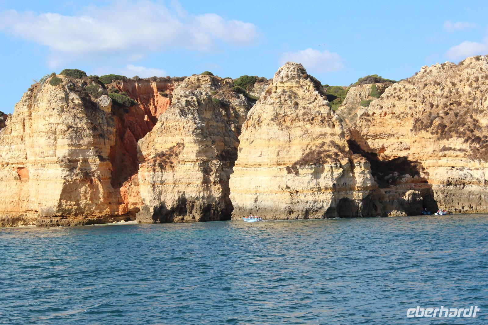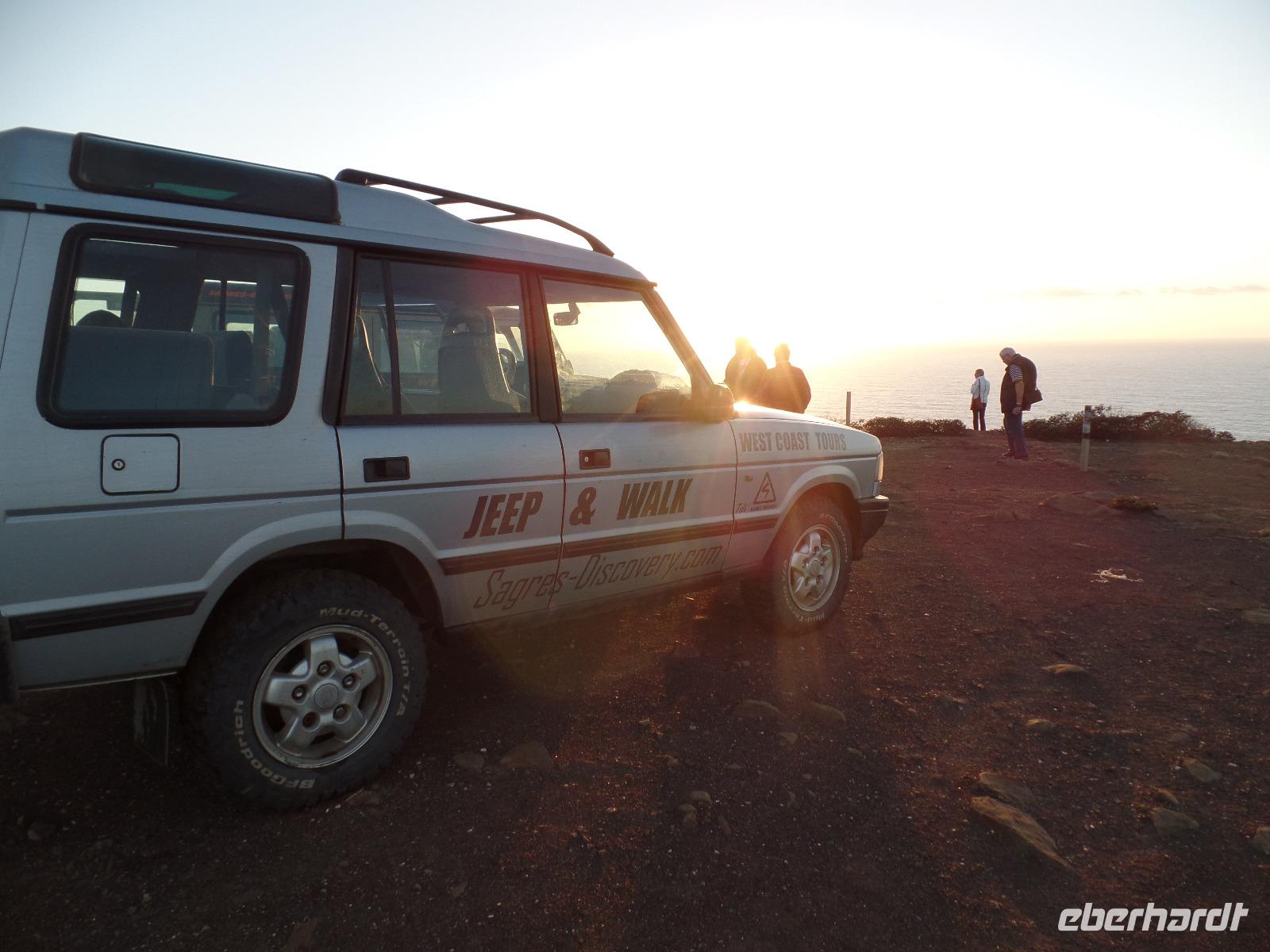 Nachdem wir in den sonnigen Tag mit einem guten Frühstück gestartet sind, spazierten wir zum Hafen von Lagos. Die Bootsleute empfingen uns mit einem lockeren Spruch und schon befanden wir uns auf dem Weg Richtung Meer. Während der Kanalausfahrt zog an uns das Ufer des historischen Lagos mit der Festungsanlage vorbei und wir beschlossen, auf jeden Fall die Markthalle am nächsten Tag besuchen zu wollen. Das Wetter war perfekt für diesen Ausflug. Die sanften Wellen des Meeres, Sonne satt und gute Musik luden uns ein die Seele baumeln zu lassen, während wir an der wunderschönen zerklüfteten Küste der Algarve vorbeifuhren. Die vielen Grotten und bizarren Buchten versetzten uns immer wieder in Staunen. Zur Mittagszeit legten wir den Anker, auch um den kühlen Atlantik zu testen ... wer wollte. Eine über Bord gegangene Mütze wurde auch noch gerettet und dann machte unser Katamaran kehrt und fuhr wieder langsam zurück zum Ausgangspunkt Lagos. Da wo es uns auf Grund der Bootsgröße gestattet war, fuhren wir an die Klippen heran, damit wir sie von Nahem bestaunen konnten. Wieder erholt in Lagos angekommen nutzten einige die Zeit bis zu unserem nächsten Programmpunkt des Tages, um am Hafen Kaffee zu trinken oder bummeln zu gehen. Zwei Stunden später warteten vier Jeeps vor dem Hotel auf uns. Die sahen recht abenteuerlich aus, das Einsteigen war noch abenteuerlicher. ? Die rasante Jeeptour führte uns wieder zum Cabo de Sao Vicente, welches im Licht der untergehenden Sonne ganz anders als am Vortag aussah. Ein weiterer Stopp war an einem einsamen Strand - die tosenden Wellen des Atlantiks mischten sich mit der Gischt, die Sonne tauchte die ganze Gegend in wunderschöne warme Orange- und Gelbtöne - einfach traumhaft. Der Höhepunkt der Tour war die Beobachtung des Sonnenunterganges an einer hohen Klippe, wo man eine atemberaubende Sicht auf die umliegenden Küstenabschnitte hatte. Wir genossen das Naturschauspiel bei Wein und Snack und ein Honigmedronho durfte auch verkostet werden. Der Tag konnte nicht besser ausklingen. Oder doch? Wir vergnügten uns am Abend an der Hotelbar und einige tanzten. Denn Elvis was in the house!