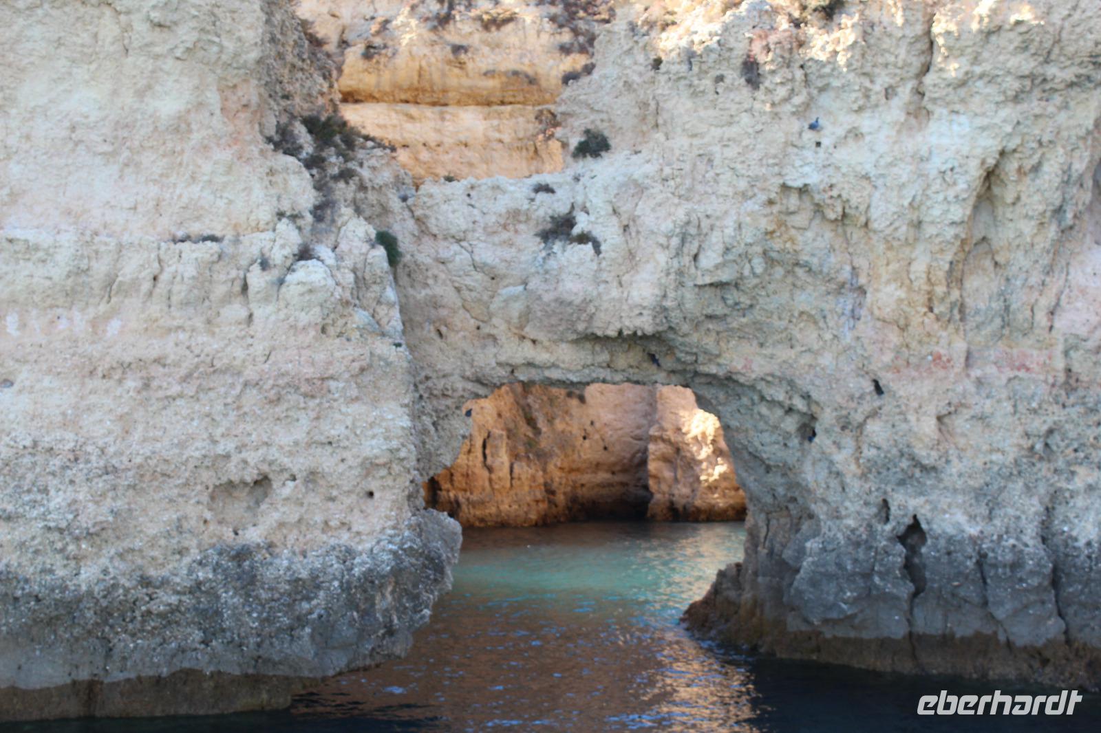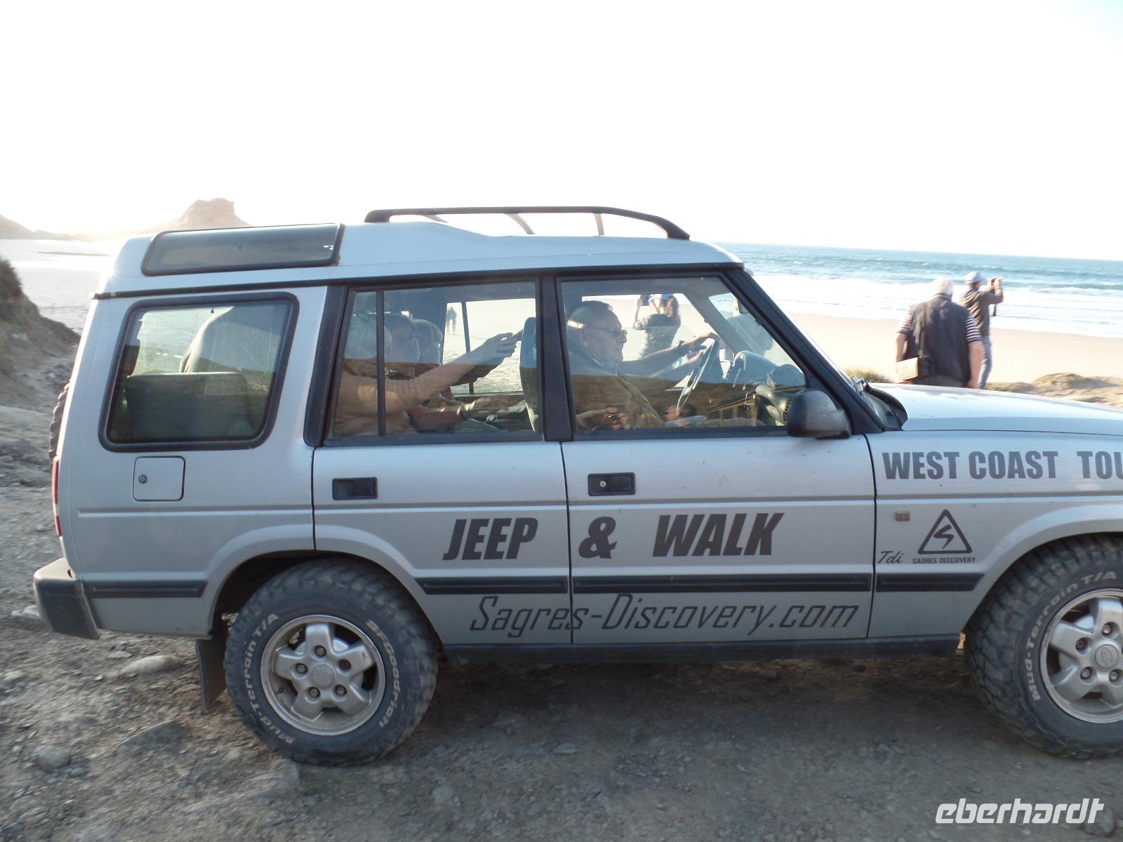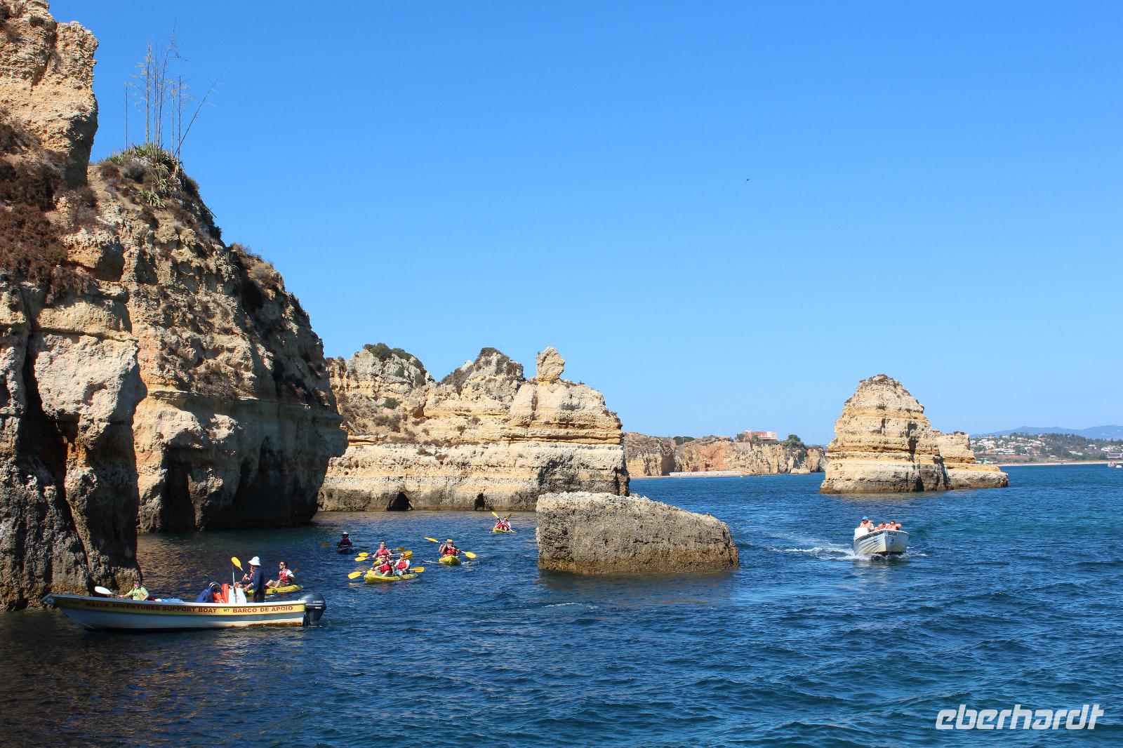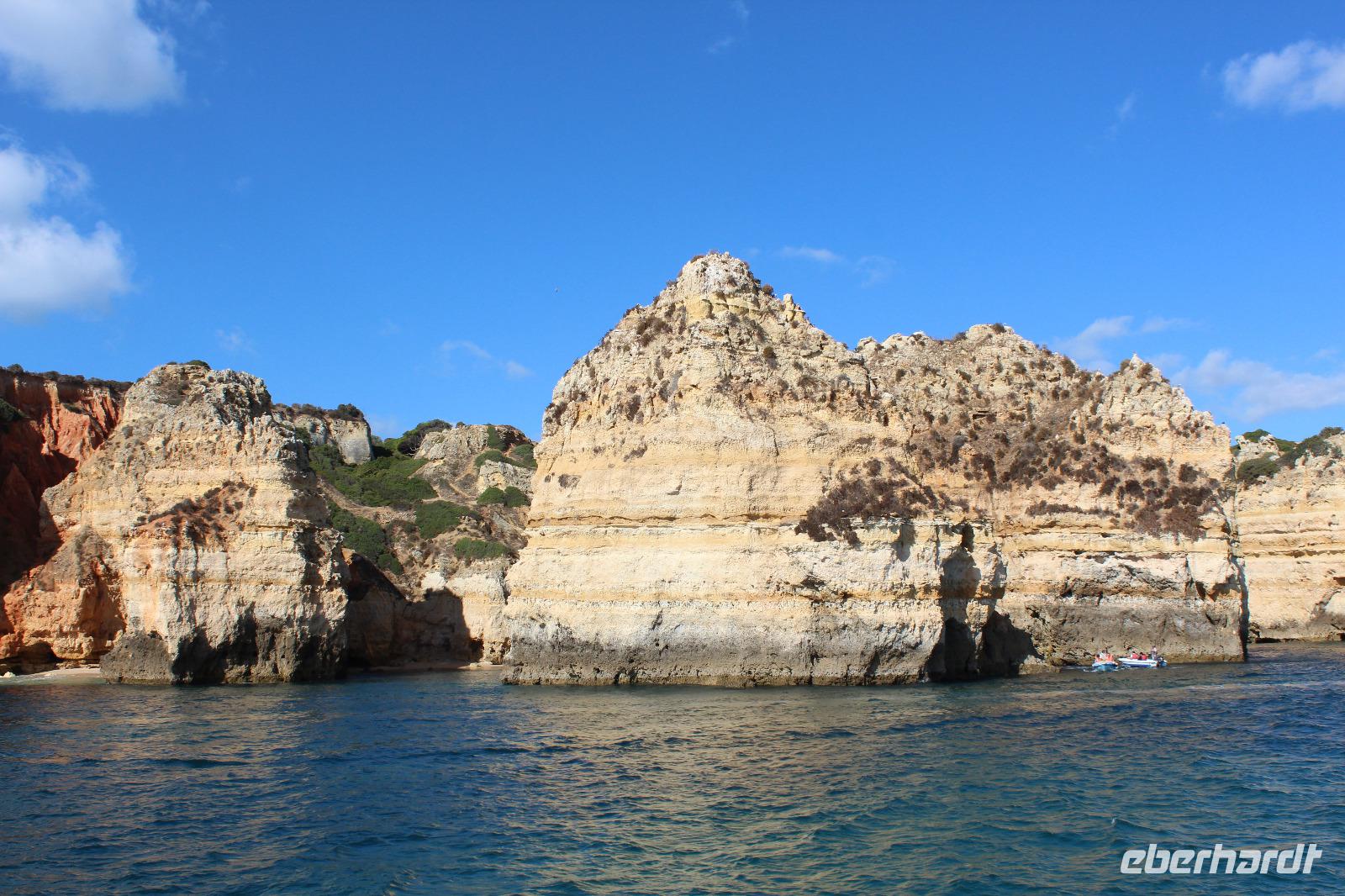 Nachdem wir in den sonnigen Tag mit einem guten Frühstück gestartet sind, spazierten wir zum Hafen von Lagos. Die Bootsleute empfingen uns mit einem lockeren Spruch und schon befanden wir uns auf dem Weg Richtung Meer. Während der Kanalausfahrt zog an uns das Ufer des historischen Lagos mit der Festungsanlage vorbei und wir beschlossen, auf jeden Fall die Markthalle am nächsten Tag besuchen zu wollen. Das Wetter war perfekt für diesen Ausflug. Die sanften Wellen des Meeres, Sonne satt und gute Musik luden uns ein die Seele baumeln zu lassen, während wir an der wunderschönen zerklüfteten Küste der Algarve vorbeifuhren. Die vielen Grotten und bizarren Buchten versetzten uns immer wieder in Staunen. Zur Mittagszeit legten wir den Anker, auch um den kühlen Atlantik zu testen ... wer wollte. Eine über Bord gegangene Mütze wurde auch noch gerettet und dann machte unser Katamaran kehrt und fuhr wieder langsam zurück zum Ausgangspunkt Lagos. Da wo es uns auf Grund der Bootsgröße gestattet war, fuhren wir an die Klippen heran, damit wir sie von Nahem bestaunen konnten. Wieder erholt in Lagos angekommen nutzten einige die Zeit bis zu unserem nächsten Programmpunkt des Tages, um am Hafen Kaffee zu trinken oder bummeln zu gehen. Zwei Stunden später warteten vier Jeeps vor dem Hotel auf uns. Die sahen recht abenteuerlich aus, das Einsteigen war noch abenteuerlicher. ? Die rasante Jeeptour führte uns wieder zum Cabo de Sao Vicente, welches im Licht der untergehenden Sonne ganz anders als am Vortag aussah. Ein weiterer Stopp war an einem einsamen Strand - die tosenden Wellen des Atlantiks mischten sich mit der Gischt, die Sonne tauchte die ganze Gegend in wunderschöne warme Orange- und Gelbtöne - einfach traumhaft. Der Höhepunkt der Tour war die Beobachtung des Sonnenunterganges an einer hohen Klippe, wo man eine atemberaubende Sicht auf die umliegenden Küstenabschnitte hatte. Wir genossen das Naturschauspiel bei Wein und Snack und ein Honigmedronho durfte auch verkostet werden. Der Tag konnte nicht besser ausklingen. Oder doch? Wir vergnügten uns am Abend an der Hotelbar und einige tanzten. Denn Elvis was in the house!