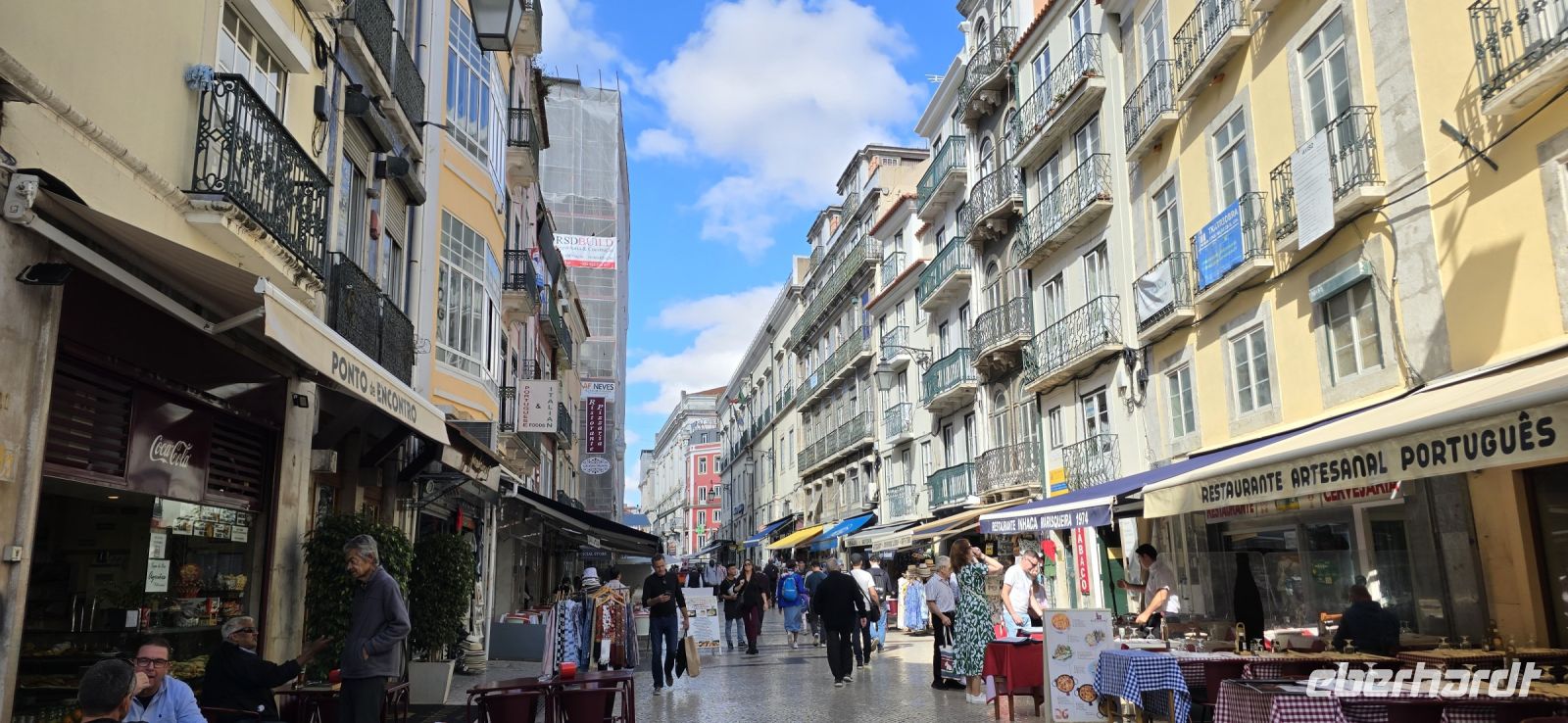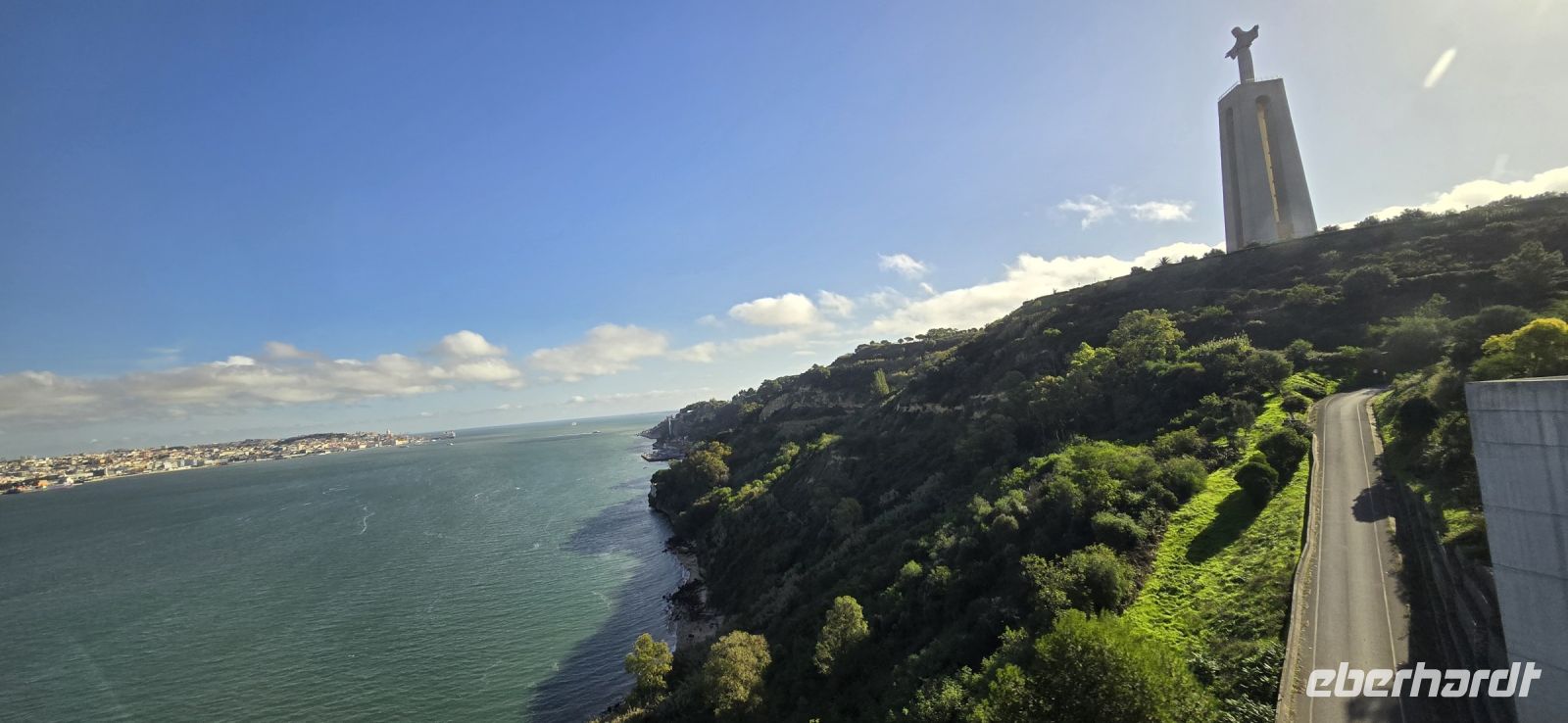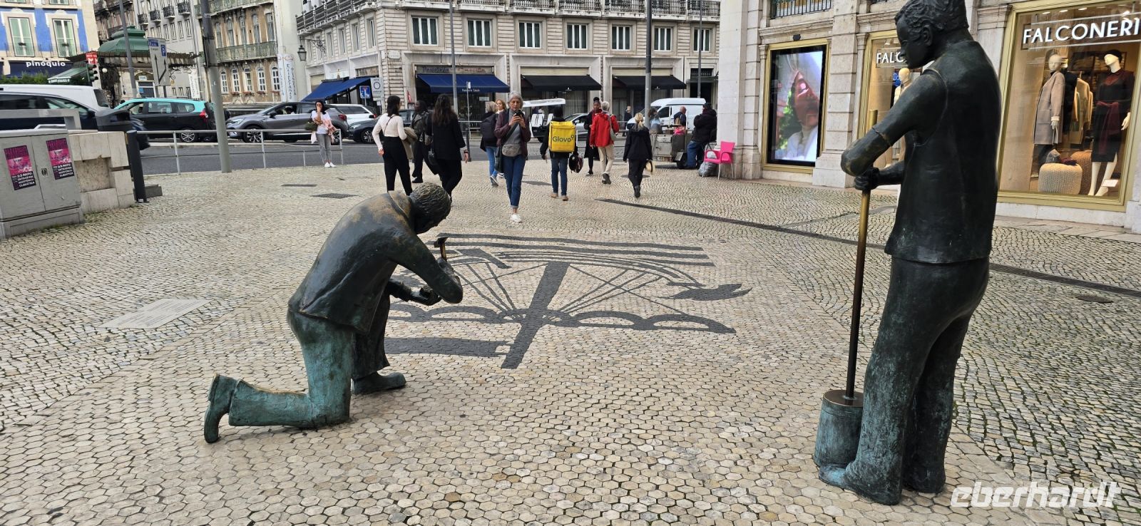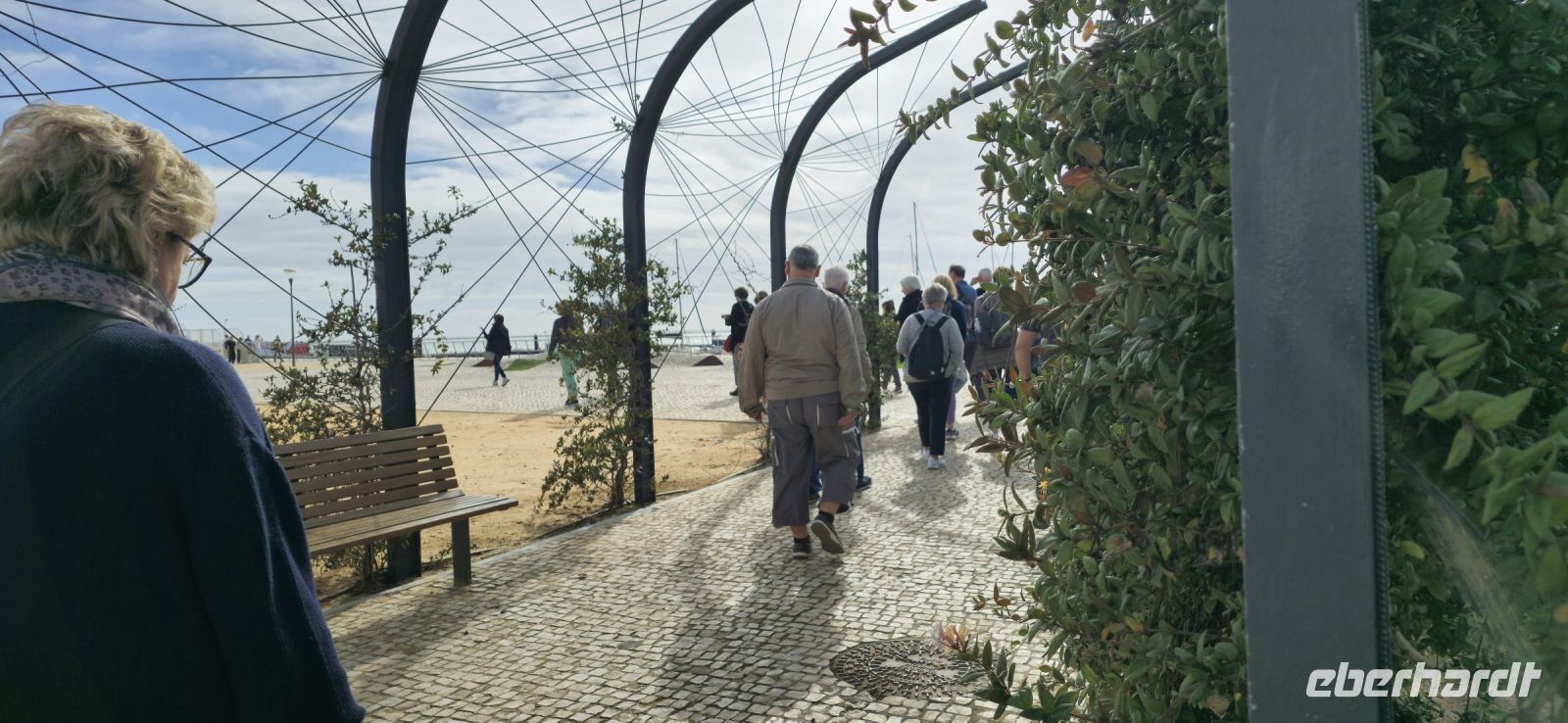 Für die Lissabon-Fahrer geht es heute sehr zeitig los, Frühstück muss ausfallen, dafür gibt es ein Frühstück to go. Um diese Zeit ist sogar Fatima ganz ruhig und läßt uns noch ein wenig schlafen. Nach knapp 2 Stunden machen wir Pause auf einem Rasthof, ein guter Caffe tut gut und auch ein Toast kann nicht schaden. Es ist hell geworden draussen und so können wir die Landschaften sehen, Reisfelder weichen Pinienwäldern, Korkeichenplantagen sind da und auch Orangen- und Zitronenbäume. Wie geplant kommen wir in Lissabon an, der angekündigte Stau hat sich aufgelöst und wir können über die alte Brücke fahren. Hoch über uns grüßt die Jesus-Statue- Willkommen in Lissabon. Von der Brücke aus können wir den Hafen und die Marina sehen, wir sind im Belem Viertel. Unser Bus findet einen Parkplatz und so werfen wir schon mal einen Blick auf das Hieronymus-Kloster. Es strahlt weiß in der Sonne, fast blendet es schon. Das Südportal besticht mit Figuren und Steinmetzarbeiten, einfach atemberaubend. Als die Klöster im Land aufgelöst wurden durften die Mönche hier bleiben, sie mußten sich aber nach einer Einnahmequelle umsehen, ihr Besitz war konfisziert worden. So eröffneten sie eine Pastetenbäckerei, die noch heute die berühmten Pasteis des Belem verkaufen. Die holen wir uns natürlich, eine schöne Überraschung für unsere Gäste. Zudem schaffte es Fatima, dass wir hineingehen durften, einfach riesig, diese einzelnen Cafebereiche, und so schöne Azulejos überall. Nach dieser ShiShi-Pause (wie Fatima es immer nannte) gehen wir durch den Park und verspeisen unsere Pasteis. So lecker! Zum Fluss Tejo kommen wir durch die Unterführung, sie führt unter die Gleise entlang und wir stehen auf dem Platz des Padrão dos Descobrimentos, des Entdecker-Denkmals. Eine riesige Windrose vor dem Denkmal zeigt im Innern ein aufgeschlagenes Buch mit der Weltkarte. Hier demonstriert uns Fatima, wie Portugal und Spanien die Welt unter sich aufgeteilt hatten. Neben dem Denkmal begannen gerade zwei Künstler ihre Flamenco Darbietung- wow, eine tolle Überraschung. Dann geht es zurück zum Bus und direkt in die Stadt. Am Platz der Restauratoren steigen wir aus, hier wird uns der Bus später auch wieder abholen. Das Hard Rock Cafe ist da eine gute Orientierung. Dann schlendern wir durch die Gassen Lissabons, Fatima führt uns in einen unscheinbaren Hauseingang, die Treppen hinauf und wow- stehen wir in einem lichterfüllten Innenhof voller Blumen, Palmen, Figuren und Azulejos an den Wänden. Was für eine Überraschung. Weiter geht unser Bummel, die Läden und Shops laden ein, Bacalhau wird hier angebote, der traditionelle getrocknete Kabeljau, hier Korkprodukte, dort ein Cafe...Vom Praça da Figueira haben wir einen tollen Blick auf die Burg und dann geht es hinauf in die Altstadt. Hier oben am Fahrstuhl haben wir einen schönen Blick auf die Stadt zu unseren Füßen. Direkt daneben liegt das alte Kloster, das heute das archäologosche Museum ist, hier im Erdgeschoss ist die Ausstellung zum 50. Jahrestag der Nelkenrevolution zu sehen. Wir spazieren weiter durch die Gassen und da kommt auch schon eine: eine der legendären Straßenbahnen Lissabons um die Ecke. Fatima führt uns bis zum Miradouro de São Pedro de Alcântara, einem großen Platz mit einem tollen Blick auf die Stadt, und gleich daneben fährt die Zahnradbahn hinab zum Patz der Restauratoren. Damit wollen wir unbedingt fahren, wir verabschieden uns in die Freizeit und fahren mit der gelben Elevador da Glória hinab. Was für ein Erlebnis. Mit einigen Gästen bummele ich weiter durch die Stadt hinunter zum Handelsplatz, dem Praça do Comércio. Er liegt direkt am Fluss und gerade fährt ein weiteres Kreuzfahrtschiff bei uns vorbei zum Hafen. Wir beschließen für ein kleines Mittagessen hier zu bleiben und das war eine gute Entscheidung. Und sehr lecker. Am Ufer des Tejo bestaunen wir dann noch Figuren, allerlei Getier wurde hier zum (Sand-)Leben erweckt. Dann bummeln wir retour, durch Nebengassen und genießen die kleinen Shops und Läden. Der Fahrstuhl grüßt - dieses Mal von unten- und lebensgroße Figuren setzen neues Pflaster mit den typischen Ornamenten. So erreichen wir unseren Bus- Fatima hatte schon den "Willkommen zurück- Trunk vorbereitet, natürlich einen Kirschlikör. Damit verabschieden wir uns von Lissabon. Geplant pünktlich verlassen wir die Stadt, um vor dem großen alltäglichen Stau zu sein. Dieses Mal überqueren wir den Tejo über die Vasco da Gama- Brücke. Mit ihren 17,2 Kilometern Länge ist sie die längste Brücke Europas. Am anderen Ufer des Tejo liegen viele kleine Boote, sie warten auf Ebbe und auf die Muscheln, die sie dann fangen können. Und so geht langsam die Sonne unter, die alte Brücke, über die wir heute morgen gefahren sind ist am Horizont zu sehen genauso wie die Christus-Statue. Dann also: auf Wiedersehen Lissabon. Mit einer kleinen Servicepause erreichen wir fast zur Abendessen-Zeit unser Hotel. Punktlandung- wären da nicht die neuen Busgruppen gewesen, die unser Restaurant gestürmt hatten. So mußten wir auf freie Pläze warten. Nun ja, immerhin Zeit, sich mit den anderen Gästen auszutauschen über ihre Erlebnisse heute. Und so saßen wir heute noch lange zusammen, nein, mit dem Schiff ist niemand gefahren, aber wandern waren viele: zur Marina von Albufeira, an den Klippen entlang, an unserer Badebucht waren einige und auch in der Stadt selber waren etliche Gäste unterwegs. So endete ein langer Tag und wieder spielte eine Live-Band in der Bar.