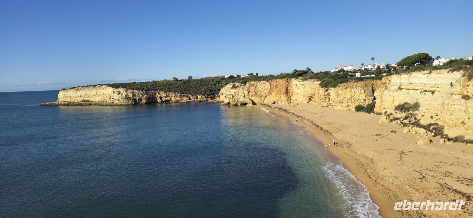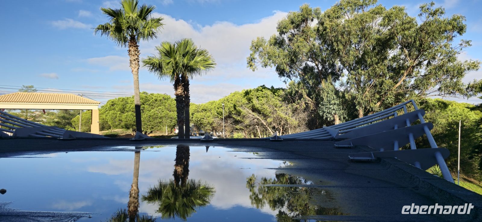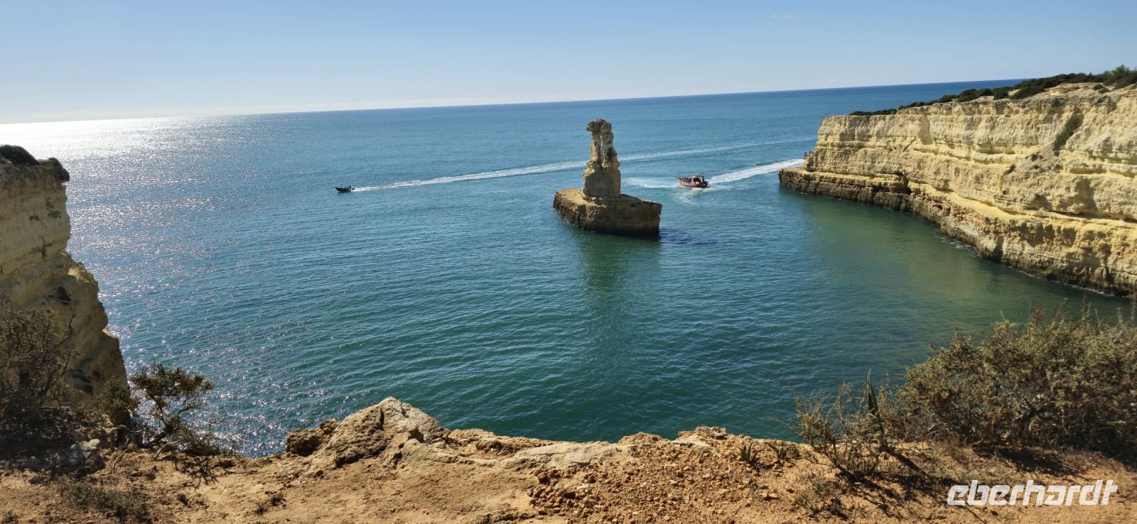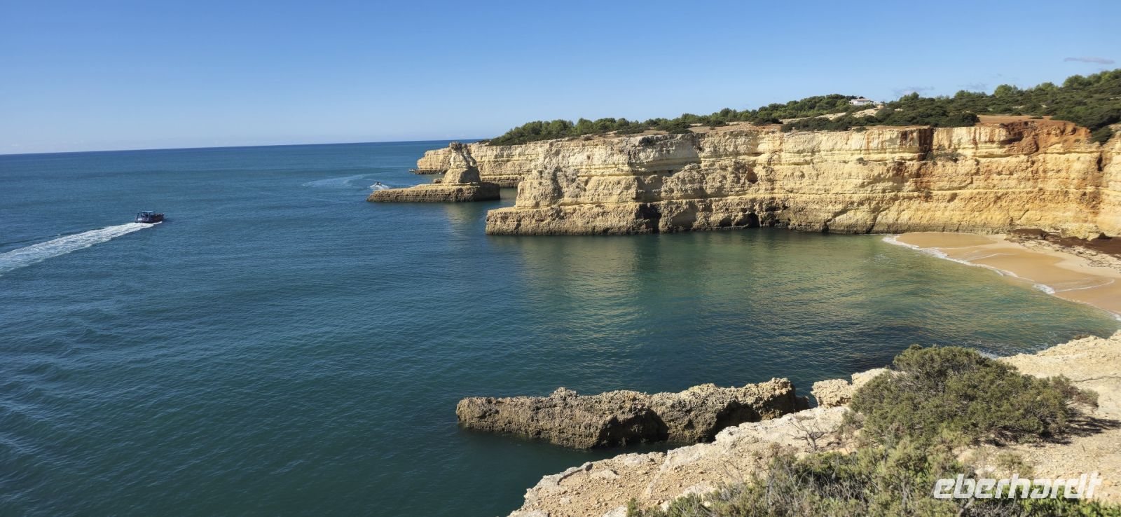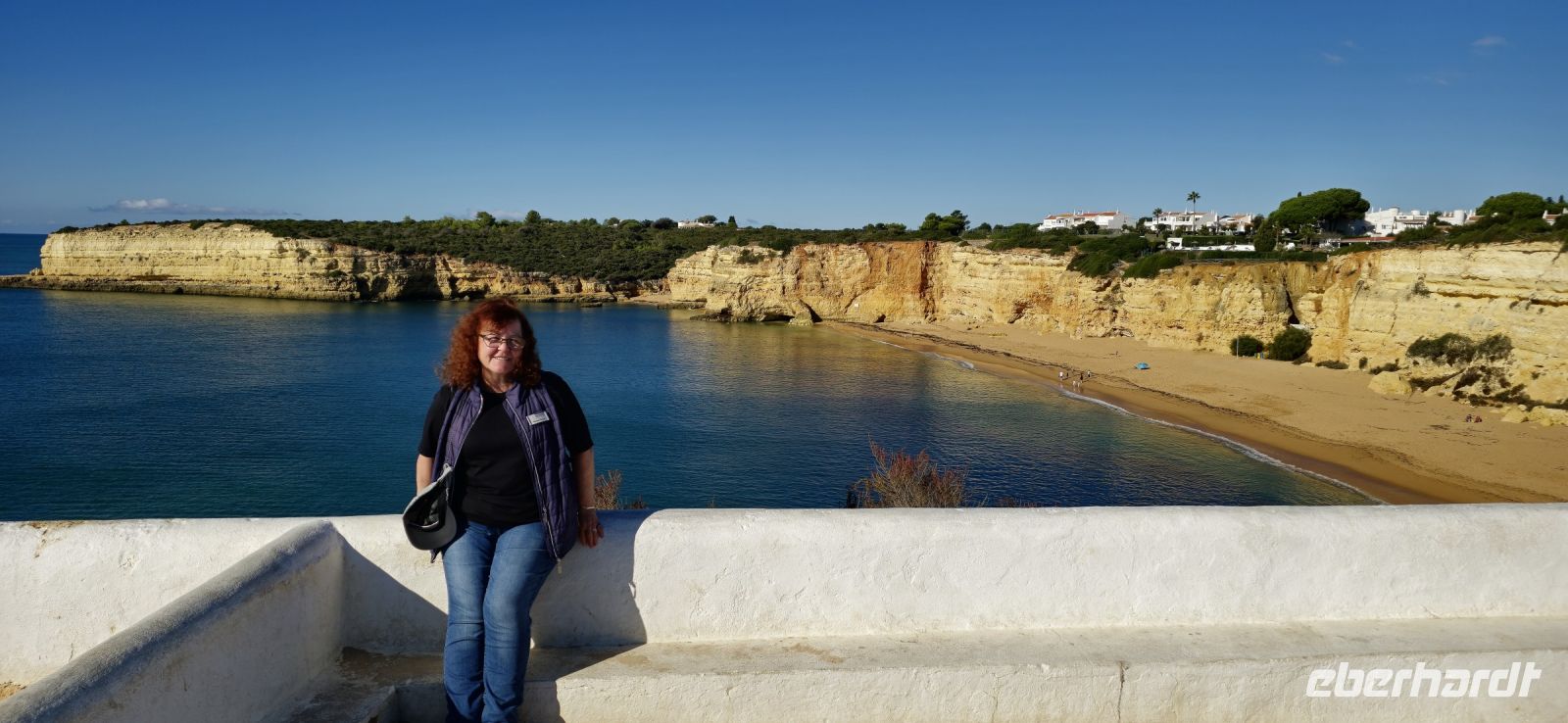 In der Nacht hat es geregnet, am Morgen aber hat wieder die Sonne die Oberhand gewonnen. Letzte dunke Wolken verziehen sich. Wir genießen wieder ein ausgiebiges und gutes Früstück, dann machen sich fast alle Gäste auf zur fakultativen Klippenwanderung. Zunächst geht es mit dem Bus ins benachbarte Armação de Pêra. Hier direkt an den Klippen steht eine kleine Kapelle, die Ermida de Nossa Senhora da Rocha. Ein ausgiebiger Fotostopp ist angesagt, denn der Blick auf die Klippen, die Buchten und das Meer ist umwerfend schön. Hier starten wir auch unsere Wanderung. Fatima macht uns Mut, nur zu Beginn gibt es einen steileren Anstieg, wenn wir den geschafft haben, schaffen wir alles andere auch ;-) Also los, aber so rasch kommen wir nicht vorwärts. Immer wieder müssen wir stehen bleiben und den Blick auf die Felsen und Klippen bewundern. Und da kommt auch schon unser "Aufstieg". Jeder sucht, so gut es geht, einen trittsicheren Pfad, es werden Hände gereicht und aufmunternde Worte sorgen dafür, dass alle gut oben ankommen. Puh! Jetzt geht es immer an den Klippen weiter, der strahlend blaue Himmel zaubert azurblaues Wasser und die Sonne lacht dazu. Viele Boote sind heute unterwegs, hinterlassen helle Gischt-Wellen, verträumte Buchten wechseln sich mit Felsformationen ab, da scheint ein Lemming zu sitzen, dort windet sich das Krokodil entlang...durch einen kleinen Pinienwald geht es und schon geht es wieder bergab, auch hier immer wieder helfende, stützende Hände und viel Lachen. Dann gibt es einen Zaun, an dem wir weiter wandern, zu unsicher sind die Pfade, Doline entdecken wir und manchmal kann man das Wasser unten rauschen hören. Dann hört der Zaun auf, wir wandern weiter, staunen über die Angler, die hier von den Klippen aus angeln, fragen uns, wie sie wohl mit ihrem Mofas hier oben hingekommen sind... Es ist Mittag, als wir Praia da Marinha erreichen, hier gibt es Tische und Bänke die wir sogleich kapern. Unser Bus wartet unweit von hier und mit der Hilfe etlicher Gäste ist rasch alles bei den Tischen, was Fatima und ich vorbereitet hatten: sogar an crushed Eis hatte Fatima gedacht, um den Wein kühl zu halten. Also tafeln wir auf: schneiden Käse- und Wursthäppchen, Oliven vom Bauernmarkt gestern gibt es und frisches Brot, Obst, Wasser, Limo und einen Becher Wein, wer mag. Natürlich auch leckerer Feigenkäse ...(der nur so heißt aber in Wirklichkeit aus getrockneten Feigen und Mandeln besteht). Diese Überraschung kommt super gut an bei den Gästen, alle lassen es sich schmecken. Just als wir aufbrechen wollen zum zweiten Teil unserer Wanderung gibt es einen kleinen Zwischenfall, einer Dame geht es nicht so gut und nach reiflicher Überlegung rufen wir doch die Ambulanz an. Nun heißt es warten. Aber die Damen vom Notdienst waren rasch vor Ort, alle Vitalwerte waren wieder in Ordnung ... es kann weiter gehen. So macht sich eine große Gruppe wieder auf den Weg, während ich mit einer kleinen Gruppe und dem Bus nachfahre. Wir treffen uns in Benagil, bis zum Leuchtturm, wie geplant, schaffen wir es heute nicht mehr. Dafür geht es mit dem Bus nach Cavoeiro. Hier lassen wir den Nachmittag ausklingen, genießen ein Eis oder einen Caffe und die kleine Bucht mit ihren Klippen ringsherum. Dann geht es zurück zum Hotel, wir verabschieden uns für heute von Fatima und Paolo, danke für diesen tollen Tag! Auf dem Dach über der Lobby steht immer noch das Regenwasser und dieses Mal spiegeln sich nicht nur die Palmen darin sondern auch die untergehende Sonne. Das gemeinsame Abendessen bringt uns alle wieder zusammen, wir haben viel zu erzählen, auch unsere drei Gäste, die hier geblieben waren hatten einen schönen Tag, ließen sich verwöhnen bei einer Massage oder besuchten Albufeira. Heute gibt es keine Live-Musik in der Bar, war lassen den Abend ruhig ausklingen.