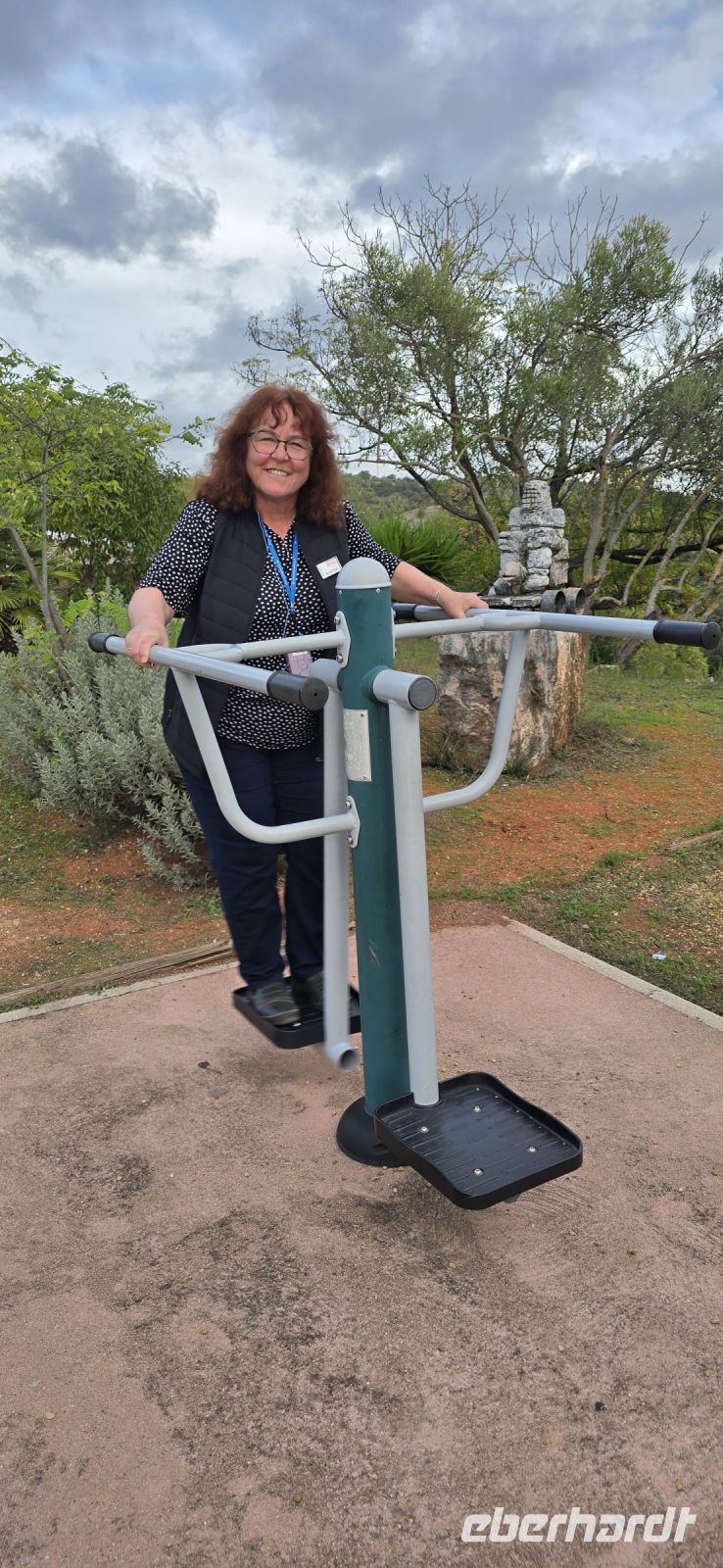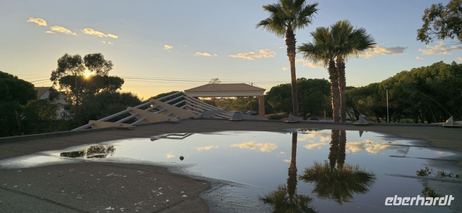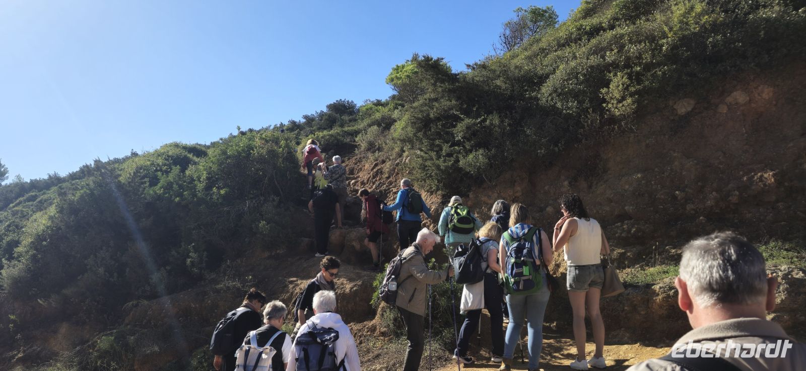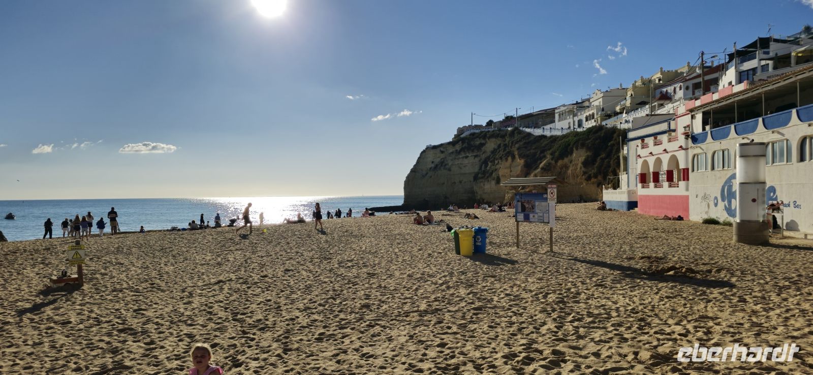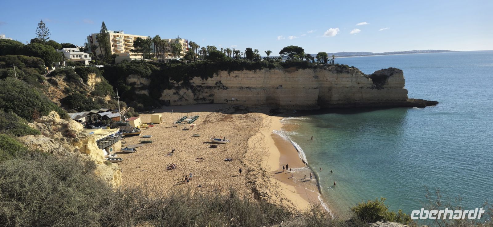 In der Nacht hat es geregnet, am Morgen aber hat wieder die Sonne die Oberhand gewonnen. Letzte dunke Wolken verziehen sich. Wir genießen wieder ein ausgiebiges und gutes Früstück, dann machen sich fast alle Gäste auf zur fakultativen Klippenwanderung. Zunächst geht es mit dem Bus ins benachbarte Armação de Pêra. Hier direkt an den Klippen steht eine kleine Kapelle, die Ermida de Nossa Senhora da Rocha. Ein ausgiebiger Fotostopp ist angesagt, denn der Blick auf die Klippen, die Buchten und das Meer ist umwerfend schön. Hier starten wir auch unsere Wanderung. Fatima macht uns Mut, nur zu Beginn gibt es einen steileren Anstieg, wenn wir den geschafft haben, schaffen wir alles andere auch ;-) Also los, aber so rasch kommen wir nicht vorwärts. Immer wieder müssen wir stehen bleiben und den Blick auf die Felsen und Klippen bewundern. Und da kommt auch schon unser "Aufstieg". Jeder sucht, so gut es geht, einen trittsicheren Pfad, es werden Hände gereicht und aufmunternde Worte sorgen dafür, dass alle gut oben ankommen. Puh! Jetzt geht es immer an den Klippen weiter, der strahlend blaue Himmel zaubert azurblaues Wasser und die Sonne lacht dazu. Viele Boote sind heute unterwegs, hinterlassen helle Gischt-Wellen, verträumte Buchten wechseln sich mit Felsformationen ab, da scheint ein Lemming zu sitzen, dort windet sich das Krokodil entlang...durch einen kleinen Pinienwald geht es und schon geht es wieder bergab, auch hier immer wieder helfende, stützende Hände und viel Lachen. Dann gibt es einen Zaun, an dem wir weiter wandern, zu unsicher sind die Pfade, Doline entdecken wir und manchmal kann man das Wasser unten rauschen hören. Dann hört der Zaun auf, wir wandern weiter, staunen über die Angler, die hier von den Klippen aus angeln, fragen uns, wie sie wohl mit ihrem Mofas hier oben hingekommen sind... Es ist Mittag, als wir Praia da Marinha erreichen, hier gibt es Tische und Bänke die wir sogleich kapern. Unser Bus wartet unweit von hier und mit der Hilfe etlicher Gäste ist rasch alles bei den Tischen, was Fatima und ich vorbereitet hatten: sogar an crushed Eis hatte Fatima gedacht, um den Wein kühl zu halten. Also tafeln wir auf: schneiden Käse- und Wursthäppchen, Oliven vom Bauernmarkt gestern gibt es und frisches Brot, Obst, Wasser, Limo und einen Becher Wein, wer mag. Natürlich auch leckerer Feigenkäse ...(der nur so heißt aber in Wirklichkeit aus getrockneten Feigen und Mandeln besteht). Diese Überraschung kommt super gut an bei den Gästen, alle lassen es sich schmecken. Just als wir aufbrechen wollen zum zweiten Teil unserer Wanderung gibt es einen kleinen Zwischenfall, einer Dame geht es nicht so gut und nach reiflicher Überlegung rufen wir doch die Ambulanz an. Nun heißt es warten. Aber die Damen vom Notdienst waren rasch vor Ort, alle Vitalwerte waren wieder in Ordnung ... es kann weiter gehen. So macht sich eine große Gruppe wieder auf den Weg, während ich mit einer kleinen Gruppe und dem Bus nachfahre. Wir treffen uns in Benagil, bis zum Leuchtturm, wie geplant, schaffen wir es heute nicht mehr. Dafür geht es mit dem Bus nach Cavoeiro. Hier lassen wir den Nachmittag ausklingen, genießen ein Eis oder einen Caffe und die kleine Bucht mit ihren Klippen ringsherum. Dann geht es zurück zum Hotel, wir verabschieden uns für heute von Fatima und Paolo, danke für diesen tollen Tag! Auf dem Dach über der Lobby steht immer noch das Regenwasser und dieses Mal spiegeln sich nicht nur die Palmen darin sondern auch die untergehende Sonne. Das gemeinsame Abendessen bringt uns alle wieder zusammen, wir haben viel zu erzählen, auch unsere drei Gäste, die hier geblieben waren hatten einen schönen Tag, ließen sich verwöhnen bei einer Massage oder besuchten Albufeira. Heute gibt es keine Live-Musik in der Bar, war lassen den Abend ruhig ausklingen.
