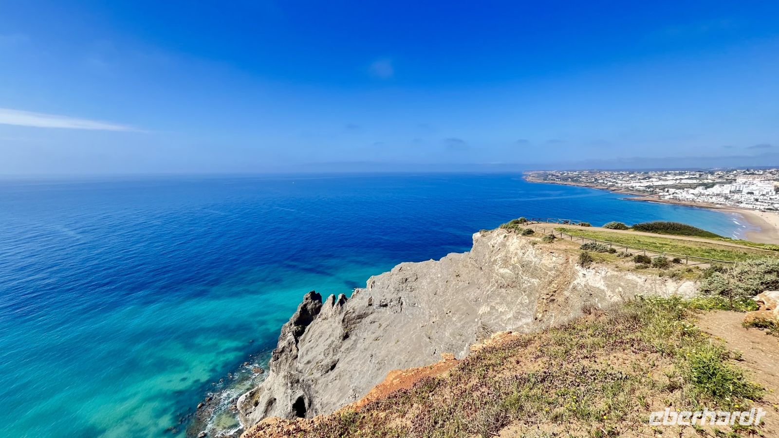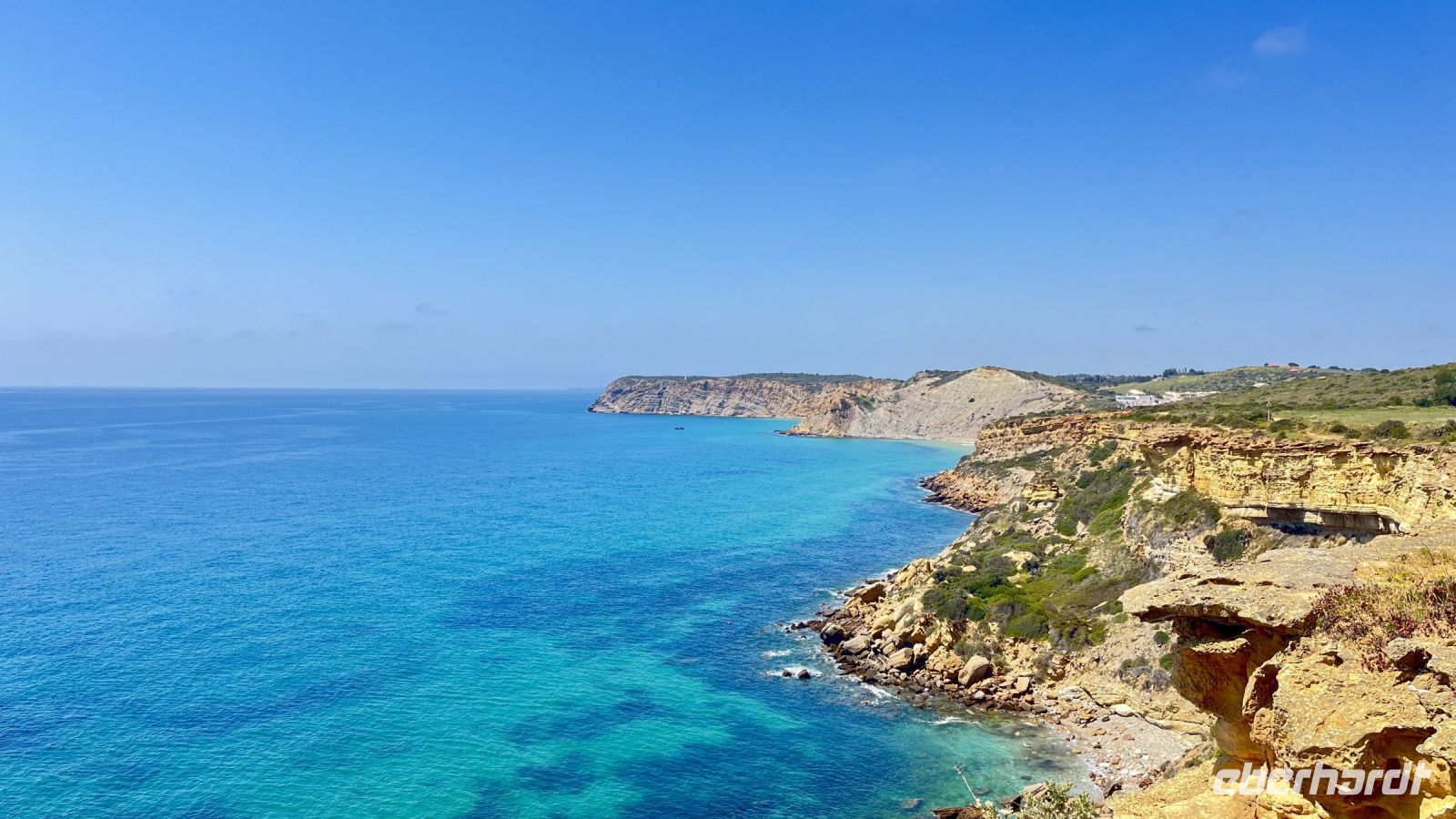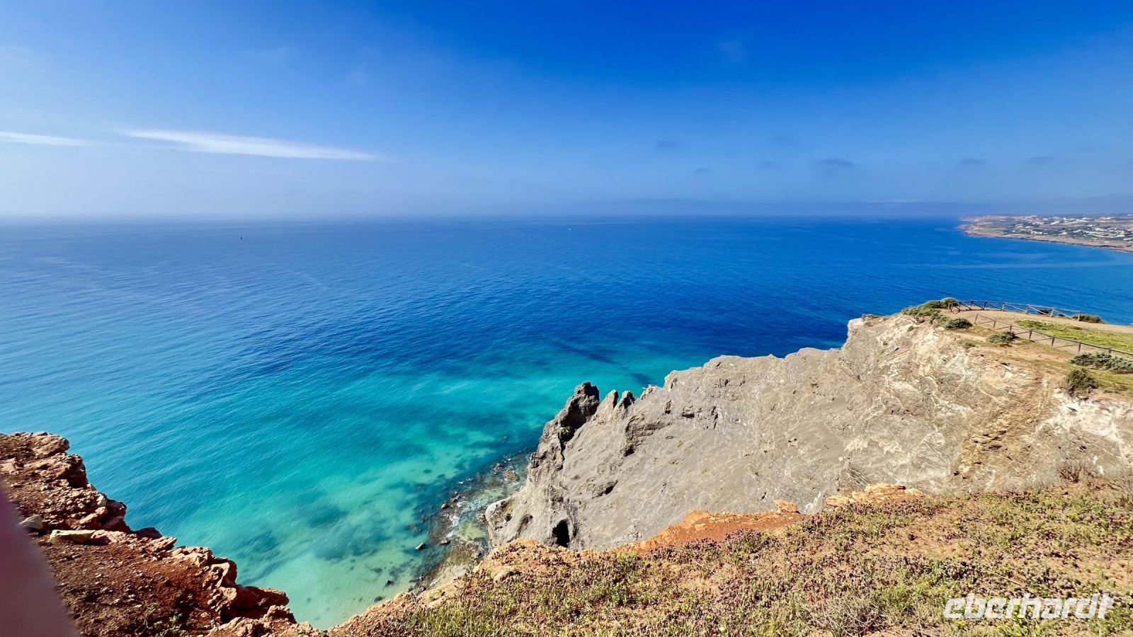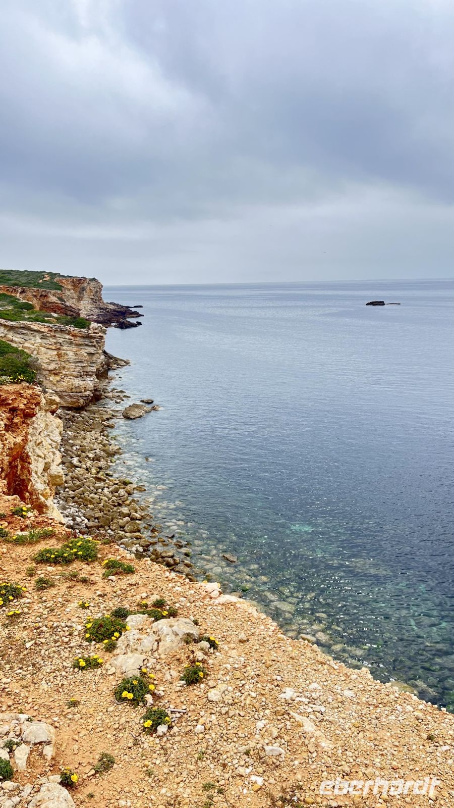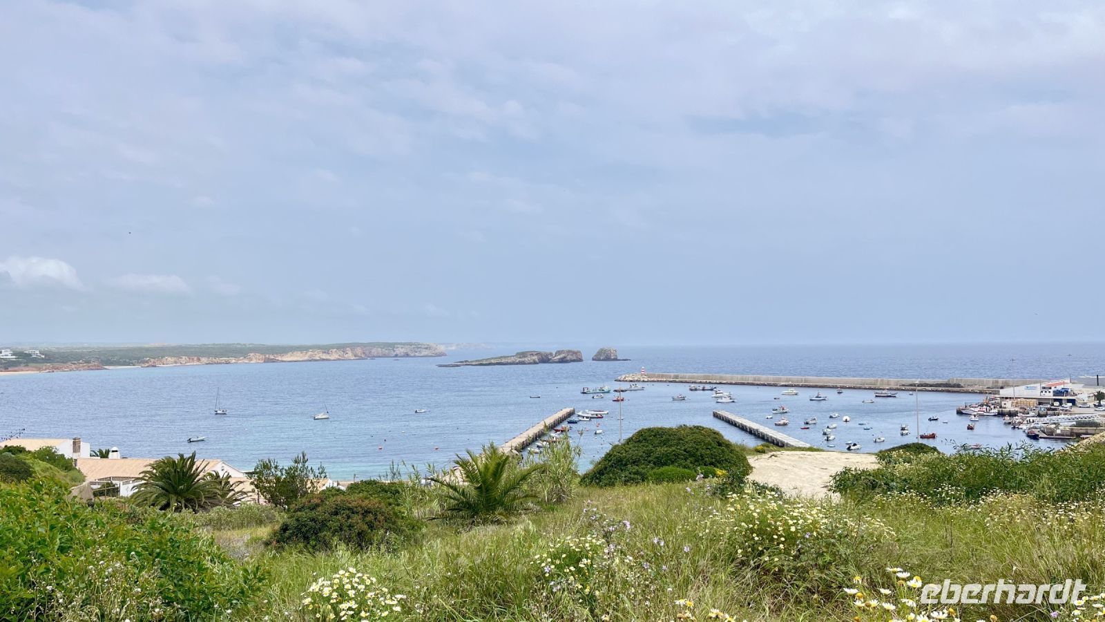 Die Schattierungen des Himmels und des Meeres bildeten einen ständigen Kontrast zu den weißen Klippen der Steilküste von Porto de Mós. Von hier oben ließ uns die sanfte Brise unsere Wanderung aus einer anderen Perspektive erleben, in der die schöne Landschaft zu unseren Füßen ein unbestreitbares Kunstwerk ist. Wir betraten das, was man in der Vergangenheit für das Ende des Südwestens der bis dahin bekannten Welt hielt ... und von dort aus den unendlichen Atlantik, der mit dem Himmel zu einem Horizont verschmilzt, der meisterhaft gezeichnet ist. Eine solche Schönheit sieht man nicht alle Tage, und diese Küste ist eine der schönsten, die wir je gesehen haben.
