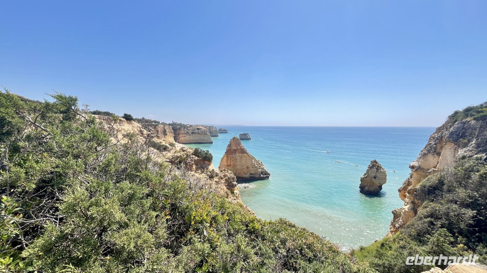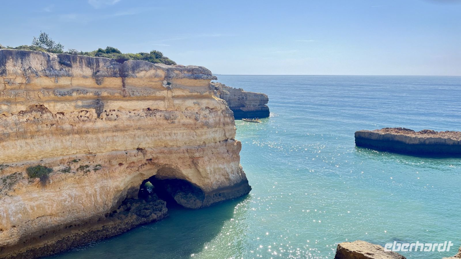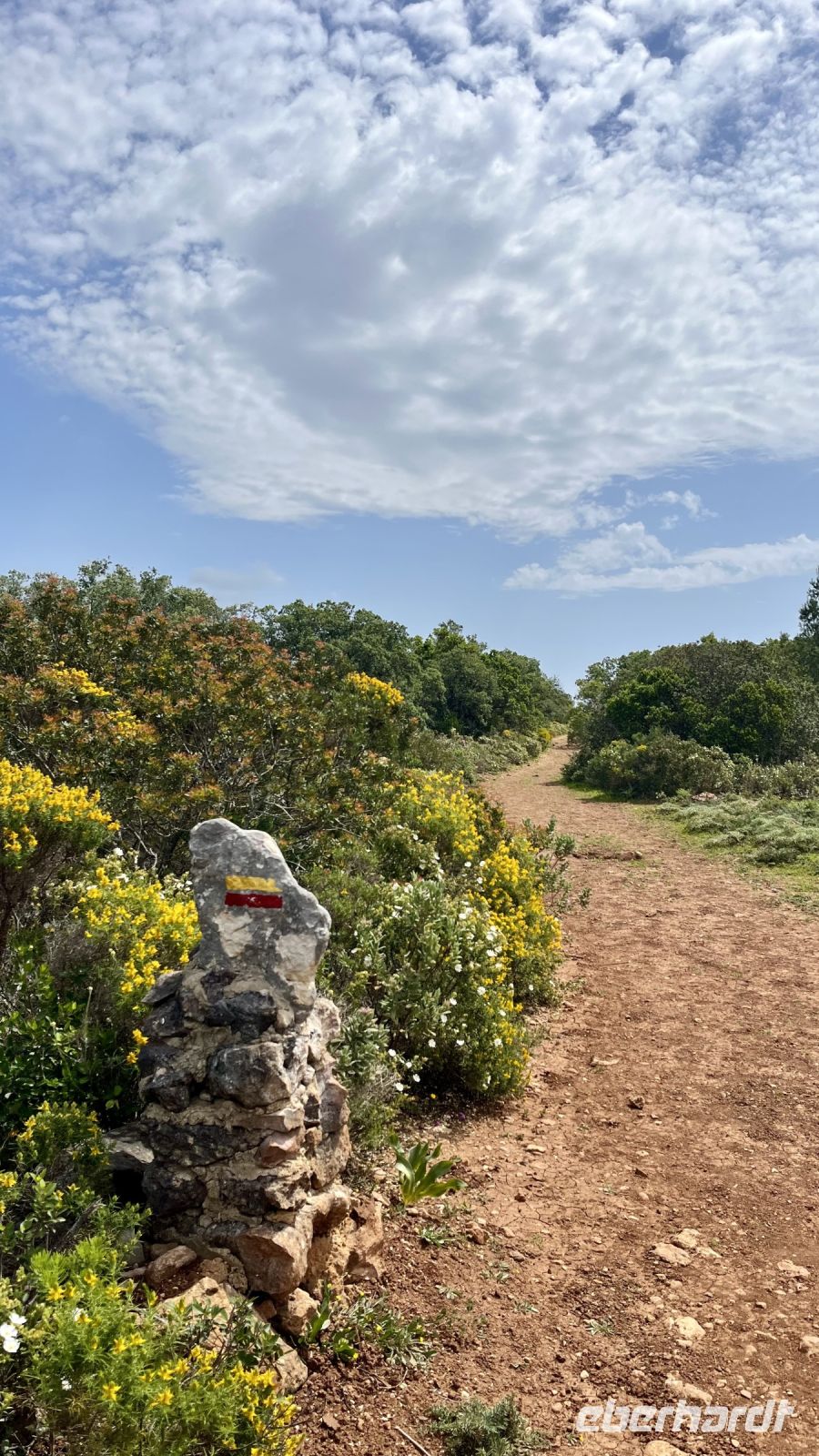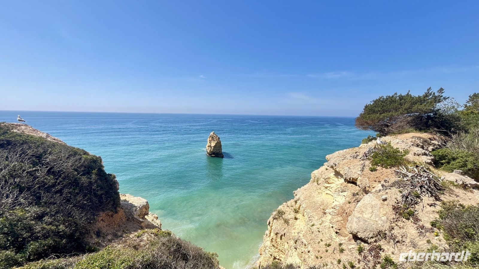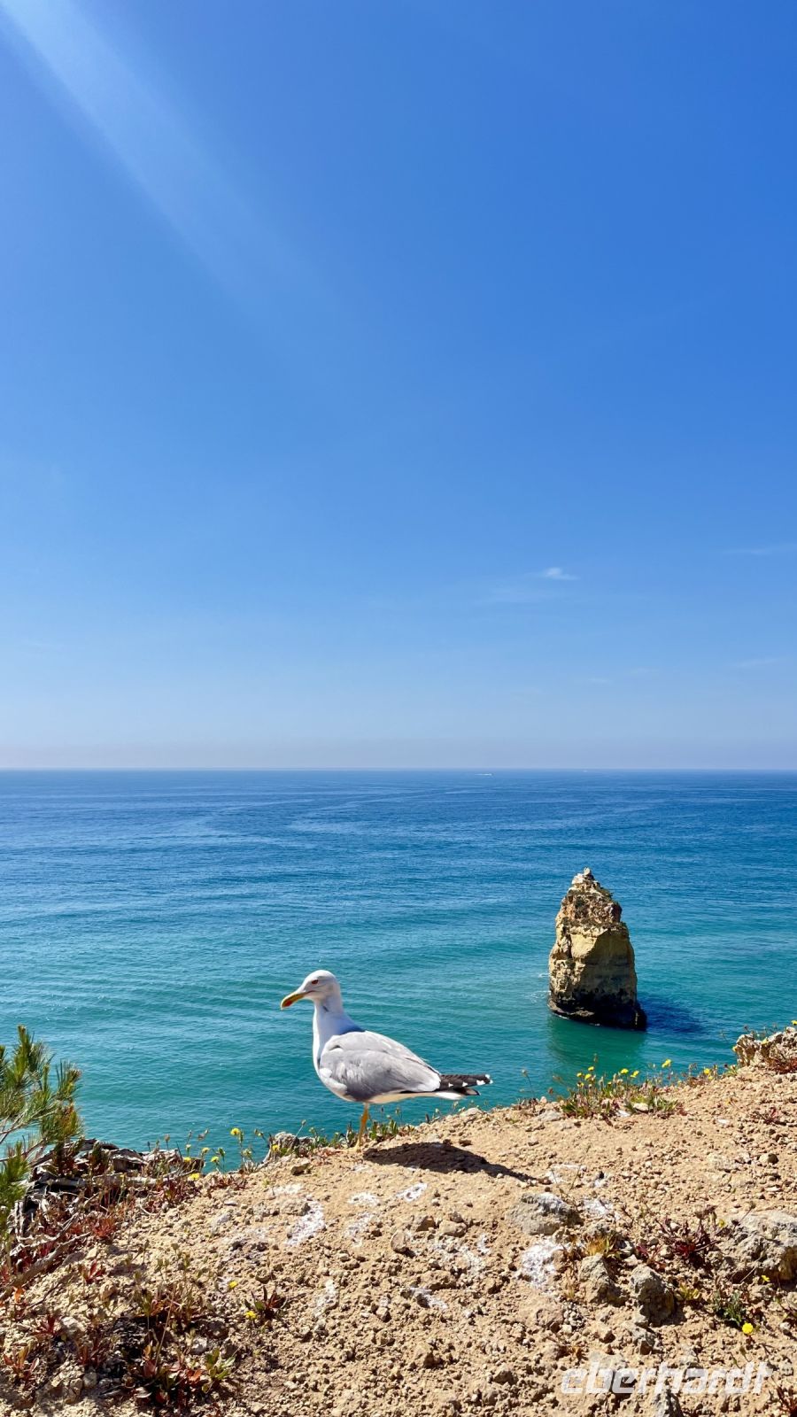 Die Schattierungen des Himmels und des Meeres bildeten einen ständigen Kontrast zu den weißen Klippen der Steilküste von Porto de Mós. Von hier oben ließ uns die sanfte Brise unsere Wanderung aus einer anderen Perspektive erleben, in der die schöne Landschaft zu unseren Füßen ein unbestreitbares Kunstwerk ist. Wir betraten das, was man in der Vergangenheit für das Ende des Südwestens der bis dahin bekannten Welt hielt ... und von dort aus den unendlichen Atlantik, der mit dem Himmel zu einem Horizont verschmilzt, der meisterhaft gezeichnet ist. Eine solche Schönheit sieht man nicht alle Tage, und diese Küste ist eine der schönsten, die wir je gesehen haben.