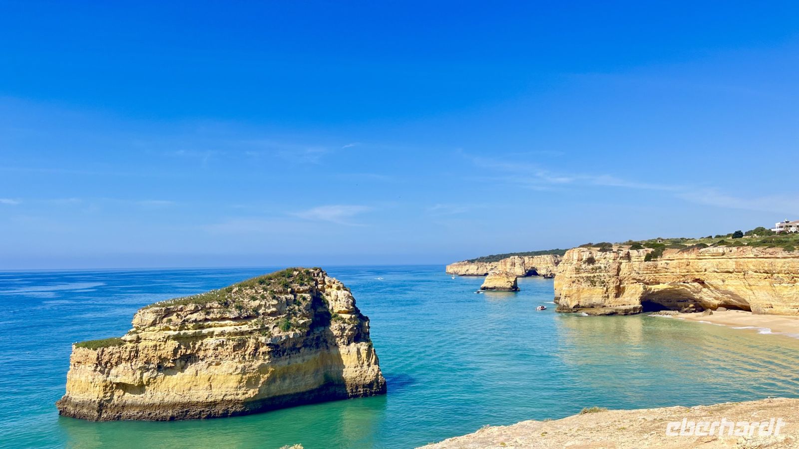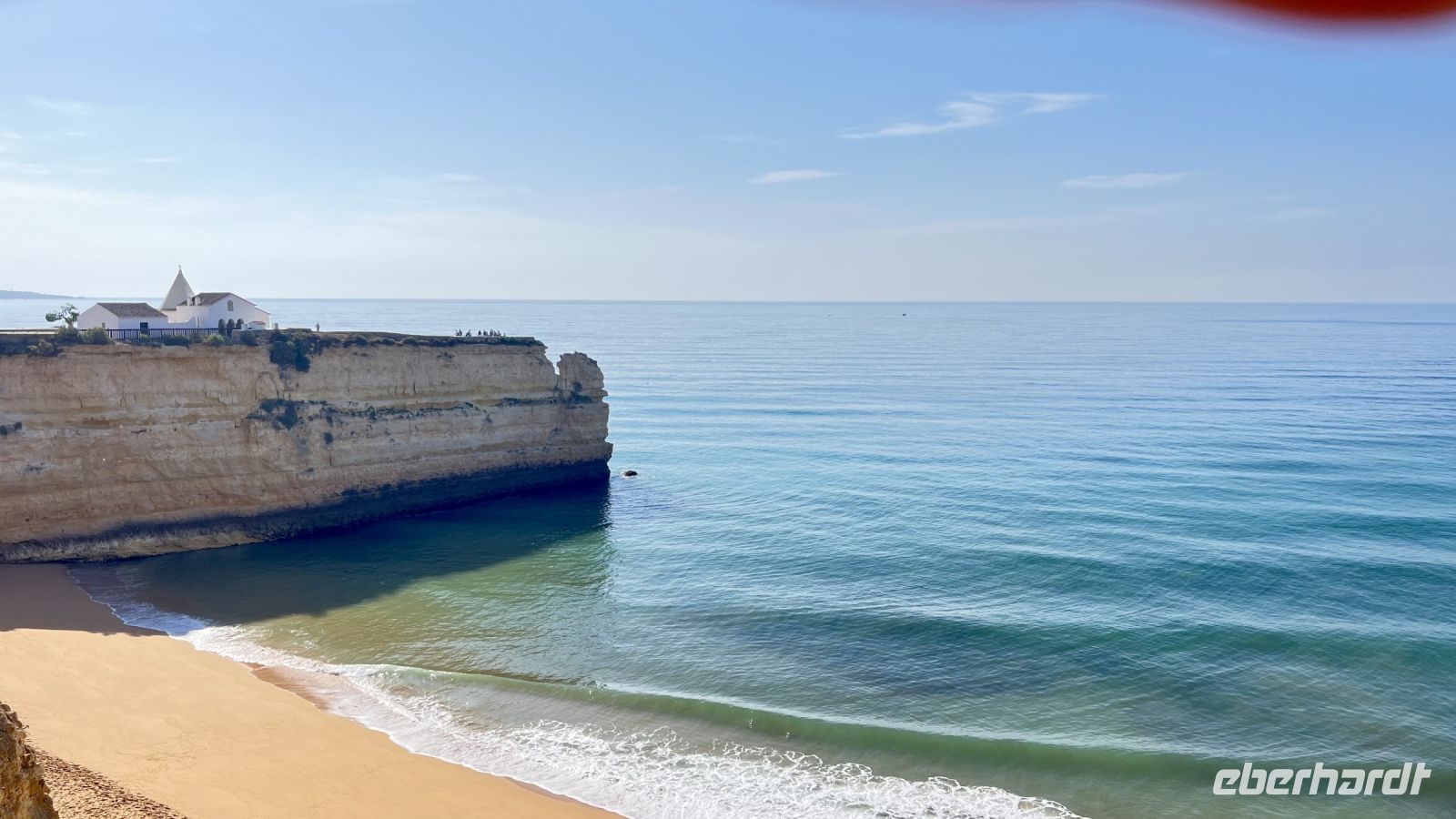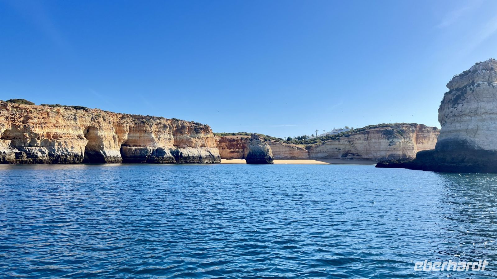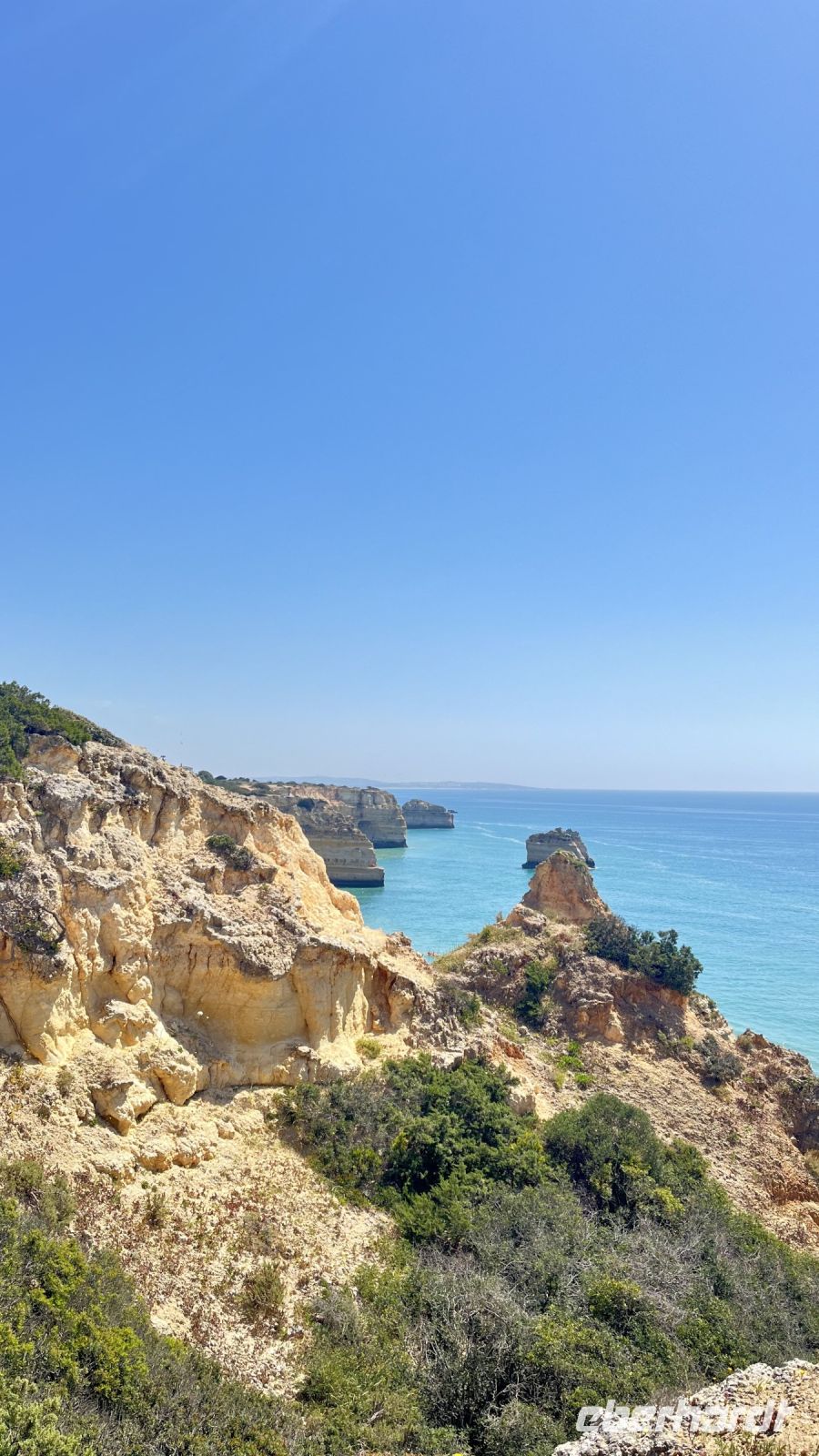 Die Schattierungen des Himmels und des Meeres bildeten einen ständigen Kontrast zu den weißen Klippen der Steilküste von Porto de Mós. Von hier oben ließ uns die sanfte Brise unsere Wanderung aus einer anderen Perspektive erleben, in der die schöne Landschaft zu unseren Füßen ein unbestreitbares Kunstwerk ist. Wir betraten das, was man in der Vergangenheit für das Ende des Südwestens der bis dahin bekannten Welt hielt ... und von dort aus den unendlichen Atlantik, der mit dem Himmel zu einem Horizont verschmilzt, der meisterhaft gezeichnet ist. Eine solche Schönheit sieht man nicht alle Tage, und diese Küste ist eine der schönsten, die wir je gesehen haben.